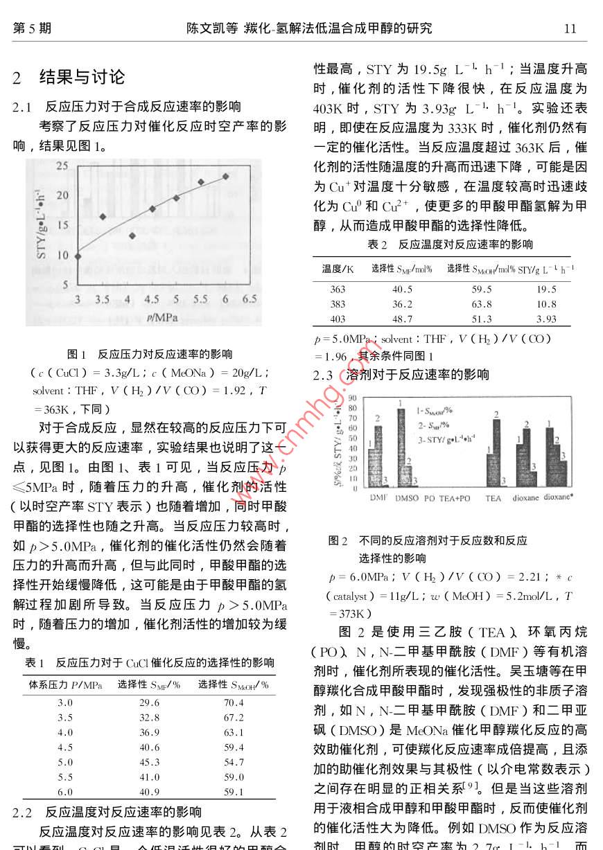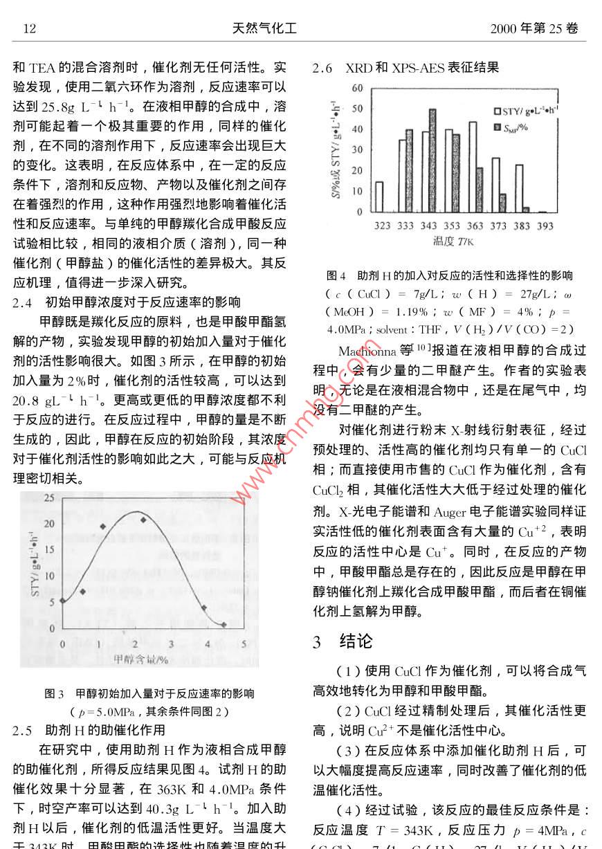 10天然氣化工2000年第25卷羰化氬解法低溫合成甲醇的研究Ⅲ.氯化亞銅催化劑體系,…,+,,…,…→陳文凱12劉興泉2梁國華2吳玉塘2于作龍2(1.寧波大學化學系寧波3152112.中國科學院成都有機化學研究所成都610041)摘要趼研究〔u(l作主催化劑在液相合成甲醇和甲酸甲酯的反應。結果表明,該反應在低溫363-403K具有很高的催化活性。T=363K,p=5.0MPa甲醇時空產(chǎn)率可達到20.8gLh。同時反應溫度也影響反應的選擇性。實驗發(fā)現(xiàn)用醇的初始加入量對催化劑反應活性影響很大最佳值為2%。二氧六環(huán)是很好的反應溶劑,可提高反應活性助劑H的加入可提高催化劑的活性并降低反應溫度在343K時甲醇的時空產(chǎn)率為40.3gLh1經(jīng)XRD和 XPS-AES表征發(fā)現(xiàn)催化劑在反應中的活性中心為Cu·反應經(jīng)過羰化和氫解2個過程。關鍵詞押醇呷酸甲酯氰化亞銅合成氣呷醇鈉中圖分類號:TQ426.8文獻標識碼:文章編號:1001921%200005-10-040前言(△H=-91kJ/mol),所以高溫反應將受到熱力學的限制,合成甲醇的單程轉化率較低,因此必甲醇是一種重要的基本有機化工原料,除了然采用氣體循環(huán)工藝,因存在傳熱和能耗高等諸用于生產(chǎn)醋酸、醋酐、醋酸甲酯、甲醛、甲基叔多問題,這都使得中低壓法氣相合成甲醇難以取丁基醚、甲基叔戊基醚等化工原料外,還可望成得突破性進展。因此低溫液相法合成甲醇已經(jīng)成為新型的液體燃料和石油代用品。甲酸甲酯是·為各國研究的重點和熱點。在前文研究的基礎種重要的C1化學原料,作為化工產(chǎn)品已經(jīng)有幾上671,作者發(fā)現(xiàn)CuC添加助劑(H)是一種優(yōu)十年的生產(chǎn)歷史。甲醇和甲酸甲酯作為燃料,可良的、新型的銅基催化劑體系,現(xiàn)報道部分實驗以大幅度減少汽車尾氣中的氮氧化物、OO和結果SO3等對環(huán)境有害的物質的排放,是一種清潔的綠色燃料11實驗部分迄今為止,國內外的絕大部分甲醇都采用低使用的溶劑為分析純,使用前經(jīng)分子篩干燥壓氣相法生產(chǎn),即在反應壓力5-10MPa,溫度過夜。固體CH3ONa或其CH1OH溶液為自制。03-543K,催化劑為Cu/ ZnO/ALO3,氣相條cuC為市售分析純試劑,使用前經(jīng)精制,以除件下合成的。三相床液相法合成甲醇已完成工業(yè)去CuC2和可溶性雜質,方法為將CuCl粉末放規(guī)模試范。低溫液相法合成甲醇和甲酸甲酯則處入3%的醋酸溶液中,攪拌下通入SO氣體于中試階段,適用的催化劑主要有N系和Cu30min,分離出上層清液,再用冰醋酸洗滌3次,系兩類25Ni系催化劑由于在反應過程中將固體物質在N氣氛下進行真空干燥,將需要容易生成劇毒的Ni(CO)(也可能是真正的起催化作用的活性組分),降低了其研究意義和實量的、經(jīng)過處理的CuC粉末加入到需要量的CH3ONa(CHOH溶液中,或將處理過的CuCl粉用價值。因此,目前研究主要集中在Cu系催化劑上。由于甲醇的合成是一個強放熱的反應未加入到含有助劑H的CH3OH或 HCOOCH3溶液中。收稿日期:2000-07-10;基金來源:國家科委專用化學品辦公室資助項目(合同編號:85-95H0608);作催化劑的活性評價是在一個容積為500ml的者簡介:陳文凱,男,1969年6月生已發(fā)表帶有機械磁傳動攪拌裝置的不銹鋼高壓反應釜中論文10余篇,申請中國專利3項,美國專利第5期陳文凱等蕷化-氬解法低溫合成甲醇的研究112結果與討論性最高,STY為19.5gLkh1;當溫度升高時,催化劑的活性下降很快,在反應溫度為2.1反應壓力對于合成反應速率的影響403K時,STY為3.93gL.h。實驗還表考察了反應壓力對催化反應時空產(chǎn)率的影明,即使在反應溫度為33KX時,催化劑仍然有響,結果見圖1。定的催化活性。當反應溫度超過363K后,催化劑的活性隨溫度的升高而迅速下降,可能是因20為Cu對溫度十分敏感,在溫度較高時迅速歧化為C和Cu2+,使更多的甲酸甲酯氫解為甲醇,從而造成甲酸甲酯的選擇性降低。表2反應溫度對反應速率的影響10選擇性SMm/md%選擇性SMo/m%snY/gL-h36340.559.519.533.544.555.566.536.2P/MPa48.73.93P=5.OMPa; solvent: THF, V(H)/V(CO)圖1反應壓力對反應速率的影響1.96,其余條件同圖1CuCI)=3. 3g/L: c( M ONa)=20g/L2.3溶劑對于反應速率的影響olvent: THF,V(H,)/V(CO)=1.92, T363K,下同)I-SM0Mr96對于合成反應,顯然在較高的反應壓力下可2- Mayo以獲得更大的反應速率,實驗結果也說明了這3-STY/goL.點,見圖1。由圖1、表1可見,當反應壓力p5MPa時,隨著壓力的升高,催化劑的活性DMF DMSO PO TEA+PO TEA dioxane dioxane以時空產(chǎn)率STY表示)也隨著增加,同時甲酸甲酯的選擇性也隨之升高。當反應壓力較高時如p>5.0MPa,催化劑的催化活性仍然會隨著圖2不同的反應溶劑對于反應數(shù)和反應壓力的升高而升高,但與此同時,甲酸甲酯的選選擇性的影響擇性開始緩慢降低,這可能是由于甲酸甲酯的氫p=6.0MPa:V(H)/V((O)=2.21;米c解過程加劇所導致。當反應壓力p>50MPaC catalyst )=llg/L ;w( MeOH)=5.2mol/L, T時,隨著壓力的增加,催化劑活性的增加較為緩373K)圖2是使用三乙胺(TEA)環(huán)氧丙烷慢PO)N,N-二甲基甲酰胺(DMF)等有機溶表1反應壓力對于CuCl催化反應的選擇性的影響劑時,催化劑所表現(xiàn)的催化活性。吳玉塘等在甲體系壓力P/MPa選擇性Sw/%選擇性SMH/%醇羰化合成甲酸甲酯時,發(fā)現(xiàn)強極性的非質子溶劑,如N,N-二甲基甲酰胺(DMF)和二甲亞砜(DMSO)是 Meona催化甲醇羰化反應的高效助催化劑,可使羰化反應速率成倍提高,且添45.354.741,059,0加的助催化劑效果與其極性(以介電常數(shù)