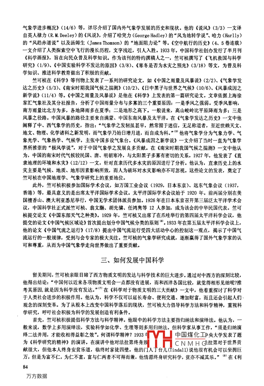 第二十九卷總168期自然辯證法通訊Vol29, Sum No 1682007第2期 JOURNAL OF DIALECTICS OF NATURENo2,2007竺可楨與中國科學(xué)社范鐵權(quán)任曉燕(河北大學(xué)人文學(xué)院,河北保定071002)摘要:竺可楨早年加入中國科學(xué)社,并始終為該社的骨干,為其事業(yè)的持久發(fā)展立下了汗馬功勞。鑒于中國科學(xué)的落后,他在《科學(xué)》等刊物上發(fā)表了大量文章,普及科學(xué)常識,傳播專業(yè)的科學(xué)知識。他大力提倡科學(xué)方法與科學(xué)精神,呼吁社會重視科學(xué)研究,為推進(jìn)中國的科學(xué)發(fā)展做出了重要貢獻(xiàn)。關(guān)鍵詞:竺可楨中國科學(xué)社科學(xué)方法科學(xué)精神〔中圖分類號〕MO(文獻(xiàn)標(biāo)識碼)A(文章編號)1000703(2007)02008205竺可楨是著名的科學(xué)家、教育家,中國近代地理學(xué)和氣象學(xué)的奠基者。他一生致力于科學(xué)教育、科學(xué)研究和科學(xué)組織工作。鑒于中國科學(xué)之落后,留美期間他加入中國科學(xué)社,并始終為該社的骨干,積極參與各項(xiàng)社務(wù),為其事業(yè)的蓬勃發(fā)展立下了汗馬功勞。本文以中國科學(xué)社為中心,系統(tǒng)考察竺可楨在傳播現(xiàn)代科學(xué)知識和推進(jìn)中國的科學(xué)研究方面的歷史功績。中國科學(xué)社的骨干之竺可楨(1890-1974),字藕舫,浙江上虞人。1910年考取第二屆庚款生赴美留學(xué),入伊利諾斯州大學(xué)農(nóng)學(xué)院。大學(xué)畢業(yè)后到哈佛大學(xué)研究院地學(xué)系專攻氣象學(xué),以氣象學(xué)為專業(yè),在當(dāng)時的留學(xué)生中間可謂寥寥無幾。1914年夏,感于中國科學(xué)之缺乏,以任鴻雋、趙元任、胡明復(fù)、楊銓(杏佛)為首的幾個留美生在康奈爾大學(xué)醞釀成立“科學(xué)社”。正在哈佛大學(xué)的竺可楨聞訊后立即加入,成為該社的早期社員。從此,他與中國科學(xué)社結(jié)下了不解之緣。1916年秋,中國科學(xué)社第一屆常年會(1916)選舉產(chǎn)生了由任鴻雋、趙元任、胡明復(fù)、秉志、周仁、竺可楨、錢治瀾7人組成的董事會。其中任鴻雋、趙元任、胡明復(fù)、秉志為2年董事,竺可楨、周仁、錢治瀾為1年董事。次年的常年會上,竺可楨再度當(dāng)選董事。1918年,竺可楨獲得哈佛大學(xué)氣象學(xué)博士學(xué)位,隨即返回闊別八年的祖國。相隔不久,隨大批社員畢業(yè)回國,中國科學(xué)社也遷回國內(nèi),在上海大同學(xué)院、南京高等師范學(xué)校(“南高師”)設(shè)立事務(wù)所。經(jīng)張謇、蔡元培等社會賢達(dá)多方奔走,中國科學(xué)社在南京建立起固定的社所。回國后,竺可楨應(yīng)聘赴武昌高等師范學(xué)校教授地理和氣象學(xué)。1920年,他轉(zhuǎn)入南高師,講授氣象學(xué)、地文學(xué)、地質(zhì)學(xué)等課程。當(dāng)時的南高師容納了眾多的科學(xué)社社員,一度成為中國科學(xué)社的大本營。竺可楨到任的第二年南高師改建為東南大學(xué),并進(jìn)行了科系調(diào)整。竺可楨倡議設(shè)立地學(xué)系,他被聘為地學(xué)系主任,擔(dān)任地學(xué)通論、氣象學(xué)、世界氣候、世界地理等課程,并積極開展地學(xué)研究工作,發(fā)表了大量的學(xué)術(shù)論文。1925年,因不滿校長卑躬屈節(jié)逢迎江蘇督軍齊燮元,竺可楨辭去教職,至上海商務(wù)印書館工作。翌年轉(zhuǎn)到天津南開大學(xué),教授地理學(xué)和氣象學(xué)。1927年,蔡元培出任中央研究院院長,聘竺可楨為氣象研究所所長。1936~1949年,竺可楨出任浙江大學(xué)校長。在他的苦心經(jīng)營下,浙大由一所地區(qū)性大學(xué)中國煤化仝性大學(xué)CNMHG〔收稿日期〕2006年7月19日〔作者簡介〕范鐵權(quán)(1974-)男,博士,河北大學(xué)人文學(xué)院副教授。主攻中國近現(xiàn)代史、科技史任曉燕(1969-)女,河北大學(xué)圖書館助理館員。竺可楨始終是中國科學(xué)社的重要骨干,為其事業(yè)的發(fā)展出謀劃策,不遺余力。1919年,中國科學(xué)社在浙江杭州召開第四屆年會。這是中國科學(xué)社在國內(nèi)召開的第一次年會,是中國科學(xué)社在國內(nèi)發(fā)展的起點(diǎn)。此時,國人對中國科學(xué)社還知之甚少,對其持冷漠、旁觀態(tài)度者居多,熱心支持者寥寥。針對這種情況這次年會重在宣傳,擴(kuò)大中國科學(xué)社的社會影響,以贏得社會各界的支持。竺可楨在歡迎詞中明確指出“廿世紀(jì)文明為物質(zhì)文明,欲立國于今之世界,非有科學(xué)知識不可,欲謀中國科學(xué)之發(fā)達(dá),必從編印書報(bào)、審定名詞、設(shè)圖書館、實(shí)驗(yàn)研究所入手,此皆本社之事業(yè)也?!痹捳Z不多,已大致道出了中國科學(xué)社既定的事業(yè)規(guī)劃,并強(qiáng)調(diào)了科學(xué)立國的重要性,引起了與會者的深深共鳴。1922年,中國科學(xué)社在江蘇南通召開第七屆年會。在這屆年會上,中國科學(xué)社再次進(jìn)行改組,重新修改社章,原董事會易名為理事會,由11人組成。竺可楨入選理事會,并擔(dān)任書記一職。此后,他連選連任,一直為中國科學(xué)社理事會成員。其間的1927~1930年,還曾出任中國科學(xué)社社長。改組后的中國科學(xué)社發(fā)展迅速,各項(xiàng)既定事業(yè)陸續(xù)得以實(shí)現(xiàn),當(dāng)中凝聚了竺可楨的許多心血和汗水但中國科學(xué)社在發(fā)展過程中也暴露