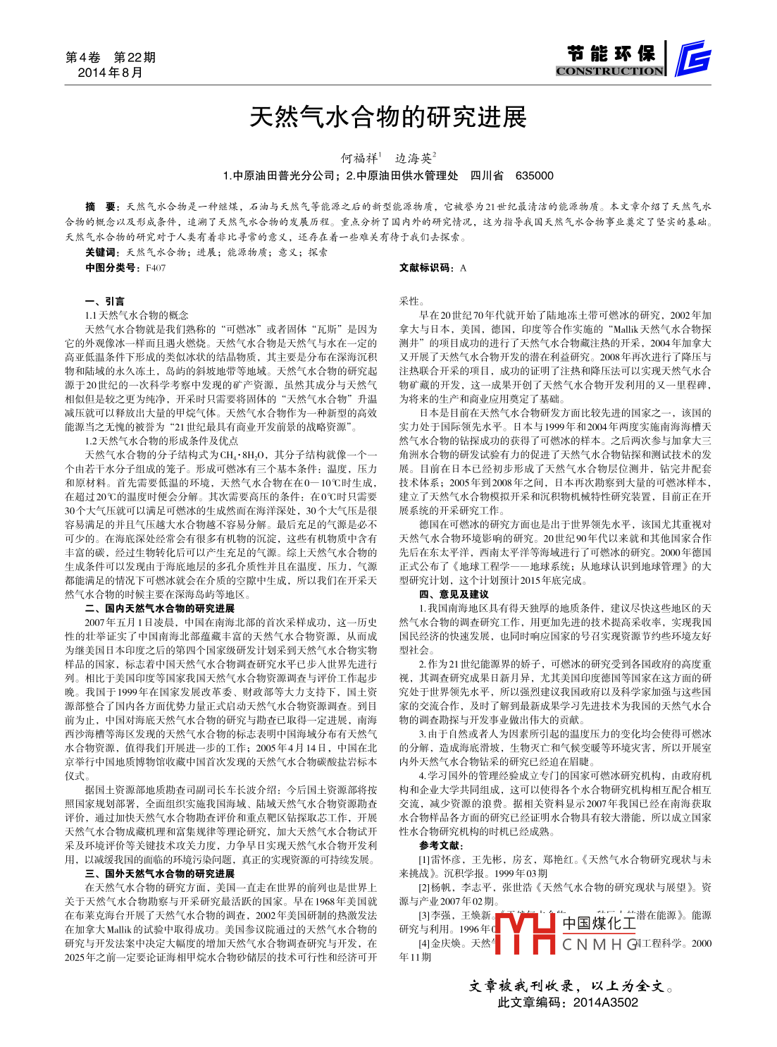 第4卷第22期節(jié)能邳保2014年8月CONSTRUCTIONI天然氣水合物的研究進展何福祥邊海英中原油田普光分公司;2.中原油田供水管理處四川省635000摘要:天然氣水合物是一種繼煤,石油與天然氣等能源之后的新型能源物質(zhì),它被譽為21世紀最清潔的能源物質(zhì)。本文章介紹了天然氣水合物的概念以及形成條件,追溯了天然氣水合物的發(fā)展歷程。重點分析了囯內(nèi)外的研究情況,這為指導(dǎo)我國天然氣水合物事業(yè)奠定了堅實的基礎(chǔ)天然氣水合物的研究對于人類有著非比尋常的意義,還存在著一些難關(guān)有待于我們?nèi)ヌ剿麝P(guān)鍵詞:天然氣水合物;進展;能源物質(zhì);意義;探索中圖分類號:F407文獻標(biāo)識碼:A11天然氣水合物的概念早在20世紀70年代就開始了陸地凍土帶可燃冰的研究,2002年加天然氣水合物就是我們熟稱的“可燃冰”或者固體“瓦斯”是因為拿大與日本,美國,德國,印度等合作實施的“ Mallik天然氣水合物探它的外觀像冰一樣而且遇火燃燒。天然氣水合物是天然氣與水在一定的測井”的項目成功的進行了天然氣水合物藏注熱的開采,2004年加拿大高亞低溫條件下形成的類似冰狀的結(jié)晶物質(zhì),其主要是分布在深海沉積又開展了天然氣水合物開發(fā)的潛在利益硏究。2008年再次進行了降壓與物和陸域的永久凍土,島嶼的斜坡地帶等地域。天然氣水合物的研究起注熱聯(lián)合開采的項目,成功的證明了注熱和降壓法可以實現(xiàn)天然氣水合源于20世紀的一次科學(xué)考察中發(fā)現(xiàn)的礦產(chǎn)資源,雖然其成分與天然氣物礦藏的開發(fā),這一成果開創(chuàng)了天然氣水合物開發(fā)利用的又一里程碑相似但是較之更為純凈,開采時只需要將固體的“天然氣水合物”升溫為將來的生產(chǎn)和商業(yè)應(yīng)用奠定了基礎(chǔ)減壓就可以釋放出大量的甲烷氣體。天然氣水合物作為一種新型的高效日本是目前在天然氣水合物研發(fā)方面比較先進的國家之一,該國的能源當(dāng)之無愧的被譽為“21世紀最具有商業(yè)開發(fā)前景的戰(zhàn)略資源”。實力處于國際領(lǐng)先水平。日本與1999年和2004年兩度實施南海海槽天1.2天然氣水合物的形成條件及優(yōu)點然氣水合物的鉆探成功的獲得了可燃冰的樣本。之后兩次參與加拿大三天然氣水合物的分子結(jié)構(gòu)式為CH4·8H1O,其分子結(jié)構(gòu)就像一個一角洲水合物的研發(fā)試驗有力的促進了天然氣水合物鉆探和測試技術(shù)的發(fā)個由若干水分子組成的籠子。形成可燃冰有三個基本條件:溫度,壓力展。目前在日本已經(jīng)初步形成了天然氣水合物層位測井,鉆完井配套和原材料。首先需要低溫的環(huán)境,天然氣水合物在在θ-10℃時生成,技術(shù)體系;2005年到2008年之間,日本再次勘察到大量的可燃冰樣本,在超過20℃的溫度時便會分解。其次需要高壓的條件:在0℃時只需要建立了天然氣水合物模擬開采和沉積物機械特性研究裝置,目前正在開30個大氣壓就可以滿足可燃冰的生成然而在海洋深處,30個大氣壓是很展系統(tǒng)的開采研究工作容易滿足的并且氣壓越大水合物越不容易分解。最后充足的氣源是必不德國在可燃冰的研究方面也是出于世界領(lǐng)先水平,該國尤其重視對可少的。在海底深處經(jīng)常會有很多有機物的沉淀,這些有機物質(zhì)中含有然氣水合物環(huán)境影響的研究。20世紀90年代以來就和其他國家合作豐富的碳,經(jīng)過生物轉(zhuǎn)化后可以產(chǎn)生充足的氣源。綜上天然氣水合物的先后在東太平洋,西南太平洋等海域進行了可燃冰的研究。2000年德國生成條件可以發(fā)現(xiàn)由于海底地層的多孔介質(zhì)性并且在溫度,壓力,氣源正式公布了《地球工程學(xué)一一地球系統(tǒng);從地球認識到地球管理》的大都能滿足的情況下可燃冰就會在介質(zhì)的空隙中生成,所以我們在開采天型研究計劃,這個計劃預(yù)計2015年底完成然氣水合物的時候主要在深海島嶼等地區(qū)。意見及建國內(nèi)天然氣水合物的研究進展1.我國南海地區(qū)具有得天獨厚的地質(zhì)條件,建議盡快這些地區(qū)的天007年五月1日凌晨,中國在南海北部的首次采樣成功,這一歷史然氣水合物的調(diào)查研究工作,用更加先進的技術(shù)提高采收率,實現(xiàn)我國性的壯舉證實了中國南海北部蘊藏豐富的天然氣水合物資源,從而成國民經(jīng)濟的快速發(fā)展,也同時響應(yīng)國家的號召實現(xiàn)資源節(jié)約些環(huán)境友好繼美國日本印度之后的第四個國家級研發(fā)計劃采到天然氣水合物實物型社會樣品的國家,標(biāo)志著中國天然氣水合物調(diào)查研究水平已步人世界先進行2.作為21世紀能源界的嬌子,可燃冰的研究受到各國政府的高度重列。相比于美國印度等國家我國天然氣水合物資源調(diào)査與評價工作起步視,其調(diào)查研究成果日新月異,尤其美國印度德國等國家在這方面的研晚。我國于1999年在國家發(fā)展改革委、財政部等大力支持下,國土資究處于世界領(lǐng)先水平,所以強烈建議我國政府以及科學(xué)家加強與這些國源部整合了國內(nèi)各方面優(yōu)勢力量正式啟動天然氣水合物資源調(diào)查。到目家的交流合作,及時了解到最新成果學(xué)習(xí)先進技術(shù)為我國的天然氣水合前為止,中國對海底天然氣水合物的研