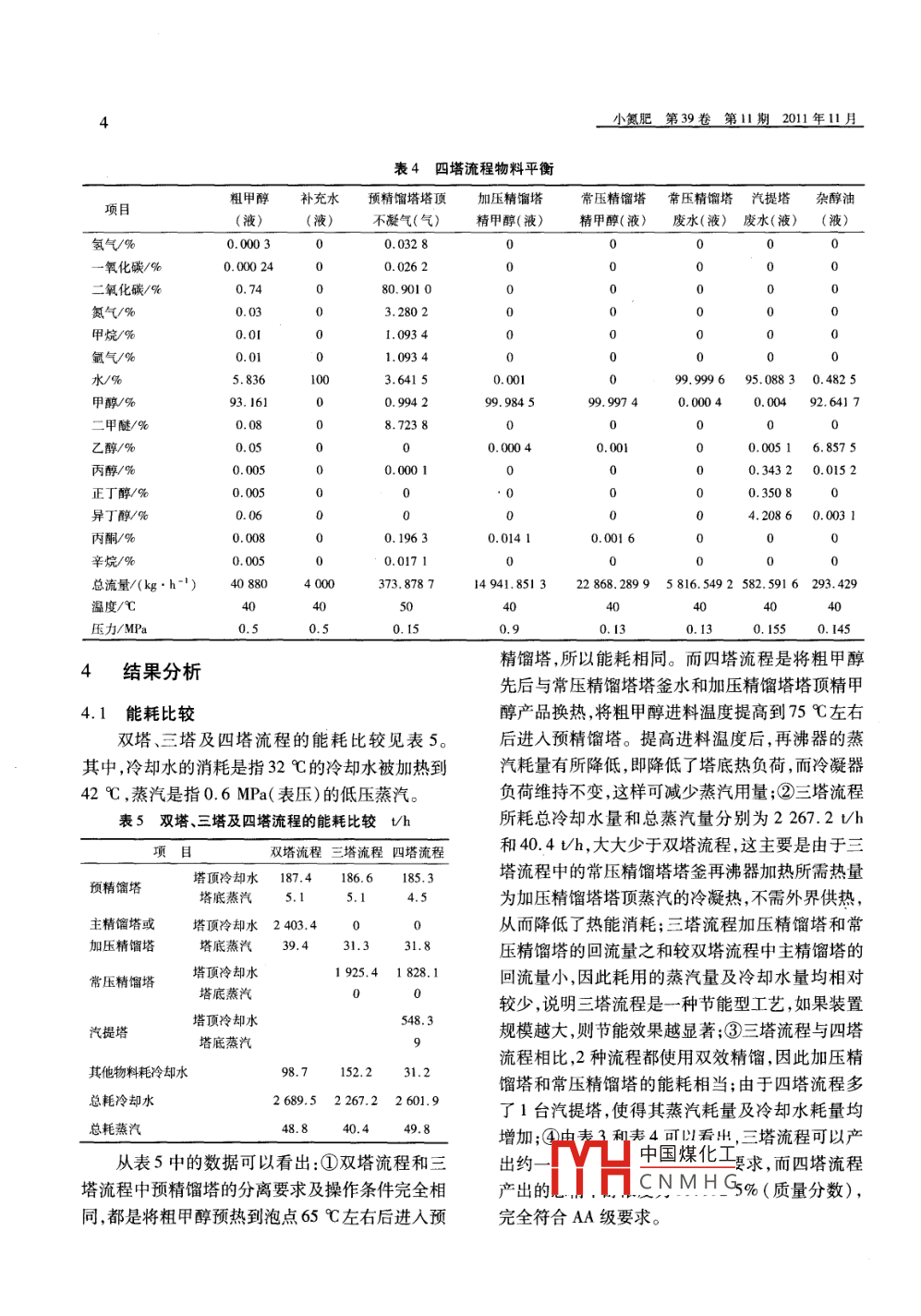 肥第39卷第11期2011年11月甲醇精餾工藝流程分析田旭劉小英秦麗萍董士祥(北京航天萬源煤化工工程技術(shù)有限公司蘭州分公司730050)0前言產(chǎn)品,塔底排出的含微量甲醇及其它重組分的廢水送往水處理系統(tǒng)。隨著甲醇應(yīng)用技術(shù)的發(fā)展,甲醇及其衍生品放空作為替代能源的應(yīng)用也越來越得到人們的重視。CWRCWR大量煤基甲醇裝置在建或待建,而甲醇裝置的大GCWRCWR型化和工藝流程的優(yōu)化控制對節(jié)能降耗、提高經(jīng)CWS T濟(jì)效益有著至關(guān)重要的作用。本文采用PRO/Ⅱ化工流程模擬計(jì)算軟件,對甲醇精餾工藝的雙塔預(yù)精餾塔主精餾塔流程、三塔流程及四塔流程進(jìn)行了模擬計(jì)算、分析與比較。1流程簡述圖1雙塔精餾工藝流程1.1雙塔流程1.2三塔流程雙塔精餾流程是我國老的甲醇裝置中采用較三塔流程是目前甲醇生產(chǎn)裝置應(yīng)用最廣泛廣的一種精餾流程(見圖1)。從合成單元來的粗的精餾工藝(見圖2),與雙塔流程最大不同是將甲醇經(jīng)泵加壓,再經(jīng)粗甲醇預(yù)熱器預(yù)熱后進(jìn)入預(yù)精餾過程分為加壓精餾和常壓精餾,充分利用精餾塔(常壓操作)。為了提高預(yù)精餾塔后甲醇加壓精餾塔冷凝器的高品位熱能作為常壓精餾的穩(wěn)定性并盡可能回收甲醇塔頂采用兩級冷凝,塔再沸器的熱源,減少蒸汽供應(yīng)量,以達(dá)到節(jié)能經(jīng)部分冷凝后的大部分甲醇、水及少量雜質(zhì)留在降耗的目的。液相作為回流返回塔,二甲醚等輕組分(初餾分)由合成單元送來的粗甲醇經(jīng)預(yù)熱器預(yù)熱后進(jìn)及少量的甲醇、水由塔頂逸出,塔底含水甲醇則由預(yù)精餾塔,溶解在粗甲醇中的低沸點(diǎn)雜質(zhì)在預(yù)泵送至主精餾塔。主精餾塔操作壓力稍髙于預(yù)精精餾塔塔頂精餾岀并送亼燃料管網(wǎng);從預(yù)精餾塔餾塔,但也可以認(rèn)為是常壓操作,塔頂?shù)玫骄状妓讈淼奈锪辖?jīng)泵加壓后,送亼加壓精餾塔。加不凝氣7 CWRCWRCwSCWScwR精中醇預(yù)精餾塔加壓精餾雜醇油壓精餾塔粗甲醇中國煤化工CNMHG圖2三塔精餾工藝流程小氮肥第39卷第11期2011年11月壓精餾塔塔頂為99.99%(體積分?jǐn)?shù))以上的甲醇不凝氣再經(jīng)洗滌后出裝置,冷凝液和洗滌水返回蒸氣,冷凝后的甲醇進(jìn)入回流槽,一部分作為精甲塔頂全回流。塔釜甲醇水經(jīng)泵加壓并與加壓精餾醇產(chǎn)品送到精甲醇混合罐,另一部分返回加壓精塔塔釜甲醇水換熱后進(jìn)亼加壓精餾塔,塔頂甲醇餾塔塔頂作為回流。在加壓精餾塔塔底排出的甲蒸氣進(jìn)入常壓精餾塔塔釜冷凝/蒸發(fā)器冷凝,冷凝醇水溶液送至常壓精餾塔。常壓精餾塔下部設(shè)雜液進(jìn)入回流罐,經(jīng)回流泵加壓后,一部分返回塔頂醇油采出口,抽出含甲醇、水的異丁基油,以保證作回流,另一部分為精甲醇產(chǎn)品出裝置。加壓精低于水沸點(diǎn)的雜質(zhì)(主要是醇類)分離出塔。常餾塔塔釜甲醇水自壓進(jìn)入常壓精餾塔精餾,塔頂壓精餾塔塔底采出的廢水送往廢水處理系統(tǒng)。分出剩余甲醇,塔釜水一部分返回預(yù)精餾塔塔頂1.3四塔流程洗滌器,剩余廢水去污水處理系統(tǒng)。側(cè)線抽出雜四塔精餾工藝流程見圖3。粗甲醇先后與常醇油進(jìn)入汽提塔,塔頂氣體返回常壓精餾塔,汽提壓精餾塔塔釜水、加壓精餾塔塔頂精甲醇換熱到塔側(cè)線雜醇油出裝置,塔釜水去污水處理或返回75℃左右進(jìn)入預(yù)精餾塔;塔頂氣經(jīng)過兩級冷凝,氣化工段使用。不凝氣CWR補(bǔ)充水CWR ICws/cWRCWS汽提塔預(yù)精餾塔加壓精餾塔雜醇油常壓精餾塔粗甲醇廢水圖3四塔精餾工藝流程2基礎(chǔ)數(shù)據(jù)3模擬過程設(shè)計(jì)以某企業(yè)生產(chǎn)裝置年產(chǎn)300kt精甲醇,3.1熱力學(xué)方程年運(yùn)行時間為7920h,粗甲醇總進(jìn)料量為物系主要組分為甲醇和水,另外還有少量的40880kg/h,溫度為40℃,壓力為0.4MPa(表二甲醚、乙醇、一氧化碳、二氧化碳、氫氣、甲烷、氮壓)為基礎(chǔ)數(shù)據(jù)。粗甲醇的組成見表1。氣、氬氣等以及高沸物(主要為異丁醇)。醇水系表1粗甲醇的組成統(tǒng)屬于強(qiáng)非理想液體混合物,本文采用修正的組分質(zhì)量分?jǐn)?shù)/%‖組分質(zhì)量分?jǐn)?shù)/%NRTL熱力學(xué)計(jì)算模型進(jìn)行模擬。氫氣0.0003甲醚3.2模擬結(jié)果氧化碳000024‖乙醇雙塔流程、三塔流程以及四塔流程的物料平二氧化碳衡結(jié)果(其中各組分均為質(zhì)量分?jǐn)?shù))分別見表2、氮?dú)?.03正丁醇0.00表3和表4。甲烷0.01異丁醇由表2~表4比較可以看出:3種流程都可產(chǎn)氬氣0.010.008出合格中國煤化工程產(chǎn)的精甲醇純水辛烷度稍低CNMHG的精甲醇純度相甲醇93.161當(dāng);3種流程的甲群廣星郁能達(dá)到要求。小氮肥第39卷第1期2011年11月表2雙塔流程物料平衡粗甲醇補(bǔ)充水預(yù)精餾塔塔頂主精餾塔塔頂主精餾塔塔頂精餾廢雜醇油(液)(液)不凝氣(氣精甲醇(液)體(氣)水(液)(液)氫氣/%0.00030.032500氧化碳/%0.000240.0260二氧化碳%80.1926氮?dú)?%3.2515甲烷/%0.011.083800000000000000氬氣/%4.282097.197315.8710甲醇/%93.16101.161899.957199.96482.311680.2155甲醚/%8.64960乙醇/%0.03650.02020.07632.0573丙醇/%0.0050.02890.1906丁醇/%0.000異丁醇/%0000.02970.12470.35621.5409丙酮%0.21600.0060.0150辛烷/%0.00500.020200總流量/(kg·h1)377,178737814.985764.09256540.091溫度/℃壓力/MPa00.1250.10.10