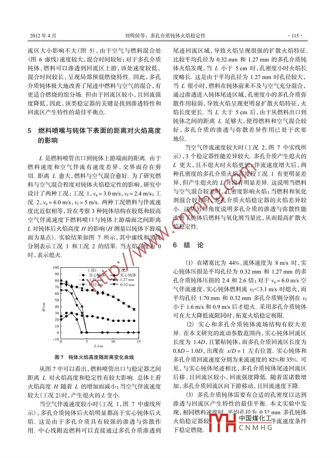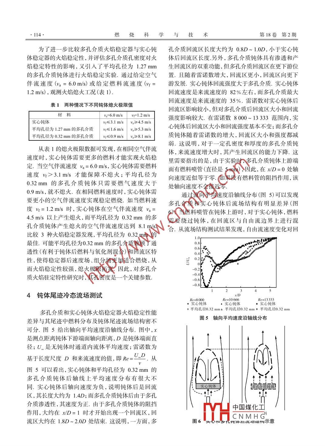 第18卷第2期燃燒科學(xué)與技術(shù)2012年4月Journal of Combustion Science and TechnologyApr.2012多孔介質(zhì)鈍體火焰穩(wěn)定性劉明侯,許勝,陳靖,陳義良(中國(guó)科學(xué)技術(shù)大學(xué)熱科學(xué)和能源工程系,合肥230027)摘要:提岀釆用多孔介質(zhì)材料制作鈍體火焰穩(wěn)定器,旨在利用其通透和彌散性能改善鈍體后燃空比,從而提高火焰穩(wěn)定性.通過對(duì)實(shí)心鈍體、平均孔徑為1.27mm和0.32mm的多孔介質(zhì)鈍體尾跡冷態(tài)流場(chǎng)、鈍體火焰及其穩(wěn)定特性對(duì)比實(shí)驗(yàn),發(fā)現(xiàn)基于來流速度和鈍體特征長(zhǎng)度尺度的雷諾數(shù)對(duì)實(shí)心和多孔介質(zhì)鈍體回流區(qū)產(chǎn)生特性影響較大.多孔介質(zhì)鈍體回流區(qū)岀現(xiàn)在xD=1,其長(zhǎng)度為(0.8~1.0)D,回流強(qiáng)度35%;實(shí)心鈍體產(chǎn)生的回流區(qū)緊貼鈍體,長(zhǎng)度為1.4D、回流強(qiáng)度為82%.當(dāng)空氣伴流速度為60ms時(shí),實(shí)心鈍體燃料流速度小于3.lm/s時(shí)熄火,而平均孔徑為1.70mm和0.32mm的多孔介質(zhì)則分別在實(shí)心鈍體燃料流速度小于1.6ms和09m/s后才熄火.由于多孔介質(zhì)滲透和彌散作用,鈍體后燃料空氣混合更好,可獲得更寬的火焰穩(wěn)定范圍.當(dāng)燃料速度相同時(shí),多孔介質(zhì)鈍體熄火的空氣伴流速度更大;當(dāng)相同燃料和空氣伴流條件時(shí),多孔介質(zhì)火焰剛性更強(qiáng),燃燒更充分.關(guān)鍵詞:多孔介質(zhì);火焰穩(wěn)定器;熄火極限;火焰穩(wěn)定性中圖分類號(hào):TK223.23文獻(xiàn)標(biāo)志碼:A文章編號(hào):1006-8740(2012)020111-06Flame Stability of Porous Media Bluff BodiesLIU Ming-hou, XU Sheng, CHEN Jing, Chen Yi-liangDepartment of Thermal Science and Energy Engineering, University of Science and Technology of ChinaHefei 230027. ChinaAbstract: Due to permeability and diffusion, the porous media bluff body was proposed as flame holder to improveflame stability. By comparing of cold flow field, flame structure and flame stabilization of solid, 394 and1 576 PPM(pores per meter) porous media blunt bodies, it was found that the back flow regions after different bluffdies changed obviously with Reynolds numbers, which is based on free stream velocity and blunt body lengthscale. Compared with porous media bodies, the solid blunt body has bigger recirculation regions and stronger backflow intensity. For porous media blunt body, its back flow region occurs at x/D= l, with about 0.8D--1 0D in lengthand 35% in back flow intensity, For solid blunt body, however, its back flow region is about 1. 4D in length and 82%in back flow intensity. Due to virtual mixing of fuel and oxidant, the porous media flame holder has better flame sta-bilization. For a given fuel velocity, the porous media flame holder has bigger extinction velocity of air co-flow. Forthe same air and fuel velocities, the combustion after porous media bodies is more stable and effectiveKeywords: porous media; flame holder; extinction limits; flame stability采用鈍體火焰穩(wěn)定器是提髙航空發(fā)動(dòng)機(jī)、火箭沖穩(wěn)定器為Ⅴ型火焰穩(wěn)定器,其主要作用是形成穩(wěn)定的壓發(fā)動(dòng)機(jī)和民用回轉(zhuǎn)窯等設(shè)備或裝置的燃燒室火焰回流區(qū).大量的研究和應(yīng)用表明,V型火焰穩(wěn)定器導(dǎo)穩(wěn)定性的重要手段之一.工程中常用的典型鈍體火焰致燃燒室產(chǎn)生較大流動(dòng)損失.由于回流區(qū)燃料和氧化中國(guó)煤化工收稿日期:2011-08-29基金項(xiàng)目:國(guó)家自然科學(xué)基金資助項(xiàng)目(1112296;50936005)HCNMHG作者簡(jiǎn)介:劉明侯(1966-),男,博士,教授.通訊作者:劉明侯, mhliulaustc. edu. cnl12燃燒科學(xué)與技術(shù)第18卷第2期劑混合不好,火焰穩(wěn)定邊界相對(duì)較窄,燃燒效率不高,還答易出現(xiàn)振蕩燃燒為了解決上述問題,研究1實(shí)驗(yàn)裝置者發(fā)明了改進(jìn)的ⅴ形穩(wěn)定器.該穩(wěn)定器是在V形頂部或兩側(cè)開槽或孔、其目的是使Ⅴ形穩(wěn)定器上游的燃圖1為丙烷與空氣擴(kuò)散燃燒實(shí)驗(yàn)裝置示意料進(jìn)入后面的回流區(qū),使得回流區(qū)燃料與空氣混合更圖.多孔介質(zhì)置于燃料噴嘴上方L處.燃料管的內(nèi)徑好,可以大大降低貧燃熄火極限2.可見,火焰穩(wěn)定D2=5mm,壁厚1.5mm,長(zhǎng)度為1m.空氣伴流管道器除了穩(wěn)定渦旋作用外,還需要有效強(qiáng)化燃料與氧化內(nèi)徑D1=60mm,長(zhǎng)度600mm.石英玻璃管內(nèi)徑為劑混合的作用通常,鈍體火焰穩(wěn)定器火焰穩(wěn)定能力與堵塞比相鈍體材料:平均孔徑為1.27m和0.32mm多孔介關(guān),尤其是當(dāng)流體速度較快時(shí),實(shí)現(xiàn)火焰駐定的堵塞質(zhì)孔鈍體板及實(shí)心鈍體圓盤.不同材料鈍體結(jié)構(gòu)外比就更大,如導(dǎo)彈發(fā)動(dòng)機(jī)中火焰穩(wěn)定器的堵塞比可形尺寸相同,均為圓盤鈍體結(jié)構(gòu),其端面直徑為D達(dá)到50%~60%.然而大堵塞比的火焰穩(wěn)定器會(huì)導(dǎo)40mm,高度h為8mm.流體通道堵塞比達(dá)致嚴(yán)重的流動(dòng)損失,降低發(fā)動(dòng)機(jī)推力,火焰穩(wěn)定器必4.1%燃然料管與鈍體材料幾何布置如圖2所示,實(shí)須在穩(wěn)定火焰的同時(shí),減少流動(dòng)損失.為此,研究者驗(yàn)時(shí),空氣壓氣機(jī)抽入空氣,通過渦輪流量計(jì)(流量提出了高效的渦旋駐定穩(wěn)定器,如沙丘穩(wěn)定器、范圍為5-100m/h,精度等級(jí)為±1.5%)進(jìn)入燃燒室駐渦穩(wěn)定器等研
