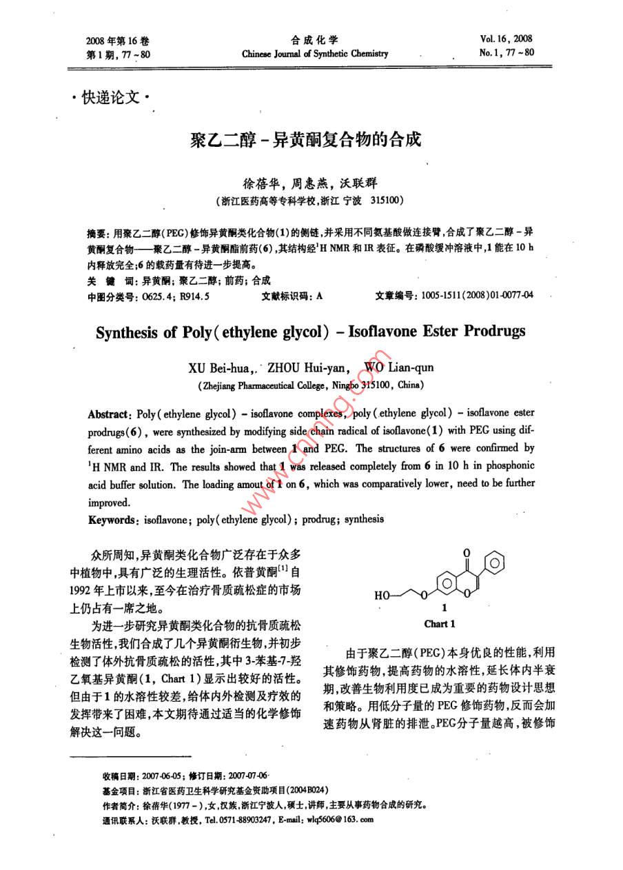 2008年第16卷合成化學(xué)vol.16,2008第1期,77-80Chinese Journal of Synthetic ChemistryNo1,77~80·快遞論文·聚乙二醇-異黃酮復(fù)合物的合成徐蓓華,周惠燕,沃聯(lián)群(浙江醫(yī)藥高等??茖W(xué)校浙江寧波315100)摘要:用聚乙二醇(PEG)修飾異黃酮類化合物(1)的側(cè)鏈并采用不同氨基酸做連接臂,合成了聚乙二醇-異黃酮復(fù)合物—聚乙二醇-異黃酮酯前藥(6),其結(jié)構(gòu)經(jīng)HNMR和R表征。在磷酸緩沖溶液中1能在10h內(nèi)釋放完全;6的載藥量有待進(jìn)一步提高。關(guān)鍵詞:異黃酮;聚乙二醇;前藥;合成中圖分類號(hào):06254;R914.5文獻(xiàn)標(biāo)識(shí)碼:A文章編號(hào):1005-1511(2008)01007704Synthesis of Poly ( ethylene glycol)-Isoflavone Ester ProdrugsXU Bei-hua, ZHOU Hui-yan, wo Lian-qunZhejiang Pharmaceutical College, Ningbo 315100, China)Abstract: Poly(ethylene glycol )-isoflavone complexes, poly (ethylene glycol)-isoflavone esterprodrugs(6), were synthesized by modifying side chain radical of isoflavone(1)with PEG using dif-ferent amino acids as the join-arm between 1 and PEG. The structures of 6 were confirmedH NMR and IR. The results showed that 1 was released completely from 6 in 10 h in phosphonicacid buffer solution. The loading amout of 1 on 6, which was comparatively lower, need to be furtherKeywords: isoflavone; poly (ethylene glycol); prodrug; synthesis眾所周知,異黃酮類化合物廣泛存在于眾多中植物中具有廣泛的生理活性。依普黃酮1自1992年上市以來,至今在治療骨質(zhì)疏松癥的市場(chǎng)HO-O上仍占有一席之地。為進(jìn)一步研究異黃酮類化合物的抗骨質(zhì)疏松Chart 1生物活性,我們合成了幾個(gè)異黃酮衍生物并初步檢測(cè)了體外抗骨質(zhì)疏松的活性,其中3苯基7羥由于聚乙二醇(PEG)本身優(yōu)良的性能,利用乙氧基異黃酮(1, Chart1)顯示出較好的活性。其修飾藥物提高藥物的水溶性,延長體內(nèi)半衰但由于1的水溶性較差給體內(nèi)外檢測(cè)及療效的期改善生物利用度已成為重要的藥物設(shè)計(jì)思想發(fā)揮帶來了困難本文期待通過適當(dāng)?shù)幕瘜W(xué)修飾和策略。用低分子量的PEG修飾藥物反而會(huì)加解決這一問題。速藥物從腎臟的排泄。PEG分子量越高,被修飾收稿日期:20070605;修訂日期:2007-706基金項(xiàng)目:浙江省醫(yī)藥衛(wèi)生科學(xué)研究基金資助項(xiàng)目(2004BO24)作者簡介:徐蓓華(197-),女漢族浙江寧波人碩土講師主要從事藥物合成的研究通訊聯(lián)系人:沃聯(lián)群,教授,T057148903247,E-mail:wlq5606@163.com78合成化學(xué)vol.16,2008藥物在體內(nèi)的半衰期越長2。但是分子量過高,會(huì)給合成帶來困難端基活化不完全,藥物攜帶量少,質(zhì)量百分比更少。因此本文選擇PEC6000修飾1。在二環(huán)己基碳二亞胺(DDC)和二甲氨基吡啶(DMAP)的催化下末端是羧基LPGPEG的PEG與1的側(cè)鏈羥基形成酯鍵。PEG末端羧基化的方法有兩種:(1)PEG與丁二酸酐縮合,一步得到含有酯鍵的末端羧基[PEG(O2CCH2CH2CO2H)2]。缺點(diǎn)是DOC, DMAP這類活化形式的PEG與藥物結(jié)合后,連接處有兩個(gè)酯鍵給考察藥物的解離度帶來困難。(2)PEG與溴代乙酸乙酯形成末端酯鍵,然后水解可得末端羧基CO?HPEG(OCH2CO2H)2]。CO2H本文采用方法(2)獲得未端羧基化[PEG的PEC600,并且用不同的氨基酸作1co和PEG6000之間的連接臂,合成了釋藥速度不同的聚乙二醇-異黃酮復(fù)合物,即聚乙二醇-異黃酮酯前藥(6a6f, Scheme 1和 Chart2),其結(jié)構(gòu)經(jīng)DDC DMAPHN、CO2HHNMR和IR表征。1實(shí)驗(yàn)部分