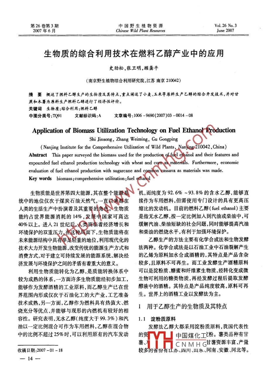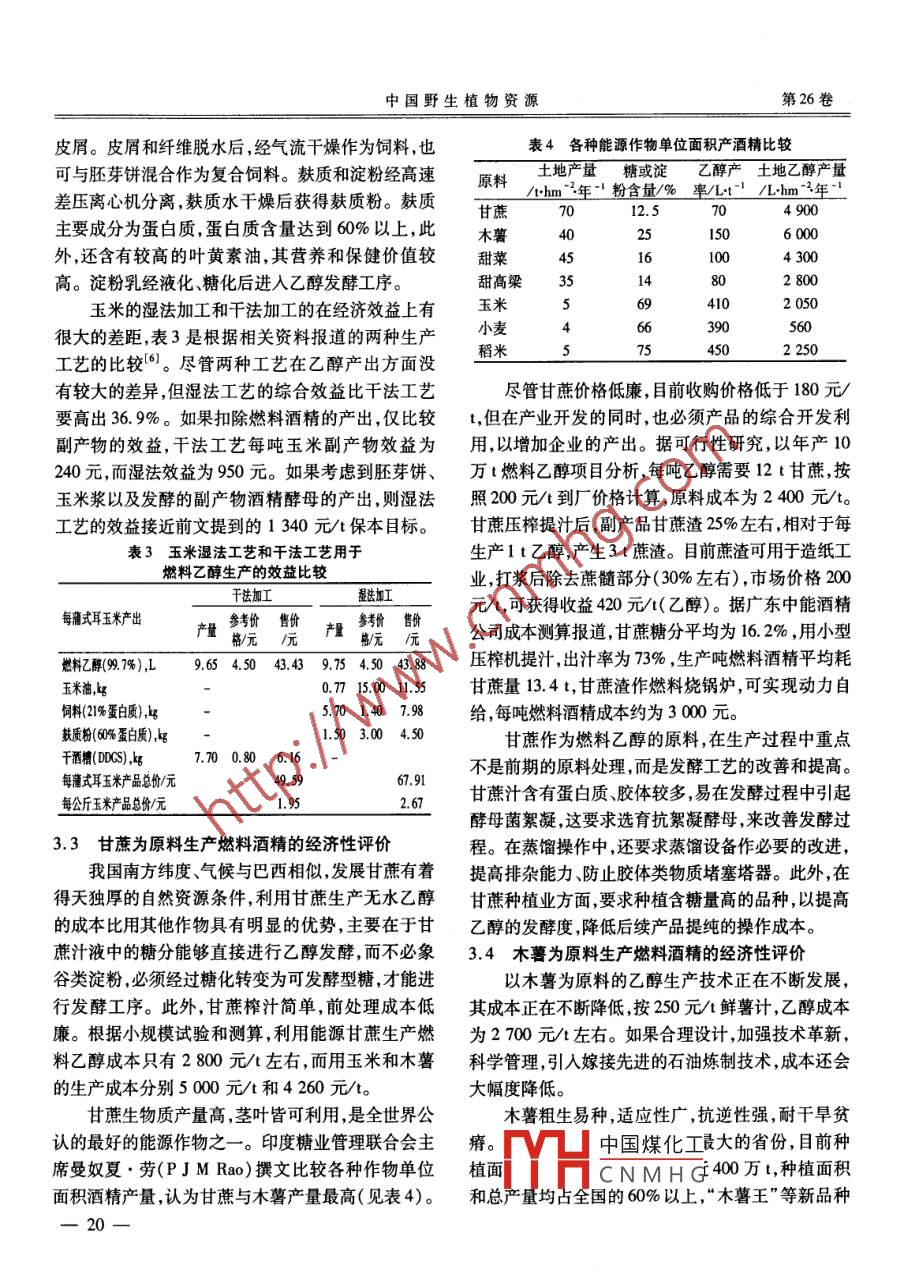 第26卷第3期中國野生植物資源Vol. 26 No. 32007年6月Chinese Wild Plant ResourcesJune 2007生物質(zhì)的綜合利用技術(shù)在燃料乙醇產(chǎn)業(yè)中的應(yīng)用史勁松,張衛(wèi)明,顧龔平(南京野生植物綜合利用研究院,江蘇南京210042)摘要概述了燃料乙醇生產(chǎn)的生物質(zhì)及其特點(diǎn),重點(diǎn)闡述了小麥.玉米等原料生產(chǎn)乙醇的綜合開發(fā)技術(shù),并對甘蔗和木薯為原科生產(chǎn)燃料乙醇進(jìn)行了經(jīng)濟(jì)性評價(jià)。關(guān)鍵詞生物質(zhì);綜合利用 ;燃料乙醇中圖分類號(hào):TQ91文獻(xiàn)標(biāo)識(shí)碼:A文章編號(hào):1006 -9690(2007 )03 -0014 -08Application of Biomass Utilization Technology on Fuel Ethanol ProductionShi Jinsong, Zhang Weiming, Gu Gongping( Nanjing Institute for the Comprehensive Utilization of Wild Plants, Nanjing 210042 , China)Abstract This paper surveyed the biomass used for the production of fuel ethanol and their features andexpounded fuel ethanol production technology with wheat and com as materials. Furthermore, economicevaluation of fuel ethanol production with sugarcane and common cassava as materials was made.Key words biomass ;comprehensive utilization ;fuel ethanol生物質(zhì)能是世界第四大能源,其在整個(gè)能源系機(jī),而純度為92.6% ~93. 8%的含水乙醇,能夠直統(tǒng)中的地位僅次于煤炭石油天然氣,一直以來都在接作為車用燃料,但需使用專門設(shè)計(jì)的具有更高壓人類的生活生產(chǎn)中扮演著及其重要的角色。生物質(zhì)縮比的發(fā)動(dòng)機(jī)。目前的燃料乙醇( fuel ethanol)主要能約占世界能源消耗的14%,發(fā)展中國家可高達(dá)是指無水乙醇,按一定比例加入到汽油或柴油中,可40%以上。進(jìn)入21世紀(jì)后,人類面臨著經(jīng)濟(jì)增長和緩解汽油、柴油短缺的社會(huì)問題,同時(shí)能夠提高汽油環(huán)境保護(hù)的雙重壓力,在這種局面下,生物質(zhì)能將在和柴油的燃燒水平,有利于加強(qiáng)環(huán)境保護(hù)。未來能源結(jié)構(gòu)中具有舉足輕重的地位,利用現(xiàn)代化的乙醇生產(chǎn)的方法主要有化學(xué)合成法和生物發(fā)酵技術(shù)大力開發(fā)生物能源,改變傳統(tǒng)的能源生產(chǎn)方式和法兩種?;瘜W(xué)合成法是以石油工業(yè)中石油裂解產(chǎn)生消費(fèi)方式,對于建立可持續(xù)發(fā)展的能源系統(tǒng),解決經(jīng)的乙烯為原料加水合成酒精的,其特點(diǎn)是產(chǎn)品含雜濟(jì)發(fā)展與環(huán)境保護(hù)之間的矛盾有著重大的意義。較多,且原料不可再生。而工業(yè)發(fā)酵生產(chǎn)酒精原料利用生物質(zhì)能轉(zhuǎn)化為乙醇,是質(zhì)能轉(zhuǎn)換體系中可以是淀粉質(zhì)糖蜜和纖維素生物質(zhì),經(jīng)轉(zhuǎn)化變成微較為成熟的體系,- -方面許多生物質(zhì)能經(jīng)初步加工,生物可利用的糖類物質(zhì),再經(jīng)發(fā)酵過程后提取發(fā)酵能夠作為發(fā)酵酒精的工業(yè)原料,而乙醇生產(chǎn)已在世醪液中的酒精。其特點(diǎn)是產(chǎn)品純度較高,原料可再界范圍內(nèi)形成僅次于石油化工的大產(chǎn)業(yè),工藝準(zhǔn)備生。世界上的酒精工業(yè)以發(fā)酵法為主。技術(shù)成熟,另一方面,乙醇作為燃料具有熱值大、燃1用于乙醇生產(chǎn)的生 物質(zhì)及其特點(diǎn).燒充分等優(yōu)點(diǎn),并能夠與現(xiàn)形的內(nèi)燃機(jī)有較好的相容性。研究表明,無水乙醇(純度大于99. 3% )和汽1.1 淀粉質(zhì)原料油以一定比例混合可作為車用燃料,乙醇在混合物發(fā)酵法乙醇大都采用淀粉質(zhì)原料,我國代表性中的比例不超過25%時(shí),可以利用原有的汽車發(fā)動(dòng).的資中國煤化工粉。薯類品種有甘薯、CN MH G甘薯資源豐富,產(chǎn)量收稿日期:2007 -01-18較多的省份有江辦、四川、山東、河南安徽、河北等。一14一第3期史勁松,等:生物質(zhì)的綜合利用技術(shù)在燃料乙醇產(chǎn)業(yè)中的應(yīng)用甘薯的塊根中大約含有20%以上的淀粉,華東甘薯香附子等均含有較多的淀粉質(zhì),可作為乙醇發(fā)酵的平均在21% ,華南甘薯平均在20.2%。在建國初原料。橡子是橡樹所生產(chǎn)的果實(shí),每年在9.10月間期,我國各地的小型酒精廠大都采用甘薯作為原料,成熟,為黃褐色或棕色的堅(jiān)果,內(nèi)含50%左右的淀其生產(chǎn)工藝成熟。馬鈴薯在我國東北、西北和內(nèi)蒙粉,民間采集橡子做成“粉皮”食用。橡子中除淀粉古產(chǎn)量很大,其淀粉質(zhì)含量在18% ~ 20% ,可作為外,尚含有粗蛋白4% ~7.5%,,脂肪1.5% ~5%,發(fā)酵乙醇的原料。木薯是多年生植物,根粗而長,盛單寧含量較高,為2% ~4%。橡子在20世紀(jì)60年產(chǎn)于南方諸省,以廣東、廣西福建、臺(tái)灣居多。木薯代,曾作為酒精工業(yè)的代用原料。土茯苓在我國廣淀粉顆粒大所含淀粉品質(zhì)較純,加工方便。此外, .東、臺(tái)灣、西南等山野之間均有生長,淀粉含量在木薯中的苦味木薯,含有有毒成分氫氰酸,不太適合60%左右。從色澤來看,土茯苓可以分為紅、白兩.食用,可用作乙醇生產(chǎn)的原料。種,紅色茯苓含有較多的單寧(9%左右)和色素,白我國酒精工業(yè)中廣泛使用谷物類原料,主要為色茯苓中含淀粉較多。我國各地均有石蒜分布,其玉米、高梁、大麥、大米和小麥。玉米的籽粒結(jié)構(gòu)可球形鱗莖中含有淀粉40% ,蛋白質(zhì)4.4% ,此外,還分為果皮種皮、糊膠粒層、內(nèi)胚乳、胚體或