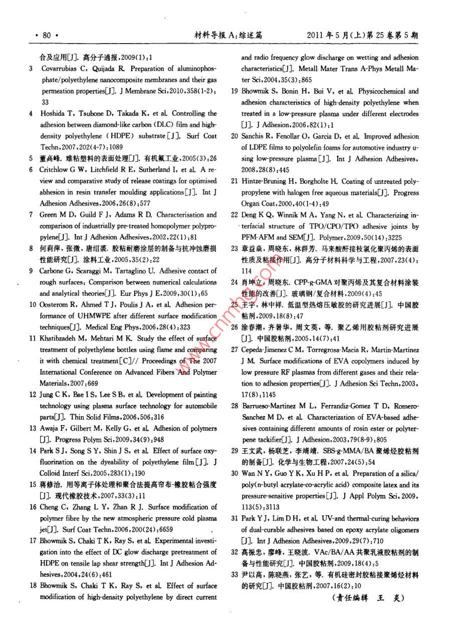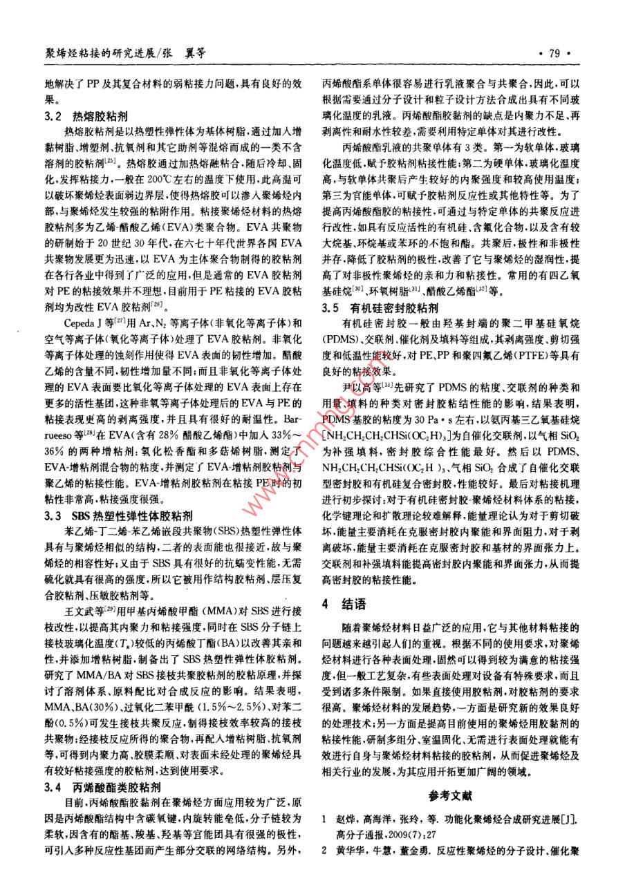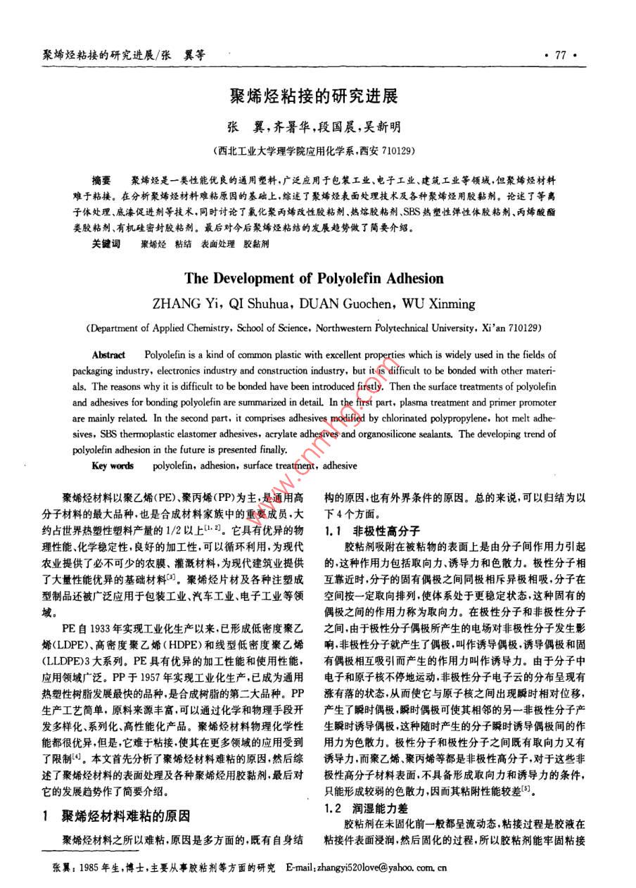 聚烯烴粘接的研究進(jìn)展/張翼等,77●聚烯烴粘接的研究進(jìn)展張翼,齊暑華,段國晨,吳新明(西北工業(yè)大學(xué)理學(xué)院應(yīng)用化學(xué)系,西安710129)摘要聚烯烴是一類性能優(yōu)良的通用塑料,廣泛應(yīng)用于包裝工業(yè)、電子工業(yè)、建筑工業(yè)等領(lǐng)域,但聚烯烴材料難于粘接。在分析聚烯烴材料難粘原因的基礎(chǔ)上,綜述了聚烯烴表面處理技術(shù)及各種聚烯烴用膠黏劑。論述了等離子體處理、底漆促進(jìn)劑等技術(shù),同時(shí)討論了氯化聚丙烯改性膠粘劑、熱熔膠粘劑、SBS熱塑性彈性體膠粘劑、丙烯酸酯類膠粘劑、有機(jī)硅密封膠粘劑。最后對今后聚烯烴粘結(jié)的發(fā)展趨勢做了簡要介紹。關(guān)鍵詞聚烯烴粘結(jié)表面處理 膠黏劑The Development of Polyolefin AdhesionZHANG Yi, QI Shuhua, DUAN Guochen, W∪Xinming(Department of Applied Chemistry, School of Science, Northwestem Polytechnical University, Xi'an 710129)AbstractPolyolefin is a kind of common plastic with excellent properties which is widely used in the fields ofpackaging industry, electronics industry and construction industry, but it is dificult to be bonded with other materi-als. The reasons why it is dificult to be bonded have been introduced firstly. Then the surface treatments of polyolefinand adhesives for bonding polyolefin are summarized in detail. In the first part, plasma treatment and primer promoterare mainly related. In the second part, it comprises adhesives modified by chlorinated polypropylene, hot melt adhe-sives, SBS thermoplastic elastomer adhesives, acrylate adhesives and organosilicone sealants. The developing trend ofpolyolefin adhesion in the future is presented fnally.Key words polyolefin, adhesion, surface treatment, adhesive聚烯烴材料以聚乙烯( PE)、聚丙烯(PP)為主,是通用高構(gòu)的原因,也有外界條件的原因??偟膩碚f,可以歸結(jié)為以分子材料的最大品種,也是合成材料家族中的重要成員,大下4個(gè)方面。約占世界熱塑性塑料產(chǎn)量的1/2以上1.2]。它具有優(yōu)異的物1.1 非極性高分子理性能、化學(xué)穩(wěn)定性,良好的加工性,可以循環(huán)利用,為現(xiàn)代膠粘劑吸附在被粘物的表面上是由分子間作用力引起農(nóng)業(yè)提供了必不可少的農(nóng)膜、灌溉材料,為現(xiàn)代建筑業(yè)提供的,這種作用力包括取向力、誘導(dǎo)力和色散力。極性分子相了大量性能優(yōu)異的基礎(chǔ)材料0。聚烯烴片材及各種注塑成互靠近時(shí),分子的固有偶極之間同極相斥異極相吸,分子在型制品還被廣泛應(yīng)用于包裝工業(yè)、汽車工業(yè)、電子工業(yè)等領(lǐng)空間按- -定取向排列,使體系處于更穩(wěn)定狀態(tài),這種固有的域。偶極之間的作用力稱為取向力。在極性分子和非極性分子PE自1933年實(shí)現(xiàn)工業(yè)化生產(chǎn)以來,已形成低密度聚乙之間, 由于極性分子偶極所產(chǎn)生的電場對非極性分子發(fā)生影烯(LDPE).高密度聚乙烯(HDPE)和線型低密度聚乙烯響,非極性分子就產(chǎn)生了偶極,叫作誘導(dǎo)偶極,誘導(dǎo)偶極和固(LLDPE)3大系列。PE具有優(yōu)異的加工性能和使用性能,有偶極相互吸引而產(chǎn)生的作用力叫作誘導(dǎo)力。由于分子中應(yīng)用領(lǐng)域廣泛。PP于1957年實(shí)現(xiàn)工業(yè)化生產(chǎn),已成為通用電子和原子核不停地運(yùn)動(dòng),非極性分子電子云的分布呈現(xiàn)有熱塑性樹脂發(fā)展最快的品種,是合成樹脂的第二大品種。PP漲有落的狀態(tài),從而使它與原子核之間出現(xiàn)瞬時(shí)相對位移,生產(chǎn)工藝簡單,原料來源豐富,可以通過化學(xué)和物理手段開產(chǎn)生 了瞬時(shí)偶極,瞬時(shí)偶極可使其相鄰的另一非極性分子產(chǎn)發(fā)多樣化、系列化、高性能化產(chǎn)品。聚烯烴材料物理化學(xué)性生瞬時(shí)誘導(dǎo)偶極,這種隨時(shí)產(chǎn)生的分子瞬時(shí)誘導(dǎo)偶極間的作能都很優(yōu)異,但是,它難于粘接,使其在更多領(lǐng)域的應(yīng)用受到用力為色散力。極性分子和極性分子之間既有取向力又有了限制。本文首先分析了聚烯烴材料難粘的原因,然后綜誘導(dǎo)力,而聚乙烯、聚丙烯等都是非極性高分子,對于這些非述了聚烯烴材料的表面處理及各種聚烯烴用膠黏劑,最后對極性高分子材料表面,不具備形成取向力和誘導(dǎo)力的條件,它的發(fā)展趨勢作了簡要介紹。只能形成較弱的色散力,因而其粘附性能較差5。.1.2 潤濕能力差1聚烯烴材料難粘的原因膠粘劑在未固化前一般都呈流動(dòng)態(tài),粘接過程是膠液在聚烯烴材料之所以難粘,原因是多方面的,既有自身結(jié)粘接件表面浸潤,然后固化的過程,所以膠粘劑能牢固粘接張翼: 1985年生,博士,主要從事膠粘劑等方面的研究E mail: zhangyi520love@yahoo. com. cn材料導(dǎo)報(bào)A:綜述篇2011年5月(上)第25卷第5期材料的主要條件之- -是膠粘劑必須可以在被粘材料上充分等離子體對LDPE進(jìn)行表面處理,LDPE表面分子鏈斷裂發(fā)鋪展,對被粘材料的表面有良好的潤濕性。流動(dòng)態(tài)膠粘劑與生在處理過程中;用N2等離子體對LDPE進(jìn)行表面處理,基體材料接觸時(shí).膠黏劑分子會(huì)受到垂直液面向內(nèi)的力,要LDPE表面與空氣里的氧氣、水蒸氣接觸,表面處理之后使膠黏劑分子進(jìn)人到基體材料表面層進(jìn)行良好的膠接,基體LDPE表面分子鏈才開始發(fā)生斷裂,表面被等離子體腐蝕的必須有