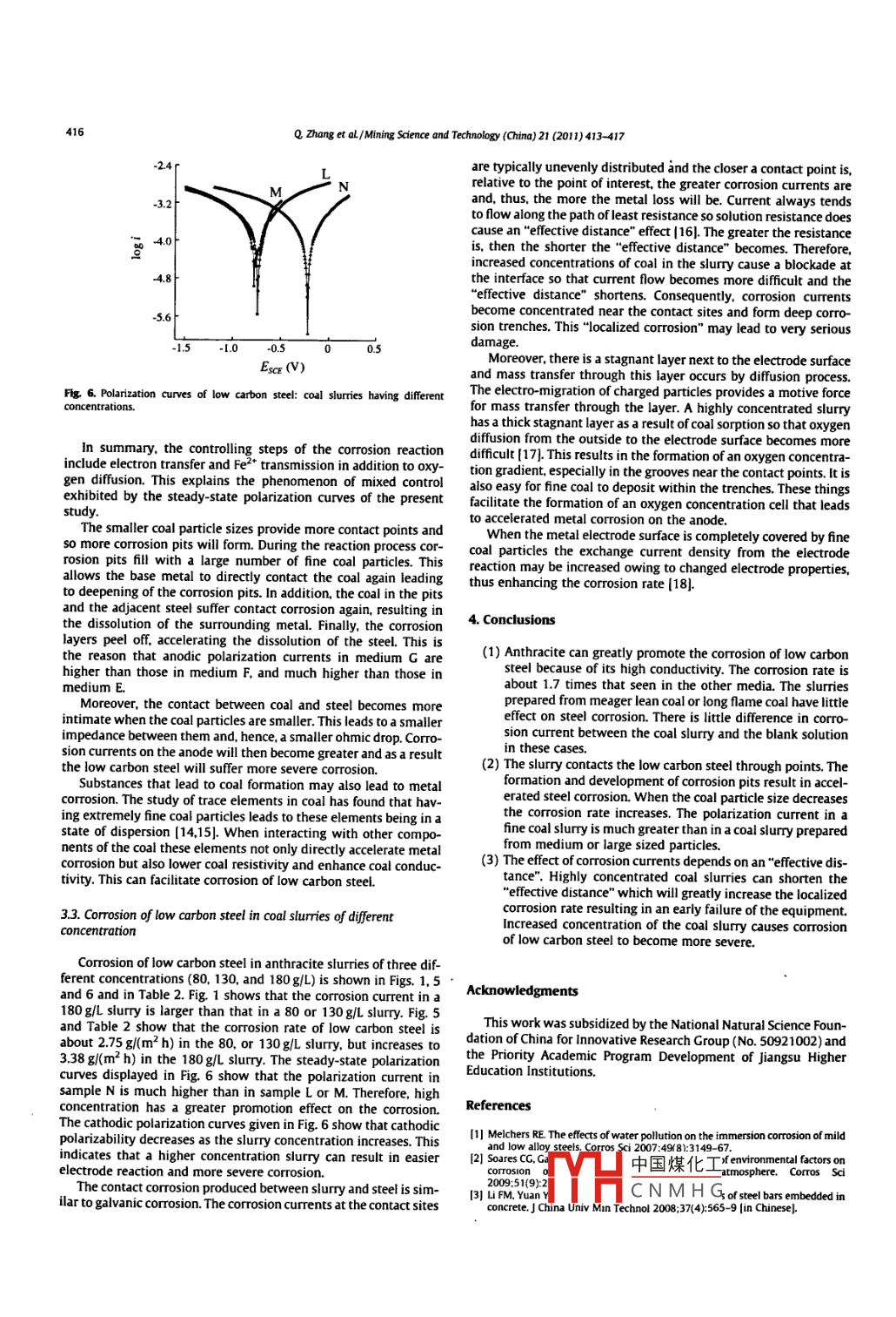 Mining Science and Technology(China)21(2011)413-417Contents lists available at Science Direct氵Mining Science and Technology( China)ELSEVIERjournalhomepagewww.elseviercom/locate/mstcEffect of coal slurry on the corrosion of coal-mine equipmentZhang Qi, Xie Jingxuan*. Zhao Wei, Bai Shasha, Zhong Shiteng, Chu ZhenfengKey laboratory of Coal Processing and Eficient Utilization, School of Chemical Engineering and Technology, China University of Mining and Technology, Xuzhou 221008, ChinaARTICLE INFOABSTRACTThe corrosion of coal mine equipment immersed in coal slurry is addressed. The corrosion of low carbonReceived 22 october 2010Received in revised form 18 November 2010steel samples immersed in coal slurries of different concentrations(80. 130, and 180 g/L)preparedAccepted 15 December 2010rom coals of different rank(long-flame coal, meager lean coal, and anthracite)and different granularityAvailable online 12 June 2011(0.25-0.5 mm. 0.074-0. 25 mm, and less than 0.074 mm particle size) was studied by the electrochemicalmethod of polarization curve measurement controlled potential sweeping and continuous scanning. Theresults show that the corrosion rate in an anthracite slurry where the coal has high coalification, is fargreater than corrosion in a long-flame or a meager lean coal slurry. Furthermore the corrosion current.polarization current, and corrosion rate of low carbon steel become larger, and the polarizability becomessmaller. as the coal particle size decreases. The same trend is seen as the concentration of the coal slurryo 2011 Published by Elsevier B V, on behalf of China University of Mining Technology1 Introduction2. ExperimentalEquipment corrosion has always been a key factor related2.1. Instruments and reagentsservice life in coal mining. Some equipment is immersed in slimewater for a long time and any low-carbon steel structure isThe electrochemical workstation(IM6e, Zahnereletrik Gmbhdestroyed by this corrosive medium. in addition, running equip- Co., KG), potentiometer(EL20, Shanghai). and conductivity meterment also suffers serious erosion due to abrasion between media (DDS]-308A, Shanghai)were used in this study a low carbon steeland equipment. For example, the flotation vanes of a coal washery (Q235)with 0. 14-0. 22 carbon content was used. The working elec-located in the Huaibei mining field suffered corrosion and erosion trode had an area of 7. 065 cm and a saturated calomel electrodeof a large area after only three months in operation. Furthermore, was used as the reference. Anthracite meager lean coal, and longthe coal slurry transportation pipelines were worn out. These prob- flame coal samples were from the Taixi, Xuzhou and Yulin mineslems created great difficulties in terms of maintenance and caused respectively. the chemical composition of the test solution comeshuge economic losses to the enterprisefrom water quality analysis of flotation feed and flotation tailingsFactors influencing electrochemical corrosion of metal are found in the Guobei coal washery. Its chemical components arediverse. Many publications address the characteristics of the metal given in Table 1and the corrosive medium including pH value, concentration ofanionic and cationic ions, oxygen content, and the distribution ofoxygen within the area suffering corrosion 1-4]. However, in the 22. Methodscoal industry corrosion of equipment is closely related to contactwith slime water containing complex ions and coal.First, the coal sample was crushed and screened into three dif-The effect of the coal on metal corrosion is the primary focus of ferent size ranges: 0. 25-0. 25 mm. 0.074-0 25 mm, and less thanthis paper. Preliminary studies on the corrosion of low carbon steel 0.074 mm. These granulated samples were used in making the coalimmersed in coal slurries of various concentrations prepared from slurry at concentrations of 80, 130, or 180 g/L using the test solucoals of different rank and particle size have been investigated by tion as the liquid medium.electrochemical methods. The goal is to provide useful informationThe low carbon steel was de-rusted, polished, and then cleanedconcerning the corrosion and protection of coal mining equipment. with distilled water, acetone, and then distilled water again. It wasthen put into the slime water for one hour while ensuring adequatecontact between the steel and the coal. After the system reached astable potential its free corrosion potential was measured using aCorresponding author. Tel +86 15996915259potentiometer. Theum and the stea-E-mailaddress:zhangqi@126.comUxie).dy-state polarizat中國煤化工nd anode wer1674-5264/s-see front matter o 2011 Published by Elsevier B.V. on behalf of China University of Mining & TeCNMHGdoi:10.1016mstc201105015414Q Zhang et aL/ Mining Science and Technology(China)21(2011)413-417Table 1Chemical components of the test solution.ComponentO Mg* Ca2+c(mg/L)3202501.16measured with a conductivity meter and an electrochemical work-station, separately. a curve showing corrosion current density versus scanning onog coordinate scale was automaticallyplotted. This curve, E vs log i, along with the slope of the polariza-tion curve and some electrochemical parameters, including corrosion potential and corrosion current, were automatically obtainedThe corrosion rate was derived from the corrosion current accordEscE(ing to Faraday's law. The tests were done at ambient temperature. fig 2. Polarization curves of low carbon steel in coal slurries: diferent ranks ofhe media will be indicated in this paper as: A: blank solutionBlong flame coal slurry: C: meager lean coal slurry: D: anthracitecoalification.slurry: E: slurry prepared with 0.25-0.5 mm anthracite: F: slurryprepared with 0.074-0.25 mm anthracite: G: slurry prepared with the anthracite slurry is 480 us cm, which corresponds to the big-<0.074 mm anthracite: L: 80 g/L anthracite slurry: M: 130 g/ gest corrosion rate of low carbon steel in it. Whereas the conduanthracite slurry: