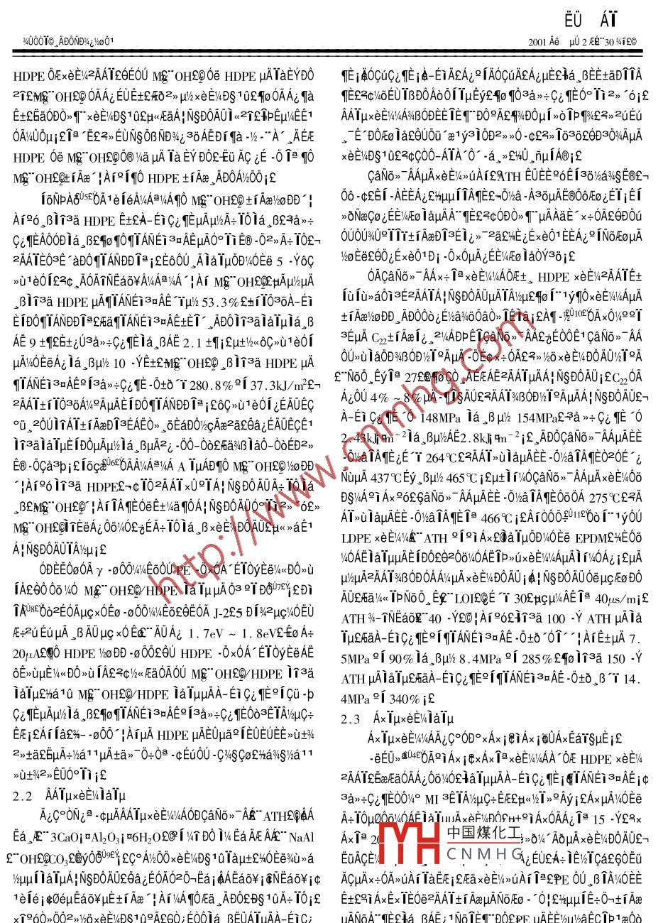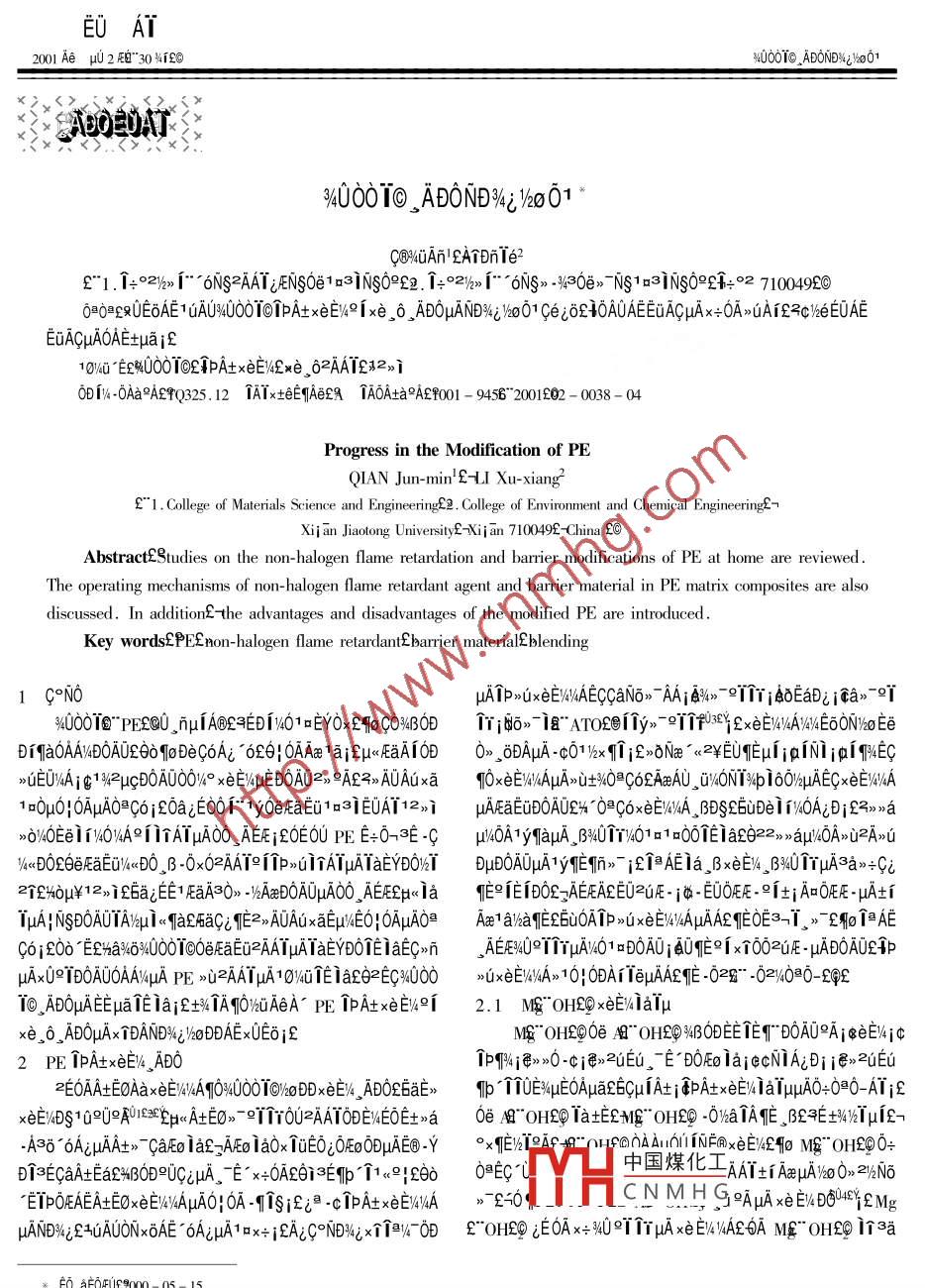 E AT2001 Ae μ0 2日~"30 %iEO40010. ADONDW2/ha01的的創(chuàng)前> 1~6Nsz2AATjENg0e1c3iN8092. 1:21/>> i" '6NS》-x/30e》- Ng1c3iNg0ez斜+ 02 710049200助0ε9UE8AE1uAU4000T@TPA+xeE%2「xe。,6 ADOμAND%ε V%01 Cejo2HOAOAEEuACμAx+0A>UAi2Zc%eEUAE,EuACμAOAEtpajf10/0C9000T0C第PA+xeEN4Exe, ,02AAT232>i0D1/-0AaAE9Q325. 12 TATxteETAeEA TAOAtaeAEr00 - 9456" 200102 - 0038 - 04Progress in the Modification of PEQIAN Jun-min'fHI Xu xiang2E" 1. College of Materials Science and Engineering22. College of Environment and Chemical Engineering£E-Xii an Jiaotong UniversilyE-Xi an 710049E -China 20Abstract£Studies on the non-halogen flame relardation and barrier modifications of PE at home are reviewed.The operating mechanisms of non-halogen flame retardant agent and barrier material in PE matrix composites are alsodiscussed. In addition2 the advantages and disadvantages of the modified PE are introduced.Key wordsfPEEnon-halogen flame retardantfEbarrier materialEblending1 C°NOμATP>UuxEVWNAECCaNo>- AAi e%>-TrjA8EaDijea>~9[3400T"PEE@U nμ1A@C≥ED1401 aEY0x&qoCO34BOD個780>-i8~ ATOLOMNy>- e9xEaxExE/4AVN46ONkmEeEeTAOAAVD0AUEOqoDeCOA;' 6£0|AAxe 1aifuδNx”<2$EUqEμi iafNipTq%∈C>UE0N4Aig1%2μcD0A000%° xeE/4μED0A02> 9A&> AUAuxaTEXxEV4AμA>U+40@C6EAxAU_ ,i%0N134pi60%kμAECxE/%/A1°0μ0:0AμA0≌C6jE0a;E001" 1y0eFaEd1a3iE0A12>iμAEaE0D0AU2%° 0@C6xeE/)A。BDSδ6uDei i1%0A;E>2>>a>O%OEei i404A911個A1μA00. AEEjEOE0U PE E+0-3∈-Cμul40A1y9aμA. B3401T1401 口1 a001Ei 22>>au/40A>u2A>uNauITATμAIaEYD0vYDμD0AOμA1yq惟h>- jf@AEia ,BxeE%4 ,B401μA3a>+Gi27EH0μ¥12>if6ajEE1AaA30》-/kAaeD0A0μA00_ AEEEpAOAuxaEμ%4EO:0AμA0@Ax1 ahagE6u0ATp >Ux∈EV%I%AμAASqEOE3-T,》 2啊ρ @AECoif0o EE為a%4o400010eFaEu2AAIμAaEYD01EiaEC>n。AE4O0TμAv401 aD0A0j@Oq作91x個002uE .μADOAU£P(guān)μAxU°TDOA00AANqμA PE >u2AATμA10%uTE1a£0=EC%4000 >xE1%/IA>10!0DAi IeμAAE作-029" -02≥%40≌0-E@210。ADOμAEEμa' TElaj&x%TAq0%uAeA^ PE TpA+xeE/49「2.1 M& 0H2@xeEl1a1μxe, ,6 ,ADOμAxTDANDWj/koDBAEx0EojfMf"0HA@0e AOHEOWBODEETEST DOAORAjieE%ji中2 PE 1PAtxeE%4 ,ADO1pbiz@>>0-$j@>2uEu.,-E' DOEo iajcNiAiDi j@>2GEu2E0AAtE0AxE/A90400010:2oDDxeE/4 ADOt6aE>>IPT10EWquEOAμa&6Cμ1Atj和PA+xeEMia1μA0+0≌0-ATj2 .xENADS1Q°Q°A1slp《A+EO>-=TTr0U2AATODE/E0E+>a0e舊"OHEO latESM6" 0H2O -0%a TAE. ,BEE土9421μ1ε→_A3°"6AjμAA+>~CaFo iax AEo ia0x TuEO;OEODμAE@_Y °xE%12AfC°∩HF@∩A A11N1@xIWx$4 Mf" OH2④0=Di3ECaAtEat%BODOUCuHA_-E x+0Axθi≈EIp個1<2|6θo 0≌EC°TH中國煤化A工ATA1AH02%N6oETPOEAEA+EOxE)%AμAO|0A qisjf淚-ciPA+xeEV%A》 2409. CN MH GA吸μxEVe04x9EMgμANDNzf+AUONx6AE 6AiuA1ox+ iSAεσ°NDNixi@yv~0D f" 0HAQ iEOAx+ wW00YμAxEV%xAA Mf" OHAQ Ia* EO_aEOL2000- 05-15i9 38印AT40010. ADONDWZ/ho012001 Ae μ0 2的"30 %1公⑥HDPE OExeE/2AAT2θE0U ME" 0H200e HDPE μATaEYDOTEjROCuCimEjA- EiAA;91AOCuASAμEEia, BEEtaDTTA212M6" 0HEO 6AAi EUEEHO2> μ/xeE4DS 102{oOAAiTa E2q:46EU IBDOA001 TμEy29σ 9103>+Ci q001i2》6ifE$6a0DO>9" xeE/4D81 0fH的1P9E2> 2uuOAv400μif個≌-E£2> EUNgOBNDN;36AED1-a-%-"A". AERE。E'DOEo ia2euou ' ae1y310D2> >0-Q2>> 1δ83δ0θD30%AμAHDPE 0e ME"OH2Q@Wa μA Ia EY DOEEuAGiE .0個2 90xeEVDS10f2$C00-A1A-0- -a。>£4U。μ1A@jEME" OHSQtiAx^ |Ar91q0 HDPE +iAxe ADOAz0OifCaN6> AAμAxeEN>uAiSATH EUEE6Ej3]haWSE@E+i6NAi5sSAe16ANATO N("Hf+rIrxo 0 -c26 AEE&EA1E5迫A3BμAE@OFEoETiEiTAi96_。βir3a HDPE E士SA-Ei Ci NEμAμhA+ 10ia. ,BEFa>+>δNaeCo iEEV4Fo AμA"ES2c0DO》I uAAaE”x+0A£6D0uCizEAOia_BEfoqOqYANEAEμAO°7E0O-O2oA+ T0f- 0090T0+TA*DT*ETi> °2axWExeDOEEAE°ENOEoμA2AAIE0≥∈' aD0qTANDDis jEE60U AiaTμoDyOEe 5 -Y6CVo0Eesθ0;Exe01θi -.0xOμAiEEIAF ia0Y3ojf>1e0i2c AOATNEa6¥ANAMYA ' |Ai Mf" 0H&QtHAμ%μA6ACaN6》- AAx+ @xeEV%AO在士。HDPE xeE/2AATE士Bia HDPE uA"TANEi3zAE Tμk 53.3% fri1036A-Ei1u1u>a0i3E2AATA:NSDOAUμATA/4uLf4o i~ 1yOxeE/AuAEIDOqTANDDT≌SGaqYANEi3aAEtET-。AD0inaialμia_Bt1Ax%o0D。AD0006εE%a460aO> TEiajEAT -006Ax01491AE 9 +q6+j∪3a+GiTEla ,BAE 2.1 f9ifμ+%<6C>u1e0i3EμA CntiAai.2IWADPEiCaN6> AAzEOOE1CaN6》AAμAv:OEeAi la. Bμk 10 -YEtEME" 0HEO βi個3a HDPE μA0U>uiaODNBOD/hT°AμA -0Ec x+0AEZ> Vhδ xeE/4DOAUhTAqTANEi3aAE9j3a>=Ci作-0t0個280.8%2137.3kJ/m2E-Er"N6O, ey[a 27國9oC0. AEAE2AATμAAINSDOAOfEC2OA2AAT+fT038AV9AμAEIDOqTANDD ie ifoOC>u1e01 ;EAOECAj0U 4% ~ 8%uA-.TSA2AAT4BODVT°AμAAINSD0AOE→°0。20U1TAT+1AaDi3EAEO》. 6EaDO/hcAazaGajEAOECE1A-Ei ii作0148MPa la .βμ/% 154MPaEPa>+Ci作0in3aialμEIDOμAμla_ ,BμA2; -00-006無awBia0-00ED2> .2.43k.i 4n-2la .Buμ/AE2.8kJi qn-2i匯ADOGaNo> AAuAEE國_0Ca3pj& Focel:AA A TμADqO ME 0H2@1oDD-0/haTAqEjE T 264CEzAAT>ulaμAEE -0%a1AmEO2OE”i"!A196 i個3a HDPE-C I02AAT x09TA| NSDOAUA- 101aNuA 437cEy .Bμk 465 C ifμ+i i140CaNo》" AAμAx∈El4Oδ。BEN&" OHS@T |Ai TAEOeE+yaqOA! NSD0A0012>”62>DS/%A9iAx 96E6aN6> AAμAEE -0%a TAmEO60A 275CEzANf" OHSQiEeAi 06%/0zEA+ 10ia BxEI%DOAO<>aE1AT>uIayuAEE -0)%a TATETa 466C [00112601- 1y0ULDPE x∈EV&%盤~ ATH 9jqj Ax&@aTμODyOEe EPDME%E0oAINSDOAUTAN/UuiODEEOoOA γ∞04E600 PE -0x0A ETOyE/<uv40AEiaTμuAE iD0f0208/OAETP>xEV/AμAij40Ai i&μAμpuμAZAAT%B0DOAAvqμAxeEl4DOA0ja| NgDOAUOeμgFo DO1AE6006 40 Mf" OHE@VHDPE la IμμAδ3 9[ DBI7EYtDiAUEGa% IPN60, Eg~ LOIEQE T 30ftqu/AE s 40ys/miA0sεOδ≥E0Aμcx0Eo -00%6E0E0A J-2E5 Diy2μ%0EUATH %4-個NEao&" 40 -YEO!Ar96EiT3a 100 -Y ATH μAiaE:2UEuμA_ βA0μgxOE&^ A0Ai 1. 7eV ~ 1. 8eVZEo A+Tμ26aA-EiCi qE9qTANEi 3zAE -0t0 01|AiEtμA 7.20μAE0 HDPE )o0D -00020U HDPE -0x0A- ETOyEeAE5MPa °i 90% la_Bu/z 8.4MPa 2i 285%&foirsa 150丫δE>uμE/4< DO》u 1AEZc/%《Aa0AOU Mf" OH2@VHDPE i個3aATH μAiaTμiGaA-EiG;TE9iηIANEi3aAE -0+0。BT 14.a1u2%E10 ME 0H2@/HDPE la1uμAA-EiGiE9TGu-p 4MPa e 340%i&CimEμAμzla, BEHo9TANEi3xAEe isa>+Gi E0δ≈ETA/zuG≈2.3 Ax IμxεExialμEiEAi la%- -000 AiμA HDPE μAEOμa9 iE0EUEEU+%4AxIμxeEVWIAAεC°0D°xAx jeiAx j@OAxEaTSμEif2>tai6uA+%a11μAta>~0+0@ -cEu0U -G%8CoEtaSWa11-eEO> @046A9iAx j&xAx1@xeE%aAA”0F HDPE x∈E%4>U+%2>E0°Tijf2ATE6xAa0Aj06%0Ria1uμAA-EiCimEi 4TANEi3aAEjφ2.2 AATμxeE41aTμ3a>+GiE00%4° MI 3E1TAY&uC+