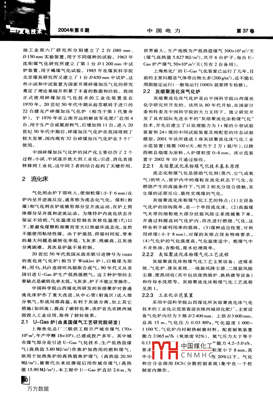 第37卷第6期中國電力Vol. 37, No. 62004年6月ELECTRIC POWERJun., 2004發(fā)電技術中干法迸料煤氣化技術在中國的迸展與發(fā)展超勢任永強l,許世森2,郜時旺2(1.西安交通大學,陜西西安710049; 2.國電熱工研究院,陜西西安710032)摘要:煤氣化技術是燃煤聯(lián)合循環(huán)、煤化工、綜合利用系統(tǒng)和零排放系統(tǒng)的關鍵技術之一。介紹中國煤氣化技術的應用和發(fā)展現(xiàn)狀,包括固定床氣化(常壓UCI爐和加壓Lurgi 爐)、流化床氣化(U-gas 爐和中國科學院山西煤炭化學研究所開發(fā)的常壓灰熔聚流化床爐)和氣流床氣化(國電熱工研究院提出的2段式干煤粉加壓氣化爐),并對這3種床態(tài)的優(yōu)缺點進行了對比。通過比較認為,2段式干煤粉加壓氣化爐氣化和灰熔聚流化床氣化優(yōu)勢明顯。關鍵詞:煤氣化,干法進料;流化床氣化中國分類號: TQ546.2文獻標識碼: A文章編號: 1004-9649(2004)06-0049-04動的。因而,將要離開氣化爐的熱灰渣可在運動過程0前言中加熱剛進入氣化爐的氣化劑,即將離開氣化爐的熱煤氣則可用來預熱剛進入氣化爐的煤。在進入氣煤氣化是潔凈、高效利用煤炭的主要途徑之一,化爐前,煤需經(jīng)破碎和篩分,除去直徑小于3.175 mm長期的生產實踐表明,在將煤炭轉變成更便利的能源的細煤塊。通常要求煤粒尺寸控制在6.35-38.00mm和產品形式的各種技術中,煤氣化是應優(yōu)先考慮的一間。為防止煤的熔結,可采用攪拌器或旋轉爐箅。固種加工方法。城市煤氣、化工合成用原料氣先進的聯(lián)定床氣化的局限性是對床層均勻性和透氣性要求較合循環(huán)發(fā)電用燃氣和綜合利用系統(tǒng)是煤氣化發(fā)展和高,人爐煤要有一定的粒(塊)度及均勻性。煤的機械應用的主要方向。氣化爐的分類按煤與氣化劑的相對強度、熱穩(wěn)定性、粘結性和結渣性等指標都與透氣性流動方式可分為逆流、并逆流和并流等3種。與這3有關,因此,固定床氣化爐對人爐煤有很多限制。種方式相對應的則是固定床.流化床和氣流床氣化爐。煤氣化工藝大多為德國人研發(fā),至今已有100雖然國外已有多種煤氣化技術開發(fā)成功,但我多年歷史。第1臺常壓固定床空氣間歇氣化爐于國煤氣化技術及相應的煤氣高溫凈化技術都還處于1882年設計,1913年工業(yè)化后被美國UGI Corpora-開發(fā)階段,與世界先進技術相比差距甚遠。針對我國tion發(fā)展成現(xiàn)在的UGI爐(由UGI Corporation研發(fā),幅員廣大、煤種多、煙煤多、粉煤多、煤質變化大的特故名UGI爐)。該爐以焦碳為原料、蓄熱和氣化交替點,國家從“六五”(1980~1985年)至“十五"(2000~進行制取合成氣,國外已于20世紀60年代初廢棄。2005年)期間投人大量人力、物力,研制開發(fā)先進的我國于20世紀40年代引進UGI爐,50年代改煤氣化技術,以便在較短時間內趕上世界先進水平。燒無煙煤,主要用于制氨和甲醇,最多時有1 000余我國是繼德國以后研發(fā)和應用煤氣化工藝(技術)最家采用約數(shù)千臺爐子,至今尚有670余家,主要原料多的國家,幾乎遍及.上述3種床層的各個領域?,F(xiàn)總是無煙煤和土焦。UGI爐生產的氨(甲醇)大約占全結40多年來中國在煤氣化技術方面的研發(fā)和應用國煤基氨廠總產量的90%以上。由于UGI爐有諸多歷史,以此探求煤氣化工藝的發(fā)展方向。缺點,包括煤種限制、環(huán)保、氣化強度和效率,我國從60年代初至今曾研發(fā)過多種氣化工藝,而實現(xiàn)工業(yè)1固定床化的只有碎煤加壓氣化(Lurgi),而大部分試驗爐型僅處于試驗階段。在固定床氣化爐中用爐箅來支撐煤塊。氣化劑我國對碎煤加壓氣化技術的研究始于20世紀(O2或空氣與水蒸氣)與煤及其殘渣是彼此逆向流50年代。當時在中國科學院山西煤化所和錦州的石中國煤化工收稿日期: 2003-10-23; 修回日期: 200-12-29基金項目:“十五”國家高技術研究發(fā)展計劃(863計劃)課題(2003AA522(MHCNMH G作者簡介:任永強(1974-),男,山西汾陽人,博士研究生,從事氣固兩相流、煤氣化和煤氣凈化技術的研究。E-mail:renyongqiang@tpri.com.cnI發(fā)電技術2004年第6期中國電力第37卷油工業(yè)部六廠研究所分別建立了2臺D80mm、世界最大。生產規(guī)模為產低熱值煤氣300x104 m'/天D150mm實驗裝置,用于不同煤種的試驗。1963年(煤氣高熱值5.827 MJ/m'),共開6臺爐子,每臺U-沈陽煤氣化研究所建立了第1臺D1200mm中試Cas爐產煤氣50x10*m?/天(另有2臺備用)。爐裝置,用于褐煤氣化試驗。1985 年在煤炭科學院上海焦化廠的U- -Cas氣化裝置已運行了幾年,目北京煤炭研究所又建立了1臺D 650 mm中試爐。這前的主要問題是氣體帶出物太多(200g/m2),還不能長些小試和中試裝置為國家開展碎煤加壓氣化的研究周期穩(wěn)定運行(- -般每運行1000h就要停車檢修)。奠定了理論基礎并積累了豐富的數(shù)據(jù)和經(jīng)驗。我國2.2灰熔聚流化床氣化爐正式使用碎煤加壓氣化技術的工業(yè)化裝置是在灰熔聚流化床氣化爐是由中國科學院山西煤炭1970年。20世紀50年代中期從前蘇聯(lián)轉手進口的化學研究所開發(fā)的。該所從80年代開始,在國家計22臺捷克產碎煤加壓氣化爐(相當于第1代魯奇委和科委及中國科學院的大力支持下,獨立研究開爐),于1970年在云南開遠的解放軍化肥廠啟用4發(fā)了具有國際先進水平的“灰熔聚流化床粉煤氣化”臺,用于生產合成氨原料氣,后增加到11臺。進入20技術并先后建立了日處理能力為1t