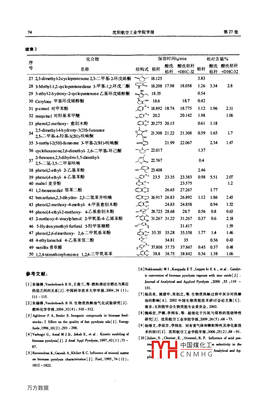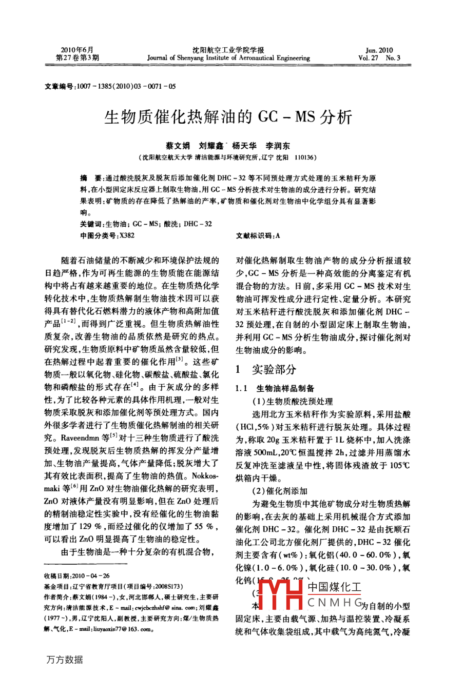 2010年6月沈陽(yáng)航空工業(yè)學(xué)院學(xué)報(bào)第27卷第3期Journal of Shenyang Institute of Aeronautical EngineeringVol 27 No. 3文章編號(hào):1007-1385(2010)03-0071-05生物質(zhì)催化熱解油的GC-MS分析蔡文娟劉耀鑫楊天華李潤(rùn)東(沈陽(yáng)航空航天大學(xué)清潔能源與環(huán)境研究所,遼寧沈陽(yáng)110136)摘要:通過(guò)酸洗脫灰及脫灰后添加催化劑DHC-32等不同預(yù)處理方式處理的玉米秸稈為原料,在小型固定床反應(yīng)器上制取生物油,用CC一MS分析技術(shù)對(duì)生物油的成分進(jìn)行分析。研究結(jié)果表明:礦物質(zhì)的存在降低了熱解油的產(chǎn)率,礦物質(zhì)和催化劑對(duì)生物油中化學(xué)組分具有顯著影響關(guān)鍵詞:生物油;CC-MS;酸洗;DHC-32中圖分類號(hào):X382文獻(xiàn)標(biāo)識(shí)碼:A隨著石油儲(chǔ)量的不斷減少和環(huán)境保護(hù)法規(guī)的對(duì)催化熱解制取生物油產(chǎn)物的成分分析報(bào)道較日趨嚴(yán)格,作為可再生能源的生物質(zhì)能在能源結(jié)少,GC-MS分析是一種高效能的分離鑒定有機(jī)構(gòu)中將占有越來(lái)越重要的地位。在生物質(zhì)熱化學(xué)混合物的方法。日前,多采用GC-MS技術(shù)對(duì)生轉(zhuǎn)化技術(shù)中,生物質(zhì)熱解制生物油技術(shù)因可以獲物油可揮發(fā)性成分進(jìn)行定性、定量分析。本研究得具有替代化石燃料潛力的液體產(chǎn)物和高附加值對(duì)玉米秸稈進(jìn)行酸洗脫灰和添加催化劑DHC產(chǎn)品2,而得到廣泛重視。但生物質(zhì)熱解油性32預(yù)處理,在自制的小型固定床上制取生物油,質(zhì)復(fù)雜改善生物油的品質(zhì)依然是研究的熱點(diǎn)。并利用GC-MS分析生物油成分探討催化劑對(duì)研究發(fā)現(xiàn),生物質(zhì)原料中礦物質(zhì)雖然含量較低,但生物油成分的影響在熱解過(guò)程中起著重要的催化作用。這些礦物質(zhì)一般以氧化物、硅化物、碳酸鹽、硫酸鹽氯化1實(shí)驗(yàn)部分物和磷酸鹽的形式存在。由于灰成分的多樣1.1生物油樣品制備性,為了比較各種元素的具體作用機(jī)理,一般對(duì)生(1)生物質(zhì)酸洗預(yù)處理物質(zhì)采取脫灰和添加催化劑等預(yù)處理方式。國(guó)內(nèi)選用北方玉米秸稈作為實(shí)驗(yàn)原料,采用鹽酸外很多學(xué)者進(jìn)行了生物質(zhì)催化熱解制油的相關(guān)研(HCl,5%)對(duì)玉米秸稈進(jìn)行脫灰處理。具體過(guò)程究。 Raveendmn等對(duì)十三種生物質(zhì)進(jìn)行了酸洗為,稱取20g玉米秸稈置于1L燒杯中,加入洗滌預(yù)處理發(fā)現(xiàn)脫灰后生物質(zhì)熱解的揮發(fā)分產(chǎn)量增溶液500mL,20℃恒溫?cái)嚢?h,過(guò)濾并用蒸餾水加、生物油產(chǎn)量提高,氣體產(chǎn)量降低;脫灰增大了反復(fù)沖洗至濾液呈中性,將固體殘?jiān)庞?05℃其有效比表面積提高了生物油的熱值。NOko烘箱內(nèi)干燥。mk等6用ZnO對(duì)生物油催化熱解的研究表明,(2)催化劑添加ZnO對(duì)液體產(chǎn)量沒(méi)有明顯影響,但在ZnO處理后為避免生物質(zhì)中其他礦物成分對(duì)生物質(zhì)熱解的精制油穩(wěn)定性實(shí)驗(yàn)中沒(méi)有經(jīng)催化的生物油黏的影響,在去灰的基礎(chǔ)上采用機(jī)械混合方式添加度增加了129%,而經(jīng)過(guò)催化的僅增加了55%,催化劑DHC-32。催化劑DHC-32是由撫順石可以看出ZnO明顯提高了生物油的穩(wěn)定性油化工公司北方催化劑廠提供的,DHC-32催化由于生物油是一種十分復(fù)雜的有機(jī)混合物,劑主要含有(w%):氧化鋁(4.0-60.0%),氧化鎳(1.0-6.0%),氧化硅(10.0-30.0%),氧收稿日期:2010-04-26化鎢(基金項(xiàng)目:遼寧省教育廳項(xiàng)目(項(xiàng)目編號(hào):20085173)中國(guó)煤化工作者簡(jiǎn)介蔡文姐(1984-),女河北邯鄲人,碩士研究生,主要研究方向:清潔能源技術(shù),E-mal:cwjcbczhshf@sin.com;劉耀鑫CNMHG為自制的小型(1977-)男遼寧沈陽(yáng)人副教授主要研究方向:煤/生物質(zhì)熱固定床,主要由載氣源加熱與溫控裝置、冷凝系解、氣化,E-mal:liuyaoxin77@163.com統(tǒng)和氣體收集袋組成,其中載氣為高純氮?dú)?冷凝沈陽(yáng)航空工業(yè)學(xué)院學(xué)報(bào)第27卷系統(tǒng)包括4支吸收瓶,并將吸收瓶放入盛有冰水表1不同預(yù)處理熱解產(chǎn)物比較混合物的容器中,如圖1所示。生物油產(chǎn)率焦炭產(chǎn)率氣體產(chǎn)率玉米秸稈34酸洗+DHC-32由表中可以看出,未處理的玉米秸稈熱解油經(jīng)過(guò)酸洗脫灰的玉米秸稈熱解油產(chǎn)率為35%和38%,呈上升趨勢(shì)。 Julien指出無(wú)機(jī)離子加強(qiáng)了纖維素的脫水反應(yīng)、分子間以及分子內(nèi)的鍵斷裂,1.N2氣罐;2.流量計(jì);3.控溫電阻爐;4.石英管;5.連續(xù)進(jìn)料口;6.冰水冷凝裝置;7收集瓶從而降低了左旋葡聚糖的產(chǎn)量。在酸洗過(guò)程中將圖1固定床反應(yīng)器生物質(zhì)快速熱解簡(jiǎn)易裝置圖引人CI,也有利于生物油的生成,而且脫灰增大(4)生物油制備方法了生物質(zhì)有效比表面積,提高生物油的熱值。在自制的小型固定床上,在溫度450℃,N2流而在酸洗玉米秸稈的基礎(chǔ)上加入催化劑量100mL/min條件下,對(duì)玉米秸稈、酸洗玉米秸HC-32的玉米秸稈熱解油產(chǎn)率為33%,比玉米稈以及添加DHC-32催化劑的酸洗玉米秸稈進(jìn)秸桿和酸洗玉米秸稈的熱解油產(chǎn)率都低,這是因行快速熱解實(shí)驗(yàn)制取生物油,并用孔徑為045m為在快