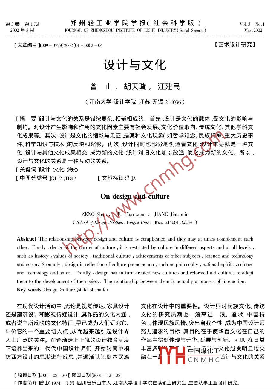 第3卷第1期鄭州輕工業(yè)學(xué)院學(xué)報(bào)(社會(huì)科學(xué)版)Vol.3 No.12002年3月JOURNAL OF ZHENGZHOU INSTTTUTE OF LICHT INDUSTRY( Social Science )Mar. 2002[文章編號(hào)]1009- 3729( 2002 )01 - 0062 -04.[藝術(shù)設(shè)計(jì)研究]設(shè)計(jì)與文化曾山,胡天璇,江建民(江南大學(xué)設(shè)計(jì)學(xué)院江蘇無(wú)錫214036 )[摘要設(shè)計(jì)與文化的關(guān)系是錯(cuò)綜復(fù)雜、相輔相成的。首先,設(shè)計(jì)是文化的載體受文化的影響與制約。對(duì)設(shè)計(jì)產(chǎn)生影響和作用的文化因素主要有社會(huì)發(fā)展、文化價(jià)值取向、傳統(tǒng)文化、其他學(xué)科文化成果等。其次,設(shè)計(jì)是文化的縮影與見(jiàn)證是某種文化現(xiàn)象(如哲學(xué)觀(guān)念、民族精神、重大歷史事件、科學(xué)知識(shí)與技術(shù)的反映和縮影。再次,設(shè)計(jì)同時(shí)也部分地創(chuàng)造著文化:設(shè)計(jì)本身就是-種文化設(shè)計(jì)與其他文化成果相交成為新的文化,設(shè)計(jì)對(duì)舊文化加以改造使之成為新的文化。所以,設(shè)計(jì)與文化的關(guān)系是-種互動(dòng)的關(guān)系。[關(guān)鍵詞設(shè)計(jì)文化物態(tài). [中圖分類(lèi)號(hào)]C112 TB47[文獻(xiàn)標(biāo)識(shí)碼]AOn design and cultureZENG Shan,HU Tian-xuan,JIANG Jian- min( School of Design ,Southem Yangtzi Univ. ,Wuxi 214064 ,China )Abstract :The relationship between design and culture is complicated and they may at times complement eachother. Firstly , design is the carier of culture , it is restricted by culture in different aspects and at all levels ,such as history , values of society , traditional culture , achievements of other subjects , science and technologyand so on. Secondly , design is reflection of culture phenomenon , such as philosophy , national spirits , scienceand technology and so on. Thirdly , design has in tum created new cultures and reformed old cultures to adaptthem to the development of the society. The relationship between them is actually a process of interaction .Key words design iculure state of matter在現(xiàn)代設(shè)計(jì)活動(dòng)中無(wú)論是視覺(jué)傳達(dá)、家具設(shè)計(jì)文化在設(shè)計(jì)中的重要性。設(shè)計(jì)界對(duì)民族文化、傳統(tǒng)還是建筑設(shè)計(jì)和影視傳媒設(shè)計(jì)其作品的文化內(nèi)涵,文化的研究熱潮也一浪高過(guò)一浪。追求中國(guó)特或者說(shuō)它所反映的文化特征早已成為人們研究它、色”、體現(xiàn)民族風(fēng)情、突出自我個(gè)性成為中國(guó)設(shè)計(jì)師評(píng)價(jià)它的一個(gè)重要切入點(diǎn),從而越來(lái)越引起設(shè)計(jì)界努力追求的目標(biāo)其目的在于使華夏文化在自己的人士廣泛的關(guān)注。在逐漸走上正軌的設(shè)計(jì)教育制度作品中得到體現(xiàn)與升華、延展與創(chuàng)新??梢?jiàn),在日益下培養(yǎng)出來(lái)的一代代中國(guó)設(shè)計(jì)師們,開(kāi)始對(duì)簡(jiǎn)單模豐富多V中國(guó)煤化工文化越發(fā)明顯地交仿西方設(shè)計(jì)的思潮進(jìn)行反思并逐漸認(rèn)識(shí)到本民族融在-TYHCNM H G'設(shè)計(jì)與文化的關(guān)系[收稿日期2001-08-30[修回日期2001-12-28[作者簡(jiǎn)介]曾山( 1974- ) 男四川省樂(lè)山市人江南大學(xué)設(shè)計(jì)學(xué)院在讀碩士研究生主要從事工業(yè)設(shè)計(jì)研究。第1期曾山等設(shè)計(jì)與文化.成了設(shè)計(jì)師與文化學(xué)者共同的話(huà)題。和手段是建立在科學(xué)技術(shù)等各項(xiàng)人類(lèi)現(xiàn)有文化成果基礎(chǔ)之.上的,設(shè)計(jì)的成果是某種思想觀(guān)念、特定歷史一、對(duì)設(shè)計(jì)與文化含義的界定現(xiàn)象、各類(lèi)學(xué)科知識(shí)技能及設(shè)計(jì)創(chuàng)作者個(gè)體或集體關(guān)于文化的定義美國(guó)文化學(xué)者克羅伯與克拉智慧結(jié)晶的綜合體現(xiàn)。另外,設(shè)計(jì)好壞的評(píng)判要受克洪將其概括為:文化由外層的和內(nèi)隱的行為模式到特定社會(huì)的文化價(jià)值觀(guān)念的影響。當(dāng)然,隨著社構(gòu)成這種行為模式通過(guò)象征符號(hào)而獲致和傳遞文會(huì)經(jīng)濟(jì)的不斷發(fā)展、社會(huì)分工的日益細(xì)化設(shè)計(jì)正日化代表了人類(lèi)群體的顯著成就,包括它們?cè)谌嗽炱饕妾?dú)立出來(lái)成為一門(mén)綜合多學(xué)科知識(shí)的邊緣科學(xué)。物中的體現(xiàn)文化的核心部分是傳統(tǒng)的(即歷史地獲二、文化對(duì)設(shè)計(jì)的作用與影響得和選擇的觀(guān)念尤其是它們所帶的價(jià)值。[1可見(jiàn),文化這個(gè)詞的含義十分豐富和廣泛:它不僅包括人文化對(duì)于設(shè)計(jì)的影響是廣泛而深遠(yuǎn)的,既有物類(lèi)的觀(guān)念和各項(xiàng)精神生活,也包括人類(lèi)物質(zhì)活動(dòng)的質(zhì)的,也有抽象的:文藝思潮、歷史政治、地理環(huán)境、成果。文化在人們的思想與實(shí)踐活動(dòng)中無(wú)處不在。風(fēng)俗習(xí)慣、個(gè)人修養(yǎng)的不同都會(huì)使設(shè)計(jì)的形式和風(fēng)文化-般可劃分為器物文化、行為文化和觀(guān)念文化。格產(chǎn)生重大的差異;生活在-定時(shí)間和空間范圍之它們分別從物質(zhì)層面、制度層面和精神層面表述人內(nèi)的設(shè)計(jì)師總是力圖通過(guò)設(shè)計(jì)去體現(xiàn)和引導(dǎo)大眾的與自然的