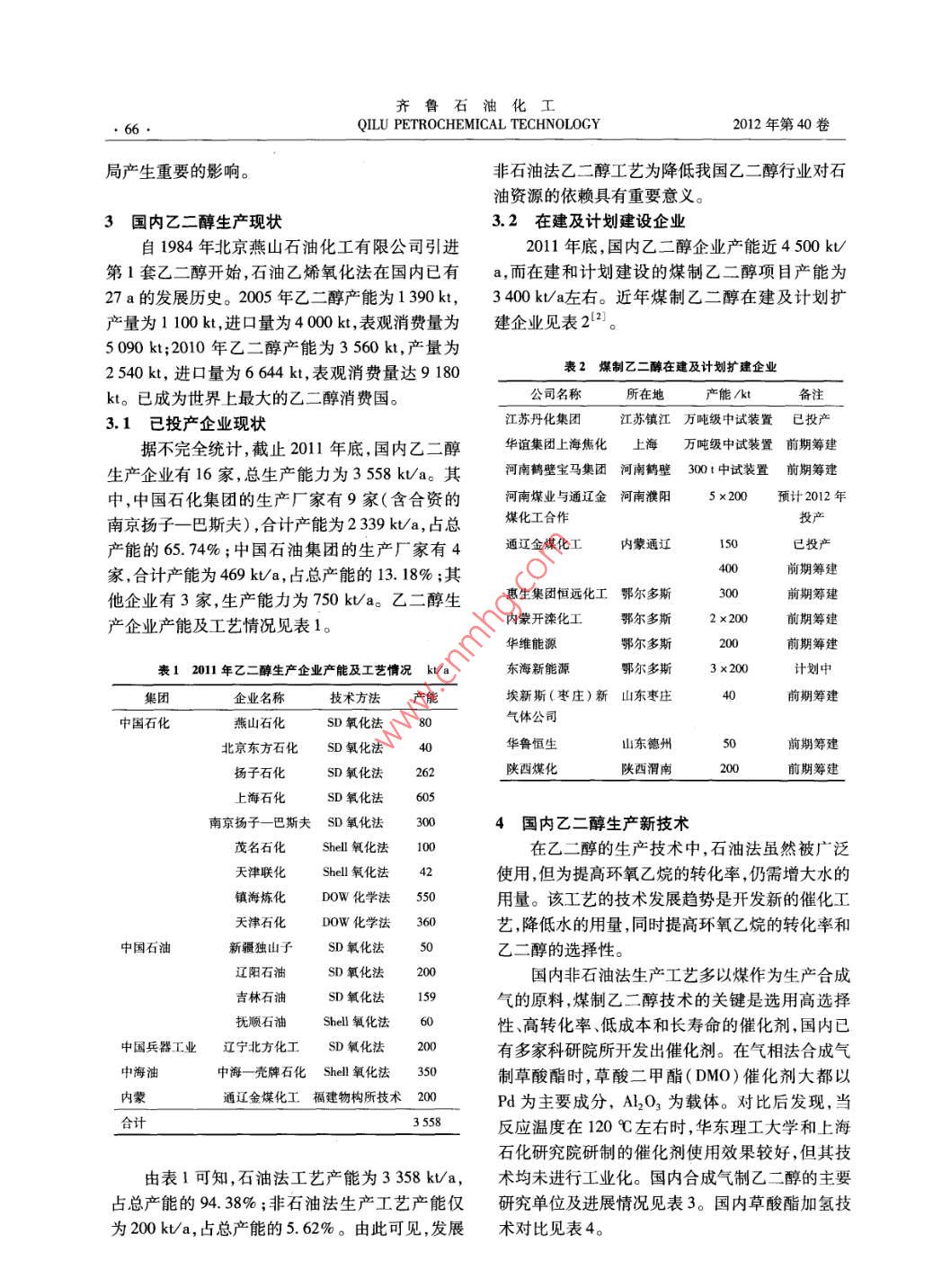 齊魯石油化工,2012,40(1):64-67專論與綜述QILU PETROCHEMICAL TECHNOLOGY國內(nèi)乙二醇生產(chǎn)現(xiàn)狀及發(fā)展趨勢駱雁(新疆天業(yè)集團化工研究院,新疆石河子832000)摘要:介紹近年來國內(nèi)乙二醇的生產(chǎn)現(xiàn)狀和工藝發(fā)展情況,尤其是非石油法生產(chǎn)乙二醇的工藝技術(shù),在比較不同工藝路線的同時,從現(xiàn)有的經(jīng)濟技術(shù)條件出發(fā),提出了大力發(fā)展合成氣制乙二醇的思路。關(guān)鍵詞:乙二醇合成氣草酸酯技術(shù)發(fā)展中圖分類號:TQ23.16文獻(xiàn)標(biāo)識碼:B文章編號:1009-9859(2012)01-0064-041概述年全年的歷史最高價格;2011年乙二醇的最高價乙二醇作為重要的石油化工基礎(chǔ)原料,主要格是在8月下旬至9月,平均價格在11000元/t用于生產(chǎn)聚酯纖維、聚酯塑料、防凍劑、潤滑劑、增左右。塑劑等,在炸藥、涂料和油墨等行業(yè)也有使用,并且其可衍生出100多種化工品,用途廣泛。用于2生產(chǎn)工藝生產(chǎn)聚酯、防凍液、精細(xì)化工用品分別約占總消耗生產(chǎn)乙二醇的方法分為石油法和非石油法。量的94%,2.5%,3.5%石油法以乙烯為原料,經(jīng)環(huán)氧乙烷而最終制得乙截止2010年底,世界乙二醇的生產(chǎn)能力達(dá)到二醇;非石油法以合成氣為原料,合成乙二醇方法25653kt,亞洲地區(qū)生產(chǎn)能力為10770kt,占世界較多??偖a(chǎn)能的41.98%。全球乙二醇的總消費量為21石油法生產(chǎn)工藝2200kt。受中國內(nèi)需加大的推動,2010年我國目前,國內(nèi)外大型乙二醇的生產(chǎn)均為石油法需求量擴大至7000kUa以上,市場潛力極大。其主要原料為乙烯和氧氣,用銀催化劑,甲烷或氮截止2011年底,國內(nèi)乙二醇生產(chǎn)能力為3558k氣做致穩(wěn)劑,乙烯直接氧化成環(huán)氧乙烷,然后再生a,產(chǎn)量為2530ka,表觀消費量為9500k/a,凈成乙二醇。全球環(huán)氧乙烷生產(chǎn)技術(shù)大部分使用的進口量接近7000kta,達(dá)到歷史最高水平,產(chǎn)品是英荷She化學(xué)公司、美國科學(xué)設(shè)計公司(SD)供應(yīng)嚴(yán)重不足。預(yù)計,2015年國內(nèi)對乙二醇的需和美國UCC3家公司的技術(shù)求量將達(dá)到約11000~11500kta,而國內(nèi)的生產(chǎn)該工藝優(yōu)點:技術(shù)成熟,應(yīng)用廣泛。缺點:耗能力約5500k/a水平,其消費缺口仍較大,需要水量較大、不適用于水資源相對匱乏的地區(qū);生產(chǎn)大量進口來填補。因此,發(fā)展合成氣制乙二醇有原料受石油價格波動的影響較大;催化劑技術(shù)對良好的市場前景。國外的依賴程度較強;產(chǎn)品副產(chǎn)多,而產(chǎn)品回收率市場方面,與2010年相比,2011年我國乙二僅為88%。醇價格均處歷年高位。主要原因:①原料乙烯價國內(nèi)乙二醇生產(chǎn)企業(yè)在實際生產(chǎn)中因存在原格處于歷年高位,成本增加;②全球性通脹條件料采購、技術(shù)壁壘及地域差異等問題導(dǎo)致石油法下,大宗產(chǎn)品跟漲明顯;③自2002至2010年以乙二醇生產(chǎn)成本比富產(chǎn)石油的中東地區(qū)要高出來,乙二醇的主要下游行業(yè)聚酯產(chǎn)品產(chǎn)量年均增35%以上,比歐美等技術(shù)發(fā)達(dá)國家高18%左右速近16%,而2011年我國聚酯產(chǎn)量超過26500kt,較2010年增長6%以上,推動了對乙二醇的強收稿日期:2011-06-29;修回日期:2011-11-24。作者簡介:駱雁(1972-),女,工程師?,F(xiàn)在新疆天業(yè)集團化勁需求。雖然2011年乙二醇最低價格在12月出工研究院主要從事新技術(shù)和新產(chǎn)品開發(fā)信息工作。電話:現(xiàn),均價為8300元/t,但是此價格卻相當(dāng)于201013999531200,E-mail:lotus2119@sina.come第1期駱雁.國內(nèi)乙二醇生產(chǎn)現(xiàn)狀及發(fā)展趨勢2.2非石油法生產(chǎn)工藝再與甲醇反應(yīng)生成亞硝酸甲酯,在Pd催化劑作非石油法生產(chǎn)工藝路線可采用煤或天然氣為用下與CO氧化偶聯(lián)得草酸二酯,再經(jīng)催化加氫原料,制得合成氣后,通過直接合成法或間接合成制取乙二醇。草酸酯制乙二醇工藝流程如圖2所法最終制成乙二醇。間接合成法根據(jù)中間產(chǎn)物的示。不同,又分為氧化偶聯(lián)法(草酸酯法)和甲醇甲醛法。2009年國家發(fā)改委發(fā)布的《石油化工行業(yè)產(chǎn)催化劑加氫業(yè)振興規(guī)劃》中將煤制乙二醇作為煤化工的五個羰基合催化劑成催化劑重點示范工程之一?!懂a(chǎn)業(yè)結(jié)構(gòu)調(diào)整指導(dǎo)目錄變壓吸(2011年本)》明確規(guī)定,鼓勵發(fā)展200kt/a及以附分離上合成氣制乙二醇項目;限制發(fā)展200kt/a以下草酸酯的乙二醇項目。國內(nèi)在20世紀(jì)80年代提出用合成氣制乙聚酯醇技術(shù)的開發(fā),隨著石油價格不斷上漲,煤化工發(fā)展步伐明顯加快,在合成氣制乙二醇技術(shù)方面也圖2草酸酯制乙二醇工藝流程示意有新的突破。合成氣制乙二醇不同生產(chǎn)工藝流程如圖1所示從圖2可知:煤經(jīng)造氣后,變壓吸附分離成CO和H2。其中,CO經(jīng)脫氫催化劑、羰基合成催環(huán)氧乙烷化劑反應(yīng)后制成草酸酯;草酸酯和造氣后的H2甲醛經(jīng)加氫催化劑生成粗乙二醇,粗乙二醇精餾后得甲醇聚酯級乙二醇。甲酸甲酯CO合成草酸二酯時,有兩種方法合成氣草酸酯(1)液相法。液相法是美國聯(lián)合石油(Uno-成熟工藝待開發(fā)工藝ca)公司于1966年提出液相合成草酸酯,其缺點是設(shè)備腐蝕問題嚴(yán)重。1978年,日