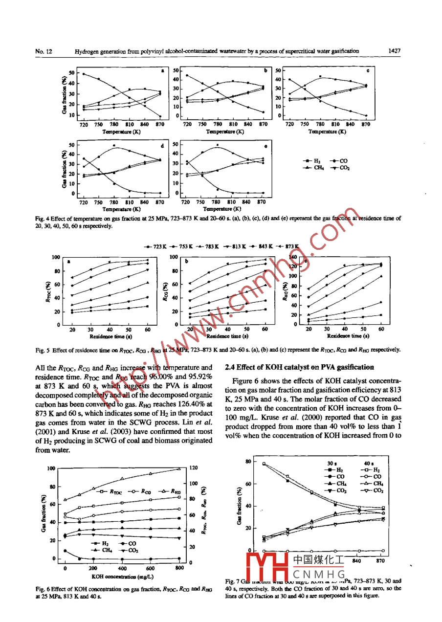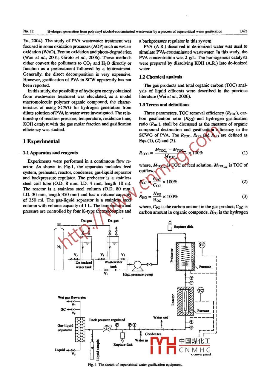 Available online at www.sciencedirect.comJOURNAL OFENVIRONMENTAL8 ScienceDirectSCIENCESISSN 1001-0742土LEJounal of Environmental Scieoces 19(2007) 1424-1429www.jeuc.c.cnHydrogen generation from polyvinyl alcohol-contaminated wastewater by aprocess of supercritical water gasificationYAN Bo, WEI Chao-hai, HU Cheng sheng, XIE Cheng, WU Jun-zhangColege of Environmental Science and Engineering, South China University of Teclnologs Guangdong 510640. China. E-mail: yanbo2007@ 163.comRecered 10 February 2007; revised 28 March 2007; accepted 4 April 2007Abstractreactor at 723- 873 K, 20- 36 MPa and residence time of 20- 60 s. The gas and liquid products were analyzed by GC/TCD, and TOCanalyzer. The main gas products were H2, CH, co and CO2. Pressure change had no significant infuence o gasification eficiency.Higher termperature and longer residence time enhanced gasification eficiency, and lower temperature favored the production of H2.The efcts of KOH catalyst on gas product composition were studied, and gasifcation eficiency were analyzed. The TOC removaleficieacy (Rroc), catbon gasifcation ratio (Rca) and hydrogen gasifcation ratio (RHo) were up to 96.00%, 95.92% and 126.40% at 873K and 60 s, respectively, which suggests PVA can be completely gasifiod in scw. The results indicate supercritical water gasificationfor hydrogen generation is a promising process for the treatment of PVA wastewater.Key words: bydrogen generation; supercritical water; gasification; polyvinyl alcohol wastewaterIntroductionnatural biomass such as lignin (Osada et al, 2004, 2006),cellulose (Minowa and Ogi, 1998; Sasaki et al., 2004),Supercritical water (SCW) is water at a temaperaturecornstarch (Antal et al, 2000), clover gTass (D'Jesis etand pressure higher tan its critical temperature (647.2 K)al, 2005;) in SCW has been investigated extensively. Theand pressure (22.1 MPa). It has characteristics different main reactions in the gasification of organic compoundsfrom either water in normal condition or steam within SCW include steam reforming (Reaction (1)), water-respect to density, dielectric constant, ion product, vis-gas shift reaction (Reaction (2)) and methanation reactioncosity, diffusivity, electric conductance, and solvent ability (Reactions (3) and (4)) (Boukis et al, 2003; Minowa(Savage, 1999). It is also known that SCW is miscible withInoue, 1999; Tang and Kitagawa, 2005).most of the organic compounds, and rapidly homogeneousCH2Om +(1 -m)H2O- +(n/2+1- m)H2+CO (1)organic chemical reactions are possible in SCW (Siskinand Katritzky, 1991; Poliakoff and King, 2001).CO+H2O -→CO2+H2AH298=-41 kJ/mol (2)With tbe rapid development of economy and technology,Co + 3H2→CH4+H2O0H298 = - 211 kJ/mol (3)more and more compounds are produced and emitted intoenvironment as industrial waste. At the same time, theCO2+4H2→CH4+2H2O0H298 = -223 kJ/mol (4)industrialization due to the depletion of fossil fuel and en-Alkali catalyst is one of the effective catalysts for thevironmental pllution during its combustion, which makes gasifcation of organic compounds and can promote theH2 a atractive altemative energy source (Cortright et al,water-gas shift reaction (Reaction (2)) to a greater extent2002). Some researchers (Knuse et al, 2005; Calzavara Elliot et al, 1983, 1986), so the molar fraction ofCO canet al, 2005; Matsumura et al, 2005) have suggested thatdecrease to zero and that H2 increases significantly. At theSCW gasification (SCWG) is a promising technology forsame time, gasifcation eficiency of organic compoundsconverting organic compounds to H2 due to the specialcan be enbanced greatly.characteristics of SCW. In the past few years, H2 genera-Polyvinyl alcohol (PVA, (CH2CH(OHI)n) is widely usedtion from simple molecules like glucose (Yu et al,1993;n the sizing process of the textile industry and paperLee et al, 2002; Hao et al, 2003; Sinag et al, 2004)coati_ood fexibili. highand methanol (Feng et al, 2003; Boukis et al, 2003) or therm中國煤化Isolubility and goodfilm-f, 2003). The globalProject supported by the National Natural Scieace Foundation of ChinaproduMHCNMH G va,. and toe lage(No, 20277010) and the Hi-Tech Research and Development Programamount of discharged PVA from industrial effuents has(863) of China No.2006AA062378). *Corresponding authotE-mail: ccbwei@ scu1.cdw.cn.caused significant environmental polution (Zhang andNo.12Hydrogen generation from polyvinyl alcobol-contaminated wastewater by a process of 8upercritical water gasificatioo1425Yu, 2004). The study of PVA wastewater treatment was a backpressure regulator in this system.focused in some oxidation processes (AOP) such as wet airPVA (A.R.) dissolved in de-ionized water was used tooxidation (WAO), Fenton oxidation and photo degradation simulate PVA-contaminated wastewater. In this study, the(Won et al, 2001; Giroto et al, 2006). These methods PVA concentration was 2 g/L. The homogenous catalystseither convert the pollutants to CO2 and H2O directly or were prepared by dissolving KOH (A.R.) into de-ionizedfunction as a pretreatment followed by a biotreatment.water.Generally, the direct decomposition is very expensive.1.2 Chemical analysisHowever, gasification of PVA in scw apparently bas notbeen reported.The gas products and total organic carbon (TOC) anal-In this study, the possibility of bydrogen energy obtained ysis of liquid efluents were described in the previousrom wastewater treatment was elucidated, as a model literature (Wei et al, 2006).macromolecule polymer organic compound, the charac-13 Terms and definitionsteristics of using SCwG for hydrogen generation fromdilute solution of PVA in water were investigated. The rela-Three parameters, TOC removal eficiency (Rroc), car-tionship of reaction pressure, temperature, residence time, bon gasification ratio (Rca) and hydrogen gasificationKOH catalyst with the gas molar fraction and gasification ratio (RHc), shall be discussed as the measure of organiceficiency was studied.compound destruction and g