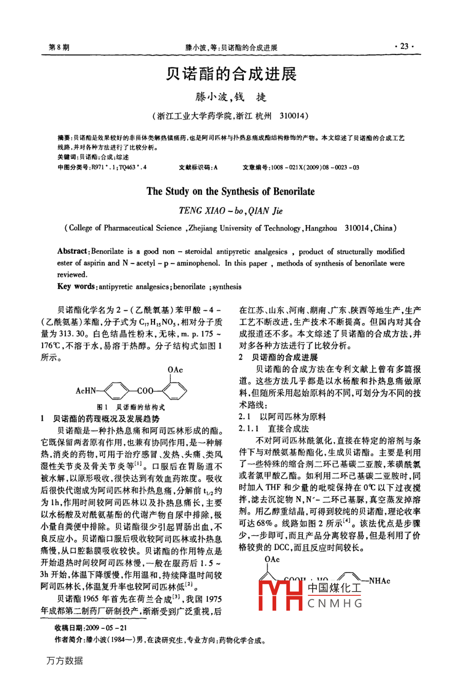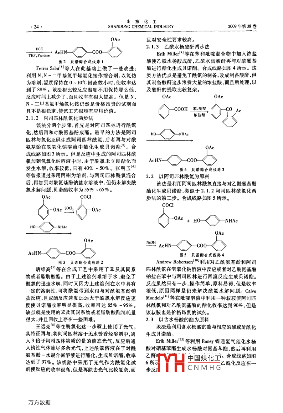 第8期滕小波,等:貝諾酯的合成進展貝諾酯的合成進展滕小波,錢捷(浙江工業(yè)大學藥學院,浙江杭州310014)摘要:貝諾酯是效果較好的非所體類觶熱鎮(zhèn)痛藥,也是阿司匹林與撲熱息摘成酯結(jié)構(gòu)修飾的產(chǎn)物。本文綜述了貝諾酯的合成工藝線路.并對各種方法進行了比較分析。關(guān)鍵詞:貝諾酯;合成;綜述中圖分類號:R971*.1;TQ463*.4.文獻標識碼:A文章編號:1008 -021X(2009)08 -0023 -03The Study on the Synthesis of BenorilateTENG XIAO - bo ,QIAN Jie ;( College of Pharmaceutical Science ,Zhejiang University of Technology ,Hangzhou 310014 ,China)Abstract: Benorilate is a good non - steroidal antipyretic analgesics , product of structurally modifiedester of aspirin and N - acetyl - p - aminophenol. In this paper , methods of synthesis of benorilate werereviewed.Key words :antipyretic analgesics ; benorilate ;synthesis貝諾酯化學名為2-(乙酰氧基)苯甲酸-4-在江蘇、山東、河南、湖南、廣東、陜西等地生產(chǎn),生產(chǎn)(乙酰氨基)苯酯.分子式為C,HNO3,相對分子質(zhì)工藝不斷改進,生產(chǎn)技術(shù)不斷提高。但國內(nèi)對其合量為313.30。白色結(jié)晶性粉末,無味,m. p.175 ~成報道還不多。本文綜述了貝諾酯的合成方法,并176C. ,不溶于水,易溶于熱醇。分子結(jié)構(gòu)式如圖1對多各種方法進行了比較分析。所示。2貝諾酯 的合成進展0Ac貝諾酯的合成方法在專利文獻上曾有多篇報道。這些方法幾乎都是以水楊酸和撲熱息痛做原AcHN-料.但隨所采用起始原料的不同,可劃分為不同的技圖1貝諾酶的結(jié) 構(gòu)式術(shù)路線:1貝諾酯的藥理 概況及發(fā)展趨勢2.1以阿司匹林為原料貝諾酯是一種撲熱息痛和阿司匹林形成的酯。2.1.1直接合 成法它既保留兩者原有作用,也兼有協(xié)同作用,是一種解不對阿司匹林酰氯化,直接在特定的溶劑與條熱,消炎的藥物,可用于治療感冒、發(fā)熱頭痛、類風件下與對酰氨基酚酯化,生成貝諾酯。主要是利用濕性關(guān)節(jié)炎及骨關(guān)節(jié)炎等["??诜笤谖改c道不了一些特殊的縮合劑二環(huán)已基碳二亞胺,苯磺酰氯被水解,以原形吸收,很快達到有效血藥濃度。吸收或者氯甲酸乙酯。如利用二環(huán)已基碳二亞胺時,同后很快代謝成為阿司匹林和撲熱息痛,分解前tn約時加入THF和少量的吡啶保持在0C以下過夜攪為Ih,作用時間較阿司匹林以及撲熱息痛長,主要拌,濾去沉淀物N,N'-二環(huán)已基脲,真空蒸發(fā)掉溶以水楊酸及對酰氨基酚的代謝產(chǎn)物自尿中排除,極劑。用乙醇重結(jié)晶.可得到較純的貝諾酯,理論收率小量自糞便中排除。貝諾酯很少引起胃腸出血,不可達68%。線路如圖2所示"。該法優(yōu)點是步驟良反應(yīng)小。貝諾酯口服后吸收較阿司匹林或撲熱息少,一步即可,而且產(chǎn)品分離較容易,但是利用了價痛慢,從口腔黏膜吸收較快。貝諾酯的作用特點是格較貴的DCC,而且反應(yīng)時間較長。開始退熱時間較阿司匹林慢,一般在服藥后1.5~3h開始,體溫下降緩慢作用溫和,持續(xù)降溫時間較-NHAc .阿司匹林長,體溫復(fù)升率也較阿司匹林低[2)。中國煤化工貝諾酯1965年首先在荷蘭合成[3] ,我國1975年成都第二制藥廠研制投產(chǎn),漸漸受到廣泛重視,后YHCNMHG收稿日期:2009 -05 -21作者簡介:滕小波( 1984- -)男,在讀研究生,專業(yè)方向:藥物化學合成。山東化工●24●SHANDONG CHEMICAL INDUSTRY2009年第38卷0Ac且對安全性要求較高。DCC, AcHN-C00-2.1.3乙酰水楊酸酐兩步法THF ,PyidineErik Milr9)等在苯和吡啶混合物中加入濃鹽圖2貝諾酯合成線路 1酸使乙酰水楊酸成酐,乙酰水楊酸酐再與對酰氨基Ferrer Sala[{)等人在此基礎(chǔ)上做了一-些改進:酚進行酯化生成貝諾酯。合成線路如圖4所示。這利用N,N-二甲基氯甲烯氯化銨作縮合劑,以氯仿類方法優(yōu)點是避免了酰氯的制備,改成制備酸酐,但為溶劑,溫度保持在0~10°C回流數(shù)小時.使收率達其制備酸酐這步浪費大量的濃鹽酸,而且后處理,以到了88%。該法相比較反應(yīng)溫度不用保持那么低,及酸酐的提取比較復(fù)雜。反應(yīng)時間,上減少了,而且收率有很大提高。但是N,OAcN-二甲基氯甲烯氯化銨仍然是價格昂貴的試劑而且不是很穩(wěn)定,使該工藝很難有應(yīng)用價值。-COOH 苯,吡啶-C0 Ac濃鹽酸2.1.2阿 司匹林酰氯化兩步法該法分兩個步驟,首先是對阿司匹林進行酰氯化,然后再和對酰氨基酚成酯。最早的方法是阿司-NHAc .匹林與氯化亞砜生成阿司匹林酰氯,后者再與對酰氨基酚在氫氧化鈉溶液中酯化生成貝諾酯3。合成線路如圖3所示。但是反應(yīng)中生成的阿司匹林酰氯加到氫氧化鈉溶液中時.由于酰氯未立即酯化而AcHN-發(fā)生水解,收率較低,只有40% ~50%。張明玉(6)圖4 貝諾酯合成線路3等曾報道過采用丙酮為溶劑與阿司匹林酰氯混合2.2以阿 司匹林酰氯為原料后,再加到對酰氨基酚鈉鹽水溶液中.但仍未解決酰該法是利用阿司匹林酰氯直接與對乙酰氨基酚氯水解問題.貝諾酯收率為55%~65%。酯化生成貝諾酯,類似于2.1.2阿司匹林酰氯化兩.0A0CI步法的第二步。合成線路如圖5所示。COCI-0Ac SOCh,-OAcNHAcHO-- -NHAcNaOH AcHN- <-C00-圖5貝諾酯合成線路4圖3貝諾酯合成線路2Andrew Robertson' 10]利用對乙酰氨基酚和阿司唐維高川等在合成工藝中采用了苯及其同系匹林酰氯在氫氧化鈉溶液中反應(yīng)或者對乙酰氨基酚物或者脂肪酸酯。由于上述溶劑難溶于水,避免了鈉鹽在苯中與阿司匹林進行回流反