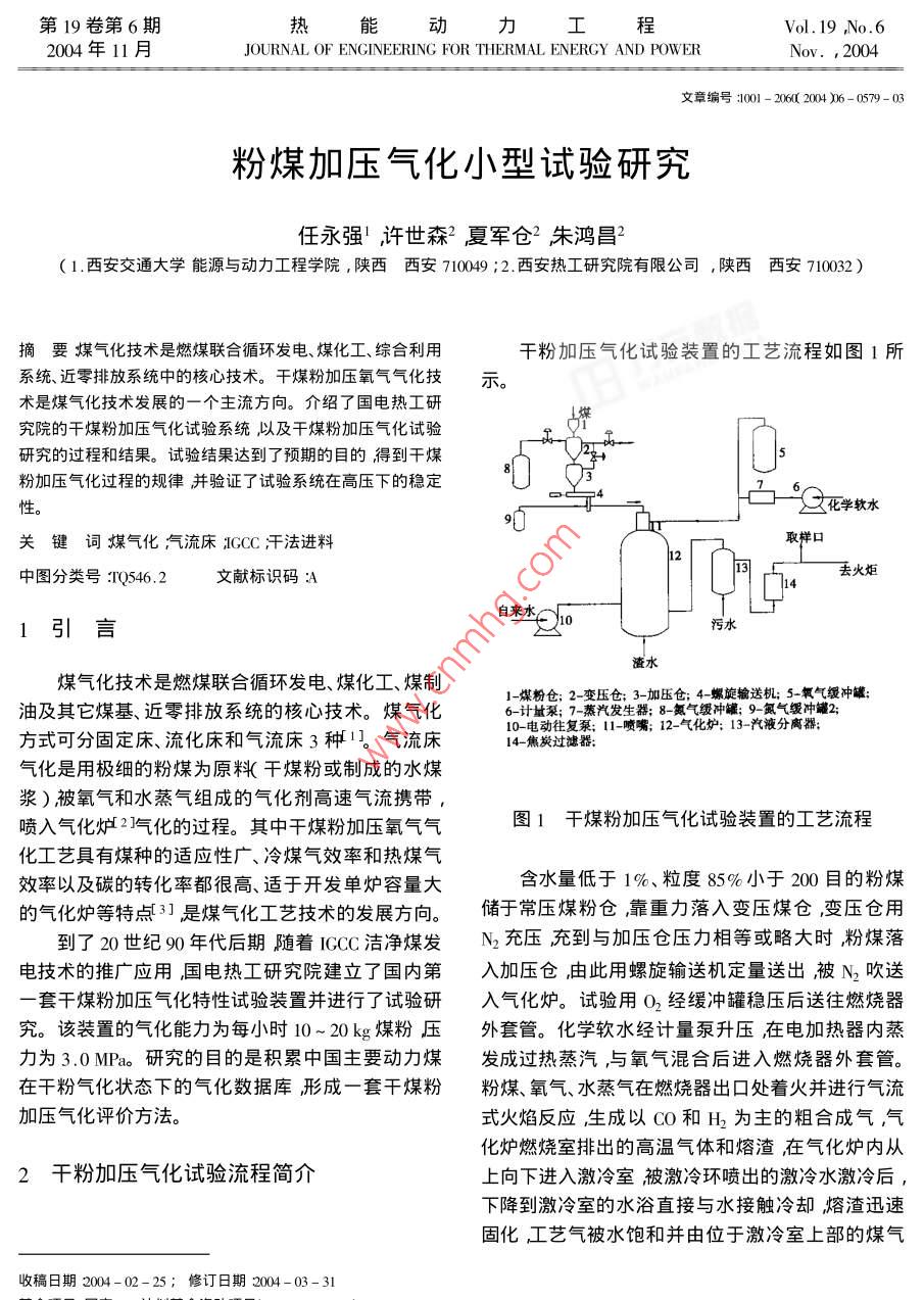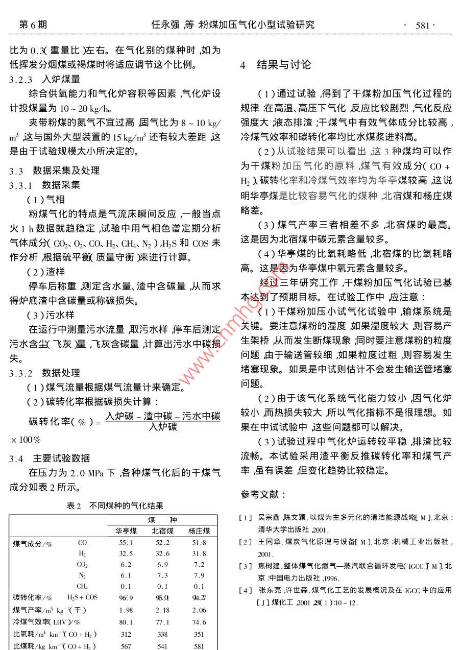 第19卷第6期熱能動(dòng)力工程 Vol.19,No.62004年11月 JOURNAL OF ENGINEERING FOR THERMAL ENERGY AND POWERNov.,2004文章編號(hào):1001-206020046-0579-03粉煤加壓氣化小型試驗(yàn)研究任永強(qiáng)許世森2夏軍倉2朱鴻昌2(1.西安交通大學(xué)能源與動(dòng)力工程學(xué)院,陜西西安7100492.西安熱工研究院有限公司,陜西西安710032摘要煤氣化技術(shù)是燃煤聯(lián)合循環(huán)發(fā)電、煤化工、綜合利用干粉加壓氣化試驗(yàn)裝置的工藝流程如圖1所系統(tǒng)近零排放系統(tǒng)中的核心技術(shù)。干煤粉加壓氧氣氣化技示。術(shù)是煤氣化技術(shù)發(fā)展的一個(gè)主流方向。介紹了國電熱工研究院的干煤粉加壓氣化試驗(yàn)系統(tǒng)以及干煤粉加壓氣化試驗(yàn)研究的過程和結(jié)果。試驗(yàn)結(jié)果達(dá)到了預(yù)期的目的得到干煤粉加壓氣化過程的規(guī)律并驗(yàn)證了試驗(yàn)系統(tǒng)在高壓下的穩(wěn)定性?;瘜W(xué)軟水關(guān)鍵詞煤氣化汽流床IGCC法進(jìn)料取樣口中圖分類號(hào)TQ546.2文獻(xiàn)標(biāo)識(shí)碼A丟火炬1引言自來水10污水渣水煤氣化技術(shù)是燃煤聯(lián)合循環(huán)發(fā)電、煤化工、煤制油及其它煤基、近零排放系統(tǒng)的核心技術(shù)。煤氣化6-計(jì)量泵;7-蒸汽發(fā)生器8-氮?dú)鉀_罐9氣緩沖中罐1-煤粉倉2-變壓;3-加壓:4螺旋輸送機(jī)5氣10-電動(dòng)往復(fù)泵11-噴嘴;12-氣化爐13-汽液分離器方式可分固定床、流化床和氣流床3種1。氣流床14-焦炭過濾器氣化是用極細(xì)的粉煤為原料干煤粉或制成的水煤漿)被氧氣和水蒸氣組成的氣化劑高速氣流攜帶,噴入氣化爐2]氣化的過程。其中干煤粉加壓氧氣氣圖1干煤粉加壓氣化試驗(yàn)裝置的工藝流程化工藝具有煤種的適應(yīng)性廣、冷煤氣效率和熱煤氣效率以及碳的轉(zhuǎn)化率都很高、適于開發(fā)單爐容量大含水量低于1%、粒度85%小于200目的粉煤的氣化爐等特點(diǎn)3】是煤氣化工藝技術(shù)的發(fā)展方向。儲(chǔ)于常壓煤粉倉靠重力落入變壓煤倉變壓倉用到了20世紀(jì)90年代后期隨著CC潔凈煤發(fā)N2充壓充到與加壓倉壓力相等或略大時(shí)粉煤落電技術(shù)的推廣應(yīng)用國電熱工研究院建立了國內(nèi)第入加壓倉由此用螺旋輸送機(jī)定量送出被N2吹送一套干煤粉加壓氣化特性試驗(yàn)裝置并進(jìn)行了試驗(yàn)研入氣化爐。試驗(yàn)用O2經(jīng)緩沖罐穩(wěn)壓后送往燃燒器究。該裝置的氣化能力為每小時(shí)10~20kg煤粉壓外套管?;瘜W(xué)軟水經(jīng)計(jì)量泵升壓在電加熱器內(nèi)蒸力為3.0Ma研究的目的是積累中國主要?jiǎng)恿γ喊l(fā)成過熱蒸汽,與氧氣混合后進(jìn)入燃燒器外套管。在干粉氣化狀態(tài)下的氣化數(shù)據(jù)庫形成一套干煤粉粉煤、氧氣、水蒸氣在燃燒器出口處著火并進(jìn)行氣流加壓氣化評價(jià)方法。式火焰反應(yīng),生成以CO和H2為主的粗合成氣,氣化爐燃燒室排出的高溫氣體和熔渣在氣化爐內(nèi)從2干粉加壓氣化試驗(yàn)流程簡介上向下進(jìn)入激冷室被激冷環(huán)噴出的激冷水激冷后,下降到激冷室的水浴直接與水接觸冷卻熔渣迅速固化工藝氣被水飽和并由位于激冷室上部的煤氣收稿日期2004-02-25;修訂日期2004-03-31580熱能動(dòng)力工程2004年口引出送往煤氣凈化系統(tǒng)因?yàn)槊簹庵泻酗w灰,經(jīng)氣液分離器用水進(jìn)一步潤濕洗滌除塵、分離除3氣化試驗(yàn)研究去殘余的飛灰后將濕煤氣分離出來再經(jīng)焦炭過濾3.1氣化試驗(yàn)原始參數(shù)器干燥、過濾根據(jù)需要送到取樣口或排入大氣在3.1.1氣化壓力的選定激冷室生成的灰渣留在水池中絕大部分迅速沉淀氣化壓力選定為0.5~2.0MPa從中選擇幾個(gè)并定期排出爐外混在黑水中的細(xì)灰在氣液分離器最有代表性的點(diǎn)。壓力測點(diǎn)設(shè)在氣液分離器頂部,經(jīng)沉降下部通過液位控制器自動(dòng)排出界外。自來該處離反應(yīng)區(qū)最近最具有代表性氣化反應(yīng)區(qū)不能水用高壓水泵升壓后送入氣化爐急冷室。在干煤粉加壓氣化試驗(yàn)裝置中,氣化爐是關(guān)鍵直接測壓3.1.2試驗(yàn)煤種設(shè)備其結(jié)構(gòu)如圖2所示。本研究選用3種煤甘肅華亭煤、山東兗礦北宿煤和楊莊煤。其中山東兗礦北宿煤和楊莊煤分別是中國IGCC示范電站的設(shè)計(jì)煤種和校核煤種。這3種煤的煤質(zhì)分析如表1所示。表13種煤煤質(zhì)分析煤種華亭煤北宿煤楊莊煤收到基全水分Mar/%7.306.9工干燥基水分Mad/%5.743.742.54業(yè)干燥基灰分Aad/%10.6910.7713.99析干燥無灰基揮發(fā)分af/%39.6844.3845.25低位發(fā)熱量Qnet/kkg241802668025840收到基碳Car/%63.6867.0064.08急冷水人口煤氣和污水出口元收到基氫Har/%4.284.394.15素收到基氧Oar/%14.396.455.74析收到基氮Nar/%0.701.121.10收到基硫Sar/%0.523.384.36灰變形溫度DT/℃119010801080熔軟化溫度ST/℃127011201110點(diǎn)流動(dòng)溫度FT/℃131011501170圖2氣化爐結(jié)構(gòu)示意圖3.2氣化工藝條件選擇3.2.1爐溫氣化爐是內(nèi)襯耐火材料的壓力容器,又是氣化為保證氣化爐順利排渣和求取較好的氣化指裝置的核心設(shè)備。它有一個(gè)整體的鋼制承壓外殼,標(biāo)氣化爐應(yīng)在高于灰熔點(diǎn)的溫度下操作。根據(jù)國上部為燃燒室爐內(nèi)襯四層耐火材料。這些耐火材內(nèi)外氣流床氣化操作經(jīng)驗(yàn)爐內(nèi)溫度應(yīng)比灰