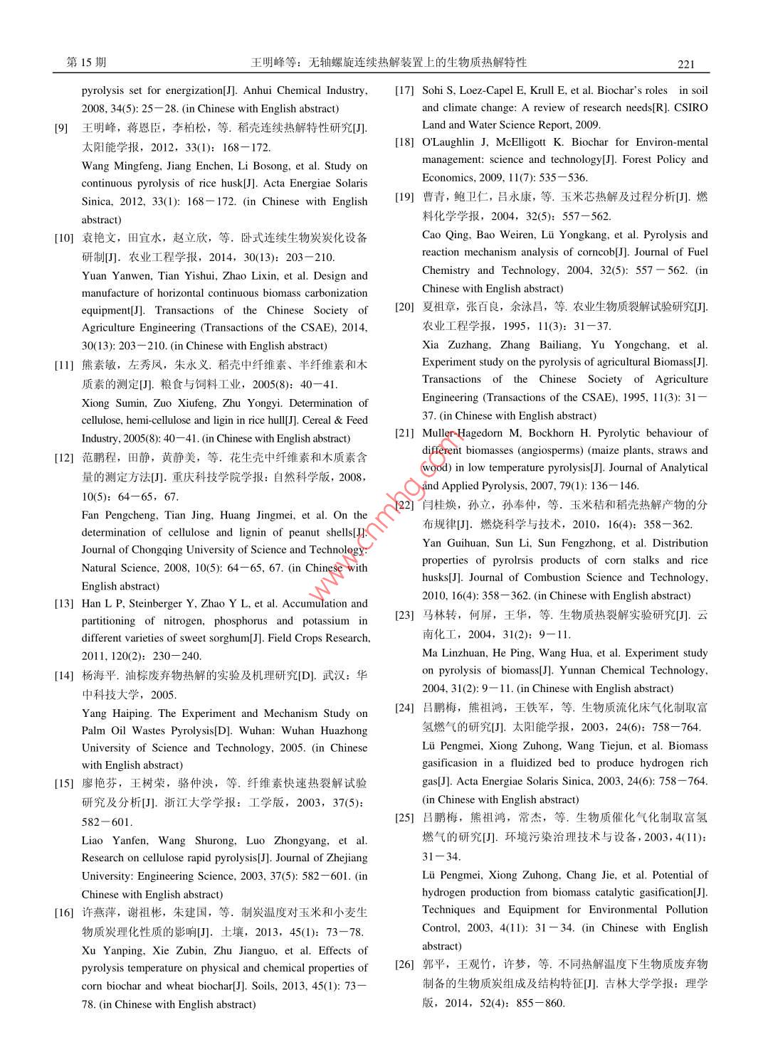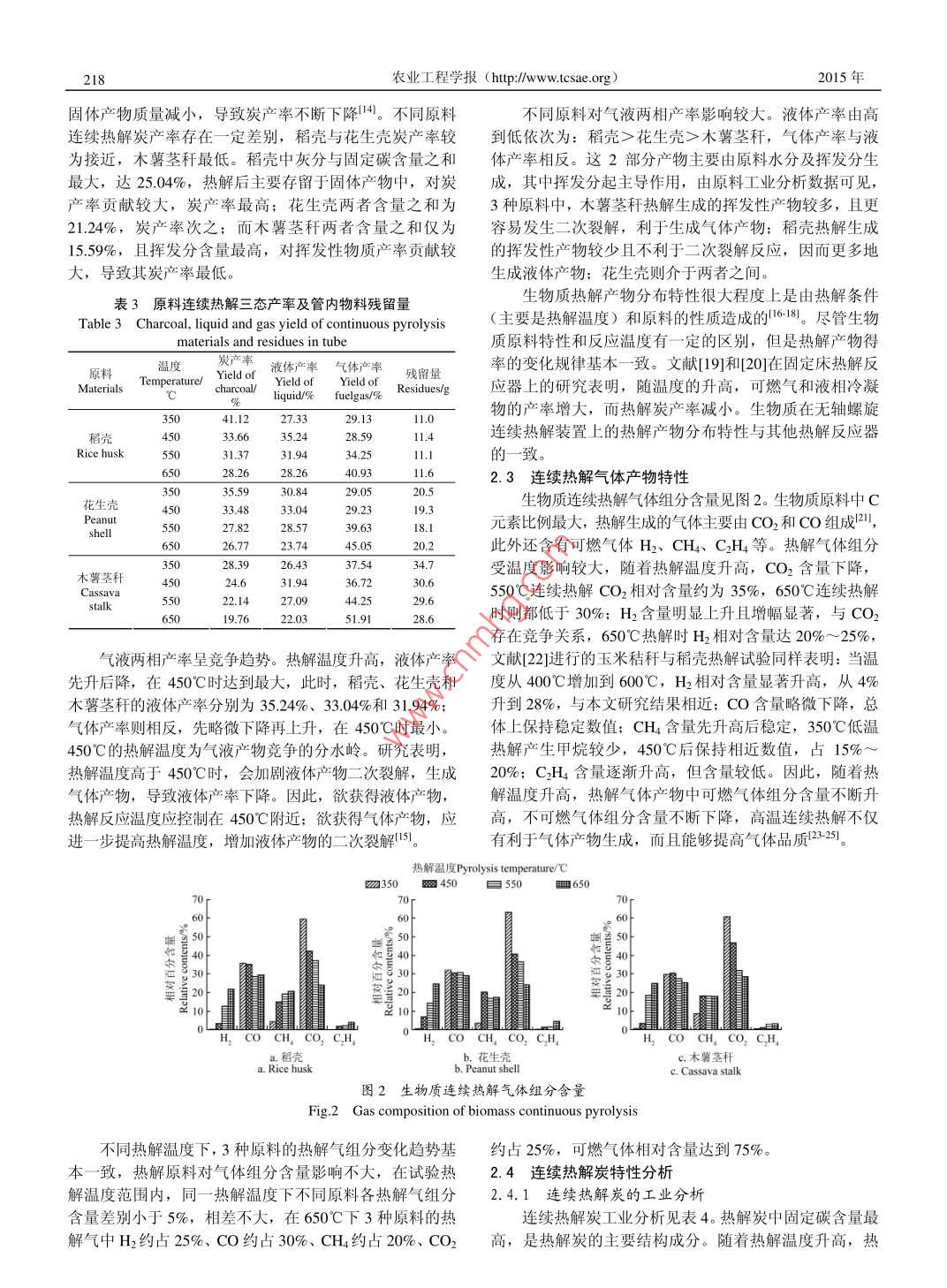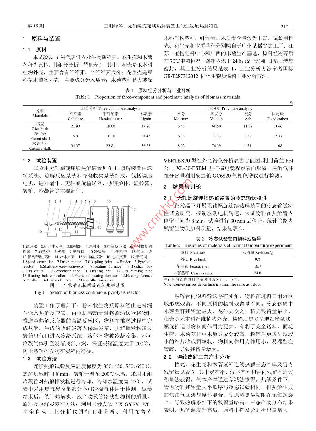 第31卷第15期農(nóng)業(yè)工程學(xué)報(bào)Vol.3l No.152162015年8月Transactions of the Chinese Society of Agricultural EngineeringAug. 2015無軸螺旋連續(xù)熱解裝置上的生物質(zhì)熱解特性王明峰,吳宇健,蔣恩臣*,陳曉塹(華南農(nóng)業(yè)大學(xué)材料與能源學(xué)院,廣州510642)摘要:連續(xù)熱解是--種高效的生物質(zhì)能轉(zhuǎn)化技術(shù),無軸螺旋式連續(xù)熱解裝置不僅可減輕送料部件的質(zhì)量,而且為熱解揮發(fā)性產(chǎn)物的排出提供了有效空間,是極具發(fā)展前景的連續(xù)熱解裝置。為了解無軸螺旋式生物質(zhì)連續(xù)熱解特性,該文在無軸螺旋連續(xù)熱解裝置上,開展了以稻殼、花生殼和木薯莖稈為生物質(zhì)原料的熱解試驗(yàn),分析了3種生物質(zhì)在不同熱解溫度下的三態(tài)產(chǎn)物分布特性、熱解氣體組分變化規(guī)律及熱解炭的組織結(jié)構(gòu)和表面形貌特征。結(jié)果表明:炭產(chǎn)率隨熱解溫度升高逐漸下降,氣體產(chǎn)率逐漸上升,液體產(chǎn)率先上升再下降,在450C時(shí)達(dá)到最大,產(chǎn)物分布特性與其他熱解反應(yīng)器的一-致:不同原料炭產(chǎn)率由高到低依次為:稻殼>花生殼>木薯莖稈,液體產(chǎn)率由高到低依次為:稻殼>花生殼>木薯莖稈,氣體產(chǎn)率與液體產(chǎn)率相反。熱解氣體組分受溫度影響較大,熱解溫度升高,可燃?xì)怏w組分含量不斷上升,不可燃?xì)怏w組分含量不斷下降,不同原料對(duì)氣體組分含量影響較小。熱解炭的工業(yè)分析結(jié)果與原料的工業(yè)分析結(jié)果存在相關(guān)性,熱解溫度升高,熱解炭中揮發(fā)分含量逐漸下降,固定碳及灰分含量增加,木薯莖稈炭的揮發(fā)分含量最高,花生殼炭的固定碳含量最高,稻殼炭的灰分含量最高;低溫?zé)峤馓康谋砻婀倌軋F(tuán)較為豐富,隨熱解溫度升高官能團(tuán)種類逐漸減少:原料自身結(jié)構(gòu)特性對(duì)熱解炭的表面形貌影響較大,隨著熱解溫度升高,生物質(zhì)原料的表面結(jié)構(gòu)不斷被破壞,熱解炭表面出現(xiàn)孔隙結(jié)構(gòu),花生殼炭與木薯莖稈炭表面孔隙結(jié)構(gòu)比稻殼炭更為發(fā)達(dá)。關(guān)鍵詞:生物質(zhì);熱解;秸稈;無軸螺旋連續(xù)熱解裝置;產(chǎn)物分布;熱解氣組分;熱解炭特性doi: 10.11975/j.issn.1002- 6819.2015.15.030中圖分類號(hào): TK 62文獻(xiàn)標(biāo)志碼: A文章編號(hào): 1002- 6819(2015)-15 -0216- 07王明峰,吳宇健,蔣恩臣,陳曉塹.無軸螺旋連續(xù)熱解裝置上的生物質(zhì)熱解特性[J].農(nóng)業(yè)工程學(xué)報(bào), 2015, 31(15):216- 222. doi: 10.1175/.issn.1002- 6819.2015.15.030htp://www.tcsae.orgWang Mingfeng, Wu Yujian, Jiang Enchen, Chen Xiaokun. Biomass continuous pyrolysis characteristics on shaftless screwconveying reactor[J]. Transactions of the Chinese Society of Agricultural Engineering (Transactions of the CSAE), 2015, 31(15):216 - 222. (in Chinese with English abstract)doi: 10.11975/jissn. 1002-68 19.2015.15.030http://www.tcsae. .org文獻(xiàn)[8]、[9]、 [10]在螺旋送料式連續(xù)熱解裝置上0引言對(duì)玉米秸稈、小麥秸稈和稻殼進(jìn)行了熱解特性研究,中國當(dāng)前面臨著能源枯竭與環(huán)境污染的雙重危機(jī),開表明,已有連續(xù)熱解設(shè)備能夠?qū)⑸镔|(zhì)原料轉(zhuǎn)化生成發(fā)新的潔凈可再生能源受到廣泛的關(guān)注,其中生物質(zhì)能作炭、生物油和熱解氣,在一定范圍內(nèi)隨著熱解溫度的為- -種含能體能源,是清潔豐富的可再生能源",而中國升高,炭產(chǎn)率下降,氣體產(chǎn)率上升,液體產(chǎn)率先升高農(nóng)業(yè)生產(chǎn)剩余物尚缺乏有效的回收利用途徑,開展農(nóng)業(yè)生后降低。連續(xù)熱解的生物炭產(chǎn)率在34% ~42%之間;物質(zhì)的開發(fā)利用研究具有深刻的意義和廣闊的前景。生物油產(chǎn)率在35%左右,包括焦油和木醋液兩部分,熱解:是生物質(zhì)能的一-種 重要利用形式,是指生物質(zhì)主要組分為酸、醇、酮、酚等有機(jī)物;熱解氣產(chǎn)率在.原料在隔絕或者低氧的環(huán)境下受熱裂解的過程,主要生17%~23%之間,成分主要包括: H2、 CO2、CO、CH4成固體炭、可冷凝液體油和可燃?xì)怏w產(chǎn)物123。生物質(zhì)連及其他ChHm等。續(xù)熱解是-一種高效的熱解處理方式,受到國內(nèi)外研究學(xué)與現(xiàn)有的螺旋式連續(xù)熱解裝置相比,無軸螺旋式連者的重視,英國利茲大學(xué)及國內(nèi)的華南農(nóng)業(yè)大學(xué)、山東續(xù)熱解裝置不僅可減輕送料部件的質(zhì)量,而且為熱解揮省能源研究所、中科院蘭州化學(xué)物理研究所和浙江大學(xué)發(fā)性產(chǎn)物的排出提供了有效空間,是極具發(fā)展前景的連等科研單位開展了以螺旋輸送器為核心部件的生物質(zhì)連續(xù)熱解裝置。目前,針對(duì)無軸螺旋式生物質(zhì)連續(xù)熱解特續(xù)熱解裝置的研究工作[47。性的研究較少。本文在自行研制的以無軸螺旋送料器為核心部件的連續(xù)熱解反應(yīng)器上,開展了具有代表性的3種生物質(zhì)稻殼、花生殼和木薯莖稈的熱解試驗(yàn),分析生收稿日期: 2015-05-04 修訂 日期: 2015-07-14基金項(xiàng)目:科技部農(nóng)業(yè)科技成果轉(zhuǎn)化資金項(xiàng)目(2014G2000048); 土壤植物質(zhì)原料的組分差異和熱解溫度對(duì)三態(tài)產(chǎn)物分布、熱解物機(jī)器系統(tǒng)技術(shù)國家重點(diǎn)實(shí)驗(yàn)室開放課題(2014-SKL-