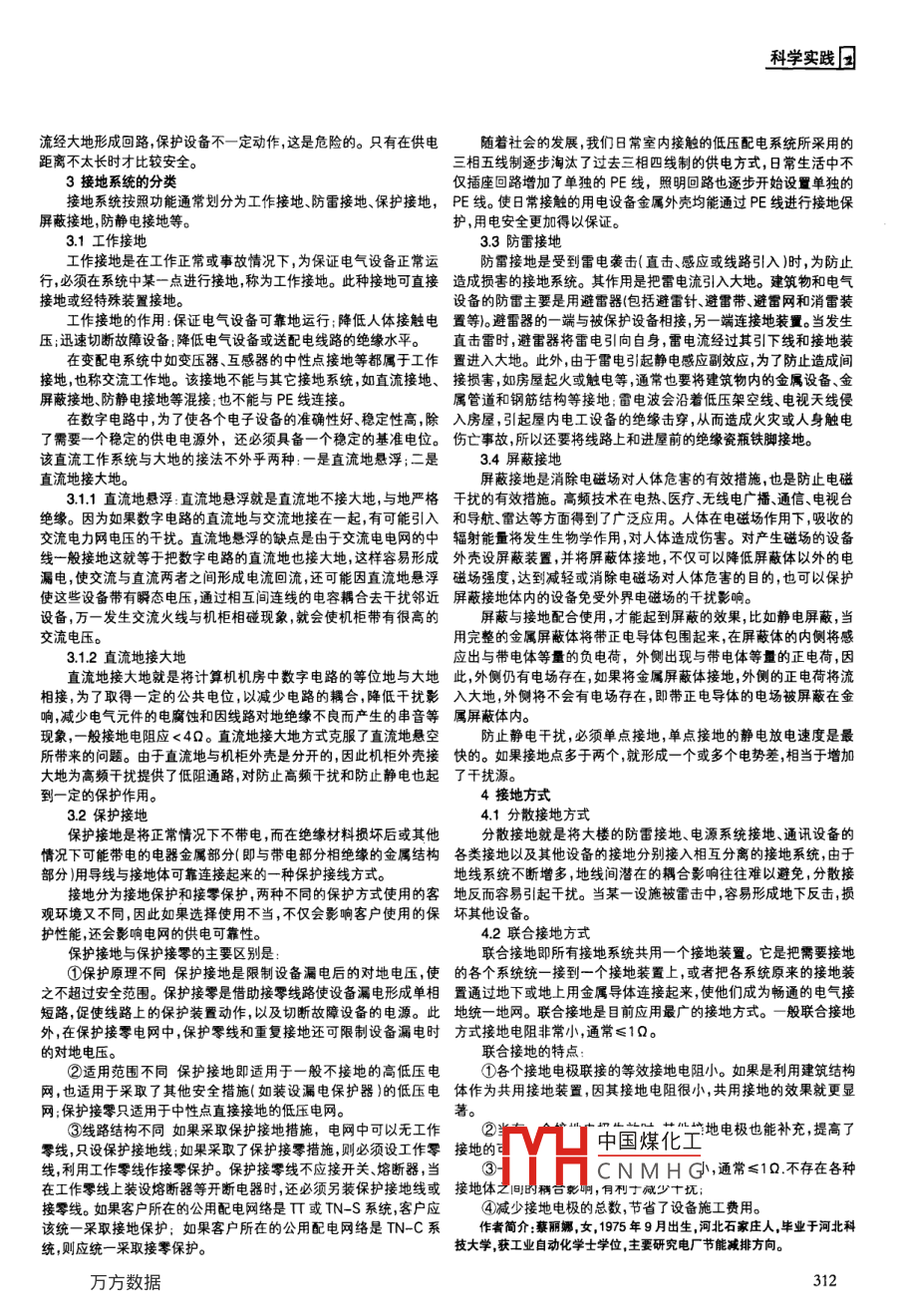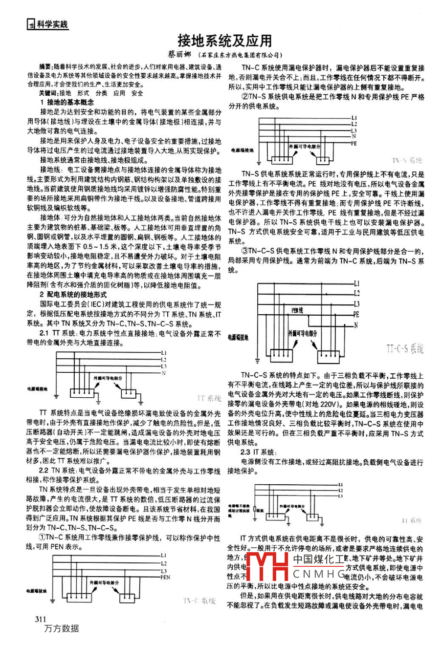 恩科學實踐接地系統(tǒng)及應用蔡麗娜(石家莊東方熱電集團有限公司摘要:隨卷科學技術(shù)的發(fā)展、社會的進步,人們對家用電器、建筑設備、通TN-C系統(tǒng)使用漏電保護器時,漏電保護器后不能設置重復接信設備及電力系統(tǒng)等其他領(lǐng)域設備的安全性要求越來越高。掌操接地技術(shù)并地否則漏電開關(guān)合不上;而且,工作零線在任何情況下都不得斷開。合理應用才會使我們的生產(chǎn)、生活更加安全。所以,實用中工作零線只能讓漏電保護器的上側(cè)有重復接地關(guān)鍵詞:接地形式分類應用安全接地的基本概念②TNS系統(tǒng)供電系統(tǒng)是把工作零線N和專用保護線PE嚴格分開的供電系統(tǒng)接地是為達到安全和功能的目的,將電氣裝置的某些金屬部分用導體(接地線)與埋設在土壤中的金屬導體(接地極)相連接,并與大地做可靠的電氣連接接地是用來保護人身及電力、電子設備安全的重要措施,過接地導體將過電壓產(chǎn)生的過電流通過接地裝置導入大地從而實現(xiàn)保護。電源墻樓可導電部接地系統(tǒng)通常由接地線、接地極組成。接地線:電工設備需接地點與接地體連接的金屬導體稱為接地TNS供電系統(tǒng)系統(tǒng)正常運行時,專用保護線上不有電流,只是線。主要形式為利用建筑結(jié)構(gòu)內(nèi)鋼筋、鍋結(jié)構(gòu)構(gòu)架以及單獨敷設的接工作零線上有不平衡電流。PE線對地沒有電壓所以電氣設備金屬地線。當前建筑使用鋼質(zhì)接地線均采用鍍鋅以增強防腐性能。特別重外殼接零保護是接在專用的保護線PE上,安全可靠。干線上使用漏要的場所接地采用扁銅帶作為接地干線。以及設備接地管道跨接用電保護器,工作零線不得有重復接地而專用保護線PE不許斷線軟銅線及編織軟線等。接地體可分為自然接地體和人工接地體兩類。當前自然接地體電保護器。所以TNS系統(tǒng)供電干線上也可以安裝漏電保護器。鋼、圓鋼或鋼管以及水平埋置的圓鋼、扁鋼、鋼板等。人工接地體的系統(tǒng)。頂端埋入地表面下0.5-15米,這個深度以下,土壤電導率受季節(jié)③TNC-S供電系統(tǒng)工作零線N和專用保護線部分是合一的,影響變動較小接地電阻穩(wěn)定且不易遭受外力破壞。對于士壤電阻局部采用專用保護線。通常為前端為TN-C系統(tǒng)后端為TNS系率高的地區(qū),為了節(jié)約金屬材料,可以采取改善土壤電導率的措施,在接地體周圍土壤中填充電導率高的物質(zhì)或在接地體周圍填充一層降阻劑含有水和強介質(zhì)的固化樹脂)等,以降低接地電阻值。2配電系統(tǒng)的接地形式國際電工委員會(EC)對建筑工程使用的供電系統(tǒng)作了統(tǒng)一規(guī)定,根據(jù)低壓配電系統(tǒng)按接地方式的不同分為TT系統(tǒng)、TN系統(tǒng)、T系統(tǒng)。其中TN系統(tǒng)又分為TN-C、TN-S、TN-CS系統(tǒng)。21T系統(tǒng)電力系統(tǒng)中性點直接接地:電氣設備外露正常不電酒接地蛋可導電分帶電的金屬外殼與大地直接連接。1CS統(tǒng)司導電部分TN-C-S系統(tǒng)的特點如下。由于三相負載不平衡,工作零線上電源略接地有不平衡電流在線路上產(chǎn)生一定的電位差所以與保護線所聯(lián)接的TT系電氣設備金屬外殼對大地有一定的電壓如果工作零線斷線,則保護接零的漏電設備外殼帶電(對地220V)。如果電源的相線碰地,則設T系統(tǒng)特點是當電氣設備絕緣損壞漏電致使設備的金屬外殼備的外殼電位升高,使中性線上的危險電位蔓延。當三相電力變壓器帶電時,由于外殼有直接接地作保護減少了觸電的危險性。但是,低工作接地情況良好、三相負載比較平衡時,TN-C-S系統(tǒng)在使用中壓斷路器(自動開關(guān))不一定能跳閘,造成漏電設備的外殼對地電壓效果還是可行的。但在三相負載嚴重不平衡時,應采用TN-S方式高于安全電壓,仍屬于危險電壓。當漏電電流比較小時即使有熔斷供電系統(tǒng)。器也不一定能熔斷所以還需要漏電保護器作保護接地裝置耗用鋼23T系統(tǒng)w22TN系統(tǒng):電氣設備外露正常不帶電的金屬外殼與工作零線接地保護。多困此T系統(tǒng)難以推廣。電源側(cè)沒有工作接地或經(jīng)過高阻抗接地。負載側(cè)電氣設備進行相接,稱作接零保護系統(tǒng)TN系統(tǒng)特點是一旦設備出現(xiàn)外殼帶電,相當于發(fā)生單相對地短路故瘴,產(chǎn)生的電流很大,是T系統(tǒng)的數(shù)倍,低壓斷路器的過流保護脫扣器會立即動作使故障設備斷電。且該系統(tǒng)節(jié)省材料在我國“陽得到廣泛應用TN系統(tǒng)根據(jù)其保護PE線是否與工作零N線分開而劃分為TN-C、TN-S、TN-C-S。①TNC系統(tǒng)用工作零線兼作接零保護線,可以稱作保護中性T方式供電系統(tǒng)在供電距離不是很長時,供電的可靠性高、安線,可用PEN表示。全性好。一般用于不允許停電的場所或者是要求嚴格地連續(xù)供電的中國煤化工、地下礦井等處地下礦井內(nèi)供電方式供電系統(tǒng),即使電源中性點CNMHG電流仍小,不會破壞電源電壓的平衡,所以比電源中性點接地的系統(tǒng)還安全。-(糸統(tǒng)但是,如果用在供電距離很長時供電線路對大地的分布電容就不能忽視了在負載發(fā)生短路故障或漏電使設備外殼帶電時,漏電電科學實踐流經(jīng)大地形成回路保護設備不一定動作,這是危險的。只有在供電隨著社會的發(fā)展,我們?n