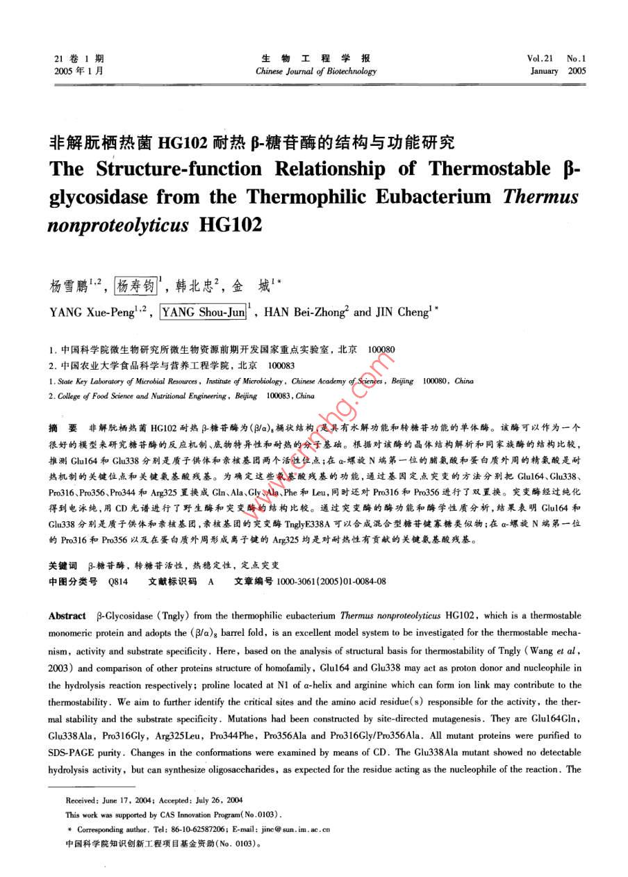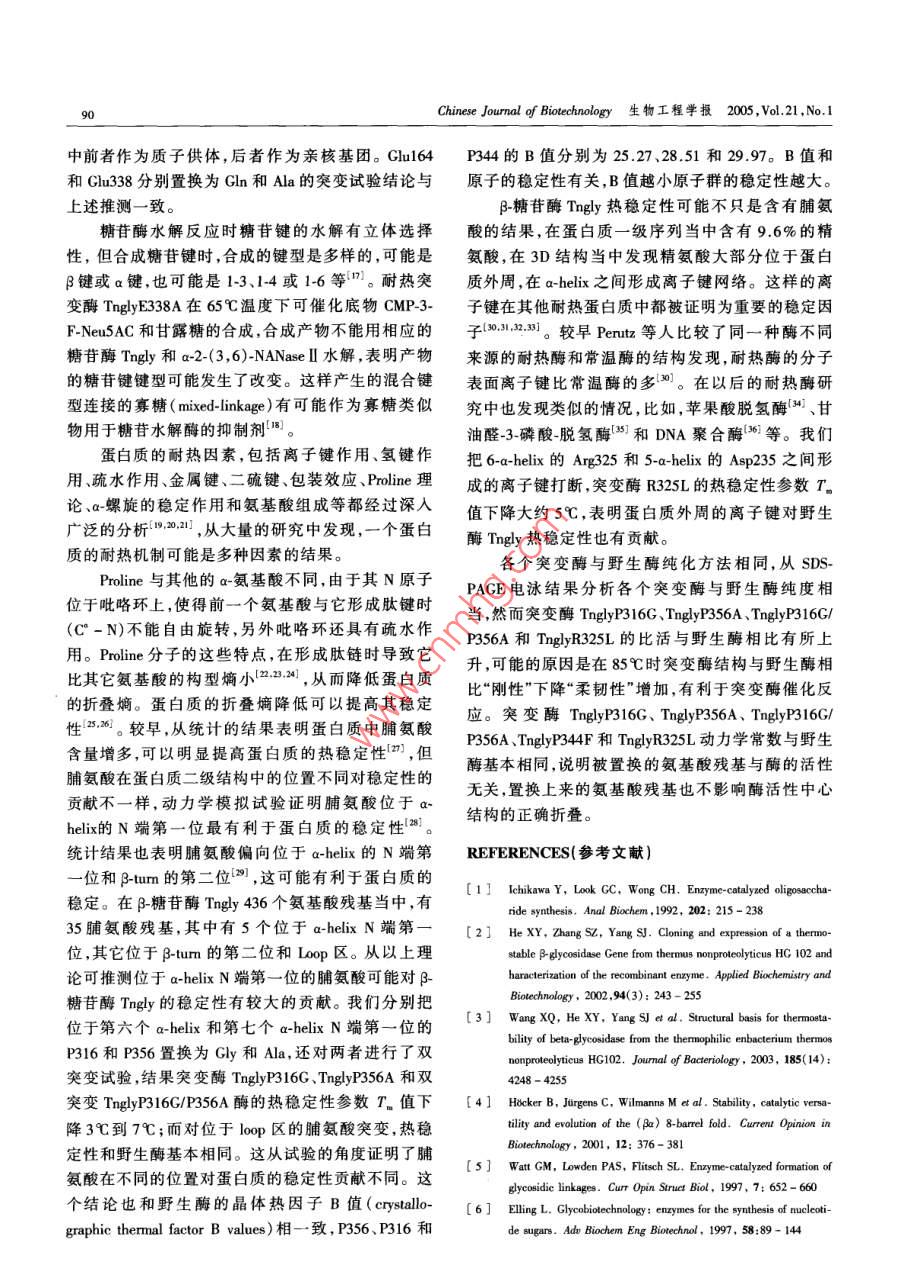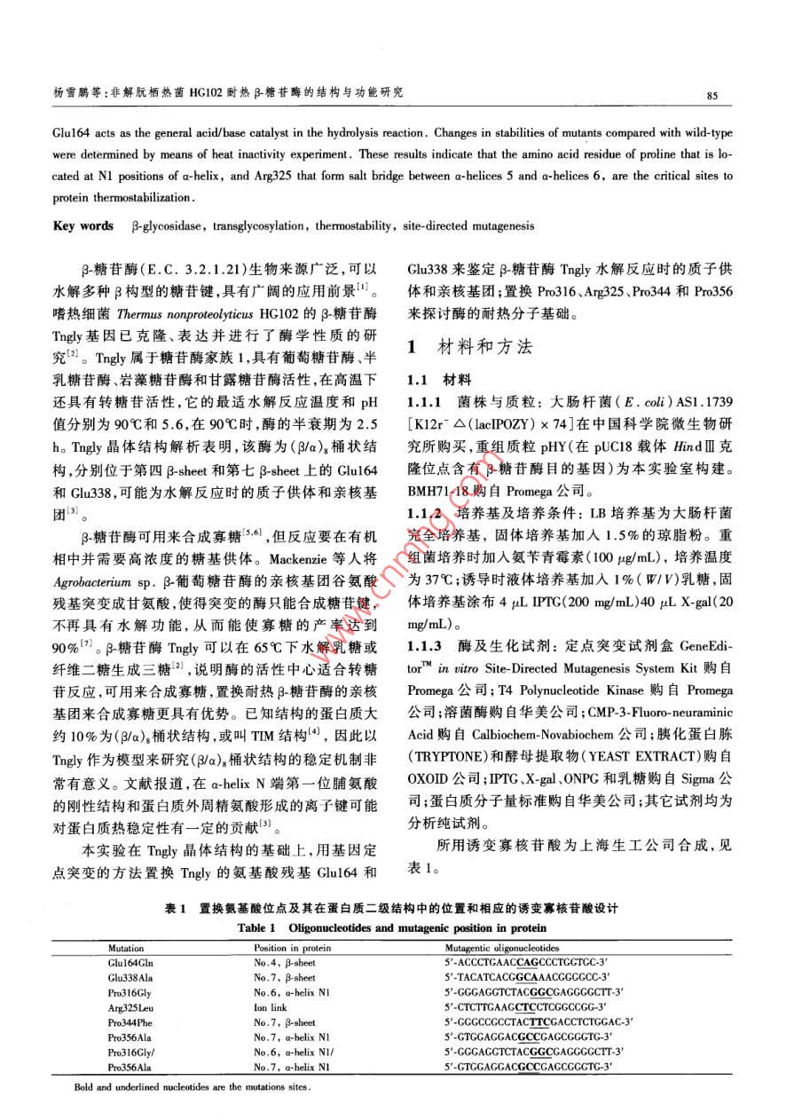 21卷1期生物工程學(xué)報Vol.21 No.12005年1月.Chinese Journal of BiotechnologyJanuary 2005非解朊棲熱菌HG102耐熱β_糖苷酶的結(jié)構(gòu)與功能研究,The Structure-function Relationship of Thermostable β-glycosidase from the Thermophilic Eubacterium Thermusnonproteolyticus HG102楊雪鵬'2,楊壽鈞",韓北忠”,金城'"YANG Xue-Peng'.2,YANG Shou-Jun' , HAN Bei-Zhong?2 and JIN Cheng'" .1.中國科學(xué)院微生物研究所微生物資源前期開發(fā)國家重點實驗室,北京1000802.中國農(nóng)業(yè)大學(xué)食品科學(xué)與營養(yǎng)工程學(xué)院,北京,10001. Slate Key Laboratory of Microbial Reouces,Intite of Micobiology, Chine Academy of Sciences, Beijing 1000 China2. College of Food Science and Nuritionad Enginering. Bejing 100083 , China摘要非解朊棲熱菌HG102耐熱B-糖苷酶為(β/a)。桶狀結(jié)構(gòu),是具有水解功能和轉(zhuǎn)糖苷功能的單體酶。該酶可以作為一個很好的模型來研究糖苷酶的反應(yīng)機制、底物特異性和耐熱的分子基礎(chǔ)。根據(jù)對該酶的晶體結(jié)構(gòu)解析和同家族酶的結(jié)構(gòu)比較,推測Glu164和Glu338分別是質(zhì)子供體和親核基團兩個活性位點;在a~螺旋N端第一位的脯氨酸和蛋白質(zhì)外周的精氨酸是耐熱機制的關(guān)鍵住點和關(guān)鍵氨基酸殘基。為確定這些氨基酸殘基的功能,通過基因定點突變的方法分別把Clu164、Glu338、Pro316、Pro356 Pro344和Ang325 置換成GlnAla、Gly、Ala、Phe和Leu,同時還對Pro316和Pro356進行了雙置換。突變酶經(jīng)過純化得到電泳純,用CD光譜進行了野生酶和突變酶的結(jié)構(gòu)比較。通過突變酶的酶功能和酶學(xué)性質(zhì)分析,結(jié)果表明Glu164 和Glu338 分別是質(zhì)子供體和親核基團,親核基團的突變酶TnglyE338A可以合威混合型糖苷鍵寡糖類似物;在a-螺旋N端第一位的Pro316和Pro356 以及在蛋白質(zhì)外周形成離子鍵的Arg325 均是對耐熱性有貢獻的關(guān)鍵氨基酸殘基。關(guān)鍵詞}$_糖苷酶, 轉(zhuǎn)糖苷活性,熱穩(wěn)定性,定點突變中圖分類號Q814文獻標識碼A文章編號100-3061 (2005)01 0084-08Abstract p-Clycosidase (Tngly) from the thermophilic eubacterium Thermus nonproteolyticus HG102, which is a thermostablemonomerie protein and adopts the (B/a)g barrel fold, is an excellent model system to be invetigated for the thermnostable mecha-nism, activity and substrate specificity. Here, based on the analysis of structural basis for thermostability of Tngly ( Wang et al ,2003) and comparison of other proteins structure of homofamily,Glu164 and Glu338 may act as proton donor and nucleophile inthe hydrolysis reaction respectively; proline located at N1 of a-helix and arginine which can form ion link may contribute to thethermostability. We aim to futher identifty the critical sites and the amino acid residue(s) responsible for the activity, the ther-mal stability and the substrate specifcity . Mutations had been constructed by site-directed mutagenesis. They are Glu164Gln,Clu338Ala, Pro316Gly, Arg325Leu, Pro344Phe, Pro356Ala and Pro316Gly/Pro356Ala. All mutant proteins were purified toSDS-PAGE purity 。Changes in the conformnations were examined by means of CD. The Ghu338 Ala mutant showed no detectablehydrolysis activity, but can synthesize oligosaccharides, as expected for the residue acting as the nucleophile of the reaction. TheReeived: June 17, 2004; Acepted: July 26, 2004This work was suprted by CAS Inovation Progan(No 0103).+ Crreponding autor. Tel: 86-10-62587206; E-mail: jinc@ sun. im. ac. cn中國科學(xué)院知識創(chuàng)新工程項目基金資助(No.0103)。楊雪鵬等:非解朊棲熱菌HG102耐熱β-糖苷酶的結(jié)構(gòu)與功能研究8SGlu164 acts as the general acid/base catalyst in the hydrolysis reaction. Changes in stabilities of mutants compared with wild-typewere determined by means of heat inactivity experiment. These results indicate that the amino acid residue of proline that is lo-cated at N1 positions of a-helix, and Arg325 that form salt bridge between a-helices 5 and a-helices 6, are the critical sites toprotein thermostabilization.Key words B-glycosidase, transglycosylation, thermostability ,site- directed mutagenesis3_糖苷酶(E.C.3.2.1.21)生物來源廣泛,可以Glu338來鑒定β_糖苷酶Tngly水解反應(yīng)時的質(zhì)子供水解多種β構(gòu)型的糖苷鍵,具有廣闊的應(yīng)用前景"。體 和親核基團;置換Pro316 、Arg325、Pro344和Pro356嗜熱細菌Thermus nonproteolyticus HG102 的-糖苷酶來 探討酶的耐熱分子基礎(chǔ)。Tngly基因已克隆、表達并進行了酶學(xué)性質(zhì)的研1材料和方法究”。Tngly 屬于糖苷酶家族1,具有葡萄糖苷酶、半乳糖苷酶、巖藻糖苷酶和甘露糖苷酶活性,在高溫下1.1材料還具有轉(zhuǎn)糖苷活性,它的最適水解反應(yīng)溫度和pH1.1.1菌株與質(zhì)粒: 大腸桿菌( E. coli)AS1.1739值分別為90C和5.6,在90C時,酶的半衰期為2.5[K12r~ O(lacIPOZY) x 74]在中國科學(xué)院微生物研h。Tngly晶體結(jié)構(gòu)解析表明,該酶為(B/a)。桶狀結(jié)究所購買,重組質(zhì)粒pHY(在pUC18載體HindI克構(gòu),分別位于第四B-sheet和第七B-sheet上的Clu164隆位點含有 β_糖苷酶目的基因)為本實驗室構(gòu)建。和Glu338,可能為水解反應(yīng)時的質(zhì)子供體和親核基BMH71-18購自Promega 公司。團。1.1.2培養(yǎng)基及培養(yǎng)條件: LB培養(yǎng)基為大腸桿菌β-糖苷酶可用來合成寡糖'5.61 ,但反應(yīng)要在有機完全培養(yǎng)基,固體培養(yǎng)基加入1.5%的瓊脂粉。重相中并需要高濃度的糖基供體。Mackenzie 等人將組菌培養(yǎng)時加入氨芐青霉素(100 pg/mL),培養(yǎng)溫度Agrobacterium sp. β-葡 萄糖苷酶的親核