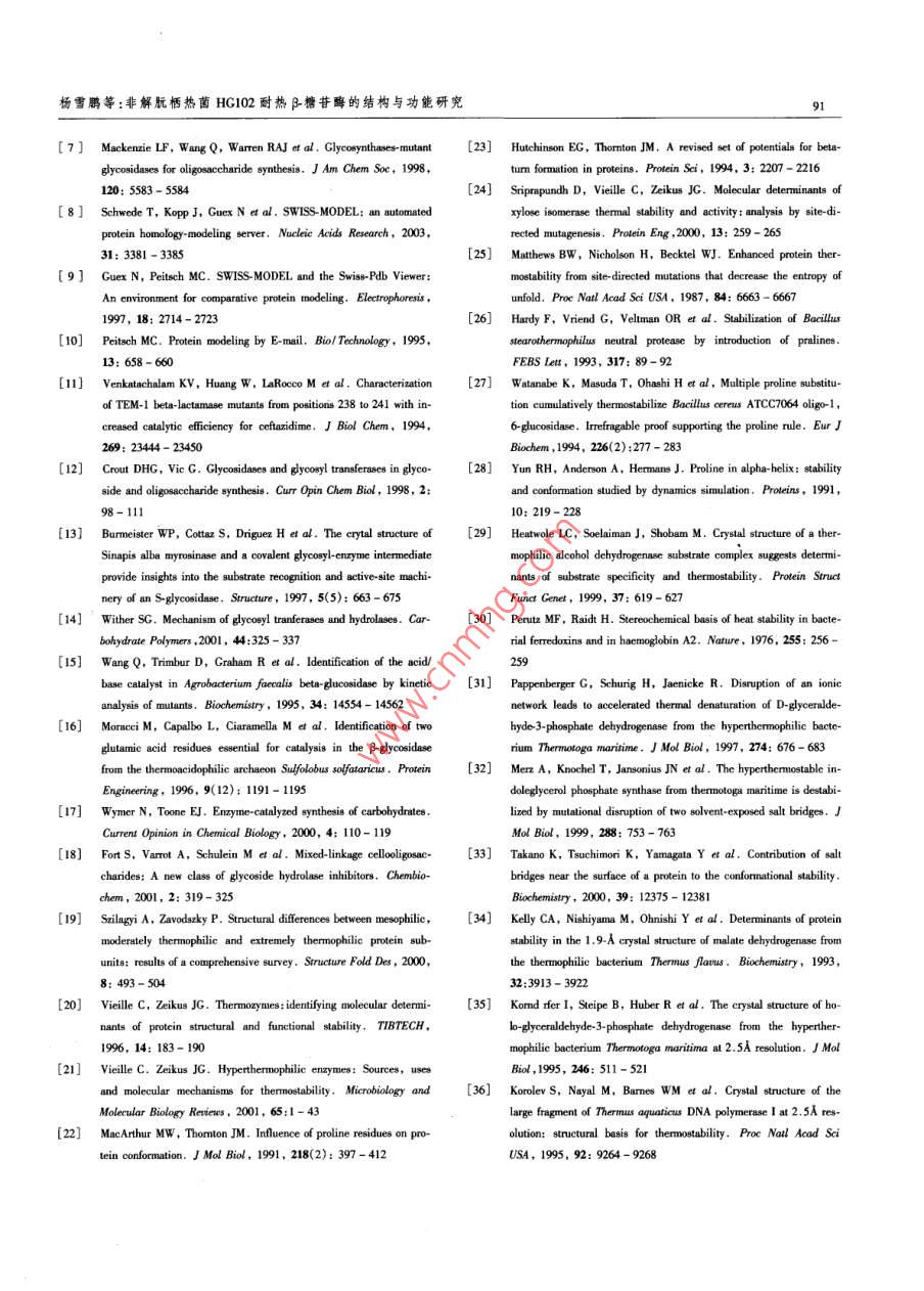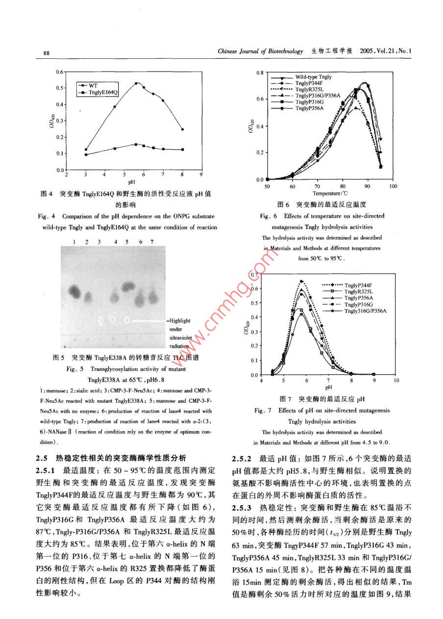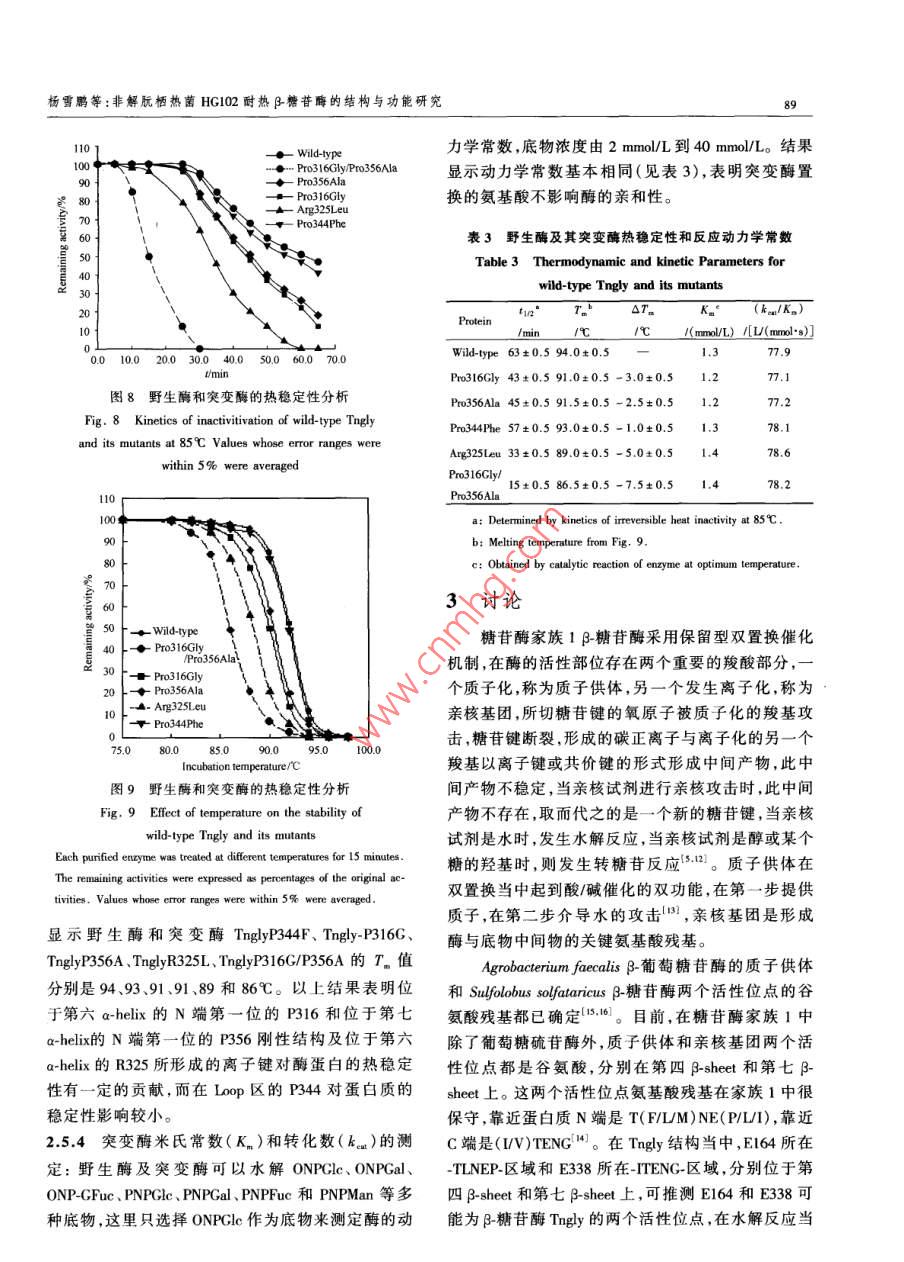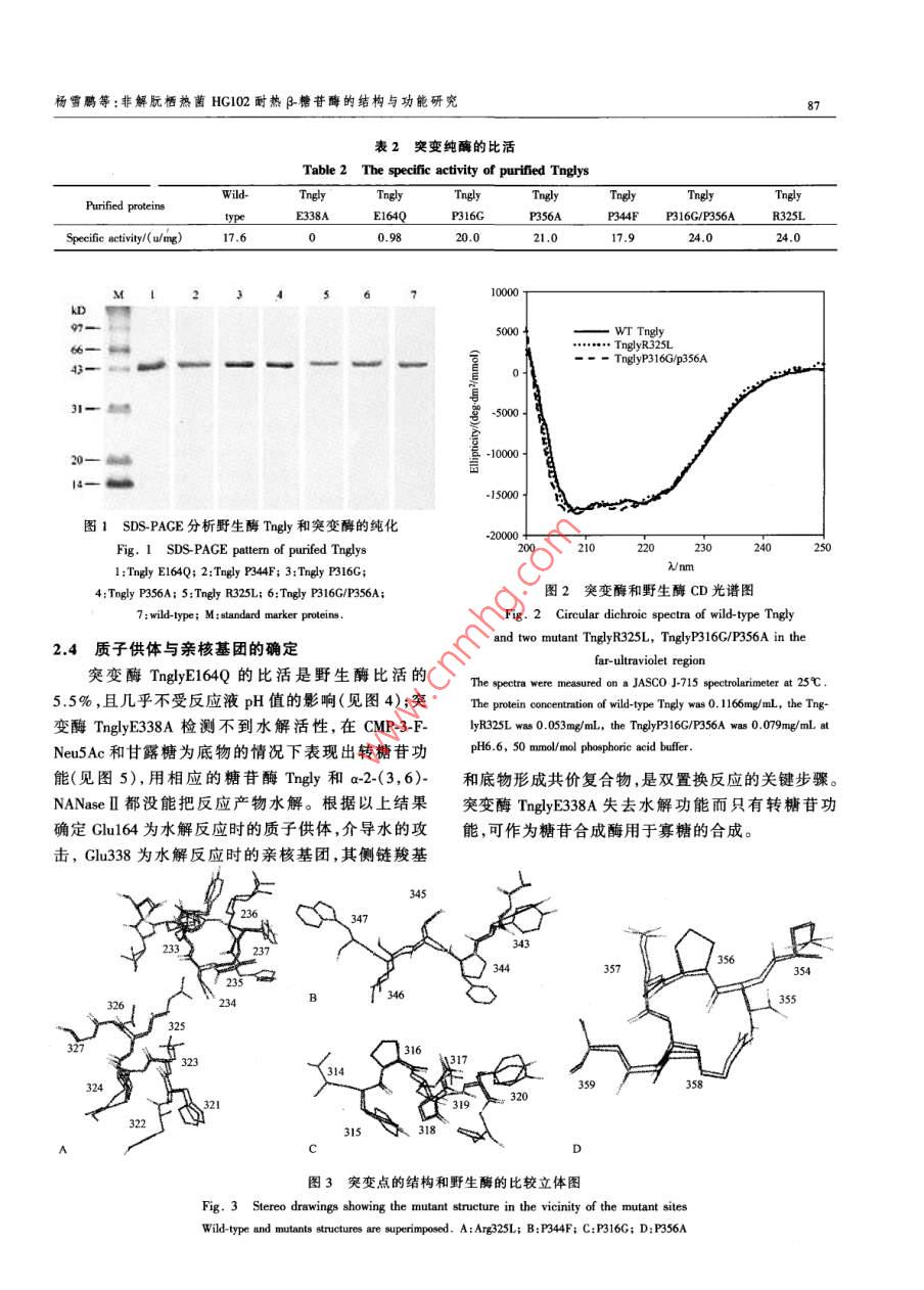 21卷1期生物工程學(xué)報Vol.21 No.12005年1月.Chinese Journal of BiotechnologyJanuary 2005非解朊棲熱菌HG102耐熱β_糖苷酶的結(jié)構(gòu)與功能研究,The Structure-function Relationship of Thermostable β-glycosidase from the Thermophilic Eubacterium Thermusnonproteolyticus HG102楊雪鵬'2,楊壽鈞",韓北忠”,金城'"YANG Xue-Peng'.2,YANG Shou-Jun' , HAN Bei-Zhong?2 and JIN Cheng'" .1.中國科學(xué)院微生物研究所微生物資源前期開發(fā)國家重點實驗室,北京1000802.中國農(nóng)業(yè)大學(xué)食品科學(xué)與營養(yǎng)工程學(xué)院,北京,10001. Slate Key Laboratory of Microbial Reouces,Intite of Micobiology, Chine Academy of Sciences, Beijing 1000 China2. College of Food Science and Nuritionad Enginering. Bejing 100083 , China摘要非解朊棲熱菌HG102耐熱B-糖苷酶為(β/a)。桶狀結(jié)構(gòu),是具有水解功能和轉(zhuǎn)糖苷功能的單體酶。該酶可以作為一個很好的模型來研究糖苷酶的反應(yīng)機制、底物特異性和耐熱的分子基礎(chǔ)。根據(jù)對該酶的晶體結(jié)構(gòu)解析和同家族酶的結(jié)構(gòu)比較,推測Glu164和Glu338分別是質(zhì)子供體和親核基團兩個活性位點;在a~螺旋N端第一位的脯氨酸和蛋白質(zhì)外周的精氨酸是耐熱機制的關(guān)鍵住點和關(guān)鍵氨基酸殘基。為確定這些氨基酸殘基的功能,通過基因定點突變的方法分別把Clu164、Glu338、Pro316、Pro356 Pro344和Ang325 置換成GlnAla、Gly、Ala、Phe和Leu,同時還對Pro316和Pro356進行了雙置換。突變酶經(jīng)過純化得到電泳純,用CD光譜進行了野生酶和突變酶的結(jié)構(gòu)比較。通過突變酶的酶功能和酶學(xué)性質(zhì)分析,結(jié)果表明Glu164 和Glu338 分別是質(zhì)子供體和親核基團,親核基團的突變酶TnglyE338A可以合威混合型糖苷鍵寡糖類似物;在a-螺旋N端第一位的Pro316和Pro356 以及在蛋白質(zhì)外周形成離子鍵的Arg325 均是對耐熱性有貢獻的關(guān)鍵氨基酸殘基。關(guān)鍵詞}$_糖苷酶, 轉(zhuǎn)糖苷活性,熱穩(wěn)定性,定點突變中圖分類號Q814文獻標識碼A文章編號100-3061 (2005)01 0084-08Abstract p-Clycosidase (Tngly) from the thermophilic eubacterium Thermus nonproteolyticus HG102, which is a thermostablemonomerie protein and adopts the (B/a)g barrel fold, is an excellent model system to be invetigated for the thermnostable mecha-nism, activity and substrate specificity. Here, based on the analysis of structural basis for thermostability of Tngly ( Wang et al ,2003) and comparison of other proteins structure of homofamily,Glu164 and Glu338 may act as proton donor and nucleophile inthe hydrolysis reaction respectively; proline located at N1 of a-helix and arginine which can form ion link may contribute to thethermostability. We aim to futher identifty the critical sites and the amino acid residue(s) responsible for the activity, the ther-mal stability and the substrate specifcity . Mutations had been constructed by site-directed mutagenesis. They are Glu164Gln,Clu338Ala, Pro316Gly, Arg325Leu, Pro344Phe, Pro356Ala and Pro316Gly/Pro356Ala. All mutant proteins were purified toSDS-PAGE purity 。Changes in the conformnations were examined by means of CD. The Ghu338 Ala mutant showed no detectablehydrolysis activity, but can synthesize oligosaccharides, as expected for the residue acting as the nucleophile of the reaction. TheReeived: June 17, 2004; Acepted: July 26, 2004This work was suprted by CAS Inovation Progan(No 0103).+ Crreponding autor. Tel: 86-10-62587206; E-mail: jinc@ sun. im. ac. cn中國科學(xué)院知識創(chuàng)新工程項目基金資助(No.0103)。楊雪鵬等:非解朊棲熱菌HG102耐熱β-糖苷酶的結(jié)構(gòu)與功能研究8SGlu164 acts as the general acid/base catalyst in the hydrolysis reaction. Changes in stabilities of mutants compared with wild-typewere determined by means of heat inactivity experiment. These results indicate that the amino acid residue of proline that is lo-cated at N1 positions of a-helix, and Arg325 that form salt bridge between a-helices 5 and a-helices 6, are the critical sites toprotein thermostabilization.Key words B-glycosidase, transglycosylation, thermostability ,site- directed mutagenesis3_糖苷酶(E.C.3.2.1.21)生物來源廣泛,可以Glu338來鑒定β_糖苷酶Tngly水解反應(yīng)時的質(zhì)子供水解多種β構(gòu)型的糖苷鍵,具有廣闊的應(yīng)用前景"。體 和親核基團;置換Pro316 、Arg325、Pro344和Pro356嗜熱細菌Thermus nonproteolyticus HG102 的-糖苷酶來 探討酶的耐熱分子基礎(chǔ)。Tngly基因已克隆、表達并進行了酶學(xué)性質(zhì)的研1材料和方法究”。Tngly 屬于糖苷酶家族1,具有葡萄糖苷酶、半乳糖苷酶、巖藻糖苷酶和甘露糖苷酶活性,在高溫下1.1材料還具有轉(zhuǎn)糖苷活性,它的最適水解反應(yīng)溫度和pH1.1.1菌株與質(zhì)粒: 大腸桿菌( E. coli)AS1.1739值分別為90C和5.6,在90C時,酶的半衰期為2.5[K12r~ O(lacIPOZY) x 74]在中國科學(xué)院微生物研h。Tngly晶體結(jié)構(gòu)解析表明,該酶為(B/a)。桶狀結(jié)究所購買,重組質(zhì)粒pHY(在pUC18載體HindI克構(gòu),分別位于第四B-sheet和第七B-sheet上的Clu164隆位點含有 β_糖苷酶目的基因)為本實驗室構(gòu)建。和Glu338,可能為水解反應(yīng)時的質(zhì)子供體和親核基BMH71-18購自Promega 公司。團。1.1.2培養(yǎng)基及培養(yǎng)條件: LB培養(yǎng)基為大腸桿菌β-糖苷酶可用來合成寡糖'5.61 ,但反應(yīng)要在有機完全培養(yǎng)基,固體培養(yǎng)基加入1.5%的瓊脂粉。重相中并需要高濃度的糖基供體。Mackenzie 等人將組菌培養(yǎng)時加入氨芐青霉素(100 pg/mL),培養(yǎng)溫度Agrobacterium sp. β-葡 萄糖苷酶的親核