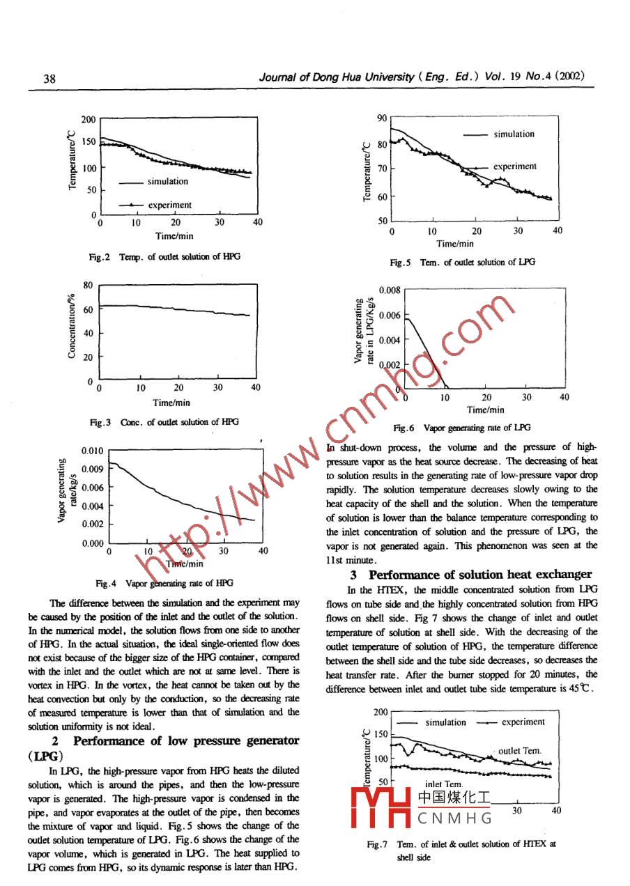 36Journal of Dong Hua University (Eng. Ed.) Vol. 19 No.4 (2002)Dynamic Model and Performance of Absorption Heat Pump inShut- down ProcessWANG Lei(王磊)Cllge of Ervironment Science and Engineeing, Dong Hua Univesiy, Shanghai , 2001LU Zhen(陸震)Insiue of Energy and Power, Shanghai Jiaotong Univrsity, Shanghai, 20030The dynamic model of LiBr absorption heat pump ittemperature and solution concentration in these components anshut down process is established. The simulation resultsanalyzed in detail. The purpose of studying the shut-down processshow good agreement with the experiments. The dynamicof LiBr absorption heat pump is to reduce the shut-down time andperformance of high-pressure generator, low-pressurethe energy consumption without crytallization. The emphasis isgenerator and heat exchanger are analyzed in detail. Thethe change of solution in some components.proper shut-down mode of the heat pump is presented,which, in consideration of solution parameters, has aDynamic Model of Absorption Heat Pumpgreat effect on the possibility of crystallization of sormecomponents.1 The shut-down modeKeywords absorption heat punp,shut-down process, LiBr/The shut-down process of a dirsct-fired absorption heat pumpH2Oof double effct refrigeration cycle with reverse series solutioncircuit is simulated. The shut-down mode is performed in thefollowing onder: stop of the bumer first, after some time, shuttingIntroductionoff the circulating solution pump and the refrigerant pump, shuttingoff the cooling water purmp and the chlled water pump, tum ofAbsorption heat purmp is widely used in many fields. It hasthe overall power at last. The dynamic prformance is referred tothe advantage of not using CFCs refrigerant and having no ham tothe process in which the state of heat pump changes from steady tothe environmnent. LiBr- H2O solution, as the working pair in thethe shut off.absorption heat pump, has the shortcoming of the possible of2 Model of high pressure generator (HPG)crytallization. If the temperature of the solution is lower than theThe shut-down process in HPG can be considered two stages.saturated temperature, the solubility decreases and the crystal ofIn the first stage, alhough the heat is not supplied, the vapor islithium bromide separates out of the solution, then thesill generated owing to whose own heat capacity. In the secondcrysalization occurs. This phenomenon takes place with highstage, no vapor is generated.probability under shut-down process. As the heat soure is notSolution mass balance equation:supplied, the highly concentrated solution has a tendency ofcrystallization when it is cooled. To avoid this phenormenon, whenoe= ma- meo- mw(1)the bumer is stopped in shut-down process, the circulating solutionpump and the refrigerant pump should keep running,so that themhy is greater than 0 in the first stage, equals to 0 in the secondsolution in the heat pump is circulated and the concentratedstage.solution in some components is diluted. The shut-down processLiBr mass balance equation:can not be stopped until the solution in the machine is mixedd(G. x)= mu. xhi一mhw' Sh(2)sufficiently. The running time is usually determined byd:experience, which is quite uncertain. Therefore, it is importantThe average solution concentnation in the HPG is substiwuted by theto sudy the shut-down performnance for reducing the running timeoutlet solution concentration.and the energy consumption. Zhuo21, Stephan'3 J discussed theVapor mass balance equation:different shut-down mode of the heat ransfomer. Anand-4JdGmanalyzed the stages of the shut-down process. In this paper, thedr=maw-mmo(3)dymamic performance under shut-down process is investigated bysimulation and experiment. The dynamic model of the heat pumpmhno中國煤化工x beween LPG and HPG.has been established and the simulation results show goodIn thin the second stage, mmwoagreement with experiments. The changes of pressure, soluionvariesMYHCNMHGThis paper is supported by the UTC RongHong foundation.Recived Dec.28, 2001Jourmnal of Dong Hua University (Eng. Ed.) Vol. 19 No.4 (2002) 37Solution energy balance equntion:Model of solution heat exchangermai"hai = mho.hw+ mho" h +d(G . hoe)+ Q.+ QanThe model of solution heat exchanger under shut-downlτprocess is similar to the startup model5. The high temperatureneat exchanger (HTEX) and low temperature heat exchangerThere is no heat radiation in the hearth. The heat transfer between. (LTEX) are both shl-ube heat exchangers. The highthe smoke and the tube bundle of the solution is ignored becausetemperature concentrated solution is cooled at the shell side, andthe heat capacity of smoke is negligible compared to the heatthe low temperature diluted solution is heated at the tube side.Under the shut-down process, the cool flow rate of the highcapacity of the shell and the solution.temperature solution and the heat flow rate of the low temperatureVapor energy balance equation;solution decrease gradually.d(G . hee)t= mm" hm- mheo' hwo(5)Dynamic Performance under Shut-downVapor and soluion pressure equation:ProcessdPre_ dpwi_ dpwe(6)dr dr dr1 Performance of high pressure generatorState equations of vapor and solution should be added for solving(HPG)above equations.When the bumer is stopped, the solution is still beated owing3 Model of low pressure generator (LPG)to the large bheat capacity of the shell and the solution although noThe parameters of LPG are related to HPG, high temperatureflame radiation heat exists. The decreasing of heat flow rate resultseat exchanger ( HTEX), low temperature heat exchangerin reduction of the rate of vapor generation. The vapor still flows(LTEX), condenser and absorber. The shut-down process in LPGinto LPG as a result of pressure dfference between HPG and LPG.can be divided into three stages. In the first stage, low-pressureThe decreasing of the volume of vapor in the container bringsvapor is generated. When the high-pressure vapor generated inabout the pressure drop. The tem