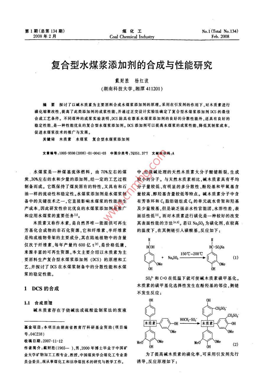 第1期(總第134期)煤化工No. 1(Total No 134)2008年2月Coal Chemical IndustryFeb.2008復合型水煤漿添加劑的合成與性能研究戴財勝楊紅波(湖南科技大學湘潭411201)摘要探討了以堿木質素為主要原料合成水煤漿添加劑的原理。采用在引發(fā)劑的作用下,對木質素進行磺化縮聚改性,提高了此類添加劑的成漿性能,并通過正交設計實驗法確定了復合型水煤漿添加劑DCS的最佳合成工藝條件。不同煤種的成漿實驗表明,DCS除具有萘系水煤漿添加劑的良好的分散性能外,還具有良好的穩(wěn)定性能,是一種性能優(yōu)良的復合型水煤漿添加劑。DCS添加劑可以提高水煤漿的成漿性能,降低其制漿成本促進水煤漿技術的推廣與發(fā)展。關鍵詞木質素水煤漿復合型水煤漿添加劑文章編號:1005-9598(2008)-01-004103中圖分類號:Q351.377文獻標識碼:A水煤漿是一種煤基流體燃料,由70%左右的煤中,經強堿處理的天然木質素大分子醚鍵斷裂,生成炭、30%左右的水和少量的添加劑,經一定的工藝過程較小的分子。與天然木質素相比,堿木質素具有平均制備而成。它既保持了煤炭原有的特性,又具有和石分子量較低、有明顯的多分散性、酚羥基和甲氧基含油一樣的流動性和穩(wěn)定性。水煤漿添加劑是水煤漿制量較高、醇羥基含量較低等特點。堿木質素分子中含備中的關鍵技術之一,它直接影響水煤漿的性能和生有芳香環(huán)和C3脂肪鏈組成C的單元疏水骨架和羥基產成本,因此研發(fā)性價比優(yōu)良的水煤漿添加劑是推廣及少量羧基,但是缺乏強親水性官能團,水溶性差,表和應用水煤漿的重要任務山面活性低③。而對木質素進行磺化是一種較好的改變木質素又稱作木素,是自然界唯一能提供可再生其表面性能的方法。若以NaSO3為磺化劑,在較高芳基化合成物的非石化資源,它和纖維素、半纖維素的溫度下,在其側鏈引入磺酸基,反應如下:是構成植物骨架的主要成分,其在陸地植物中的含量僅次于纖維素,每年產量約600億t田,是價格低廉,HC-SO-N來源豐富的可再生資源。本文主要介紹以木質素為主150℃-200℃要原料生產復合型水煤漿添加劑(DCS)的原理和工+Na2SO3一藝,并探討了DCS在水煤漿制備中的分散性能和水煤漿的穩(wěn)定性能。s03和C=0在低溫下就可使堿木質素磺甲基化1DCs的合成木質素的磺甲基化選擇性發(fā)生在酚羥基的鄰位,側鏈不發(fā)生反應11合成原埋堿木質素存在于燒堿法或硫酸鹽制漿法的廢液HOCH2-SO,木質素木質素基金項目:本項目由湖南省教育廳科研基金資助(項目編號:04c238)收稿日期:2007-11-12作者簡介:戴財勝(1965-),男,2000年博士畢業(yè)于中國礦業(yè)大學礦物加工工程專業(yè)教授,中國煤炭學會煤化工專業(yè)委為了提高堿木質素的磺化率,可采用引發(fā)劑先行員會委員,現從事煤化工和潔凈煤技術的研究與教學工作。誘導,反應原理如下煤化工2008年第1期分別是成漿性能差的義馬煤、成漿性能中等的山西煤+磺酸鹽引發(fā)劑和成漿性能良好的湖南婁底煤,其工業(yè)分析見表1。SO Na表1義馬煤、山西煤和婁底煤的工業(yè)分析煤種MA/%AM/%V4/%S4/%Q/MJkg1木質素磺酸鈉與甲醛縮聚反應,生成高分子量的義馬煤452126337.741.4027水煤漿添加劑,其反應機理是山西煤0.8611.8628.680.9828婁底煤0.5812.2130.1410.5627.5322實驗方法2.2.1水煤漿的制備稱取已經配好的100g煤粉(煤粉的粒度小于200目的大于80%)倒人燒杯中,準確量取一定量的添加劑,在攪拌的情況下,加入所制濃度需要的水,然后用(4)自動攪拌器在1200r/min的轉速下攪拌15min,攪拌時攪拌頭離燒杯底1cm,得到煤水混合物即水煤漿2.2.2水煤漿黏度的測定12合成工藝實驗中水煤漿黏度的測定使用NDJ-1型黏度計,1.2.1合成原料選用3號轉子,轉速為30r/min,測量時間為5min,測堿木素(木質素的質量分數45%-48%,pH值8~量溫度為25℃,測量容器為100L燒杯。9)、磺化劑A、引發(fā)劑B、聚合劑C。2.2.3水煤漿流動性的測定1.2.2實驗裝置水煤漿流動性采用目測法,根據其流動性狀,分實驗儀器:三口燒瓶、溫度計、HB-2型水浴鍋為AB、C、D4個等級;每個等級的標準是:A不間斷J1型電動攪拌裝置、電子天平、分液漏斗、移液管。流動;B間斷流動,呈稠流狀;C間斷流動,呈稀糊狀;實驗裝置示意圖如圖1所示。D不流動攪拌器2.2.4水煤漿的穩(wěn)定性測定溫度計分液漏斗將100mL水煤漿用漏斗倒人100mL的量筒里,用保鮮膜密封,觀察24h析水情況。然后每天開封,采用恒溫水浴鍋水煤漿靜穩(wěn)定性的檢測方法測其沉淀情況,確定水煤漿出現硬沉淀時的時間。23復合型添加劑DCS與綦系添加劑Ns性能比較分別用DCS和NS對成漿性能不同的義馬煤、山西煤、湖南婁底煤進行成漿性實驗,檢測所制水煤漿圖1DCS合成實驗裝置示意圖的濃度、黏度、流動性和穩(wěn)定性能,其實驗結果見下頁表2~表4。1.2.3工藝條件從表中可以明顯看出,對于同一種煤,在相同的通過正交設計實驗和煤的成漿性實驗確定了由制漿工藝條件、相同的添加劑用量和水煤漿濃度的條堿木質素制復合型水煤漿添加劑的最佳工藝條件為:件下,DS與NS相比,不僅具有與NS相同的良好的每千克堿木質素加入磺化劑A200g,引發(fā)劑B50g在分散效果,還具有良好的穩(wěn)定性能,DCS是一種性能溫度T下反應th,然后與聚合劑C100g在溫度T2優(yōu)良的復合型水煤漿添加劑。下反應h2h,得到復合型水煤漿添加劑。3主要結論2DCS性能檢測3.1實驗結果表明,DCS復合型水煤漿添加劑適應煤21煤樣
