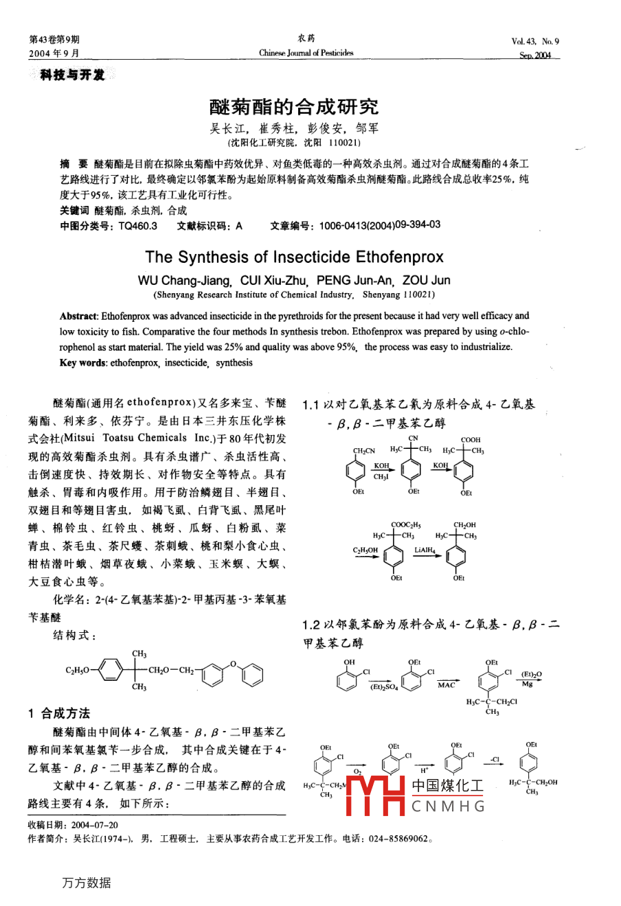 第43卷第9期農(nóng)藥Vol.43, No.92004年9月.Chinese Joumnal of PesticidesSep. 2004科技與開發(fā)醚菊酯的合成研究吳長江,崔秀柱,彭俊安,鄒軍(沈陽化工研究院,沈陽110021)摘要醚菊酯是目前在擬除蟲菊酯中藥效優(yōu)異、對魚類低毒的-種高效殺蟲劑。通過對合成醚菊酯的4條工藝路線進行了對比,最終確定以鄰氯苯酚為起始原料制備高效菊酯殺蟲劑醚菊酯。此路線合成總收率25%,純度大于95%,該工藝具有工業(yè)化可行性。關(guān)鍵詞醚菊酯,殺蟲劑。合成中圖分類號: TQ460.3文獻標識碼: A .文章編號: 1006-0413(2004)09-394-03The Synthesis of Insecticide EthofenproxWU Chang-Jiang, CUI Xiu-Zhu, PENG Jun-An, ZoU Jun(Shenyang Research Institute of Chemical Industry, Shenyang 110021)Abstract: Ethofenprox was advanced inseticide in the pyrethroids for the present because it had very well efcacy andlow toxicity to fish. Comparative the four methods In synthesis trebon. Ethofenprox was prepared by using o-chlo-rophenol as start material. The yield was 25% and quality was above 95%,the process was easy to industrialize.Key words: ethofenprox, insecticide, synthesis醚菊酯(通用名ethofenprox)又名多來寶、芐醚1.1以對乙氧基苯乙氰為原料合成4-乙氧基菊酯、利來多、依芬寧。是由日本三井東壓化學株- β,β-二甲基苯乙醇式會社(Mitsui Toatsu Chemicals Inc.)于 80年代初發(fā)CCOOHCH2CN HyC十 CH3 HC--CH3現(xiàn)的高效菊酯殺蟲劑。具有殺蟲譜廣、殺蟲活性高、擊倒速度快、持效期長、對作物安全等特點。具有t)0KOLCHI觸殺、胃毒和內(nèi)吸作用。用于防治鱗翅目、半翅目、E雙翅目和等翅目害蟲,如褐飛虱、白背飛虱、黑尾葉蟬、棉鈴蟲、紅鈴蟲、桃蚜、瓜蚜、白粉虱、菜CH2OHHC+-CH3H;C-十-CHy青蟲、茶毛蟲、茶尺蠖、茶刺蛾、桃和梨小食心蟲、CHgOHLiAlH4柑桔潛葉蛾、煙草夜蛾、小菜蛾、玉米螟、大螟、心大豆食心蟲等。OEtDEt化學名: 2-(4- 乙氧基苯基)-2-甲基丙基-3-苯氧基芐基醚1.2以鄰氯苯酚為原料合成4-乙氧基- β,β-二結(jié)構(gòu)式:甲基苯乙醇CHyOHC2H;O-《y-十-CH20-CH2-21,CH3O口.(Et)2SO4ACHgC-C-CH2CI1合成方法CHg醚菊酯由中間體4-乙氧基- β. β-二甲基苯乙醇和間苯氧基氯芐- -步合成,其中合 成關(guān)鍵在于4-OEIOEQEIy" _a乙氧基- β. β-二甲基苯乙醇的合成。文獻中4-乙氧基- β,β-二甲基苯乙醇的合成HC-CH中國煤化工HzC-C-CH2OHCH路線主要有4條,如下 所示:MYHCNMHG收稿日期: 2004-07-20作者簡介:吳長江(1974-), 男,工程碩士,主要從事農(nóng)藥合成工藝開發(fā)工作。電話: 024-85869062.第9期吳長江,等:醚菊酯的合成研究3951.3以對溴苯乙醚為原料合成4-乙氧基- β,β-2.2.1鄰氯苯乙醚(1)的制備二甲基苯乙醇在250ml安裝有攪拌器、溫度計、滴液漏斗和回)EtOEt只c流冷凝器的四口反應(yīng)瓶中加入81g鄰氯苯酚和58.3g硫g.酸二乙酯,滴加65g 45%的氫氧化鈉溶液,滴加完畢并3rMgBrHyC-C-CH2OH使溫度均勻上升,滴加結(jié)束, 升溫回流反應(yīng)3h, 反應(yīng)CH3結(jié)束。降溫,加水, 攪拌使反應(yīng)生成的鹽全部溶解,靜1.4以叔丁 基酚為原料合成4-乙氧基- β,β-置分層,上層油 相在減壓條件下脫水即得產(chǎn)品(脫水條件為0.075MPa真空度下,升溫到1209C),得量91.748,收率93%。OHo CH32.2.23- 氯-4-乙氧基新苯基氯( II )的制備~CHCl2.在250ml四口瓶中加入79gI,冰浴降溫,-10C以下緩慢加入濃硫酸25g,加畢后滴加22.9g甲代烯丙HzC-C -CH3CHy基氯(以下簡稱MAC),滴加完畢,攪拌反應(yīng)保溫5h。攪拌下傾入100 ml水中,攪拌30min靜置分層,100mlOEx 260C水洗滌2次,減壓條件下脫除水分,取樣分析,(E)SO,H,O*得量99.75g,收率 80%。NaOH2.2.3 3- 氯-4-乙氧基- B,β二甲基苯乙醇( Il )的制HzC-C-CH2CI HzC-C - CH2Cl HzC-C-CH2OH備在250ml四口反應(yīng)瓶中加入11g鎂片,滴加I 83.2g與合成醚菊酯乙醚191.48的混合溶液,潤濕鎂片,升溫回流,滴加1~ 2mlOC2Hs溴乙烷引發(fā).3h內(nèi)將剩余混合溶液滴人,回流保溫。反應(yīng)完CIH2C、畢,靜置上清液倒人另-個干燥的燒瓶中,控制溫度和通0°O氧速度進行氧化反應(yīng),反應(yīng)結(jié)束,調(diào)節(jié)pH= 3~4.靜置分HzC層分別用50ml水洗滌2次,常壓蒸餾乙醚到70C,即得粗CH2OH品稱重54g,收率70%。2.2.4 4-乙氧基- B,β二甲基苯乙醇(V)的制備在250ml四口瓶中加入50g甲苯,投人金屬鈉,啟C2HzO--CH2O- -CH2-動攪拌,回流條件下加入19g M,滴加完畢保溫20min,通過以上路線的驗證,1.1. 1.3采用的原料價格昂稍降溫后靜置,傾出上清液,殘渣用50ml甲苯萃取2次,貴,且1.1 用氫化鋰鋁還原,無法從事工業(yè)化。1.3 中環(huán)傾出液和萃取液合并,加水,鹽酸中和到pH= 3.靜置氧異丁烷合成困難,成本高。 路線1.2.1.4從文獻及試分層,油相減壓蒸餾,得油狀粗產(chǎn)品。將粗品重結(jié)晶,降溫到10C,過濾,烘干得產(chǎn)品11.5g,收率68%。驗對照,1.4法從成本、 工程上都無法與1.2相比。參考文獻方法,進行適 當改進,在格式化反應(yīng)后再采2.2.5間苯氧基氯芐(V )的制備用鈉法脫氯,改進后步總收率40.9%(文獻:總收率250ml 四口瓶中加入248間苯氧基甲苯、1.5g 催化劑、200g四氯化碳,升溫回流條件下通入氯氣28跟蹤反應(yīng)完畢,34%)。減壓脫溶得淡黃色液體24.5g,收率87%。2試驗部分2.2.6醚菊酯的制備2.1試劑250ml四口瓶中加入(IV)288.(V)32g、催化劑0.1g升鄰氯苯酚,工業(yè)級,純度≥98%;硫酸二乙酯.溫反中國煤化工甲苯10ml,水5Oml,工業(yè)級.純度≥99%;間苯氧基甲苯,工業(yè)級.純度攪拌YHCNMHG威壓脫溶,殘余加人≥98%。乙醇重結(jié)晶,過濾烘干,稱重,得量36g,收率75%。2.2試