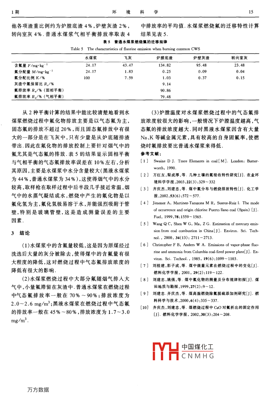 第26卷第1期環(huán)境科學(xué)Vol 26. No2005年1月ENVIRONMENTAL SCIENCE黑液水煤漿燃燒過(guò)程中氟排放特性任強(qiáng),劉建忠,盛軍杰,葉琳,曹欣玉,周俊虎,岑可法(浙江大學(xué)熱能工程研究所能源潔凈利用與環(huán)境工程教育部重點(diǎn)實(shí)驗(yàn)室杭州310027)摘要:在0.25MW燃燒試驗(yàn)臺(tái)上進(jìn)行黑液水煤漿燃燒過(guò)程中氟的排放特性研究,并和普通水煤漿進(jìn)行對(duì)比,分析了影響排放過(guò)程的各因素試驗(yàn)表明水煤漿中的氟含量較低,一般小于30mg/kg,普通水煤漿燃燒氟排放率為70%~90%,排放濃度為20~2.6mg/m3;黑液水煤漿氟排放率明顯低于普通水煤漿,為45%~80%,排放濃度為17~3.0mg/m3爐膛溫度和水煤漿成分對(duì)氟排放濃度有一定的影響關(guān)鍵詞:氟;水煤漿;黑液水煤漿;燃燒中圖分類(lèi)號(hào):X701,TQ534文獻(xiàn)標(biāo)識(shí)碼:A文章編號(hào):0250-3301(2005)01-001Emission of Fluorine from Black Liquor Coal-Water Slurry CombustionREN Qiang, LIU Jian-zhong, SHENG Jun-jie, YE Lin, CAO Xin-yu, ZHoU Jun-hu, CEN Ke-fa(Clean Energy and Environment Engineering Key Laboratory of Ministry of Education, Zhejiang University, Hangzhou 310027Abstract: The paper is about the emission of fluorine from an experimental boiler of 0.25 MW when burning black liquor coal-waterslurry(CWS). The result is compared with CwS. And the analysis of effect factors is also carried out. Experimental research showthat, the content of fluorine in CWS, which was less than 30 mg/kg, was relatively low. The emission ratio and concentration of fluorine were 70%-90% and 2.0-2. 6 mg/m respectively when burning common CWS; while the data of those when combustingblack liquor CwS were 45%-80% and 1.7--3.0 mg/m respectively. The hearth temperature and the element of CwS were twofactors of emission fluorine when burning CwsKey words: fluorine; coal water slurry: black liquor CWS; combustion氟是煤中的一種有害微量元素1.在煤燃燒過(guò)就是在0.25MW燃燒試驗(yàn)臺(tái)上,對(duì)黑液水煤漿程中原來(lái)賦存于煤中的氟化物將以氣態(tài)(主要是氟 coal-water slurry,CwS)和普通水煤漿在燃燒過(guò)程化氫)的形式隨煙氣排出,對(duì)大氣造成危害繼而影響中的氟排放特性作了研究,并對(duì)氟排放的影響因素水域和土壤2.在實(shí)驗(yàn)室和工業(yè)領(lǐng)域中對(duì)硫等煤中進(jìn)行了分析有害元素進(jìn)行了研究和應(yīng)用之后,諸如氟、氯、汞等實(shí)驗(yàn)裝置和方法的一些有害微量元素的排放和污染也已引起人們的關(guān)注3-.目前,國(guó)內(nèi)外對(duì)氟的研究主要集中在燃11實(shí)驗(yàn)裝置煤鍋(窯)爐氟污染物在煙氣、灰、渣及沖灰水等環(huán)節(jié)0.25MW燃燒試驗(yàn)臺(tái)見(jiàn)圖1,試驗(yàn)臺(tái)主體呈U中的靜態(tài)分布特征67字形,高約3.5m,內(nèi)徑300mm,爐膛及煙道均采用煤中的氟含量一般在20-500mg/kg,但是有些水冷卻系統(tǒng)爐膛溫度用紅外高溫計(jì)測(cè)量,正常燃燒高灰份劣質(zhì)煤中的氟含量可高達(dá)3000ngkg81時(shí)爐膛溫度在1200℃左右煙氣各項(xiàng)參數(shù)用多組份如石煤).氟化氫的危害要比SO2高得多,一般要煙氣測(cè)量?jī)x測(cè)量,試驗(yàn)過(guò)程中鍋爐主要參數(shù)基本維高出10~-100倍.由于植物能強(qiáng)烈吸收空氣中富集持不變的氟,致使一些對(duì)氟敏感的植物很容易受害死亡近12水煤漿特性分析和控制進(jìn)行了很多研究由于目前水煤漿燃料的廣本次試驗(yàn)燃料是黑液水煤漿和普通水煤漿2年來(lái)劉建忠9等人已經(jīng)對(duì)煤燃燒過(guò)程中氟的排放中國(guó)煤化工和造紙廠黑液配制而泛應(yīng)用特別是特種水煤漿燃料的制備和燃燒應(yīng)用,成,iCNMH團(tuán),2種水煤漿工業(yè)分如有機(jī)廢液水煤漿、造紙黑液水煤漿等,因這種燃料收稿日期:20040326;修訂日期:20040625利用廢液或黑液代替水和添加劑制備水煤漿,具有基金項(xiàng)目:國(guó)家自然科學(xué)基金項(xiàng)目(59876036);國(guó)家重點(diǎn)基礎(chǔ)研究發(fā)展規(guī)劃項(xiàng)目(G199922211)環(huán)保和節(jié)能雙重效益已受到有關(guān)方面的關(guān)注本文作者介:(978).男,碩士,主要研究方向?yàn)槿紵臀廴疚?期環(huán)境科學(xué)析和元素分析見(jiàn)表1和表2.1.3氟測(cè)量及計(jì)算方法水煤漿中的氟含量按國(guó)標(biāo)(GB463384)規(guī)定的攪拌電機(jī)氟離子選擇電極法測(cè)量,采用高溫?zé)崴夥ㄟM(jìn)行預(yù)攪拌罐壓縮空氣處理.試驗(yàn)證明,該測(cè)量方法對(duì)氣態(tài)氟的吸收率高達(dá)94%10).煙氣中氣態(tài)的氟用2個(gè)裝有50mL的濾網(wǎng)三次風(fēng)10 g/L NaOH溶液的集氣瓶采集,定容后用氟離子去煙道選擇電極法測(cè)量.煙氣采集點(diǎn)在尾部煙道處除塵器單螺桿泵前+氟離子濃度的計(jì)算公式:Fc×5圖10.25MW水煤漿燃燒試驗(yàn)臺(tái)Fig 1 CwS burning experimental boiler of 0. 25MW△Eanti表1黑液水煤漿和普通水煤漿的工業(yè)分析Table 1 Proximate analysis of the black liquor式中:F為NaOH溶液的含氟量,pg;F1.為空白CWS and the common CwsNaOH溶液的含氟量,g;F為水解樣中的氟含量M,A,RQm,mkHg;S為氟電極的實(shí)測(cè)斜率△E為E1-E2,mV;c工業(yè)分析為氟標(biāo)準(zhǔn)溶液濃度,g·mL黑液水煤漿44.926.4819.9128.6814940.49普通水煤漿34144.6922.5638.6819803.932試驗(yàn)結(jié)果與討論表2黑液水煤漿和普通水煤漿的元素分析2.1水煤漿燃燒氟排放特性的研究Table 2 Ultimate analysis of the black liquor試驗(yàn)在穩(wěn)定