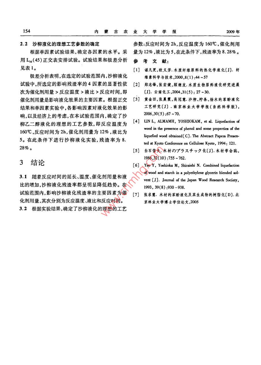 第30卷第3期內(nèi)蒙古農(nóng)業(yè)大學學報2009年9月Joumal of Inner Mongolia Agricultural Universitysep.2009沙柳材乙二醇液化工藝研究靳麗萍,李亞斌,楊愛榮,王欣,黃金田(內(nèi)蒙古農(nóng)業(yè)大學材料科學與藝術(shù)設(shè)計學院呼和活特010018)摘要:沙柳是我國沙漢地區(qū)廣為種植的沙生灌木之一,資源儲備豐富。運用木質(zhì)生物質(zhì)液化技術(shù)可以將沙柳木粉轉(zhuǎn)化成液態(tài)物質(zhì),液化產(chǎn)物含有大量的活潑羥基,可以代替石化資源參與聚氨酯材料的合成。以乙二醇為液化劑,稀硫酸作催化劑,對沙柳進行了液化試驗,分析了液化時間、反應(yīng)溫度、液比和催化劑用量及對液化效果的影響。結(jié)果表明:(1)在試驗范圍內(nèi),催化劑用量對液化過程的影嘲最大,液比、反應(yīng)時間和反應(yīng)溫度等對液化過程也有不同程度的影響。(2)沙柳材適宜的液化工藝條件為:溫度160℃,液比為5,催化劑質(zhì)量分數(shù)12%,時間2h。在此條件下,沙柳液化殘渣率為能達到8.28%。關(guān)鍵詞:沙柳;乙二醇;液化中圖分類號:S78143文獻標識碼:A文章編號:1009-3575(2009)03-0151-04LIQUEFACTION OF SALIX IN THE PRESENCE OF GLYCOLJIN Li-ping, LI Ya-bin, Yang Ai-rong, Wang Xin, HUANG Jin-tianCollege of Material Science and Arts Design, Inner Mongolia Agricultral University, Huhhot 010018, ChinaAbstract: Salix is one of desert shrub widely planted in Chinese desert, which is rich in resource. Wood meals of Salix can be con-versed into liquid mass by liquefaction technic. Because there were a great lot of hydroxy in liquefied products, which can be replacedpetrolic resource to synthesize polyurethane material with isocyanate.The liquefaction of Salir psammophila in the presence of glycol under sulfuric catalysis was studied. The effects of reaction timefluid ratio(glycol/wood ), catalyst dosage and reaction temperature on liquefaction were investigated. It shows that, (1)the reactiontime has a greatest influence on liquefaction process; moreover, liquefaction process is affected by liquefaction ratio, catalyst dosageand reaction temperature at a certain extent. (2)The optimum condition of liquefaction for Sali psammophila is estimated as: temper-ature of 160C, the reaction time of 2 h, fluid ratio(glycol/ wood ratio )of 5 and catalyst dosage of 12 % Under this craft condi-tion, the residue ratios are 8. 28%oKey words: Salix: Glycol; Liquefaction聚氨酯由于其獨特的性能和廣泛應(yīng)用性已成為條含有大量的纖維素和木質(zhì)素等多羥基成分,具備世界六大合成高分子材料之一,其基本反應(yīng)是異氰制備多元醇的條件。隨著生物質(zhì)液化技術(shù)的發(fā)展酸酯與多元醇的加成縮聚反應(yīng),大部分植物原料是成熟,液化已成為天然木質(zhì)原料利用的主要途徑之富含羥基的天然聚合物,可以作為聚氨酯的原料。將液化技術(shù)運用于沙柳材,液化產(chǎn)物理論上沙柳是我國沙荒地區(qū)造林面積最大的樹種之可代替聚醚或聚酯多元醇與異氰酸酯發(fā)生親核加成生長迅速,枝葉茂密,根系繁大,固沙保土力強。反應(yīng)制備聚氨酯材料,這樣不但可以提高沙柳材的由于其獨特的生物學特性3年~5年必須平茬才可附加值,而且也為沙柳資源的利用開辟了一條新途繼續(xù)生長。因此,可獲得大量的沙柳枝條。沙柳枝徑。然科學基金重點項目(2008010603和20011020504)生,主要研究方向為復合材料制備技術(shù)nail jintian he152內(nèi)蒙古農(nóng)業(yè)大學學報2009年成具有較大分子量的聚合物,結(jié)果使得殘渣得率有1材料與方法所增大。1.1材料與試劑沙柳:采自內(nèi)蒙古鄂爾多斯新街治沙站,去皮、粉碎,篩選出40目~80目沙柳木粉,在105℃烘箱中干燥12h保存在干燥器中備用;乙二醇,分析純;稀硫酸(由于濃硫酸會使木粉發(fā)生碳化,所以實驗采5050用37%的稀硫酸作催化劑,實驗室自制,丙酮,分析純。1.2方法1.2.1沙柳液化在裝有機械攪拌、溫度計、回流反應(yīng)溫度《℃冷凝裝置的三口燒瓶中,加入液化試劑乙二醇和催化劑稀硫酸,油浴加熱到指定溫度后,加入準確稱量圖1反應(yīng)溫度對液化殘渣率的影響的5g沙柳木粉計為反應(yīng)開始時間。反應(yīng)到指定時Fig. 1 Effect of reaction temperature間后,將三口燒瓶放于水浴中冷卻終止反應(yīng),計為反sidual rate of liquefaction應(yīng)結(jié)束時間。用丙酮稀釋液化產(chǎn)物,抽濾后,反復用丙酮清洗液化產(chǎn)物,直至顏色為無色,得到不溶物殘渣和濾液。殘渣在干燥箱里干燥至恒重,稱量。以沙柳液化后的殘渣含量表示液化效果,有以下公式計算殘渣率:殘渣率=(殘渣質(zhì)量/植物原料質(zhì)量)100%1.2.2沙柳液化工藝參數(shù)優(yōu)化采用單因素試驗法確定反應(yīng)溫度、反應(yīng)時間、催化劑用量和液比單獨反應(yīng)時間作用下的顯著作用范圍及它們各自對液化殘渣率的影響,用L16(4)正交表安排試驗。圖2反應(yīng)時間對液化殘渣率的影響2結(jié)果與討論2.1.2反應(yīng)時間的影響當催化劑為10%,液比為2.1各因素對沙柳液化殘渣率的影響6(乙二醇30g),反應(yīng)溫度為160℃時,不同的反應(yīng)時選取液化反應(yīng)溫度、反應(yīng)時間催化劑用量(與間對液化殘渣率的影響,由圖2所示。乙二醇質(zhì)量之比)和液比(乙二醇與沙柳木粉質(zhì)量之隨著反應(yīng)時間的延長,殘渣率的降低趨勢十分比)為主要影響因素,以其中1個因素為變量,其它明顯,尤其在1h到2h的范圍里殘渣率下降的速度因素為固定值進行試驗考察各因