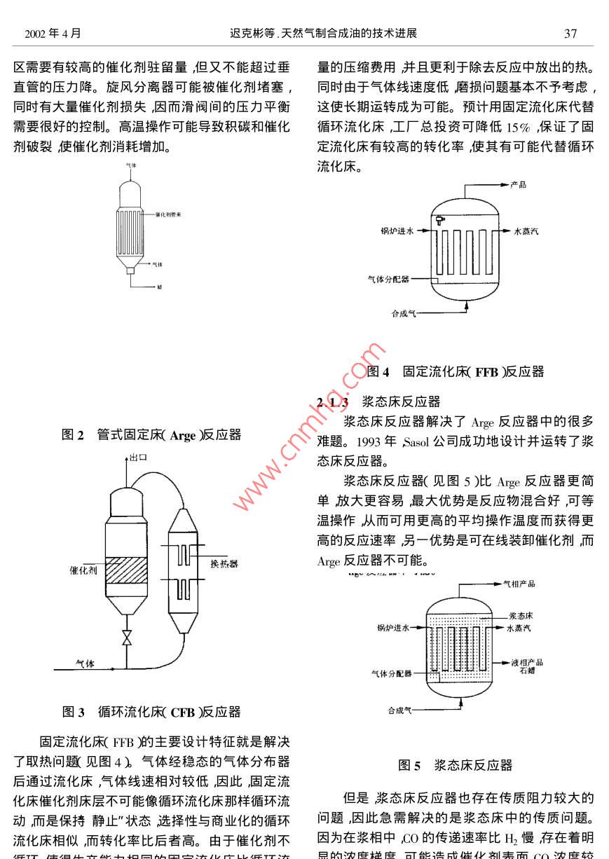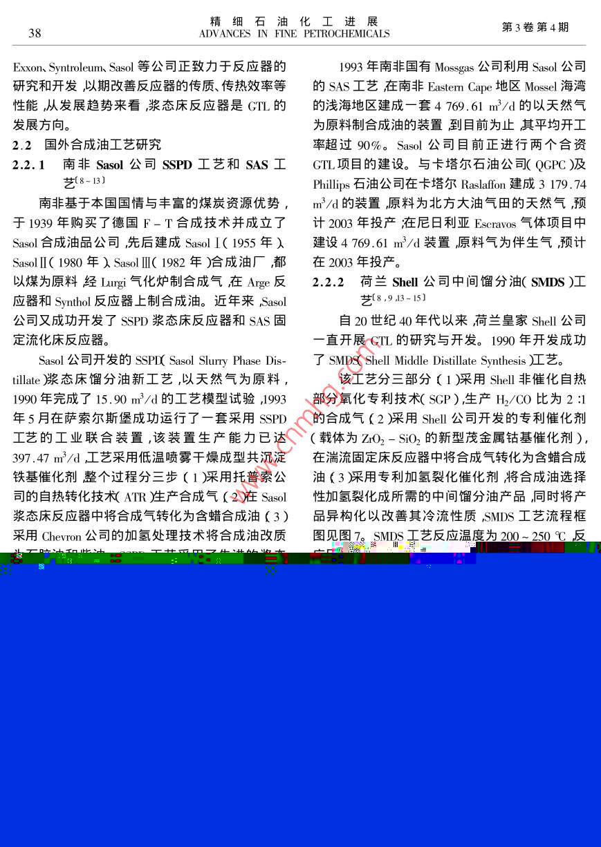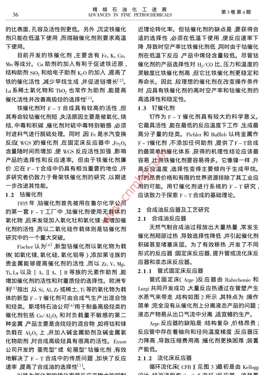 2002年4月遲克彬等.天然氣制合成油的技術(shù)進(jìn)展35天然氣制合成油的技術(shù)進(jìn)展遲克彬萬(wàn)書寶李方偉肖海成 金香蘭(大慶石化公司研究院大慶163714)楊兵(大慶石化總廠第七小學(xué),大慶163714)摘要天然氣制液態(tài)烴( GITL )是近年來(lái)天然氣轉(zhuǎn)化利用研究的主流,國(guó)外的Shel.Sasol Exxon、Syntroleum Wllians等公司都分別開發(fā)了各自的GTL專利技術(shù)。GTL產(chǎn)品基本上由直鏈烷烴、烯烴組成具有無(wú)硫、無(wú)氮、無(wú)金屬、無(wú)芳烴等特點(diǎn)是環(huán)境友好的油品和化學(xué)品。詳細(xì)綜述了合成油催化劑、反應(yīng)器、GIL技術(shù)發(fā)展動(dòng)態(tài)等討論了GIL的發(fā)展趨勢(shì)并對(duì)我國(guó)GIL的研究提出幾點(diǎn)建議。關(guān)鍵詞天然氣 合成油F-T合成 催化劑反應(yīng)器進(jìn)展建議隨著國(guó)際一次能源形勢(shì)的變化,作為世界消成油,已成為當(dāng)今世界各大公司爭(zhēng)相進(jìn)軍的目標(biāo)。費(fèi)量最大的一次能源石油,其地位將在不久將天然氣經(jīng)催化劑作用轉(zhuǎn)化為合成油的方法的將來(lái)被天然氣所替代。1850- -2100 年-次能源是1923年由德國(guó)科學(xué)家Frans Fischet和Hans相對(duì)消費(fèi)量情況和未來(lái)預(yù)測(cè)見圖1。從圖1可看Tropsch發(fā)明簡(jiǎn)稱F-T合成。1936 年首先在德出未來(lái)石油的短缺將是一種不可 改變的趨勢(shì)。國(guó)實(shí)現(xiàn)工業(yè)化到1945年為止共建了16套以煤基合成氣為原料的合成油裝置,總生產(chǎn)能力為13.6 Mt/a{1] 主要使用鈷-釷-硅藻土催化劑,80這些裝置在二戰(zhàn)后先后停產(chǎn)。煤炭天然氣近年來(lái)由于國(guó)際油品市場(chǎng)價(jià)格不斷發(fā)生變自50-化且天然氣生產(chǎn)的合成油無(wú)硫、無(wú)氮、無(wú)芳烴是-種清潔、優(yōu)質(zhì)的能源。-些大石油公司加快了基30-/石油合成油技術(shù)的開發(fā)進(jìn)程。某些國(guó)家基于國(guó)家能源0F0太陽(yáng)能安全戰(zhàn)略的考慮也加大經(jīng)費(fèi)投入。像Shell Sasol、1850 1900 1950 2000 2050 2100Mobil Exxon、 Syntroleum Williamns、Ctalytica等公司時(shí)間/年均開發(fā)了天然氣制合成油的新工藝。圖1一次能源相對(duì)消費(fèi)量和時(shí)間的關(guān)系1催化劑的研究世界天然氣探明儲(chǔ)量從1971年的50x 10121.1鐵催化劑m3增加到2000年底的149.38x 1012 m3 ,在近30用于F-T合成的鐵催化劑,可通過沉淀、燒年內(nèi)以每年3.31%的速度增長(zhǎng)在能源結(jié)構(gòu)組成結(jié)或熔融氧化物混合而制得。目前研究最多的是中其相對(duì)消費(fèi)量由10%增加到23.8%。預(yù)計(jì)沉淀鐵和熔鐵。沉淀鐵催化劑具有比表面大、孔2010- -2020 年間天然氣在能源結(jié)構(gòu)中的份額將超容大和活性高的特點(diǎn),而燒結(jié)催化劑具有比表面過煤炭和石油成為能源組成中的第一能源。小、孔容小(或沒有和活性低的特點(diǎn)熔融催化劑由于大部分已探明的天然氣處于邊遠(yuǎn)地區(qū),收稿日期2002-03-06。精細(xì)石油化工進(jìn)展第3卷第4期ADVANCES IN FINE PETROCHEMICALS的比表面、孔容及活性則更低。另外沉淀鐵催化近理論轉(zhuǎn)化率。但鈷催化劑的缺點(diǎn)是要獲得合劑只能在低溫下使用,而熔融催化劑則要求高溫適的選擇性,必須在低溫下使用使反應(yīng)速率下下使用。降導(dǎo)致時(shí)空產(chǎn)率比鐵催化劑低,同時(shí)由于鈷催化目前開發(fā)的鐵催化劑,主要含有Fe. K、Cu、劑在低溫下反應(yīng)產(chǎn)品中烯烴含量較低。盡管鈷Mn等成分。Cu助劑的加入有利于促進(jìn)鐵還原,催化劑的產(chǎn)品選擇性對(duì)H2/CO比、壓力和溫度的結(jié)構(gòu)助劑SiO2和給電子助劑K,0的加入,提高了靈敏度比鐵催化劑高,但它比鐵催化劑更穩(wěn)定和鐵的催化活性減少甲烷生成,并促進(jìn)鏈增長(zhǎng)(22。壽命長(zhǎng)。因此較理想的催化劑在改變操作條件La系稀土氧化物和ThO2也常作為助劑,能提高時(shí)應(yīng)具有鐵催化劑的高時(shí)空產(chǎn)率和鈷催化劑的催化活性并改善高級(jí)烴的選擇性3。高選擇性和穩(wěn)定性。鐵催化劑對(duì)F- T合成具有較高的活性,但1.3釕催化劑其壽命較鈷催化劑短失活原因主要是被氧化、燒釕作為F- T催化劑具有較大的科學(xué)意義。結(jié)、中毒和積碳,催化劑對(duì)硫中毒特別敏感必須它最具活性能在最低的反應(yīng)溫度下工作生成最對(duì)進(jìn)料氣進(jìn)行脫硫處理。同時(shí)因Fe是水汽變換高分子量的烴類。Pichler和Buffleb以純金屬作反應(yīng)( WGS )的催化劑,在固定床反應(yīng)器中,Fe;O4F- T催化劑,不添加任何助劑,提供了F- T合成含量隨時(shí)間而增加,使WGS反應(yīng)活性加強(qiáng),影響的最簡(jiǎn)單的催化體系,獲得的機(jī)理性結(jié)論應(yīng)該最產(chǎn)品的選擇性和反應(yīng)速率。但由于鐵催化劑廉容易,比用鐵催化劑要容易得多。它像鎳一樣升價(jià),它在F-T合成中仍具有相當(dāng)重要的地位,許高反應(yīng)溫度,選擇性變得主要傾向于生成甲烷。多研究者仍致力于骨架鐵催化劑的研究,以期進(jìn)釕的昂貴價(jià)格和有限的世界資源排除了其工業(yè)應(yīng)-步改進(jìn)其性能。用的可能。用釕催化劑進(jìn)行系統(tǒng)的F- T研究,1.2 鈷催化劑應(yīng)該致力于探索F - T合成的基礎(chǔ)理論。1935年鈷催化劑首先被用