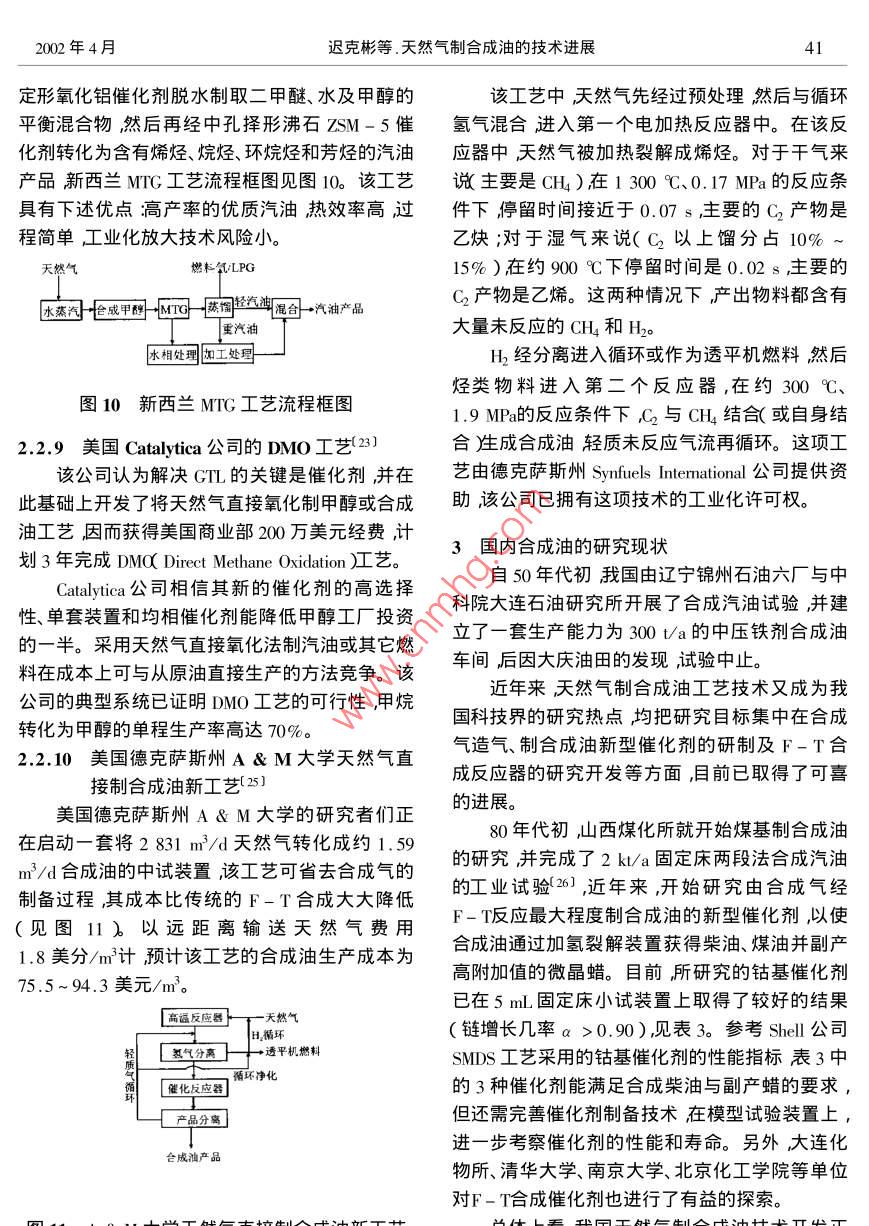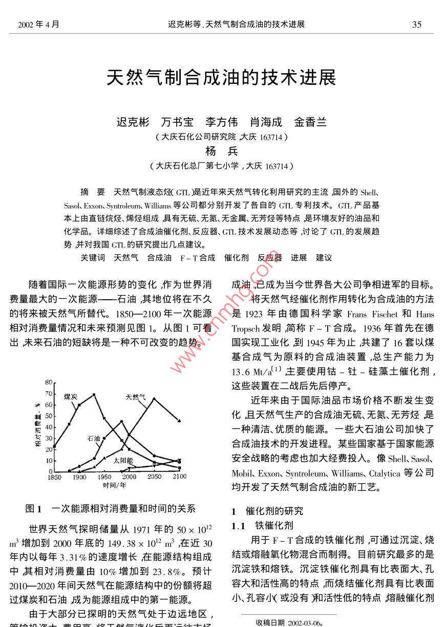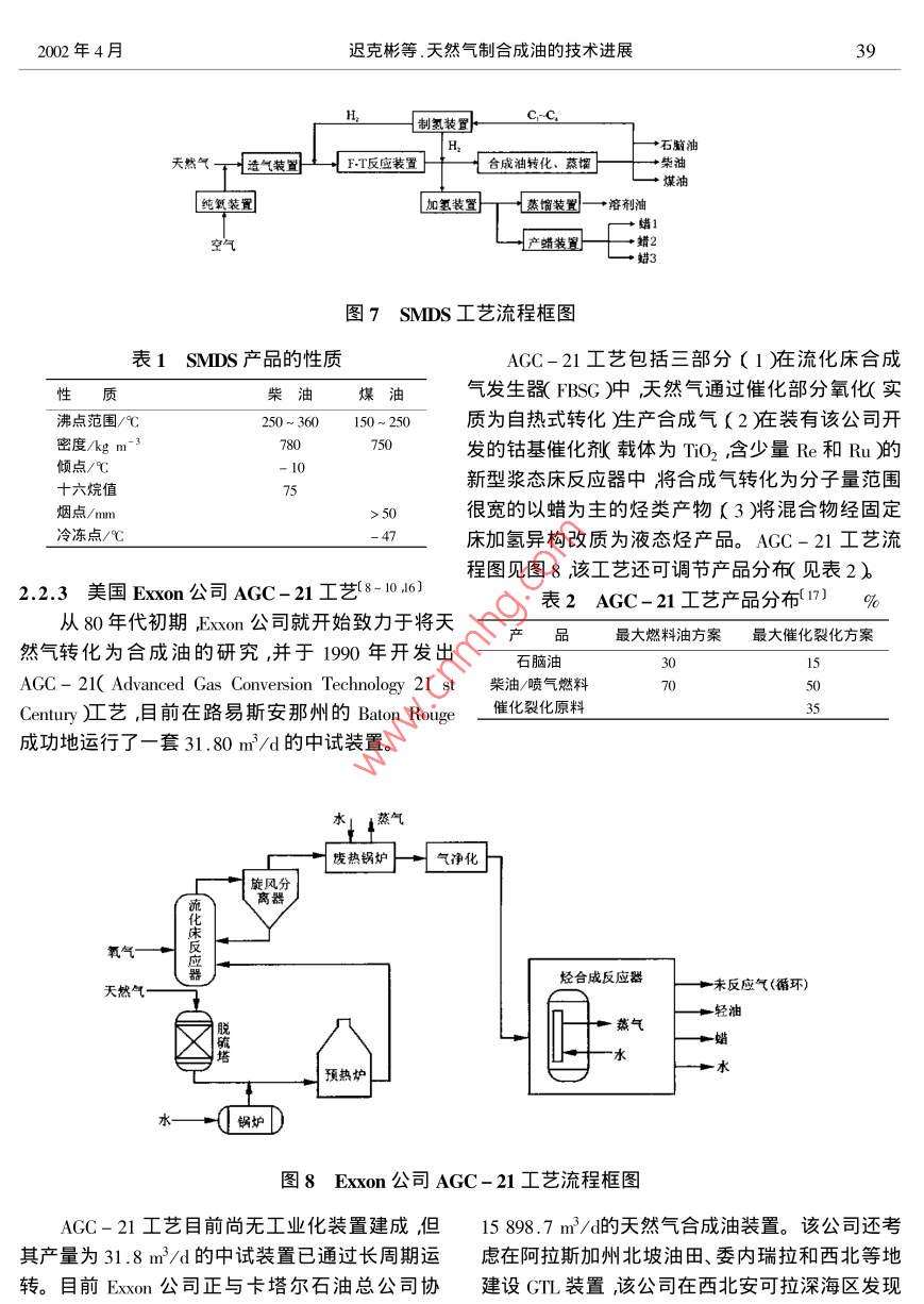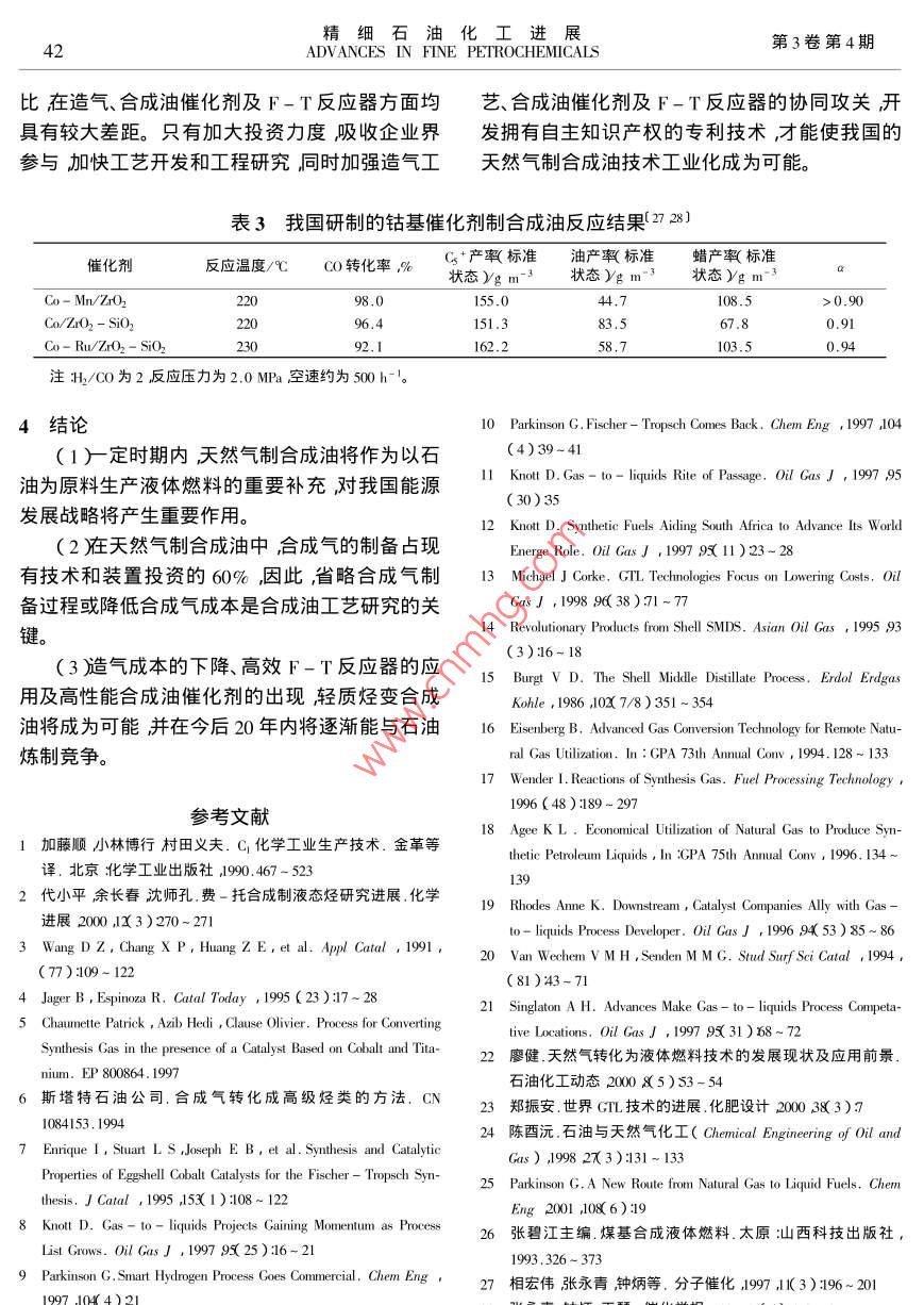 2002年4月遲克彬等.天然氣制合成油的技術(shù)進(jìn)展35天然氣制合成油的技術(shù)進(jìn)展遲克彬萬(wàn)書寶李方偉肖海成 金香蘭(大慶石化公司研究院大慶163714)楊兵(大慶石化總廠第七小學(xué),大慶163714)摘要天然氣制液態(tài)烴( GITL )是近年來(lái)天然氣轉(zhuǎn)化利用研究的主流,國(guó)外的Shel.Sasol Exxon、Syntroleum Wllians等公司都分別開發(fā)了各自的GTL專利技術(shù)。GTL產(chǎn)品基本上由直鏈烷烴、烯烴組成具有無(wú)硫、無(wú)氮、無(wú)金屬、無(wú)芳烴等特點(diǎn)是環(huán)境友好的油品和化學(xué)品。詳細(xì)綜述了合成油催化劑、反應(yīng)器、GIL技術(shù)發(fā)展動(dòng)態(tài)等討論了GIL的發(fā)展趨勢(shì)并對(duì)我國(guó)GIL的研究提出幾點(diǎn)建議。關(guān)鍵詞天然氣 合成油F-T合成 催化劑反應(yīng)器進(jìn)展建議隨著國(guó)際一次能源形勢(shì)的變化,作為世界消成油,已成為當(dāng)今世界各大公司爭(zhēng)相進(jìn)軍的目標(biāo)。費(fèi)量最大的一次能源石油,其地位將在不久將天然氣經(jīng)催化劑作用轉(zhuǎn)化為合成油的方法的將來(lái)被天然氣所替代。1850- -2100 年-次能源是1923年由德國(guó)科學(xué)家Frans Fischet和Hans相對(duì)消費(fèi)量情況和未來(lái)預(yù)測(cè)見圖1。從圖1可看Tropsch發(fā)明簡(jiǎn)稱F-T合成。1936 年首先在德出未來(lái)石油的短缺將是一種不可 改變的趨勢(shì)。國(guó)實(shí)現(xiàn)工業(yè)化到1945年為止共建了16套以煤基合成氣為原料的合成油裝置,總生產(chǎn)能力為13.6 Mt/a{1] 主要使用鈷-釷-硅藻土催化劑,80這些裝置在二戰(zhàn)后先后停產(chǎn)。煤炭天然氣近年來(lái)由于國(guó)際油品市場(chǎng)價(jià)格不斷發(fā)生變自50-化且天然氣生產(chǎn)的合成油無(wú)硫、無(wú)氮、無(wú)芳烴是-種清潔、優(yōu)質(zhì)的能源。-些大石油公司加快了基30-/石油合成油技術(shù)的開發(fā)進(jìn)程。某些國(guó)家基于國(guó)家能源0F0太陽(yáng)能安全戰(zhàn)略的考慮也加大經(jīng)費(fèi)投入。像Shell Sasol、1850 1900 1950 2000 2050 2100Mobil Exxon、 Syntroleum Williamns、Ctalytica等公司時(shí)間/年均開發(fā)了天然氣制合成油的新工藝。圖1一次能源相對(duì)消費(fèi)量和時(shí)間的關(guān)系1催化劑的研究世界天然氣探明儲(chǔ)量從1971年的50x 10121.1鐵催化劑m3增加到2000年底的149.38x 1012 m3 ,在近30用于F-T合成的鐵催化劑,可通過沉淀、燒年內(nèi)以每年3.31%的速度增長(zhǎng)在能源結(jié)構(gòu)組成結(jié)或熔融氧化物混合而制得。目前研究最多的是中其相對(duì)消費(fèi)量由10%增加到23.8%。預(yù)計(jì)沉淀鐵和熔鐵。沉淀鐵催化劑具有比表面大、孔2010- -2020 年間天然氣在能源結(jié)構(gòu)中的份額將超容大和活性高的特點(diǎn),而燒結(jié)催化劑具有比表面過煤炭和石油成為能源組成中的第一能源。小、孔容小(或沒有和活性低的特點(diǎn)熔融催化劑由于大部分已探明的天然氣處于邊遠(yuǎn)地區(qū),收稿日期2002-03-06。精細(xì)石油化工進(jìn)展第3卷第4期ADVANCES IN FINE PETROCHEMICALS的比表面、孔容及活性則更低。另外沉淀鐵催化近理論轉(zhuǎn)化率。但鈷催化劑的缺點(diǎn)是要獲得合劑只能在低溫下使用,而熔融催化劑則要求高溫適的選擇性,必須在低溫下使用使反應(yīng)速率下下使用。降導(dǎo)致時(shí)空產(chǎn)率比鐵催化劑低,同時(shí)由于鈷催化目前開發(fā)的鐵催化劑,主要含有Fe. K、Cu、劑在低溫下反應(yīng)產(chǎn)品中烯烴含量較低。盡管鈷Mn等成分。Cu助劑的加入有利于促進(jìn)鐵還原,催化劑的產(chǎn)品選擇性對(duì)H2/CO比、壓力和溫度的結(jié)構(gòu)助劑SiO2和給電子助劑K,0的加入,提高了靈敏度比鐵催化劑高,但它比鐵催化劑更穩(wěn)定和鐵的催化活性減少甲烷生成,并促進(jìn)鏈增長(zhǎng)(22。壽命長(zhǎng)。因此較理想的催化劑在改變操作條件La系稀土氧化物和ThO2也常作為助劑,能提高時(shí)應(yīng)具有鐵催化劑的高時(shí)空產(chǎn)率和鈷催化劑的催化活性并改善高級(jí)烴的選擇性3。高選擇性和穩(wěn)定性。鐵催化劑對(duì)F- T合成具有較高的活性,但1.3釕催化劑其壽命較鈷催化劑短失活原因主要是被氧化、燒釕作為F- T催化劑具有較大的科學(xué)意義。結(jié)、中毒和積碳,催化劑對(duì)硫中毒特別敏感必須它最具活性能在最低的反應(yīng)溫度下工作生成最對(duì)進(jìn)料氣進(jìn)行脫硫處理。同時(shí)因Fe是水汽變換高分子量的烴類。Pichler和Buffleb以純金屬作反應(yīng)( WGS )的催化劑,在固定床反應(yīng)器中,Fe;O4F- T催化劑,不添加任何助劑,提供了F- T合成含量隨時(shí)間而增加,使WGS反應(yīng)活性加強(qiáng),影響的最簡(jiǎn)單的催化體系,獲得的機(jī)理性結(jié)論應(yīng)該最產(chǎn)品的選擇性和反應(yīng)速率。但由于鐵催化劑廉容易,比用鐵催化劑要容易得多。它像鎳一樣升價(jià),它在F-T合成中仍具有相當(dāng)重要的地位,許高反應(yīng)溫度,選擇性變得主要傾向于生成甲烷。多研究者仍致力于骨架鐵催化劑的研究,以期進(jìn)釕的昂貴價(jià)格和有限的世界資源排除了其工業(yè)應(yīng)-步改進(jìn)其性能。用的可能。用釕催化劑進(jìn)行系統(tǒng)的F- T研究,1.2 鈷催化劑應(yīng)該致力于探索F - T合成的基礎(chǔ)理論。1935年鈷催化劑首先被用