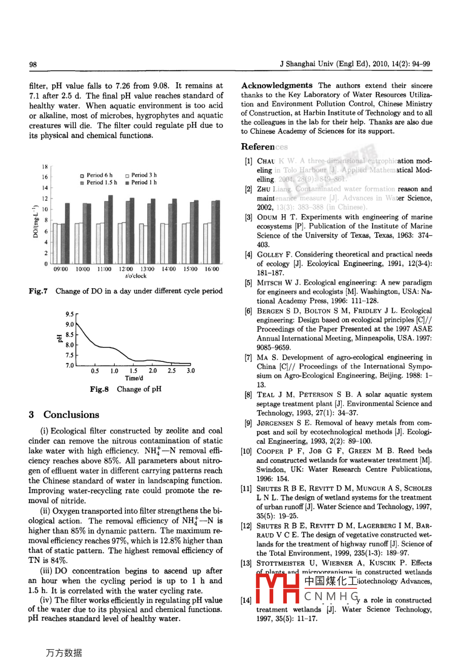 J Shanghai Univ (Eng! Ed), 2010, 14(2): 94-99Digital Object ldentifier(DOI): 10.1007/511741-010-0204-1Contaminations removal from static lake water by compoundLIU Shu-yu (劉書字)-2,,WU Ming-hong (吳明紅),MA Fang(馬放)2, 7Hang ie(張杰)2,GU Xiao-jing (顧曉婧)I1. School of Environmental and Chemical Engineering, Shanghai University, Shanghai 200444, P R. Ching2. School of Municipal and Environmental Engineering, Harbin Institute of Technology, Harbin 150090,P. R. China(Communicated by JIA0 Zheng)@Shanghai University and Springer-Verlag Berlin Heidelberg 2010Abstract Urban wastewater treatment techniques could not be applied to improre the polluiant semoral lliency, due toits characteristics of closed and quiescent conditions of the static lake water. In this study, natural zeolite and coal cinder werechosen as fller compounds of the ecological filter. Static and dynamic experiments were carried out to study the remediationefficiency. Experime'ntal data show that removal eficiency of ammonia nitrogen (NH- -N) reaches 85% in both static anddynamic patterns and its removal eficiency reaches 97% when the recycling period is 1 h in dynamic condition. The maximumremoval eficiency of nitrite nitrogen (NO2 - -N) reached 98%, and the removal eficiency of total nitrogen (TN) is a maximumof 84%. The final efuent concentration of total phosphorus (TP) is 0.079 mg/L. Efuent recyeling could improve the nutrient(N, P) removal fficiently. Dissolved oxygen (DO) concentration could remain high with the water cycling. The filter worksefficiently on regulating pH to the standard level of healthy water.Keywords bio-remediation, compound substrate, static waterIntroductionintegrative ecological engineering. These natural sys-terms are often referred as examples of green technologyContamination of static lakes and shallow rivers isbecause of the use of plants. The coining of the termi-mainly caused by eutrophication. It is evident that thenology“ecological engineering”is traced back to Odumdrastic increase in the frequency and occurrence of al-in the 1960s3). It is an integration of two distinctive sys-gae blooms in lakes and rivers. It may lead to desirabletems: ecological synthesis and engineering analysis4changes in the water quality and limit the usage of theEcological engineering is“the design of sustainablewater body with respect to water supply, fishing, aes-systems, consistent with self-design and other ecologicalthetics and recreation4l. Characters of static water inprinciples, which integrates human society with the nat-landscaping function are different from other water bod-ural environment for the both beneft"5-6. It has beenies. They include natural lake water, constructed lake,practiced since the mid-1980s in China and the 1990s inrivers and so on. In urbanized environment, these kindsNorth America and Europel7-9l.of water bodies are almost static and easy to be pollutedEcological filter includes several main forms, such asin short period. At present, currently sewage treatmentbiological filtering ditch and constructed wetland. Thetechnique could not be applied directly to control thisadvantages of these systems are their low constructionkind of contamination. In domestic wastewater treat-and operating costs. They are appropriate for treatingment techniques, machines and complicated crafts pro-both small and large water bodieslgl10]. Ecological filtercess could not be applied in static waterl2].has also been designed to treat urban runfl11-121. ItThere are mainly three methods for lake water treat-can be used to remedy lake water and surface water.ment: chemical, physical and biological methods. InThe mainly fller is gravel. It works mainly throughchemical preparation, CuSO4 is used to control the al-filtering. Using this method, the normal removal effi-gae in lake water, but high concentration is toxic tociency of total nitrogen (TN) is about 70% at present,aquicolous biology. Mechanical cleaning as a physicaland the process is slow. There are some important fac-method costs too much. Ecological flter is a kind oftors. Physical configuration and chemical property ofReceived Nov.14, 2009; Revised Jan.4, 2010Project supported by the National Natural Science Foundation of China中國煤化工,the Shanghai LeadingAcademic Discipline Project (Grant No.S30109), and the Systems BioYHC N M H Ganghai UniversityCorresponding author LIU Shu-yu, Ph D, E-mail: lsyu79@yahoo.com.cJ Shanghai Univ (Engl Ed), 2010, 14(2): 94-9995substrate connect closely with the remediation eficiencyfilter until the filter was full of water. It was allowedand sustainability. The design of the process is also im-to stand in the filter for 12 h, and then fAowed outportant, such as mode and speed of water flowing.Irfrom the system. In dynamic experiments, all the waterthis paper, traditional substrate is replaced by zeolitewas pumped through the system at different recyclingand coal cinder to build a new kind of filter. Efluent isspeeds, and the recycling period was 6,3, 1.5, 1 h, rerecycled in diferent period to remedy static water. Pu-spectively.rification speed and contaminations removal efficiency isalso studied.Water infoWater pipe,ClapboardZeolite in general is characterized by high specificZcolic- superstratum"surface areas and high cation exchange capacity (CEC)..Out- flowing inIts rigid three-dimensional structures make it free of theCind:shrink and swell behavior associated with smectite clays.Fig.1”Structure of the ecological filterFor these reasons, zeolite can offer superior sorptionand hydraulic properties and is used a8 molecular sievesIn static experiments, the filter mainly has two func-and sorbents in wastewater treatmentt13-141. Zeolite hastions. One is the absorption of the substrate due to itsbeen particularly useful in removing cationic specieslarge specific surface, the other is the biological action ofsuch as ammonium, and some heavy metals from water.the abundant microbes in the filter. In