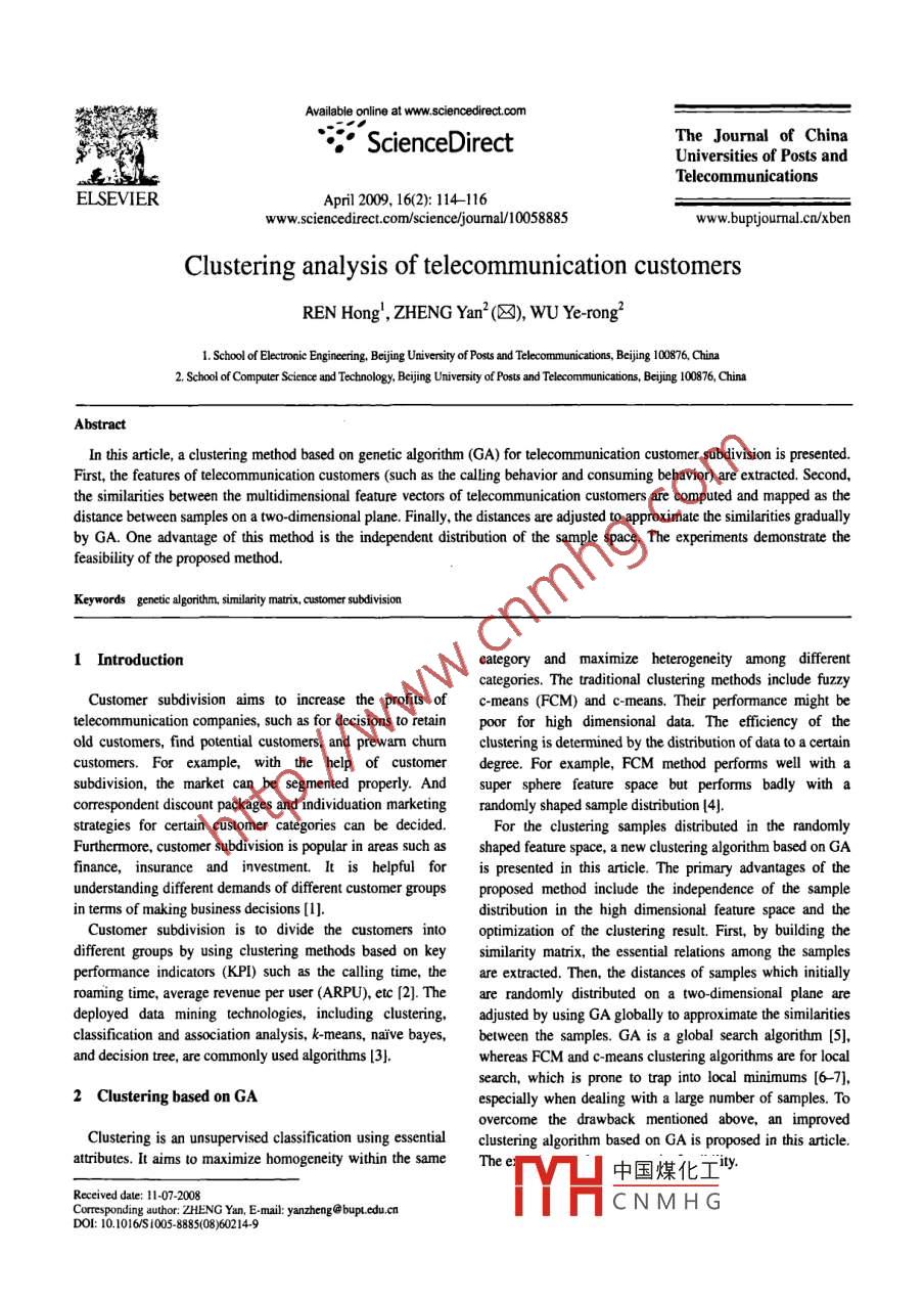 Available online at www.sciencedirect.comScienceDirectThe Jourmnal of ChinaUniversites of Posts andTelecommunicationsELSEVIERApril 2009, 16(2): 114-116www.sciencedirect.com/science/joumal/10058885www. buptjoumal.cn/xbenClustering analysis of telecommunication customersREN Hong', ZHENG Yan2 (8), WU Ye-rong21. School of Electronic Engineering, Beijing University of Poss and Telecommurications, Beijing 100876, China2. School of Computer Science and Technology, Bejing University of Posts and Telecommunications, Bejing 100876, ChinaAbstractIn this article, a clustering method based on genetic algorithm (GA) for telecommunication customer subdivision is presented.First, the features of telecommunication customers (such as the calling behavior and consuming behavior) are extracted. Second,the similarities between the multidimensional feature vectors of telecommunication customers are computed and mapped as thedistance between samples on a two-dimensional plane. Finally, the distances are adjusted to approximate the simiarities graduallyby GA. One advantage of this method is the independent distribution of the sample space. The experiments demonstrate thefeasibility of the proposed method,1 Introductioncategory and maximize heterogeneity among differentcategories. The traditional clustering methods include fuzzyCustomer subdivision aims to increase the profits ofc-means (FCM) and c-means. Their performance might betelecommunication companies, such as for decisions to retainpoor for high dimensional data. The efficiency of theold customers, find potential customers, and prewarn churnclustering is determined by the distribution of data to a certaincustomers. For example, with the help of customerdegree. For example, FCM method performs well wih asubdivision, the market can be segmented properly. Andsuper sphere feature space but performs badly with acorrespondent discount packages and individuation marketingrandomly shaped sample distribution [4]strategies for certain customer categories can be decided.For the clustering samples distributed in the randomlyFurthermore, customer subdivision is popular in areas such asshaped feature space, a new clustering algorithm based on GAfinance, insurance and investment. It is helpful foris presented in this article. The primary advantages of theunderstanding different demands of different customer groupsproposed method include the independence of the samplein terms of making business decisions [1].distribution in the high dimensional feature space and theCustomer subdivision is to divide the customers intooptimization of the clustering result. First, by building thedifferent groups by using clustering methods based on keysimilarity matrix, the essential relations among the samplesperformance indicators (KPI) such as the alling time, theare extracted. Then, the distances of samples which initallyroaming time, average revenue per user (ARPU), etc [2]. Theare randomly distributed on a two-dimensional plane aredeployed data mining technologies, including clustering,adjusted by using GA globally to approximate the simiaritiesclassifcation and association analysis, k means, naive bayes,between the samples. GA is a global search algorithm (5],and decision tree, are commonly used algorithms [3].whereas FCM and C means clustering algorithms are for localsearch, which is prone to trap into local minimums [6-7],2 Clustering based on GAespecially when dealing with a large number of samples. Toovercome the drawback mentioned above, an improvedClustering is an unsupervised classification using essentialclustering algorithm based on GA is proposed in this article.attributes. It aims to maximize homogeneity within the sameThe中國(guó)煤化工yCorresponding author: ZHENG Yan, E-mail: yanzheng@ bupl.cdu.cnRecceived date: 11-07-2008YHCNMHGDOI: 10.1016/S 005-8885(08)60214-9Issue 2REN Hong, et al.1 Clustering analysis of telecommunication customers1152.1 Similarity matrixE==2ZK-r|(7)2n同A similarity matrix measuring the similarities amongwhere心denotes the Euclidean distance between samples i andjsamples can be built by such methods as quantity product, thecosine, the max-min, and the arithmetic average methodson a twodimensional plane. The coordinates of the samples iandj[8 -9].are (a,b) i=2..n and (a,b,) j=2..n respectively,For the purpose of building a similarity marix, the samplesand心is defned as:must be normalized to the range of [0,1] in the preprocessingsteps. Suppose that the sample space X = 2x2..心=(a-a)*+(.-b)尸(8)Vx.∈X,the feature vector is x2(=x.2.....). 業(yè)The smaller the error value is, the more ft the sarmples are.The fitess function is defined as:denotes the kth atribute of the ith sample.A=-Zxuf=;E+a(9)newhere a=1 for not to make the value too higho.=品二x.-4)%(22.3 Clustering based on GAThus, the initial sample can be normalized as follows:The proposed clustering algorithm based on GA for名=(3)σtelecommunication customer subdivision is described asfollows:(4Step 1 Assign each feature vector of the telecommunicationcustomer a pair of the coordinate value (a,b) randomly onwhereand Xxink are the maximum and minimum valuesa two dimensional plane, where a,b∈[0,1] i= .2....of ......Step2 Compute the simiarities to form the marix (1.,).nThe similarity matix (r,)n。 is an nXn symmetricalusing Eqs. (1)-(6).matrix with 1 in the diagonal line [10]:Step 3 Construct the initial population. Each pair of thecoordinates is viewed as a gene and coded to an 8-bit binaryvalue. Then, all the n genes are linked into a chromosome (also(5called individual), the length of which is L=8n bits. Bydifferent orders, randomly create N chromosomes to form aninitial population S.Step 4 Compute the finess. Fist, compute the eror valuewhere denotes the sinilarity measurement between samples iof each individual using Eq. (7); then compute the ftness usingand j, commonly it is a nonnegative value. The closer or moreEq. (9).similar the samples i andj are, the greater the va