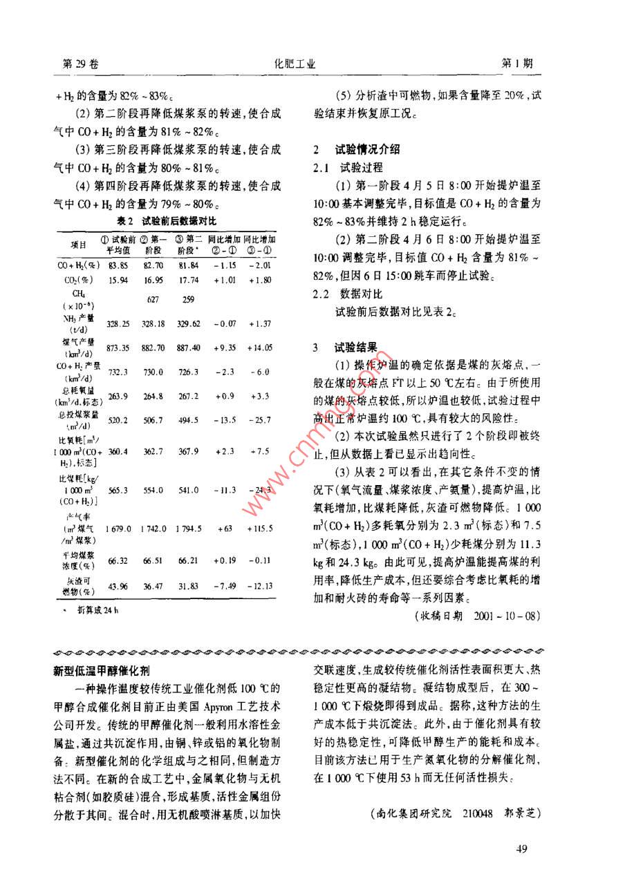 第29卷化肥工業(yè)第1期德士古氣化爐的提溫操作金剛張濤(山東省兗礦魯南化肥廠滕州277527)TQ44 B摘要通過更換煤種使生產(chǎn)消耗得到了大幅度降低,生產(chǎn)能力得到了較大的提高,但渣中可燃物較設(shè)計指標提高了2-3倍。為此進行了提高爐溫的試驗,考察渣中可燃物隨爐溫的變化關(guān)系。同時考核不同渣中可燃物含量下的氧耗和謀耗。關(guān)鍵詞德士古氣化爐 灰渣可燃物 操作溫度兗礦魯南化肥廠的德士古氣化裝置自1993本次試驗的主要日的是考察渣中可燃物隨爐年4月試車以來進行了較多的技術(shù)改造,生產(chǎn)能溫的變化關(guān)系.同時考核不同淹中可燃物含量下力由年產(chǎn)8萬t合成氨提高到年產(chǎn)10.71,生產(chǎn)用的氧耗、煤耗。煤由原來的單一“七五”煤發(fā)展成多礦點混煤、 隨1.2 試驗原則及注意事項著生產(chǎn)產(chǎn)量的提高使用煤種的增多,灰渣中可燃(1)本次試驗氧氣流量不變、壓力保持穩(wěn)定物含量也有所升高(表1)。分析其原因,認為操在(3.8+0.05)MPa,氧氣純度在99. 6%以上,通作爐溫過低是主要因素,因此在2000年4月進行過逐漸降低煤漿泵轉(zhuǎn)速以提高0/C值最終達到了提高爐溫的試驗工作:提溫之月的。表1不同煤種灰渣可燃物含 l(2)以合成氣中C0+ H2的百分含量每降低項目1993年 1994年 1995年 1996年 1998年1%為一個階段,每個階段穩(wěn)定運行24 h,每個價燦種七五+七i+北省+井段從8:00開始,氣體分析又增加廣9:00和11:00北宿北落陵: +落陵2次(原是每個雙點分析I次):從渣可(3)爐溫提升應緩慢,煤漿泵轉(zhuǎn)速應緩慢降燃物(2)10-15 15-20 15-202S30~45低。度(心)1450 1400 I 4001350 1 350(4)試驗時應嚴格監(jiān)視合成氣溫度(≤218C)、合成氣成份、支撐板溫度(≤25 C)、爐壁溫度(≤260 C)、甲烷含量、排渣情況等,在上述參1試驗方 案的制定數(shù)不出現(xiàn)異常時才能進行下一步的試驗,否則試本次系統(tǒng)運行從2000年3月11日開始,試驗終止驗時系統(tǒng)運行穩(wěn)定,各項指標已得到優(yōu)化,試驗結(jié)(5)儀表車間應保持在線甲烷表的準確性,果應是具有代表性的。并每天校驗1次:德士古氣化爐高溫熱電偶的使用壽命一般不(6)試驗期間灰渣取樣每班2次(原每班1超過1周。本次試驗選在非初始開車階段,熱電次),分別在接班后的第三<第六小時取樣;煤質(zhì)分偶已不能指示,只能以氣體成份為參考來標定爐析室分白班、中班隨時分析,分析結(jié)果及時上報至溫。盡管甲烷含量能較快地反映爐溫,但變化較相關(guān)部門???受系統(tǒng)其它因素影響較大。C0+ H的百分含(7)試驗期間操作人員應真實地記錄工藝參量隨爐溫的升高而降低,雖變化慢-些,但受其它數(shù),認真巡回檢查,氣化爐壁溫每2小時用紅外測因素干擾小,爐溫與C0+H2含量的對應關(guān)系較溫儀實測1次:為確定,再現(xiàn)性較好,所以選定以C0+H2的含量1.3試驗步驟標定爐溫。(1)從月前運行狀況開始(C0+ H2=83.85%),1.1 試驗月的逐步降低煤漿泵轉(zhuǎn)速,提高0/C值.使合成氣中0048第29卷化肥工業(yè)第1期+ H2的含量為82% ~ 83%。(5)分析渣中可燃物,如果含量降至20%,試(2)第二階段再降低煤漿泵的轉(zhuǎn)速,使臺成驗結(jié)束并恢復原工況。氣中CO+ H2的含量為81% ~ 82%。(3)第三階段再降低煤漿泵的轉(zhuǎn)速,使合成2試驗情況介紹氣中CO+ H的含量為80% ~ 81%。2.1試驗過程 .(4)第四階段再降低煤漿泵的轉(zhuǎn)速,使合成(1)第一階段4月5日8:00開始提爐溫至氣中C0+ H2的含量為79% ~ 80%。10:00基本調(diào)整完畢,目標值是C0+ H2的含量為表2試驗前后數(shù)據(jù)對比82%~83%并維持2h穩(wěn)定運行。①試驗前②第一③第二同比增加同比增加(2)第二階段4月6日8:00開始提爐溫至項目平均值階段階段° ②-① 3-①10:00調(diào)整完畢,目標值CO+ H2含量為81% ~C0+H(%) 83.8582.70 81.84-1.15 -2.0C02(%) 15.9416.95 17.74 +1.01 +1.8082%,但因6日15:00跳車而停止試驗。2.2數(shù)據(jù)對比6259(x10-%)試驗前后數(shù)據(jù)對比見表2cH產(chǎn)量328.25 328.18 329.62 -0.07 +1.37煤氣產(chǎn)量873.35 882.70 887.40 +9.35 +14.053試驗結(jié)果CO+H:產(chǎn)員(1)操作爐溫的確定依據(jù)是煤的灰熔點,一732.3730.0 726.3 -2.3 - 6.0(km'/d)般在煤的灰熔點FT以上50 C左右。由于所使用.總耗鋇國(km'/d.標態(tài))263.9264,8 267.2 +0.9 +3.3的煤的灰熔點較低,所以爐溫也較低,試驗過程中總投煤漿量520.2 506.7 494.5 -13.5 -25.7高出正常爐溫約100 C,具有較大的風險性。(n2/d)比氧耗[m2/(2)本次試驗雖然只進行了2個階段即被終I 00m(Co+ 360.4 362.7 367.9 +2.3 +7.5止,但從數(shù)據(jù)上看已顯示出趨向性。H:),標態(tài)](3)從表2可以看出,在其它條件不變的情比故耗[kg/1000m 565.3 554.0 541.0 -11.3 -24.3況下(氧氣流量、煤漿濃度、產(chǎn)氨量),提高爐溫,比.(CO+ H)]氧耗增加,比煤耗降低,灰渣可燃物降低。1 000 .江氣串(xr煤氣1679.0 1742.0 1794.5 +63 +11s.5m(CO+ H2)多耗氧分別為2.3 m?(標態(tài))和7.5/m2煤漿)m(標態(tài)),1 000 m2(CO+ H)少耗煤分別為11.3平均煤漿66.32 66.51 66.21 +0.19 -0.11kg和24.3kg。由此可見,提高爐溫能提高煤的利濃度(%)長渣可用率,降低生產(chǎn)成本,但還要綜合考慮比氧耗的增燃物(%)43.96 36.47 31.83 -7.49 -12.13加和耐火磚的壽命等-系列因素。,折算成24h(收稿日期2001- 10-08)新型低溫甲醇催化劑交聯(lián)速度,生成較傳統(tǒng)催化劑活性表面積更大、熱-種操作溫度較傳統(tǒng)工業(yè)催化劑低100C的穩(wěn)定性更高的凝結(jié)物