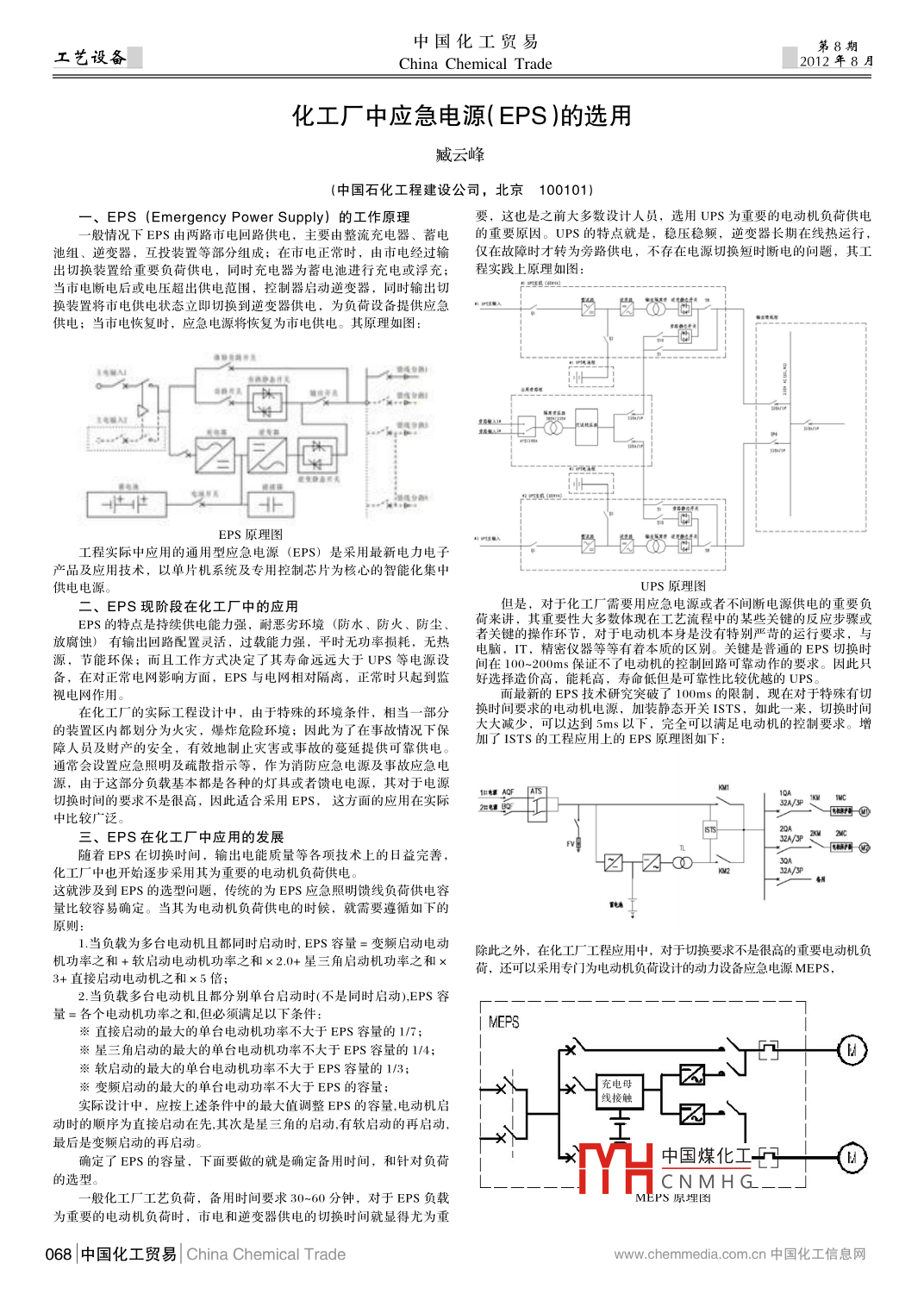中國化工貿易工藝設備China chemical trade2012年8月化工廠中應急電源(EPS)的選用臧云峰(中國石化工程建設公司,北京100101)EPS( Emergency Power Supply)的工作原理要,這也是之前大多數設計人員,選用UPS為重要的電動機負荷供電般情況下EPS由兩路市電回路供電,主要由整流充電器、蓄電的重要原因。UPS的特點就是,穩(wěn)壓穩(wěn)頻,逆變器長期在線熱運行池組、逆變器,互投裝置等部分組成;在市電正常時,由市電經過輸僅在故障時才轉為旁路供電,不存在電源切換短時斷電的問題,其工出切換裝置給重要負荷供電,同時充電器為蓄電池進行充電或浮充;程實踐上原理如圖:當市電斷電后或電壓超出供電范圍,控制器啟動逆變器,同時輸出切換裝置將市電供電狀態(tài)立即切換到逆變器供電,為負荷設備提供應急因”“供電;當市電恢復時,應急電源將恢復為市電供電。其原理如圖:電A圖低[]線分御EPS原理圖工程實際中應用的通用型應急電源(EPS)是采用最新電力電子產品及應用技術,以單片機系統及專用控制芯片為核心的智能化集中供電電源UPS原理圖、EPS現階段在化工廠中的應用但是,對于化工廠需要用應急電源或者不間斷電源供電的重要負ES的特點是持續(xù)供電能力強,耐惡劣環(huán)境(防水、防火、防塵、荷來講,其重要性大多數體現在工藝流程中的某些關鍵的反應步驟或放腐蝕)有輸出回路配置靈活,過載能力強,平時無功率損耗,無熱者關鍵的操作環(huán)節(jié),對于電動機本身是沒有特別嚴苛的運行要求,與電腦,TT,精密儀器等等有著本質的區(qū)別。關鍵是普通的EPS切換時源,節(jié)能環(huán)保;而且工作方式決定了其壽命遠遠大于UPS等電源設間在100-200ms保證不了電動機的控制回路可靠動作的要求。因此只備,在對正常電網影響方面,EPS與電網相對隔離,正常時只起到監(jiān)好選擇造價高,能耗高,壽命低但是可靠性比較優(yōu)越的UPS。視電網作用而最新的EPS技術研究突破了100ms的限制,現在對于特殊有切在化工廠的實際工程設計中,由于特殊的環(huán)境條件,相當一部分時間要求的電動機電源,加裝靜態(tài)開關ISTS,如此一來,切換時間的裝置區(qū)內都劃分為火災,爆炸危險環(huán)境;因此為了在事故情況下保大大減少,可以達到5m以下,完全可以滿足電動機的控制要求。增障人員及財產的安全,有效地制止災害或事故的蔓延提供可靠供電。EPS原理圖如下通常會設置應急照明及疏散指示等,作為消防應急電源及事故應急電原,由于這部分負載基本都是各種的燈具或者饋電電源,其對于電源切換時間的要求不是很高,因此適合采用EPS,這方面的應用在實際中比較廣泛L畫三、EPS在化工廠中應用的發(fā)展隨著EPS在切換時間,輸出電能質量等各項技術上的日益完善化工廠中也開始逐步采用其為重要的電動機負荷供電。這就涉及到EPS的選型問題,傳統的為EPS應急照明饋線負荷供電容量比較容易確定。當其為電動機負荷供電的時候,就需要遵循如下的原則1.當負載為多臺電動機且都同時啟動時,EPS容量=變頻啟動電動除此之外,在化工廠工程應用中,對于切換要求不是很高的重要電動機負機功率之和+軟啟動電動機功率之和×2.0+星三角啟動機功率之和荷,還可以采用專門為電動機負荷設計的動力設備應急電源MEP3+直接啟動電動機之和×5倍2當負載多臺電動機且都分別單臺啟動時(不是同時啟動)EPS容量=各個電動機功率之和但必須滿足以下條件※直接啟動的最大的單臺電動機功率不大于EPS容量的1/7;I MEPS※星三角啟動的最大的單臺電動機功率不大于EPS容量的1/4※軟啟動的最大的單臺電動機功率不大于EPS容量的1/3;※變頻啟動的最大的單臺電動功率不大于EPS的容量;實際設計中,應按上述條件中的最大值調整EPS的容量,電動機啟線接觸動時的順序為直接啟動在先其次是星三角的啟動有軟啟動的再啟動,最后是變頻啟動的再啟動確定了EPS的容量,下面要做的就是確定備用時間,和針對負荷中國煤化工的選型。CNMHG般化工廠工藝負荷,備用時間要求30~60分鐘,對于EPS負載S原理圖為重要的電動機負荷時,市電和逆變器供電的切換時間就顯得尤為重068中國化工貿易( China chemical tradeww. chemmedia. com. cn中國化工信息網第8期中國化工貿易2012年8月China chemical trade工藝設備淺析低溫甲醇洗裝置的優(yōu)化和改進馬凌宮延長石油榆林煤化有限公司合成車間,陜西榆林719000)摘要:隨著經濟技術的不斷發(fā)展,低溫甲醇洗技術的也不斷得到改善,且在煤化工行業(yè)中已得到了極為廣泛的運用。但由于其工藝流程較為的復雜,且控制點相對較多,在實際的運用過程中往往會發(fā)生氣體成分及溫度難以得到有效控制的問題,不利于裝置的平穩(wěn)運用。為了在后期的運用過程中讓低溫甲醇洗技術越來越完善,我們必須對低溫甲醇洗裝置進行優(yōu)化和改進。本文將結合筆者的實際經驗,對低溫甲酹洗技術的工芑流程及具體的優(yōu)化和改進措施進行研究,其實際情況如下關鍵詞:低溫甲醇洗煤化工優(yōu)化和改進前運用TIC16096對溫度進行控制。在實際的運行過程中,若塔底的甲通常情況下,甲醇對酸性氣體有著較強的溶解能力,如:CO2、醇含量發(fā)生變化時,必須對設定點進行優(yōu)化,將甲醇的含量控制在H2S及COS等。但甲醇對CO及H2等氣體的溶解能力相對較弱。低0.1%以下溫甲醇洗對酸性氣體進行吸收,甲醇的解析、再生及