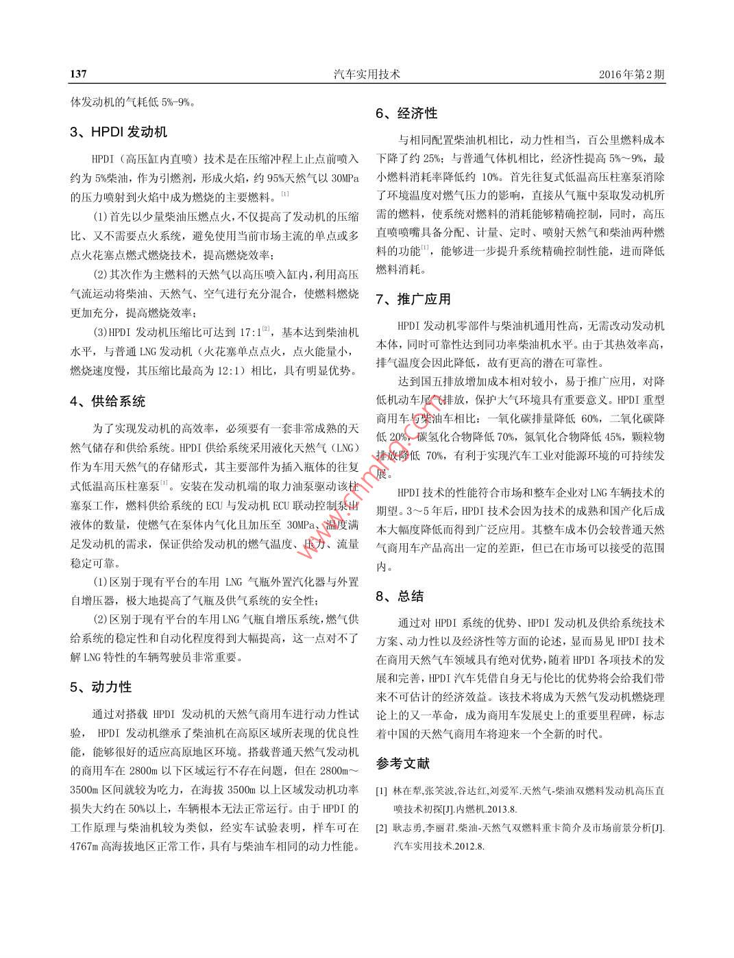車實(shí)用技術(shù)2016年第2期輕量化與節(jié)能AUTOMOBILE APPL IED TECHNOLOGY2016N0.210.16638/j.cnki.1671-7988.2016.02.047HPDI技術(shù)在天然氣商用車中的應(yīng)用王江鵬,馮凡,薛強(qiáng),金茜(陜西重型汽車有限公司,陜西西安710200摘要:論文對(duì)HPDI(高壓缸內(nèi)直噴)技術(shù)在天然氣商用車中的應(yīng)用進(jìn)行了分析研究,對(duì)其市場(chǎng)前景進(jìn)行簡(jiǎn)要分析,并從HPDI系統(tǒng)的技術(shù)優(yōu)勢(shì)、發(fā)動(dòng)機(jī)控制技術(shù)方案、供氣系統(tǒng)技術(shù)方案、動(dòng)力性及經(jīng)濟(jì)性研究五個(gè)方面進(jìn)行了具體的闡述。研究表明HPDI技術(shù)在天然氣商用車上應(yīng)用具有無與倫比的優(yōu)勢(shì),發(fā)展前景廣闊。關(guān)鍵詞:HPD(高壓缸內(nèi)直噴);天然氣;商用車;動(dòng)力性;經(jīng)濟(jì)性中圖分類號(hào):U4696文獻(xiàn)標(biāo)識(shí)碼:A文章編號(hào):1671-7988(2016)02-136-02Application of HPDI on NG commercial vehiclesWang Jiangpeng, Feng Fan, Xue Qiang, Jin QianShaanxi Heavy-duty truck Co, Ltd, Shaanxi Xi an 710200)Abstract: This paper focuses on the analysis and study of HPDI(High Pressure Direct Injection) applications onNG(Natural Gas)commercial vehicles and analysis of its market outlook. This paper also expounds HPDI technology in 5aspects, which are HPDI's advantages, engine control architecture, gas supply system, performances and fuel economy, etcThis study shows that HPDI application on NG commercial vehicles has great advantages and bright futuresKeywords: HPDI(High Pressure Direct Injection); Natural Gas; Commercial Vehicles; Performances; Fuel EconomyCLC NO. U4696 Document Code: A Article ID: 1671-7988(2016)02-136-02統(tǒng)可靠性等固有特性影響,在較高海拔地區(qū)無法正常運(yùn)行。引言并且如果功率進(jìn)一步提升,會(huì)面臨燃料經(jīng)濟(jì)性下降、冷卻系受宏觀經(jīng)濟(jì)影響,在柴油價(jià)格上漲,運(yùn)輸行業(yè)運(yùn)價(jià)低迷,統(tǒng)可靠性下降、點(diǎn)火系統(tǒng)可靠性下降等問題。而建立在新平客戶用車成本增加、盈利空間下降的大環(huán)境下。天然氣商用臺(tái)之上的HPDI(高壓缸內(nèi)直噴)技術(shù)很好的突破了現(xiàn)有技術(shù)車以降低運(yùn)營(yíng)成本、創(chuàng)造更大的利潤(rùn)為主要突破口,很好的及平臺(tái)束縛,能夠滿足市場(chǎng)對(duì)更廣泛地區(qū)適用性、更大功率滿足了客戶需求,得到了廣泛的應(yīng)用。天然氣發(fā)動(dòng)機(jī)的需求。1、現(xiàn)狀2、HPD|技術(shù)優(yōu)勢(shì)目前的天然氣發(fā)動(dòng)機(jī)控制以燃?xì)忸A(yù)混合技術(shù)為平臺(tái),壓當(dāng)前,市場(chǎng)上占主流的天然氣發(fā)動(dòng)機(jī),無論是單點(diǎn)電噴縮比為11.6:1,無論是美國(guó) woodword控制系統(tǒng),還是日本還是多點(diǎn)電噴,采用的都是與汽油機(jī)相似的火花塞點(diǎn)燃式燃E- control控制系統(tǒng),以及澳大利亞的AEC控制系統(tǒng)基本均燒技術(shù),這類天然氣發(fā)動(dòng)機(jī)使用成本比柴油機(jī)節(jié)約不少,但為此平臺(tái)技術(shù),差別僅是可靠性、控制精確性、功能多樣性其節(jié)約的成本主要來源于天然氣與柴油的價(jià)格差。但熱效率不同。而隨著天然氣配套設(shè)施的日趨完善,國(guó)際燃油價(jià)格的低于柴油發(fā)動(dòng)機(jī),如此一來,搭載氣體機(jī)的大功率商用車輛日益高漲,天然氣重型商用車產(chǎn)品市場(chǎng)進(jìn)一步急劇擴(kuò)大,市在起步和重載行駛時(shí),勢(shì)必?zé)o法達(dá)到像柴油車一樣的高效率場(chǎng)對(duì)天然氣產(chǎn)品的個(gè)性化要求也進(jìn)一步具體和細(xì)化。以燃?xì)膺\(yùn)行。而HDI發(fā)動(dòng)機(jī)的運(yùn)行方式跟柴油機(jī)十分相似,高壓直預(yù)混合技術(shù)為平臺(tái)的天然氣商用車因受制于壓縮比、點(diǎn)火系噴噴嘴也是根據(jù)柴油高壓共軌噴射發(fā)動(dòng)機(jī)的形式來設(shè)計(jì),因此,它的功率和扭矩達(dá)到了同排量柴油機(jī)的水平,比點(diǎn)燃式作者簡(jiǎn)介:王江鵬,就職于陜西重型汽車有限公司氣體發(fā)動(dòng)機(jī)高出20%;其熱效率與柴油機(jī)相同,比點(diǎn)燃式氣137汽車實(shí)用技術(shù)2016年第2期體發(fā)動(dòng)機(jī)的氣耗低5%-9%。6、經(jīng)濟(jì)性3、HPD|發(fā)動(dòng)機(jī)與相同配置柴油機(jī)相比,動(dòng)力性相當(dāng),百公里燃料成本HPDI(高壓缸內(nèi)直噴)技術(shù)是在壓縮沖程上止點(diǎn)前噴入下降了約25%;與普通氣體機(jī)相比,經(jīng)濟(jì)性提高5%~9%,最約為5%柴油,作為引燃劑,形成火焰,約95%天然氣以30Pa小燃料消耗率降低約10%。首先往復(fù)式低溫高壓柱塞泵消除的壓力噴射到火焰中成為燃燒的主要燃料。了環(huán)境溫度對(duì)燃?xì)鈮毫Φ挠绊?直接從氣瓶中泵取發(fā)動(dòng)機(jī)所(1)首先以少量柴油壓燃點(diǎn)火,不僅提高了發(fā)動(dòng)機(jī)的壓縮需的燃料,使系統(tǒng)對(duì)燃料的消耗能夠精確控制,同時(shí),高壓比、又不需要點(diǎn)火系統(tǒng),避免使用當(dāng)前市場(chǎng)主流的單點(diǎn)或多直噴噴嘴具備分配、計(jì)量、定時(shí)、噴射天然氣和柴油兩種燃點(diǎn)火花塞點(diǎn)燃式燃燒技術(shù),提高燃燒效率料的功能,能夠進(jìn)一步提升系統(tǒng)精確控制性能,進(jìn)而降低(2)其次作為主燃料的天然氣以高壓噴入缸內(nèi),利用高壓然料消耗。氣