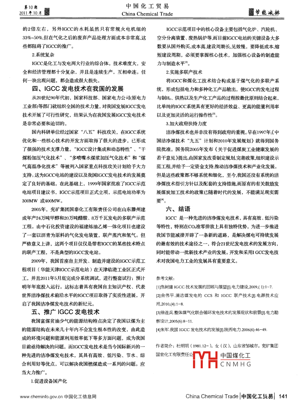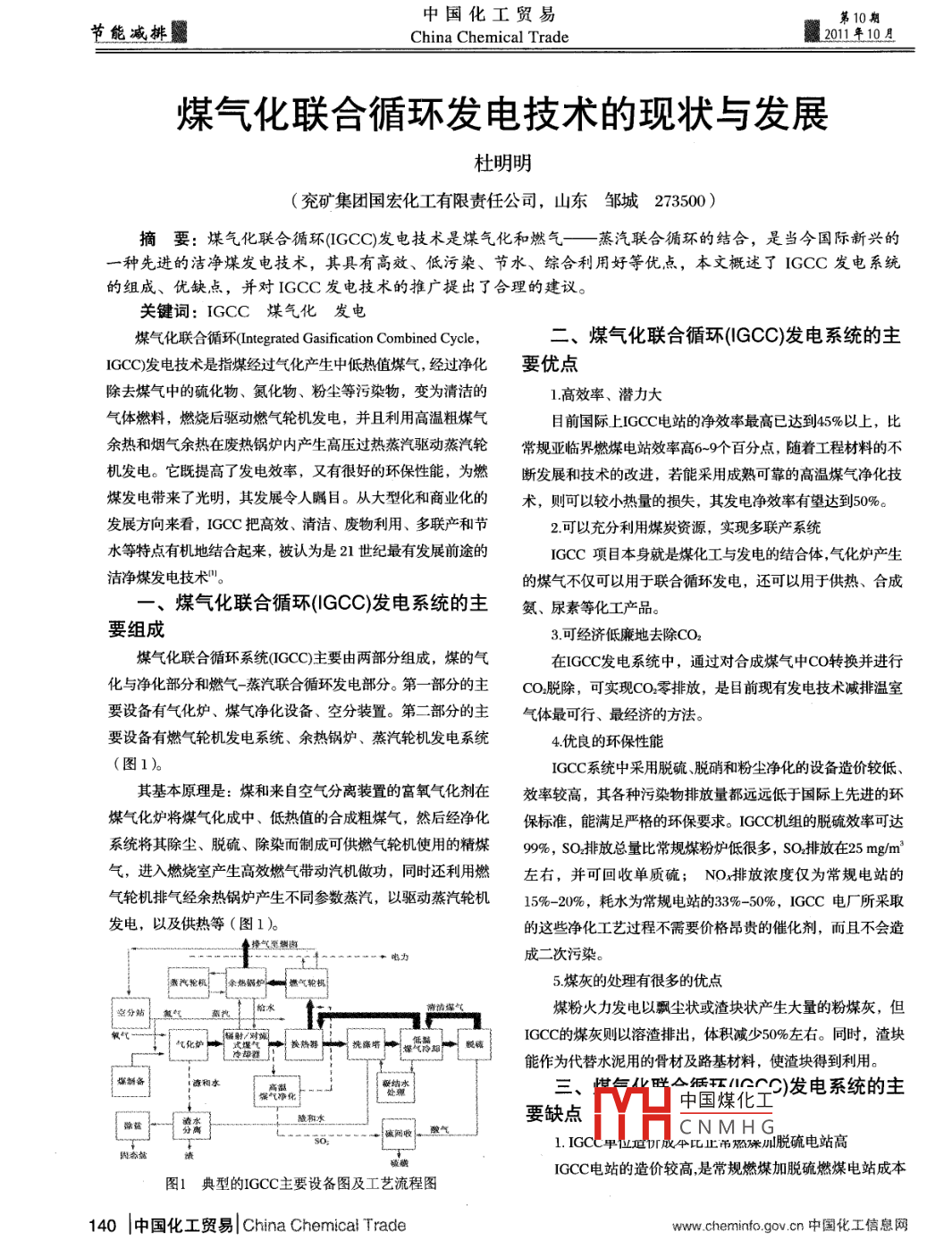 中國(guó)化工貿(mào)易第10期節(jié)能減排China Chemical Trade2011年10月煤氣化聯(lián)合循環(huán)發(fā)電技術(shù)的現(xiàn)狀與發(fā)展杜明明(兗礦集團(tuán)國(guó)宏化工有限責(zé)任公司,山東鄒城273500 )摘要: 煤氣化聯(lián)合循環(huán)(IGCC)發(fā)電技術(shù)是煤氣化和燃?xì)庖徽羝?lián)合 循環(huán)的結(jié)合,是當(dāng)今國(guó)際新興的一種先進(jìn)的潔凈煤發(fā)電技術(shù),其具有高效、低污染、節(jié)水、綜合利用好等優(yōu)點(diǎn),本文概述了IGCC發(fā)電系統(tǒng)的組成、優(yōu)缺點(diǎn),并對(duì)IGCC發(fā)電技術(shù)的推廣提出了合理的建議。關(guān)鍵詞: IGCC煤氣化發(fā)電煤氣化聯(lián)合循環(huán)(Integrated Gasification Combined Cycle,二、煤氣化聯(lián)合循環(huán)(IGCC)發(fā)電系統(tǒng)的主IGCC)發(fā)電技術(shù)是指煤經(jīng)過(guò)氣化產(chǎn)生中低熱值煤氣,經(jīng)過(guò)凈化要優(yōu)點(diǎn)除去煤氣中的硫化物、氮化物、粉塵等污染物,變?yōu)榍鍧嵉?.高效率、潛力大氣體燃料,燃燒后驅(qū)動(dòng)燃?xì)廨啓C(jī)發(fā)電,并且利用高溫粗煤氣目前國(guó)際上:IGCC電站的凈效率最高已達(dá)到45%以上,比余熱和煙氣余熱在廢熱鍋爐內(nèi)產(chǎn)生高壓過(guò)熱蒸汽驅(qū)動(dòng)蒸汽輪常規(guī)亞臨界燃煤電站效率高6~ 9個(gè)百分點(diǎn),隨著工程材料的不機(jī)發(fā)電。它既提高了發(fā)電效率,又有很好的環(huán)保性能,為燃斷發(fā)展和技術(shù)的改進(jìn),若能采用成熟可靠的高溫煤氣凈化技煤發(fā)電帶來(lái)了光明,其發(fā)展令人矚目。從大型化和商業(yè)化的術(shù),則可以較小熱量的損失,其發(fā)電凈效率有望達(dá)到50%。發(fā)展方向來(lái)看,IGCC把高效、清潔、廢物利用、多聯(lián)產(chǎn)和節(jié)2.可以充分利用煤炭資源,實(shí)現(xiàn)多聯(lián)產(chǎn)系統(tǒng)水等特點(diǎn)有機(jī)地結(jié)合起來(lái),被認(rèn)為是21世紀(jì)最有發(fā)展前途的IGCC項(xiàng)目本身就是煤化工與發(fā)電的結(jié)合體,氣化爐產(chǎn)生潔凈煤發(fā)電技術(shù)"。的煤氣不僅可以用于聯(lián)合循環(huán)發(fā)電,還可以用于供熱、合成一、煤氣化聯(lián)合循環(huán)(IGCC)發(fā)電系統(tǒng)的主氨、尿素等化工產(chǎn)品。要組成3.可經(jīng)濟(jì)低廉地去除CO2煤氣化聯(lián)合循環(huán)系統(tǒng)(CGC)主要由兩部分組成,煤的氣在IGCC發(fā)電系統(tǒng)中,通過(guò)對(duì)合成煤氣中CO轉(zhuǎn)換并進(jìn)行化與凈化部分和燃?xì)庹羝?lián)合循環(huán)發(fā)電部分。第-部分的主CO.脫除,可實(shí)現(xiàn)CO2零排放,是目前現(xiàn)有發(fā)電技術(shù)減排溫室要設(shè)備有氣化爐、煤氣凈化設(shè)備、空分裝置。第二部分的主氣體最可行、最經(jīng)濟(jì)的方法。要設(shè)備有燃?xì)廨啓C(jī)發(fā)電系統(tǒng)、余熱鍋爐、蒸汽輪機(jī)發(fā)電系統(tǒng)4.優(yōu)良的環(huán)保性能(圖1)。IGCC系統(tǒng)中采用脫硫脫硝和粉塵凈化的設(shè)備造價(jià)較低、其基本原理是:煤和來(lái)自空氣分離裝置的富氧氣化劑在效率較高,其各種污染物排放量都遠(yuǎn)遠(yuǎn)低于國(guó)際上先進(jìn)的環(huán)煤氣化爐將煤氣化成中、低熱值的合成粗煤氣,然后經(jīng)凈化保標(biāo)準(zhǔn),能滿足嚴(yán)格的環(huán)保要求。IGCC機(jī)組的脫硫效率可達(dá)系統(tǒng)將其除塵、脫硫、除染而制成可供燃?xì)廨啓C(jī)使用的精煤99%,SO排放總量比常規(guī)煤粉爐低很多, SO排放在25 mg/m'氣,進(jìn)入燃燒室產(chǎn)生高效燃?xì)鈳?dòng)汽機(jī)做功,同時(shí)還利用燃左右,并可回收單質(zhì)硫; NO,排 放濃度僅為常規(guī)電站的氣輪機(jī)排氣經(jīng)余熱鍋爐產(chǎn)生不同參數(shù)蒸汽,以驅(qū)動(dòng)蒸汽輪機(jī)15%- -20%,耗水為常規(guī)電站的33% -50%,IGCC 電廠所采取發(fā)電,以及供熱等(圖1)。的這些凈化工藝過(guò)程不需要價(jià)格昂貴的催化劑,而不會(huì)造成二次污染。德汽輪機(jī)余燃鍋爐 燃?xì)廨啓C(jī)5.煤灰的處理有很多的優(yōu)點(diǎn)當(dāng)分站氣. ...熟汽煤粉火力發(fā)電以飄塵狀或渣塊狀產(chǎn)生大量的粉煤灰,但----IGCC的煤灰則以溶渣排出,體積減少50%左右。同時(shí),渣塊氣化能作為代替水泥用的骨材及路基材料,使渣塊得到利用。煤辦備「奇相水三、煤氣化聯(lián)▲低環(huán)0)發(fā)電系統(tǒng)的主I 能氣化要缺點(diǎn)中國(guó)煤化工CNM HG1. IGCC甲位延「成牛比止吊燃保加脫硫電站高因態(tài)站hIGCC電站的造價(jià)較高,是常規(guī)燃煤加脫硫燃煤電站成本圖1典型的IGCC主要 設(shè)備圖及工藝流程圖140 |中國(guó)化工貿(mào)易| China Chemical Tradewww. cheminfo.gov .cn中國(guó)化工信息網(wǎng)第10期中國(guó)化工貿(mào)易2011年10月China Chemical Trade節(jié)能減排的2倍左右,另外IGCC的水耗雖然只有常規(guī)火電機(jī)組的IGCC示范項(xiàng)目中的核心設(shè)備主要包括氣化爐、汽輪機(jī)、33%- 50%,但在氣化之后的廢棄產(chǎn)品處理方面成本非常高,這空分分離裝置、廢熱鍋爐等,而目前IGCC電站的關(guān)鍵設(shè)備大多些都阻礙了IGCC的推廣。數(shù)要從國(guó)外購(gòu)買(mǎi),成本高,建設(shè)周期長(zhǎng),見(jiàn)效慢。要降低成本,縮2.系統(tǒng)復(fù)雜短建設(shè)周期,必須要掌握核心技術(shù),加強(qiáng)核心設(shè)備的