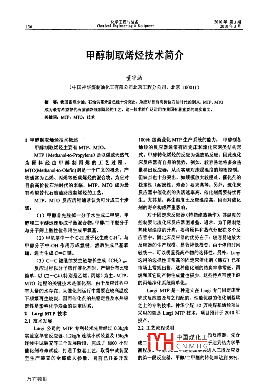 化學工程與裝備年第Chenical Engineering Equipment甲醇制取烯烴技術(shù)簡介董宇涵(中國神華煤制油化工有限公司北京工程分公司,北京100011)摘要:我國富煤少油,石油供需矛盾己經(jīng)十分突出,為應對目前高價位石油時代的到來,MTP、MTO成為最有希望替代石腦油路線制烯烴的工藝,這一技術(shù)的廣泛運用在我國有著重要的現(xiàn)實意義關鍵詞:MIP;MTO;技術(shù)1甲醇制取烯烴技術(shù)概述100h級商業(yè)化MTP生產(chǎn)系統(tǒng)的能力,甲醇制備甲醇制取烯烴主要有MTP、MTO烯烴的反應器通常有固定床和流化床兩類結(jié)構(gòu)形MTP( Methanol- o-Propylene)是以煤或天然氣式.甲醇轉(zhuǎn)化烯烴的反應為強放熱反應,因此流化為原料經(jīng)由甲醇制丙烯的工藝過程,床反應器有自身的優(yōu)勢,例如,較容易地將多余熱MTO(Methanol- o-Olefin)則是一個廣義的概念,產(chǎn)量移出反應器,從而實現(xiàn)對床層溫度的均衡控制物通常為乙烯、丙烯等低碳烯烴的混合物。為應對但缺點也十分突出,如規(guī)模放大較困難、催化劑的目前高價位石油時代的來臨,MTP、MTO成為最穩(wěn)定性(耐磨性、壽命)要求高等。另外,流化床有希望替代石腦油路線制烯烴的工藝反應器中催化劑的失活速率高,催化劑需要持續(xù)再MTP、MTo反應歷程通常認為可分成三個步生。尤其是,再生溫度比反應溫度高,因而對催化驟:劑的壽命構(gòu)成嚴重影響(1)甲醇首先脫掉一分子水生成二甲醚,甲對于固定床反應器(特指絕熱操作),其溫度的醇和二甲醚迅速形成平衡混合物甲醇/二甲醚分子控制要比流化床反應器困難些,通常,為了限制絕與分子篩上酸性位作用生成甲氧基熱床層溫度的升高,要將原料和蒸汽分配在多個反(2)甲氧基中一個CH質(zhì)子化生成CH,與應管中。固定床反應器的優(yōu)勢在于:較容易地放大甲醇分子中OH作用形成氫鍵,然后生成已基氧反應器的生產(chǎn)規(guī)模、顯著降低投資,由于停留時間飴,進而生成C=C鍵。較統(tǒng)一,可以明顯提高產(chǎn)物的選擇性。另外, Lurgi(3)C=C鍵繼續(xù)發(fā)生鏈增長生成(CH2)選用的選擇性非常高的固定床催化劑(沸石)已在反應過程以分子篩作催化劑時,產(chǎn)物分布比較市場上常規(guī)出售,這種催化劑的結(jié)炭率非常低,丙簡單,以C2~C4〔特別是乙烯、丙烯)為主,MTP、烷和其它副產(chǎn)物生成量也極少,這些特點可使下游MTO過程的關鍵技術(shù)是催化劑,由于反應過程中的丙烯凈化系統(tǒng)簡單化。有大量的水存在,且催化劑運行中需要在較高溫度Lurgi MTP是一種建立在Lugi專門固定床管下頻繁再生燒炭,因而催化劑的熱穩(wěn)定性及水熱穩(wěn)殼式反應器及與之相配的、性能優(yōu)越的催化劑基礎定性是影響化學壽命的決定因素。之上的專利技術(shù)。神華寧煤52萬噸煤基烯烴項目2 Lurgi MTP技術(shù)采用的就是 Lurgi MTP技術(shù),項目預計于2010年21技術(shù)發(fā)展投產(chǎn)。Lugi公司的MTP專利技術(shù)先后經(jīng)過03kgh2.2工藝流程說明實驗室單管反應器、1,kgh連續(xù)小試裝置及l(fā)5kgh中國煤化工預反應器,先合連續(xù)中試裝置等三個發(fā)展階段,完成了8000小時成二催化劑壽命試驗,打通了整套工藝,取得中試裝置衡程度。CNMHG達到熱力學平切訓買進入三段反應器至生產(chǎn)裝置的全部放大參數(shù),目前已具備開發(fā)的第一段反應器,甲醇/二甲醚的轉(zhuǎn)化率達到9%,薰宇涵:甲醇制取烯烴技術(shù)簡介丙烯是主要的產(chǎn)物。出第一段反應器的物流依次進級反應速率為250mm3催化劑秒入第二、三段輔助反應器。段與段之間注入冷的甲3.2工藝流程說明醇/水/二甲醚物流,目的在于控制床層溫度、優(yōu)化MTO工藝包括低碳烯烴制備和乙烯、丙烯回收反應條件、獲得最大的丙烯收率。反應終產(chǎn)物經(jīng)冷兩部分。甲醇轉(zhuǎn)化采用流化床反應器和高性能催化卻后,將氣相、液相有機物和水分離。劑,甲醇轉(zhuǎn)化率達100%,低碳烯烴選擇性超過85%,氣相產(chǎn)物脫除水、CO2和二甲醚后將其進一步原料選擇范圍較寬,水含量最高可達20%(重量)精餾制備成聚合級丙烯。副產(chǎn)物烯烴(乙烯、丁烯(1)低碳烯烴制備工序主要由原料氣化、甲返回系統(tǒng)再循環(huán),作為歧化制備丙烯的附加原料。醇轉(zhuǎn)化、催化劑再生等部分組成為避免情性組分在回路中富集,輕組份燃料氣排出原料粗甲醇與產(chǎn)物廢水換熱,然后進入閃蒸系統(tǒng),LPG、高辛烷值(RON987MON855)汽油塔,部分轉(zhuǎn)變成氣相,未蒸發(fā)的液相原料富含水等是該反應的主要副產(chǎn)物。部分合成水也循環(huán)返回系沸點較高的雜質(zhì),該液相物流入氧化物回收塔,回統(tǒng)用來產(chǎn)生不可或缺的反應用蒸汽,其余合成水經(jīng)收殘余甲醇后送污水處理系統(tǒng),殘余甲醇則返還閃過適當?shù)奶幚砜捎糜谵r(nóng)業(yè)灌溉。蒸塔。MTP過程中,操作壓力03Mpa~0.16Mpa出閃蒸塔的氣相原料入換熱器進一步升溫為蒸汽添加量為05kg/kg(甲醇)~1.0kg/kg(甲醇),反過熱蒸汽后入流化床反應器發(fā)生反應,并副產(chǎn)中壓應器進口溫度400℃~450℃蒸汽。反應后產(chǎn)物入冷卻塔降溫至沸點以下,將產(chǎn)經(jīng)過500小時~700小時的連續(xù)操作后,催化物水冷凝,因反應過程中有少量醋酸生成需向冷卻劑需要再生,時間約63小時左右。再生的方式是塔加適量燒堿使產(chǎn)物呈中性。通入定比
