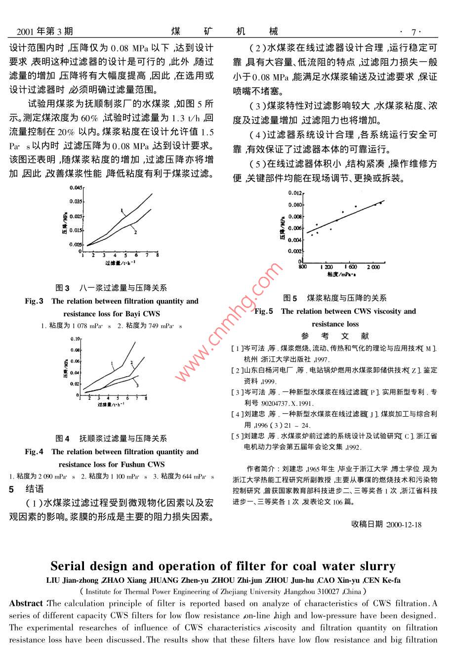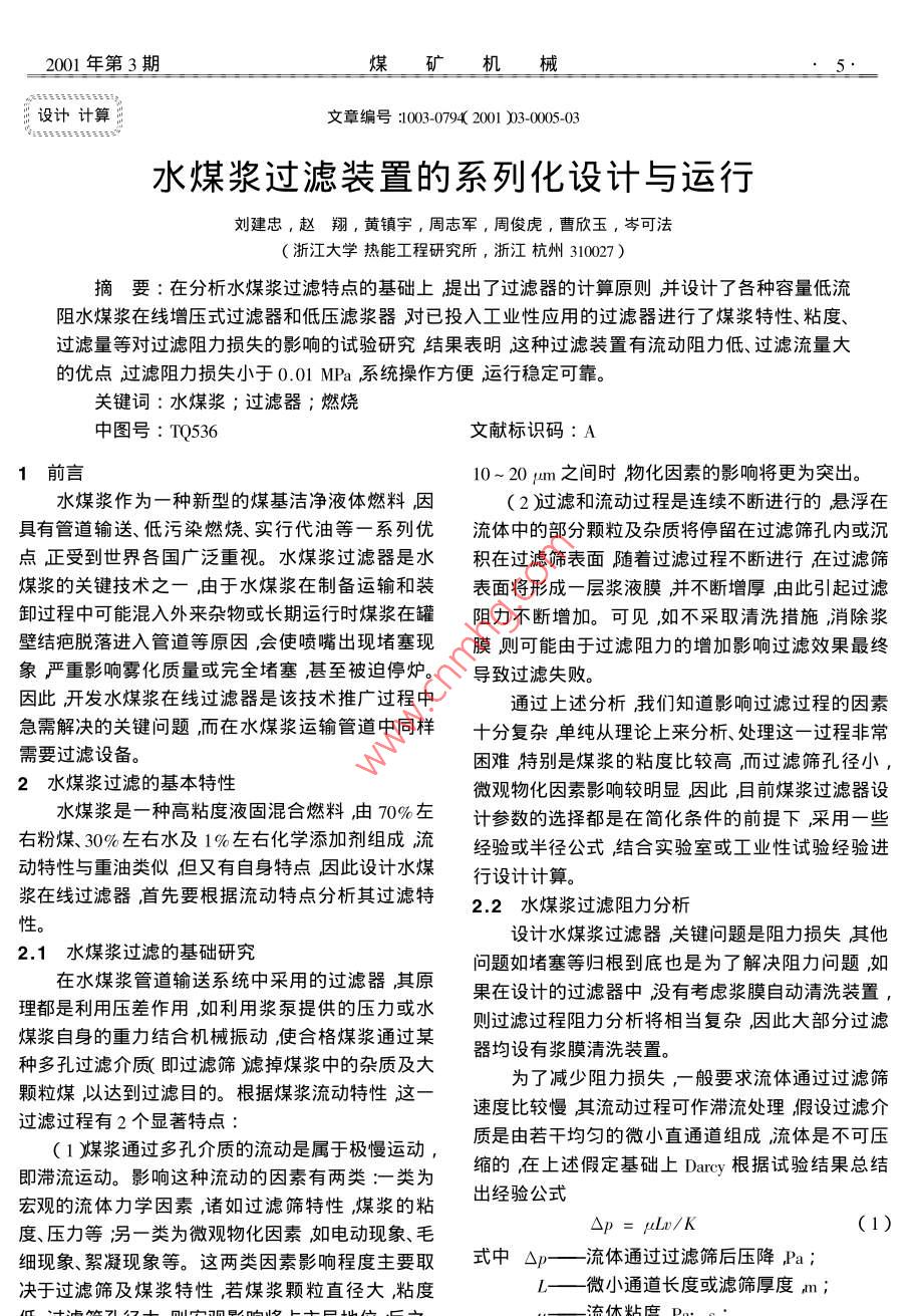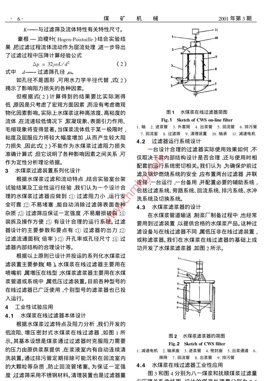 2001年第3期煤礦機械設(shè)計計算文章編號:1003-0794(2001)3-0005-03水煤漿過濾裝置的系列化設(shè)計與運行劉建忠,趙翔,黃鎮(zhèn)宇,周志軍,周俊虎,曹欣玉,岑可法浙江大學(xué)熱能工程研究所,浙江杭州310027)摘要:在分析水煤漿過濾特點的基礎(chǔ)上提岀了過濾器的計算原則并設(shè)計了各種容量低流阻水煤漿在線増壓式過濾器和低壓濾漿器對已投入工業(yè)性應(yīng)用旳過濾器進行了煤漿特性、粘度、過濾量等對過濾阻力損失的影響的試驗研究結(jié)果表明這種過濾裝置有流動阻力低、過濾流量大的優(yōu)點過濾阻力損失小于0.01MPa系統(tǒng)操作方便運行穩(wěn)定可靠。關(guān)鍵詞:水煤漿;過濾器;燃燒中圖號:TQ536文獻標(biāo)識碼:A1前言10~20m之間時物化因素的影響將更為突出。水煤漿作為一種新型的煤基潔凈液體燃料因(2過濾和流動過程是連續(xù)不斷進行的懸浮在具有管道輸送、低污染燃燒、實行代油等一系列優(yōu)流體中的部分顆粒及雜質(zhì)將停留在過濾篩孔內(nèi)或況點正受到世界各國廣泛重視。水煤漿過濾器是水積在過濾篩表面隨著過濾過程不斷進行在過濾篩煤漿的關(guān)鍵技術(shù)之一由于水煤漿在制備運輸和裝表面將形成一層漿液膜并不斷增厚由此引起過濾卸過程中可能混入外來雜物或長期運行時煤漿在罐阻力不斷增加??梢?如不采取清洗措施消除漿壁結(jié)疤脫落進入管道等原因會使噴嘴岀現(xiàn)堵塞現(xiàn)膜則可能由于過濾阻力的增加影響過濾效果最終象嚴(yán)重影響霧化質(zhì)量或完全堵塞甚至被迫停爐。導(dǎo)致過濾失敗。因此開發(fā)水煤漿在線過濾器是該技術(shù)推廣過程中通過上述分析我們知道影響過濾過程的因素急需解決的關(guān)鍵問題而在水煤漿運輸管道中同樣分復(fù)雜單純從理論上來分析、處理這一過程非常需要過濾設(shè)備困難特別是煤漿的粘度比較高而過濾篩孔徑小2水煤漿過濾的基本特性微觀物化因素影響較明顯因此目前煤漿過濾器設(shè)水煤漿是一種高粘度液固混合燃料由70%左計參數(shù)的選擇都是在簡化條件的前提下采用一些右粉煤、30%左右水及1%左右化學(xué)添加劑組成流經(jīng)驗或半徑公式結(jié)合實驗室或工業(yè)性試驗經(jīng)驗進動特性與重油類似但又有自身特點因此設(shè)計水煤行設(shè)計計算。漿在線過濾器首先要根據(jù)流動特點分析其過濾特2.2水煤漿過濾阻力分析性設(shè)計水煤漿過濾器關(guān)鍵問題是阻力損失其他2.1水煤漿過濾的基礎(chǔ)研究問題如堵塞等歸根到底也是為了解決阻力問題如在水煤漿管道輸送系統(tǒng)中采用的過濾器其原果在設(shè)計的過濾器中沒有考慮漿膜自動清洗裝置理都是利用壓差作用,如利用漿泵提供的壓力或水則過濾過程阻力分析將相當(dāng)復(fù)雜因此大部分過濾煤漿自身的重力結(jié)合機械振動使合格煤漿通過某種多孔過濾介質(zhì)即過濾篩掉煤漿中的雜質(zhì)及大器均設(shè)有漿膜清洗裝置。為了減少阻力損失,一般要求流體通過過濾篩顆粒爆以達到過濾目的。根據(jù)煤漿流動特性這一速度比較慢其流動過程可作滯流處理假設(shè)過濾介過濾過程有2個顯著特點質(zhì)是由若干均勻的微小直通道組成流體是不可壓1煤某漿通過多孔介質(zhì)的流動是屬于極慢運動,縮的在上述假定基礎(chǔ)上Dary根據(jù)試驗結(jié)果總結(jié)即滯流運動。影響這種流動的因素有兩類:一類為宏觀的流體力學(xué)因素諸如過濾篩特性煤漿的粘出經(jīng)驗公式度、壓力等渦一類為微觀物化因素如電動現(xiàn)象、毛Lu/K(1)細現(xiàn)象絮凝現(xiàn)象等。這兩類因素影響程度主要取式中△p—流體通過過濾篩后壓降Pa1決于過濾篩及煤漿特性,若煤漿顆粒直徑大粘度L——微小通道長度或濾篩厚度m2001年第3期K——與過濾篩及流體特性有關(guān)特性尺寸。豪根一泊稷葉 Hogen- Poiseuille)結(jié)合實驗結(jié)果把過濾過程流體流動作為層流處理進一步導(dǎo)出了過濾過程中壓降計算經(jīng)驗公式式中d——過濾篩孔徑m如孔徑不是圓形,可用水力學(xué)半徑代替,式(2)揭示了影響阻力損失的各種因素。但根據(jù)式(2)計算得到的結(jié)果要比實際測得低原因是只考慮了宏觀方面因素而沒有考慮微觀物化因素影響。實際上水煤漿這種高濃度、高粘度的圖1水煤漿在線過濾器簡圖流體在流速較低情況下絮凝現(xiàn)象、表面引力作用、Fig 1 Sketch of CwS on-line filter毛細現(xiàn)象將變得顯著。當(dāng)煤漿流體低于某一極限時,1軸2,進漿管3.外套筒4出漿管回流管6排污管粘度及屈服應(yīng)力將較大幅度增加從而產(chǎn)生較大阻4.2過濾器運行系統(tǒng)設(shè)計力損失因此式(2)不能作為水煤漿過濾阻力損失準(zhǔn)確計算式但它說明了各種影響因素之間關(guān)系可臺設(shè)計合理的過濾器實際使用效果如何,不僅取決于其內(nèi)部結(jié)構(gòu)設(shè)計是否合理還與使用時相作為定性分析理論依據(jù)。配套的運行系統(tǒng)密切相關(guān)。我們認(rèn)為為確保爐前過3水煤漿過濾裝置系列化設(shè)計濾及鍋爐燃燒系統(tǒng)的安全應(yīng)布置兩臺過濾器并聯(lián)根據(jù)水煤漿過濾和流動特點結(jié)合實驗室臺架連接,一臺運行,臺備用并配置必要的輔助系統(tǒng)試驗結(jié)果及工業(yè)性運行經(jīng)驗我們認(rèn)為一個設(shè)計合