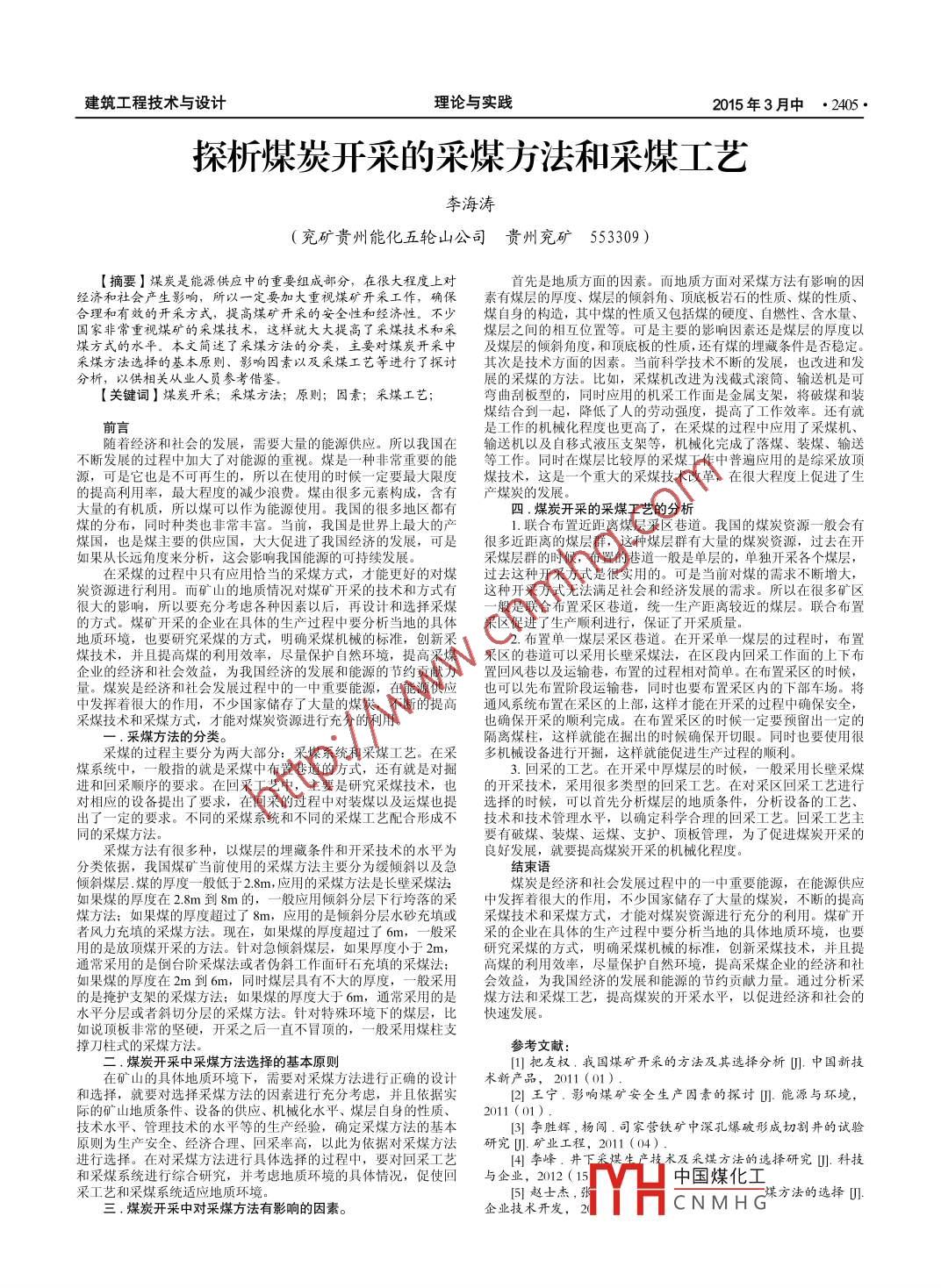 建筑工程技術與設計理論與實踐2015年3月中·2405·探析煤炭開采的采煤方法和采煤工藝李海濤(兗礦貴州能化五輪山公司貴州兗礦55309)【摘要】煤炭是能源供應中的重要組成部分,在很大程度上對首先是地質(zhì)方面的因素。而地質(zhì)方面對采煤方法有影響的因經(jīng)濟和社會產(chǎn)生影響,所以一定要加大重視煤礦開采工作,確保素有煤層的厚度、煤層的傾斜角、頂?shù)装鍘r石的性質(zhì)、煤的性質(zhì)合理和有效的開采方式,提高煤礦開采的安全性和經(jīng)濟性。不少煤自身的構造,其中煤的性質(zhì)又包括煤的硬度、自燃性、含水量囯家非常重視煤礦的采煤技術,這樣就大大提高了采煤技術和采煤層之間的相互位置等??墒侵饕挠绊懸蛩剡€是煤層的厚度以煤方式的水平。本文簡述了采煤方法的分類,主要對煤炭開采中及煤層的傾斜角度,和頂?shù)装宓男再|(zhì),還有煤的埋藏條件是否穩(wěn)定。采煤方法選擇的基本原則、影響因素以及采煤工藝等進行了探討其次是技術方面的因素。當前科學技術不斷的發(fā)展,也改進和發(fā)分析,以供相關從業(yè)人員參考借鑒展的采煤的方法。比如,采煤機改進為淺截式滾筒、輸送機是可【關鍵詞】煤炭開采;采煤方法;原則;因素;采煤工藝彎曲刮板型的,同時應用的機采工作面是金屬支架,將破煤和裝煤結(jié)合到一起,降低了人的勞動強度,提高了工作效率。還有就前言是工作的機械化程度也更高了,在采煤的過程中應用了采煤機、隨著經(jīng)濟和社會的發(fā)展,需要大量的能源供應。所以我國在輸送機以及自移式液壓支架等,機槭化完成了落煤、裝煤、輸送不斷發(fā)展的過程中加大了對能源的重視。煤是一種非常重要的能等工作。同時在煤層比較厚的采煤工作中普遍應用的是綜采放頂源,可是它也是不可再生的,所以在使用的時候一定要最大限度煤技術,這是一個重大的采煤技術改革,在很大程度上促進了生的提高利用率,最大程度的減少浪費。煤由很多元素構成,含有產(chǎn)煤炭的發(fā)展大量的有機質(zhì),所以煤可以作為能源使用。我國的很多地區(qū)都有四.煤炭開采的采煤工藝的分析煤的分布,同時種類也非常豐富。當前,我國是世界上最大的1.聯(lián)合布置近距離煤層采區(qū)巷道。我國的煤炭資源一般會有煤國,也是煤主要的倛應國,大大促進了我國經(jīng)濟的發(fā)展,可是很多近距離的煤層群,這種煤層群有大量的煤炭資源,過去在開如果從長遠角度來分析,這會影響我國能源的可持續(xù)發(fā)展采煤層群的時候,布置的巷道一般是單層的,單獨開采各個煤層,在采煤的過程中只有應用恰當?shù)牟擅悍绞?才能更好的對煤過去這種開采方式是很實用的。可是當前對煤的需求不斷增大炭資源進行利用。而礦山的地質(zhì)情況對煤礦開采的技術和方式有這種開采方式無法滿足社會和經(jīng)濟發(fā)展的需求。所以在很多礦區(qū)很大的影響,所以要充分考慮各種因素以后,再設計和選擇釆煤一般是聯(lián)合布置采區(qū)巷道,統(tǒng)一生產(chǎn)距離較近的煤層。聯(lián)合布置的方式。煤礦開采的企業(yè)在具體的生產(chǎn)過程中要分析當?shù)氐木唧w采區(qū)促進了生產(chǎn)順利進行,保證了開采質(zhì)量地質(zhì)環(huán)境,也要研究采煤的方式,明確采煤機械的標準,創(chuàng)新采2.布置單一煤層采區(qū)巷道。在開采單一煤層的過程時,布置煤技術,并且提高煤的利用效率,盡量保護自然環(huán)境,提髙采煤采區(qū)的巷道可以采用長壁采煤法,在區(qū)段內(nèi)回采工作面的上下布企業(yè)的經(jīng)濟和社會效益,為我國經(jīng)濟的發(fā)展和能源的節(jié)約貢獻力置回風巷以及運輸巷,布置的過程相對簡單。在布置采區(qū)的時候量。煤炭是經(jīng)濟和社會發(fā)展過程中的一中重要能源,在能源供應也可以先布置階段運輸巷,同時也要布置采區(qū)內(nèi)的下部車場。將中發(fā)揮著很大的作用,不少國家儲存了大量的煤炭,不斷的提高通風系統(tǒng)布置在采區(qū)的上部,這樣才能在開采的過程中確保安全釆煤技術和采煤方式,才能對煤炭資源進行充分的利用也確保開采的順利完成。在布置采區(qū)的時候一定要預留出一定的采煤方法的分類隔離煤柱,這樣就能在掘出的時候確保開切眼。同時也要使用很采煤的過程主要分為兩大部分:采煤系統(tǒng)和采煤工藝。在采多機械設備進行開掘,這樣就能促進生產(chǎn)過程的順利煤系統(tǒng)中,一般指的就是采煤中布置巷道的方式,還有就是對掘3.回采的工藝。在開采中厚煤層的時候,一般采用長壁采煤進和回采順序的要求。在回采工藝中,主要是研究采煤技術,也的開采技術,采用很多類型的回采工藝。在對采區(qū)回采工藝進行對相應的設備提出了要求,在回采的過程中對裝煤以及運煤也提選擇的時候,可以首先分析煤層的地質(zhì)條件,分析設備的工藝、出了一定的要求。不同的采煤系統(tǒng)和不同的采煤工藝配合形成不技術和技術管理水平,以確定科學合理的回采工藝。回采工藝主同的采煤方法要有破煤、裝煤、運煤、支護、頂板管理,為了促進煤炭開采的釆煤方法有很多種,以煤層的埋藏條件和開采技術的水平為良好發(fā)展,就要提高煤炭開采的機械化程度。分類依據(jù),我國煤礦當前使用的采煤方法主要分為緩傾斜以及急結(ji