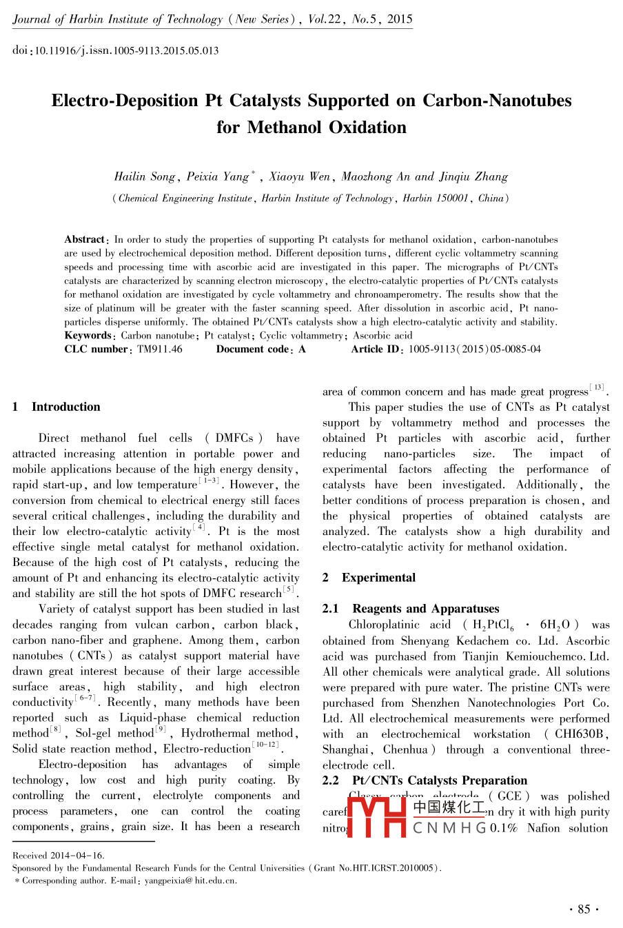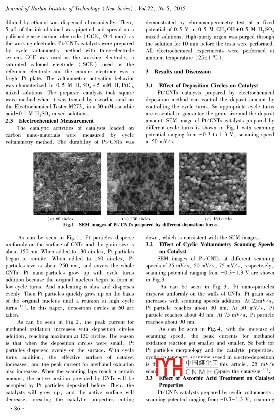 Journal of Harbin Institute of Technology ( New Series),Vol.22, No.5, 2015doi:10.11916/j.issn. 1005-91 13.2015.05.013Electro-Deposition Pt Catalysts Supported on Carbon- Nanotubesfor Methanol OxidationHaili Song, Peixia Yang *,Xiaoyu Wen, Maozhong An and Jinqiuu Zhang( Chemical Engineering Instiute, Harbin Instiute of Technology, Harbin 150001, China)A bstract: In order to study the properties of supporting Pt catalysts for methanol oxidation, carbon-nanotubesare used by electrochemical deposition method. Different deposition turns, different cyclic voltammetry scanningspeeds and processing time with ascorbic acid are investigated in this paper. The micrographs of PV/CNTscatalysts are characterized by scanning electron microscopy,the electro-catalytic properties of PV/CNTs catalystsfor methanol oxidation are investigated by cycle voltammetry and chronoamperometry. The results show that thesize of platinum will be greater with the faster scanning speed. After dissolution in ascorbic acid, Pt nano-particles disperse uniformly. The obtained Pv/ CNTs catalysts show a high electro-catalytic activity and stability.Keywords: Carbon nanotube; Pt catalyst ; Cyclic voltammetry; Ascorbic acidCLC number: TM911.46Document code: AArticle ID: 1005-9113(2015)05-0085-04area of common concerm and has made great progress”。1 IntroductionThis paper studies the use of CNTs as Pt catalystsupport by voltammetry method and processes theDirect methanol fuel cells ( DMFCs ) haveobtained Pt particles with ascorbic acid, furtherattracted increasing attention in portable power andreducingnano-particles size. The impact ofmobile applications because of the high energy density ,experimental factors affecting the performance ofrapid start-up, and low temperature[ 1-3].However, thecatalysts have been investigated. Additionally, theconversion from chemical to electrical energy still facesbetter conditions of process preparation is chosen, andseveral critical challenges,including the durability andthe physical properties of obtained catalysts aretheir low electro-catalytic activity4. Pt is the mostanalyzed. The catalysts show a high durability anceffective single metal catalyst for methanol oxidation.electro-catalytic activity for methanol oxidation.Because of the high cost of Pt catalysts, reducing theamount of Pt and enhancing its electro-catalytic activity2 Experimentaland stability are still the hot spots of DMFC research5l.Variety of catalyst support has been studied in last2.1 Reagents and Apparatusesdecades ranging from vulcan carbon, carbon black,Chloroplatinic acid ( H,PtCl?!?H2O ) wascarbon nano-fiber and graphene. Among them, carbonobtained from Shenyang Kedachem co. Ltd. Ascorbicnanotubes ( CNTs) as catalyst support material haveacid was purchased from Tianjin Kemiouchemco. Ltd.drawn great interest because of their large accessibleAll other chemicals were analytical grade. All solutionssurface areas, high stability, and high electronwere prepared with pure water. The pristine CNTs wereconductivity6-. Recently, many methods have beenpurchased from Shenzhen Nanotechnologies Port Coreported such as Liquid-phase chemical reductionLtd. All electrochemical measurements were performedmethod8J,Sol-gel method 9,Hydrothermal method ,with an electrochemical workstation( CHI630B,Solid state reaction method, Electro-reduction. 10- 12]Shanghai,Chenhua ) through a conventional three-Electro-depositionhasadvantages)f simpleelectrode cell.technology,low cost and high purity coating. B2.2 Pt/ CNTs Catalysts Preparationcontrolling the current,electrolyte components andrnde_( GCE) was polishedprocess parameters, one can control the coatingcarel中國煤化工n dry it with high puritycomponents, grains, grain size. It has been a researchnitroC NM H G 0.1% Nafion solutionReceived 2014-04- 16.Sponsored by the Fundamental Research Funds for the Central Universities ( Grant No. HTT. ICRST.2010005 ).* Corresponding author. E-mail: yangpeixia@ hit.edu.cn.Journal of Harbin Institute of Technology ( New Series),Vol.22, No.5, 2015diluted by ethanol was dispersed ultrasonically. Then,demonstrated by chronoamperometry test at a fixed.5 μL of the ink obtained was pipetted and spread on apotental of 0.5 V in 0.5 M CH3OH+0.5 M H2SO4polished glassy carbon electrode (GCE, 0 4 mm) asmixed solutions. High-purity argon was purged throughthe working electrode. Pt/ CNTs catalysts were preparedthe solution for 10 min before the tests were performed.by cycle voltammetry method with three-electrodeAll electrochemical experiments were performed atsystem. GCE was used as the working electrode, aambient temperature (25+1 C).saturated calomel electrode ( SCE ) used as thereference electrode and the counter electrode was aResults and Discussionbright Pt plate. The voltammetric activation behaviorwas characterized in 0.5 M H2 SO.+5 mM H, PtCl。3.1Effect of Deposition Circles on Catalystmixed solutions. The prepared catalysts took squarePt/CNTs catalysts prepared by electrochemicalwave method when it was treated by ascorbic acid ondeposition method can control the deposit amount bythe Electrochemical Tester M273, in a 30 mM ascorbiccontrolling the cycle turns. So appropriate cycle turnsacid+0.1 M H,SO, mixed solutions.are essential to guarantee the grain size and the deposit2.3Electrochemical Measurementamount. SEM image of Pt/CNTs catalysts prepared byThe catalytic activities of catalysts loaded ondifferent cycle turns is shown in Fig. 1 with scanningcarbon nano-materials were measured by cyclepotential ranging from -0.3 to 1.3 V,scanning speedvoltammetry method. The durabilty of Pt/CNTs wasat 50 mV/s.(a) 60 eircles(b) 130 eircles(c) 160 circlesFig.1 SEM images of PV/CNTs prepared by different deposition turnsAs can be seen in Fig.1, Pt particles dispersedown, which is consistent with the SEM images.uniformly on the surface of CNTs and the grain size is3.2Effect of Cyclic Voltammetry Scanning Speedsabout 150 nm. When added to 130 circles, Pt particleson C