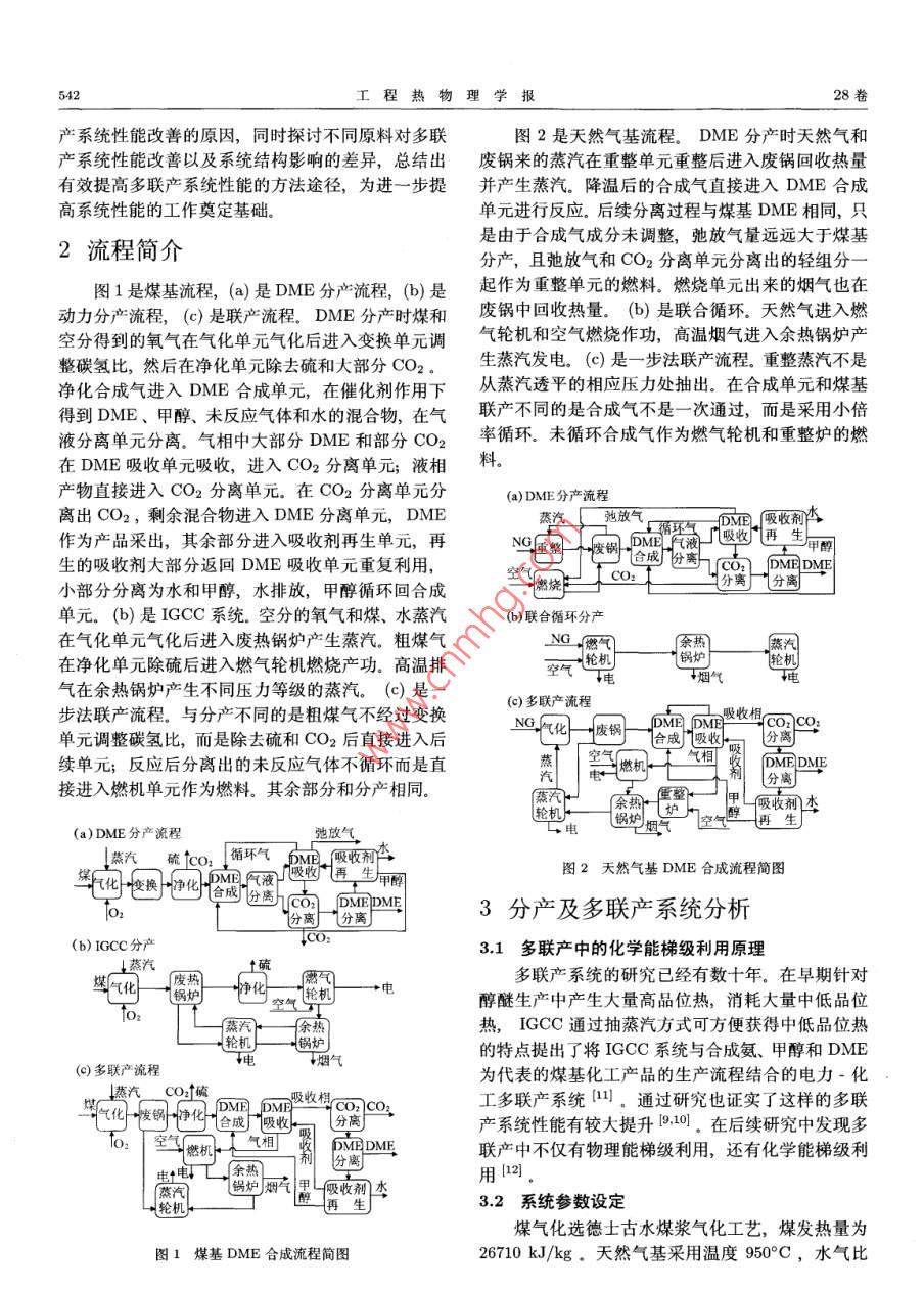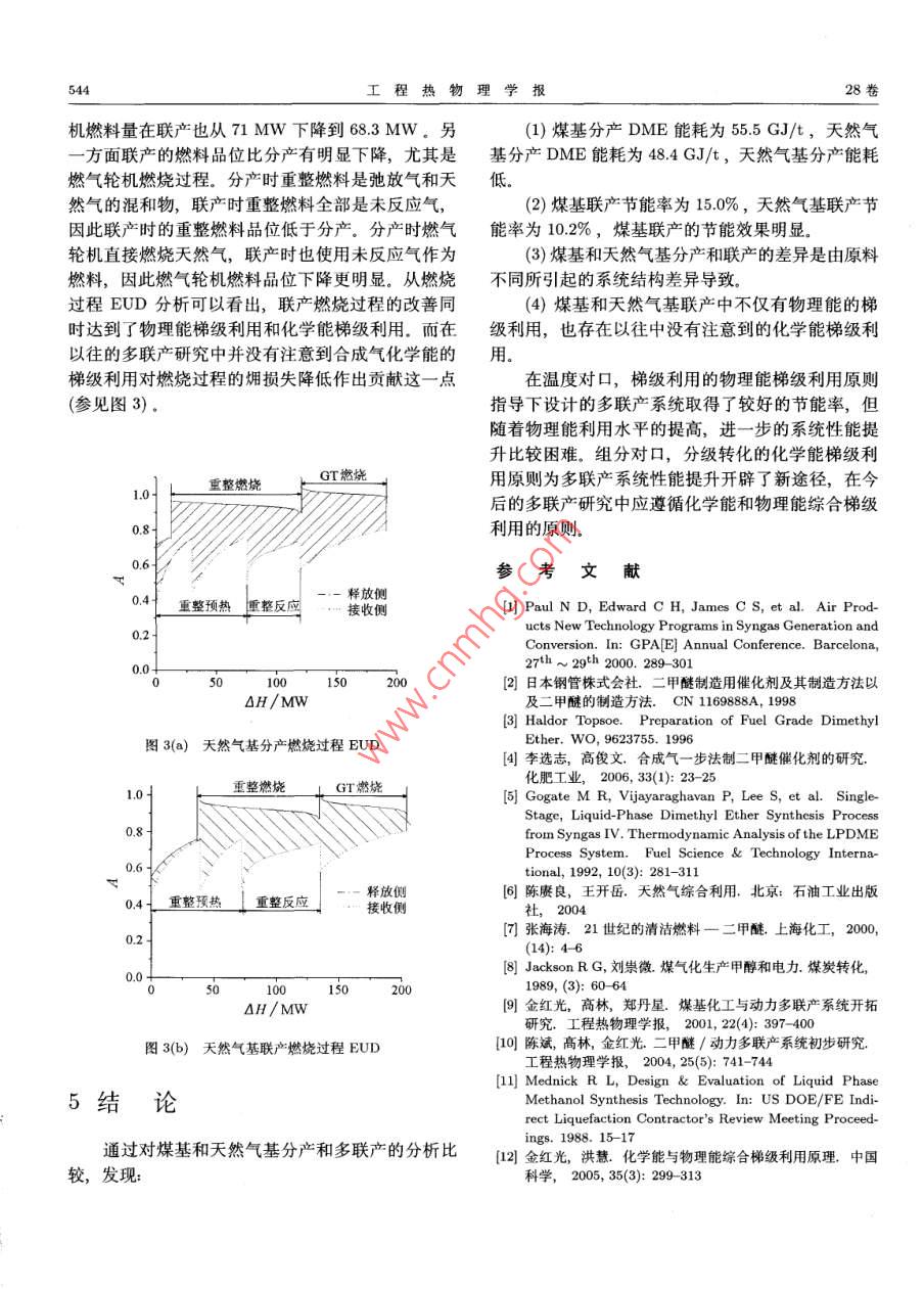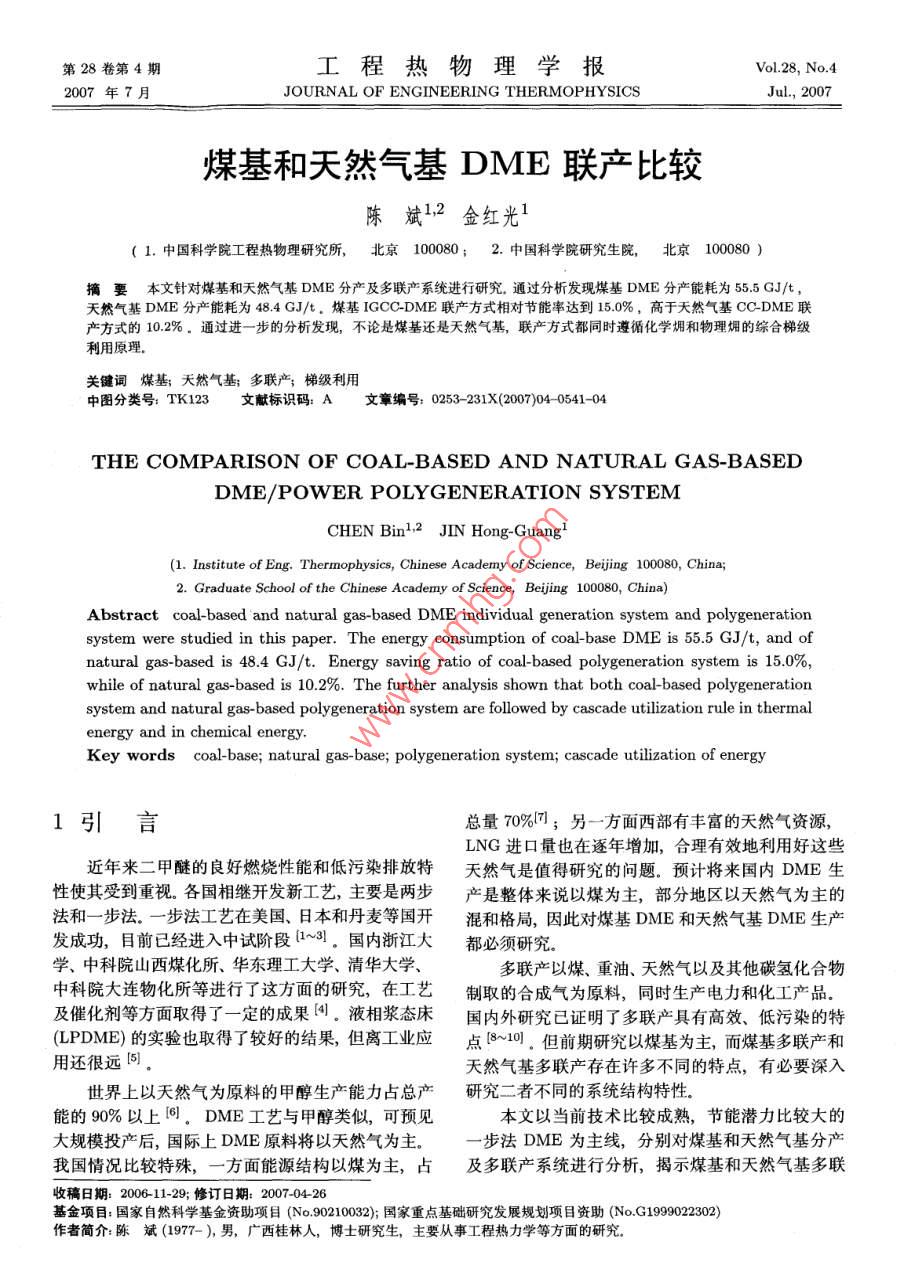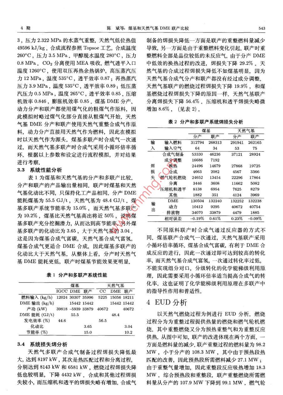 第28卷第4期工程熱物理學(xué)報(bào)Vol.28, No.42007年7月JOURNAL OF ENGINEERING THERMOPHYSICSJul, 2007煤基和天然氣基DME聯(lián)產(chǎn)比較陳斌12金紅光1( 1. 中國科學(xué)院工程熱物理研究所, 北京100080; 2.中國科學(xué)院研究生院, 北京100080 )摘要本文針對煤基和天然氣基DME分產(chǎn)及多聯(lián)產(chǎn)系統(tǒng)進(jìn)行研究.通過分析發(fā)現(xiàn)煤基DME分產(chǎn)能耗為55.5 GJ/t ,天然氣基DME分產(chǎn)能耗為48.4 GJ/t.煤基IGCC-DME聯(lián)產(chǎn)方式相對節(jié)能率達(dá)到15.0%,高于天然氣基CC-DME聯(lián)產(chǎn)方式的10.2%。通過進(jìn)一步的分析發(fā)現(xiàn), 不論是煤基還是天然氣基,聯(lián)產(chǎn)方式都同時(shí)遵循化學(xué)擁和物理爛的綜合梯級利用原理.關(guān)鍵詞煤基;天然氣基多聯(lián)產(chǎn),梯級利用中圖分類號: TK123文獻(xiàn)標(biāo)識碼: A文章編號: 0253-231X(2007)04- 0541-04THE COMPARISON OF COAL-BASED AND NATURAL GAS-BASEDDME/POWER POLYGENERATION SYSTEMCHEN Binl1,2 JIN Hong-Guang'(1. Institute of Eng. Thermopbysics, Chinese Academy of Science, Beijing 100080, China;2. Graduate School of the Chinese Academy of Science, Bejing 100080, China)Abstract coal-based and natural gas-based DME individual generation system and polygenerationsystem were studied in this paper. The energy consumption of coal-base DME is 55.5 GJ/t, and ofnatural gas-based is 48.4 GJ/t. Energy saving ratio of coal-based polygeneration system is 15.0%,while of natural gas-based is 10.2%. The further analysis shown that both coal-based polygenerationsysterm and natural gas-based polygeneration system are followed by cascade utilization rule in thermalenergy and in chemical energy.Key words coal-base; natural gas-base; polygeneration system; cascade utilization of energy1引言總量70%7];另一方面西部有豐富的天然氣資源,LNG進(jìn)口量也在逐年增加,合理有效地利用好這些近年來二甲醚的良好燃燒性能和低污染排放特天然氣是值得研究的問題。預(yù)計(jì)將來國內(nèi)DME生性使其受到重視。各國相繼開發(fā)新工藝,主要是兩步產(chǎn)是整體來說以煤為主,部分地區(qū)以天然氣為主的法和一步法。一步法工藝在美國、日本和丹麥等國開混和格局,因此對煤基DME和天然氣基DME生產(chǎn)發(fā)成功,目前已經(jīng)進(jìn)入中試階段[1~3]。國內(nèi)浙江大都必須研究。學(xué)、中科院山西煤化所、華東理工大學(xué)、清華大學(xué)、多聯(lián)產(chǎn)以煤、重油、天然氣以及其他碳?xì)浠衔镏锌圃捍筮B物化所等進(jìn)行了這方面的研究,在工藝制取的合成氣為原料,同時(shí)生產(chǎn)電力和化工產(chǎn)品。及催化劑等方面取得了-定的成果間。液相漿態(tài)床國內(nèi)外研究已證明了多聯(lián)產(chǎn)具有高效、低污染的特(LPDME)的實(shí)驗(yàn)也取得了較好的結(jié)果,但離工業(yè)應(yīng)點(diǎn)[8~10]。但前期研究以煤基為主,而煤基多聯(lián)產(chǎn)和用還很遠(yuǎn)(5)]。天然氣基多聯(lián)產(chǎn)存在許多不同的特點(diǎn),有必要深入世界上以天然氣為原料的甲醇生產(chǎn)能力占總產(chǎn)研究二者不同的系統(tǒng)結(jié)構(gòu)特性。能的90%以上[間。DME工藝與甲醇類似,可預(yù)見本文以當(dāng)前技術(shù)比較成熟,節(jié)能潛力比較大的大規(guī)模投產(chǎn)后,國際上DME原料將以天然氣為主。-步法 DME為主線,分別對煤基和天然氣基分產(chǎn)我國情況比較特殊,- 方面能源結(jié)構(gòu)以煤為主,占及多聯(lián)產(chǎn)系統(tǒng)進(jìn)行分析,揭示煤基和天然氣基多聯(lián)收稿日期: 2006-11-29; 修訂日期: 2007-04-26基金項(xiàng)目:國家自然科學(xué)基金資助項(xiàng)目(No.90210032);國家重點(diǎn)基礎(chǔ)研究發(fā)展規(guī)劃項(xiàng)目資助(No.G1999022302)作者簡介:陳斌(1977-),男, 廣西桂林人,博士研究生,主要從事工程熱力學(xué)等方面的研究。542工程熱物理學(xué)報(bào)28卷產(chǎn)系統(tǒng)性能改善的原因,同時(shí)探討不同原料對多聯(lián)圖2是天然氣基流程。DME 分產(chǎn)時(shí)天然氣和產(chǎn)系統(tǒng)性能改善以及系統(tǒng)結(jié)構(gòu)影響的差異,總結(jié)出廢鍋來的蒸汽在重整單元重整后進(jìn)入廢鍋回收熱量有效提高多聯(lián)產(chǎn)系統(tǒng)性能的方法途徑,為進(jìn)一步提并產(chǎn)生蒸汽。降溫后的合成氣直接進(jìn)入DME合成高系統(tǒng)性能的工作奠定基礎(chǔ)。單元進(jìn)行反應(yīng)。后續(xù)分離過程與煤基DME相同,只是由于合成氣成分未調(diào)整,弛放氣量遠(yuǎn)遠(yuǎn)大于煤基2流程簡介分產(chǎn),且弛放氣和CO2分離單元分離出的輕組分--圖1是煤基流程,(a) 是DME分產(chǎn)流程,(b) 是起作為重整單元的燃料。燃燒單元出來的煙氣也在動力分產(chǎn)流程,(c) 是聯(lián)產(chǎn)流程。DME 分產(chǎn)時(shí)煤和廢鍋中回收熱量. (b) 是聯(lián)合循環(huán)。天然氣進(jìn)入燃空分得到的氧氣在氣化單元?dú)饣筮M(jìn)入變換單元調(diào)氣輪機(jī)和空氣燃燒作功,高溫?zé)煔膺M(jìn)入余熱鍋爐產(chǎn)整碳?xì)浔?,然后在凈化單元除去硫和大部分CO2。生蒸汽發(fā)電。(c) 是一步法聯(lián)產(chǎn)流程。重整蒸汽不是凈化合成氣進(jìn)入DME合成單元,在催化劑作用下從蒸汽透平的相應(yīng)壓力處抽出。在合成單元和煤基得到DME、甲醇、未反應(yīng)氣體和水的混合物,在氣聯(lián)產(chǎn)不同的是合成氣不是一次通過,而是采用小倍液分離單元分離。