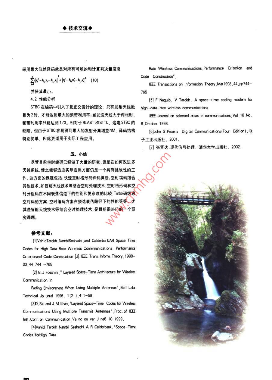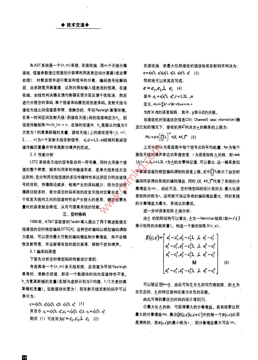 文章編號:1009-0940(209)-01-015-04空時編碼技術(shù)的研究劉小群寶雞文理學(xué)院寶雞721007摘要:空時編碼技術(shù)是抗信道表落和提高票統(tǒng)容量的一種最新碼可方法,本文介紹了分層空時碼、空時格型碼和空時分組碼的編譯碼原理比較了它們的優(yōu)缺點,并給出了空時格碼的設(shè)計準則,最后分析了空時編嗎的研究動態(tài)。關(guān)健詞空時編碼分層空時碼空時格形碼空時分組碼引言由于移動用戶的增多移動通信業(yè)務(wù)從單純的語音業(yè)務(wù)擴展到多媒體業(yè)務(wù).無線頻譜資源日趨緊張從而追求盡可能高的頻諧利用率已成為研究的熱點和重點。長時間以來,人們一直致力于開發(fā)高效的編碼調(diào)制和信號處理技術(shù)以提高無線頻譜的數(shù)0率空時編碼l(sTc是近年來移動通信領(lǐng)域出現(xiàn)的一種新的編碼和信號處理技術(shù)在發(fā)射端和接收端同時使用多個天線進行信發(fā)遠贈收息的發(fā)射和接收在不同天線發(fā)射信號之間引入時域和空域相關(guān)綜合利用時域和空域二維信息在接收端進行分集接收??請D1BAST系統(tǒng)結(jié)構(gòu)圖時編碼將空間分集.頻率分集及時間分集結(jié)合在一起從通信系輸入信號經(jīng)信號分離器分離成個n長度相同的數(shù)據(jù)流,分統(tǒng)的整體出發(fā)提高多徑衰落信道的通信質(zhì)量和數(shù)量。從目前發(fā)別輸入n個編碼器。這些編碼器可以是二進制的卷積編碼器,也展來看空時碼主要可以分為兩大類:一類是分層空時碼另一類可以不經(jīng)過任何編碼直接輸出.其輸出信號經(jīng)調(diào)制后,使用相是基于分集的空時分組碼和空時格形碼。相比較而言它們各有同的載波由發(fā)射天線同時發(fā)射其優(yōu)缺點.下面介紹它們的主要編譯碼原理及性能。設(shè)第個子編碼器在i時刻的輸出符號C,其中=12.…n分層空時編碼再將經(jīng)過分層空時編碼器編碼送入相應(yīng)的發(fā)射天線,根據(jù)分配2.1系統(tǒng)結(jié)構(gòu)方式的不同分層空時編碼LSTc可以分為下面三類:水平分層空分層空時編碼技術(shù)2|3]( LSTC. Layered space-Time Coding)時編碼 (HSTC: Horizontally Layered Space-- Time Coding).對角的基本思想是把高速數(shù)據(jù)業(yè)務(wù)分接為若干低速數(shù)據(jù)業(yè)務(wù).通過分層空時編碼[DsTc: Diagonally LayeredSpace-Time Coding)和普通的并行信道編碼器后.對其進行并行的分層編碼.編碼信垂直分層結(jié)構(gòu)空時編碼( LSTC: Vertical Layered Space-Tme號經(jīng)調(diào)制后用多個天線發(fā)射,實現(xiàn)發(fā)射分集。由B實驗室提出 Coding)的BAST系統(tǒng)結(jié)構(gòu)如圖1示。2.2譯碼過程收稿日期:2009-02-10技術(shù)交流◆BLAST系統(tǒng)是一個nm)系統(tǒng),在接收端,用m個天線分集在接收端.若最大似然接收機錯誤地將發(fā)射碼字判決為接收,信道參數(shù)通過信道估計獲得利用波束空間分離器(或迫零e=eeL e'eeL 4L deL e (3)處理).對載波信號進行載波和信號的分離.編碼信號經(jīng)解碼同樣地可以將其改寫成后.由多路復(fù)用器重建.達到對原始輸入信息流的預(yù)測。在接e=en,e2, L e,(4)收端。由線性判決器反饋均衡器實現(xiàn)分層反饋干擾抵消,然后其中e=ceLe,t=1L,n進行分層空時譯碼單個信道譯碼器完成信道譯碼。發(fā)射天線與定義:小立)m4叫,接收天線之間信道是窄帶.準靜態(tài)的、平坦 Rayleigh衰落環(huán)境為n×刀的誤差矩陣.其中:$表示S的共軛在某一時間區(qū)間發(fā)射天線到接收天線j間的信道響應(yīng)為h,則當(dāng)接收機對信道狀態(tài)信息cSl! Channels tatei nformation)確信道傳輸矩陣H內(nèi))mxn.在瑞利信道中,h是服從均值為0定已知的情況下,接收機將C判決為e的概率的上限為:方差為1的復(fù)高斯隨機變量,接收天線j上的接收信號r,(i=12…n為n個發(fā)射天線發(fā)射信號,(=1,2,n)經(jīng)瑞利衰減信P(e→)s道傳輸后重疊并伴有高斯白噪聲的擾動上式中的Es為星座圖中每個信號點的平均能量N為每個2.3性能分析接收天線的噪聲單邊功率譜密度,r為誤差矩陣A的秩,即rankLsTc系統(tǒng)各天線的信號取自同一符號集同時占用某個信(A=rA=1Lr為A的非零特征值,可以看出:這一概率類似道的整個帶寬頻率利用率和傳輸速率高.是單天線系統(tǒng)無法于衰減信道的格型編碼調(diào)制的誤差上限式中∏表示了由空時達到的充分利用無線信道的多徑傳播特性來達到區(qū)分同波道信編碼所獲得的系統(tǒng)的編碼增益,同時(E4N廠代表了系統(tǒng)的分號的目的,傳播路徑越多,檢測產(chǎn)生的誤碼越少,因為空間傳播路徑較多時,若分層空時碼系統(tǒng)的收發(fā)天線對位置合適,每集增益為m,由此可見,空時格型碼的設(shè)計準則為:最大化誤個收發(fā)天線對之間的信道特性會產(chǎn)生較大的差異.確定迫零矢差矩陣的秩為r。這樣就可保證系統(tǒng)的編碼增益最大,同時系統(tǒng)的分集增益為最大,系統(tǒng)達到最優(yōu)。量時的誤差就會降低,從而可提高系統(tǒng)的性能空進一步對誤差矩陣A做分析:時格碼1998年.AT&T實驗室的 Tarokh等人提出了用于高速數(shù)據(jù)無由A的矩陣結(jié)構(gòu)可以看出A為一 Hermitian矩陣(即=f(線通信的空時格型編碼STC4].這種空時編碼以格型編碼調(diào)制表示矩陣的共軛轉(zhuǎn)置).構(gòu)造一個新的矩陣B(c,e為基磁,可以提供最大可能的編碼增益和分集增益