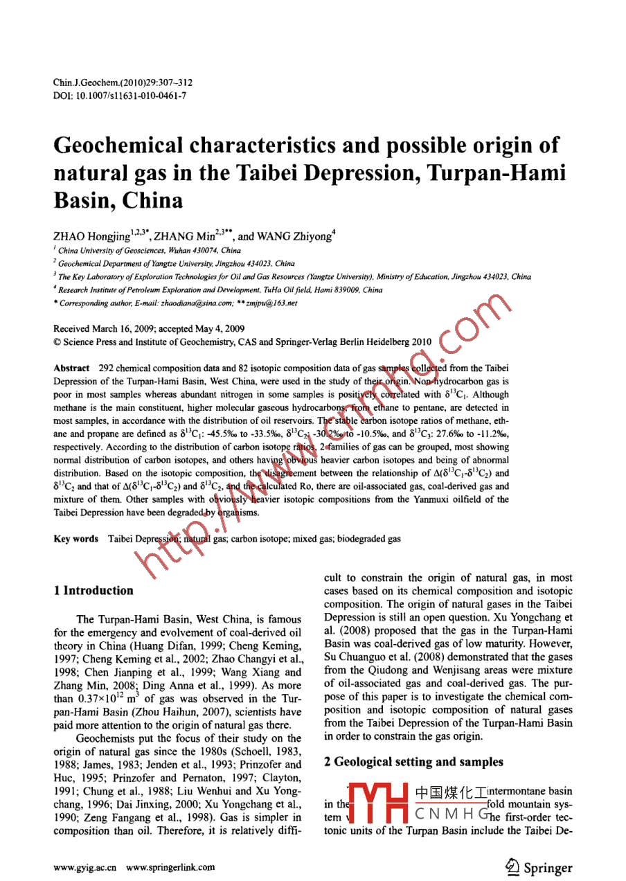 Chin J Geochem. (2010)29: 307-312DOl:10.1007/sl1631-010-0461-7Geochemical characteristics and possible origin ofnatural gas in the Taibei Depression, Turpan-HamiBasin ChinaZHAO Hongjing 23, ZHANG Min", and WANG ZhiyongChina University of Geosciences, Wuhan 430074, ChinaGeochemical Department of Yangtze University ingzhou 434023, ChinaP The Key Laboratory of Exploration Technologies for Oil and Gas Resources / Yangtze University), Ministry of Education, Jingzhou 434023, ChinaTuHa Oil field, Hami.CorrespondingauthorE-mailzhaodiana@sina.com;**zmjpu@163.nerReceived March 16, 2009; accepted May 4, 2009o Science Press and Institute of Geochemistry, CAS and Springer-Verlag Berlin Heidelberg 2010Abstract 292 chemical composition data and 82 isotopic composition data of gas samples collected from the TaibeiDepression of the Turpan-Hami Basin, West China, were used in the study of their origin. Non-hydrocarbon gas ispoor in most samples whereas abundant nitrogen in some samples is positively correlated with 8CI. Althoughethane is the main constituent, higher molecular gaseous hydrocarbons, from ethane to pentane, are detected inmost samples, in accordance with the distribution of oil reservoirs. The stable carbon isotope ratios of methane, eth-edas8C1:45.5‰%to-335%,8C2:-302%to-10.5%,and8"Cg:27.6%to-112%,respectively. According to the distribution of carbon isotope ratios, 2 families of gas can be grouped, most showingnormal distribution of carbon isotopes, and others having obvious heavier carbon isotopes and being of abnormaldistribution. Based on the isotopic composition, the disagreement between the relationship of A(8Cr-8C2)and8C2 and that of A(8Cr-8C2)and 8C2, and the calculated Ro, there are oil-associated gas, coal-derived gas andmixture of them. Other samples with obviously heavier isotopic compositions from the Yanmuxi oilfield of theTaibei Depression have been degraded by organismsKey words Taibei Depression; natural gas; carbon isotope; mixed gas; biodegraded gascult to constrain the origin of natural gas, in most1 Introductioncases based on its chemical composition and isotopiccomposition. The origin of natural gases in the TaibeiThe Turpan-Hami Basin, West China, is famous Depression is still an open question. Xu Yongchang etfor the emergency and evolvement of coal-derived oil al. (2008)proposed that the gas in the Turpan-Hamitheory in China(Huang Difan, 1999; Cheng Keming,Basin was coal-derived gas of low maturity. However1997; Cheng Keming et al, 2002; Zhao Changyi et al, Su Chuanguo et al. (2008)demonstrated that the gases1998; Chen Jianping et al, 1999; Wang Xiang and from the Qiudong and Wenjisang areas were mixtureZhang Min, 2008; Ding Anna et al, 1999). As more of oil-associated gas and coal-derived gas. The pur-than 0.3710 2 of gas was observed in the Tur- pose of this paper is to investigate the chemical com-pan-Hami Basin(Zhou Haihun, 2007), scientists have position and isotopic composition of natural gasespaid more attention to the origin of natural gas there. from the Taibei Depression of the Turpan-Hami BasinGeochemists put the focus of their study on the in order to constrain the gas origin.origin of natural gas since the 1980s(Schoell, 1983,1988: James, 1983: Jenden et al., 1993: Prinzofer and 2 Geological setting and samplesluc, 1995; Prinzofer and Pernaton, 1997; Clayton,1991; Chung nai Jinxing, 2000: Xu Yongchang et al., in theal., 1988; Liu Wenhui and Xu Yong中國煤化工 intermontane basinfold mountain sy1990: Zeng Fangang et al., 1998). Gas is simpler in temC Ghe first-order tedcomposition than oil. Therefore, it is relatively diffi- tonic units of the Turpan Basin include the Taibei Dewww.gyig.ac.cnwww.springerlink.comringerChin J Geochem. (2010)29: 307-312ression, the central uplift and the Tainan Depression. The distribution of higher hydrocarbons varies5%of exploration is focused on the Taibei Depres- depth( Fig. 2), they are generally low in shallown with an area of 9600 km. The Turpan Basin is ervoirs, and increase to the highest value nearasymmetrical, with the deepest and thickest sediments depth of 1600m, and then decreases gradually within the north, and the shallowest and thinnest sediments depth.in the south the mesozoic and cenozoic sediments inthe main depocenters are over 7000 m in thickness.Several potential source beds are distributed in theTaibei Depression: Carboniferous-Lower Permianmarine carbonates and clastics, the paralic lacustrinesediments of the Upper Permian Taodonggou Groupthe lower-Middle jurassic coal-bearing strata(mainlin the Badaowan and xishanyao formations), and theMiddle JiQiketai Formation(Yuan Mingshengetal,2002)There are 292 gas samples treated in thisChemical compositions and stable carbon and hydro-gen isotopic compositions of all the gas samplesFig. 1. Relative abundance of nitrogen and isotopic composition oflyzed by the PetroChina Tuha Oilfield Companyavailable in this study3 Results and discussion3.1 Chemical composition and possible originHydrocarbon gases are predominant in gasfrom the Turpan-Hami Basin in general, with a con-centration higher than 65%. The concentrations ofhydrocarbon gas in most samples are higher than 90%雪gPCOz and N2 are predominant in nonhydrocarbongases.The origin of nitrogen can be identified in termsdapo自of the ratio of N2/Ar( Chen Shijia et aL., 2000). Theratios are far higher than 84 with the minimum as 129,excluding atmospheric derivation of N2. Nitrogencontents in natural gas depend on the type of sourcerock, thermo-evolution degree and capture condition,and high nitrogen contents almost coincide withhighly mature and over-mature stages(Littke andKroos, 1995). There is an obvious positive correlationeen the logarithm of nitrogen contents and thetopic composition of methane when nitrogentents are higher than 0. 1%(Fig. 1), indicating the nitrogen contents in the Taibei Depression are possiblyrelated to gas thermal evolution. However, biodegra-dation can lead to an increase in the i
