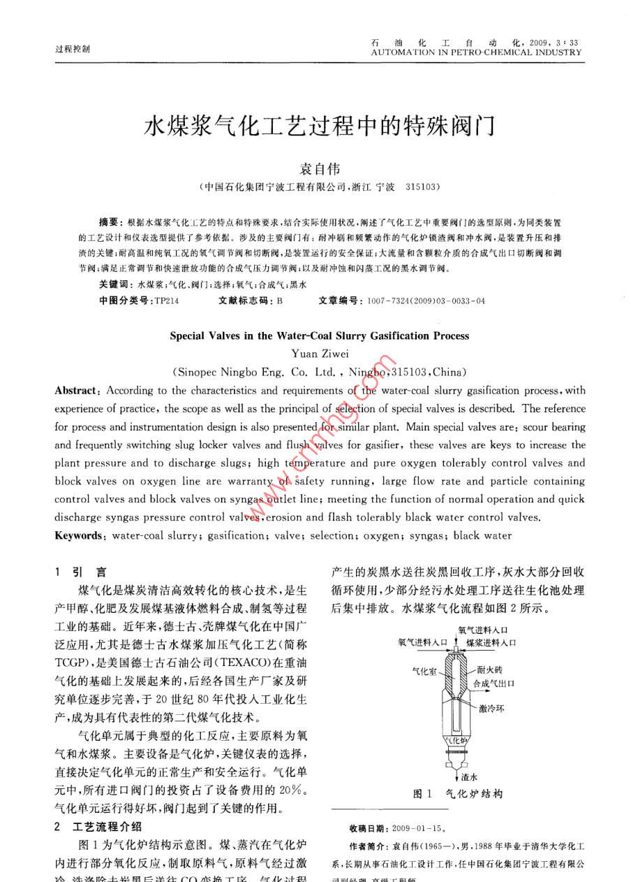 過(guò)程控制化工自動(dòng)化,2009,3:33AUTOMATION IN PETRO-CHEMICAL INDUSTRY水煤漿氣化工藝過(guò)程中的特殊閥門(mén)袁自偉(中國(guó)石化集團(tuán)寧波工程有限公司,浙江寧波315103)摘要:根據(jù)水煤漿氣化工藝的特點(diǎn)和特殊要求,結(jié)合實(shí)際使用狀況,闡述了氣化工藝中重要閥門(mén)的選型原則,為同類(lèi)裝置的工藝設(shè)計(jì)和儀表選型提供了參考依據(jù)。涉及的主要閥門(mén)有:耐沖刷和頻繁動(dòng)作的氣化爐鎖渣閥和沖水閥,是裝置升壓和排渣的關(guān)鍵;耐高溫和純氧工況的氧氣調(diào)節(jié)閥和切斷閥,是裝置運(yùn)行的安全保證;大流量和含顆粒介質(zhì)的合成氣出口切斷閥和調(diào)節(jié)閥;滿(mǎn)足正常調(diào)節(jié)和快速泄放功能的合成氣壓力調(diào)節(jié)閥;以及耐沖蝕和閃蒸工況的黑水調(diào)節(jié)閥關(guān)鍵詞:水煤漿;氣化、閥門(mén);選擇;氧氣;合成氣;黑水中圖分類(lèi)號(hào):TP214文獻(xiàn)標(biāo)志碼:B文章編號(hào):1007-7324(2009)03-0033-04Special alves in the Water-Coal Slurry Gasification ProcessYuan Ziwei( Sinopec Ningbo Eng. Co. Ltd, Ningbo, 315103, China)Abstract: According to the characteristics and requirements of the water-coal slurry gasification process, withexperience of practice, the scope as well as the principal of selection of special valves is described. The referencefor process and instrumentation design is also presented for similar plant. Main special valves are: scour bearingand frequently switching slug locker valves and flush valves for gasifier, these valves are keys to increase theplant pressure and to discharge slugs; high temperature and pure oxygen tolerably control valves andock valves on oxygen line are warranty of safety running, large flow rate and particle containingcontrol valves and block valves on syngas outlet line; meeting the function of normal operation and quickdischarge syngas pressure control valves, erosion and flash tolerably black water control valvesKeywords: water-coal slurry; gasification; valve; selection; oxygen; syngas; black water1引言產(chǎn)生的炭黑水送往炭黑回收工序,灰水大部分回收煤氣化是煤炭清潔高效轉(zhuǎn)化的核心技術(shù),是生循環(huán)使用,少部分經(jīng)污水處理工序送往生化池處理產(chǎn)甲醇、化肥及發(fā)展煤基液體燃料合成、制氫等過(guò)程后集中排放。水煤漿氣化流程如圖2所示。工業(yè)的基礎(chǔ)。近年來(lái),德土古、殼牌煤氣化在中國(guó)廣氧氣進(jìn)料入口泛應(yīng)用,尤其是德士古水煤漿加壓氣化工藝(簡(jiǎn)稱(chēng)氧氣進(jìn)料入口!媒漿進(jìn)料入口TCGP),是美國(guó)德土古石油公司( TEXACO)在重油氣化室耐火磚氣化的基礎(chǔ)上發(fā)展起來(lái)的,后經(jīng)各國(guó)生產(chǎn)廠(chǎng)家及研究單位逐步完善,于20世紀(jì)80年代投入工業(yè)化生產(chǎn),成為具有代表性的第二代煤氣化技術(shù)。氣化單元屬于典型的化工反應(yīng),主要原料為氧氣和水煤漿。主要設(shè)備是氣化爐,關(guān)鍵儀表的選擇直接決定氣化單元的正常生產(chǎn)和安全運(yùn)行。氣化單元中,所有進(jìn)口閥門(mén)的投資占了設(shè)備費(fèi)用的20%圖1氣化爐結(jié)構(gòu)氣化單元運(yùn)行得好壞,閥門(mén)起到了關(guān)鍵的作用。2工藝流程介紹收稿日期:2009-01-15圖1為氣化爐結(jié)構(gòu)示意圖。煤、蒸汽在氣化爐作者簡(jiǎn)介:袁自偉(1965-),男,1988年畢業(yè)于清華大學(xué)化工內(nèi)進(jìn)行部分氧化反應(yīng),制取原料氣,原料氣經(jīng)過(guò)激系長(zhǎng)期從事石油化工設(shè)計(jì)工作,任中國(guó)石化集團(tuán)寧波工程有限公石油化工自動(dòng)化渣水體積的1%粒度1~2cm的渣體占渣水體積氣系統(tǒng)的5%。粒度1cm的渣體占渣水體積的10%,粒制備氣化合成氣洗滌「脫硫脫旋度0.5~0.9cm的渣體占渣水體積的20%,粒度小于0.5cm的渣體占渣水體積的64%,最大極限粒渣斗除渣黑水循環(huán)系統(tǒng)度50mm。圖2水煤漿氣化流程3.1.3鎖渣閥和沖水閥技術(shù)要求鎖渣閥和沖水閥為雙向旋轉(zhuǎn)全截面開(kāi)關(guān)球閥,3特殊閥門(mén)氣化單元的主要閥門(mén)有:氣化爐鎖渣閥和軸球一體,球芯與球桿一體化結(jié)構(gòu)。水閥,氧氣閥門(mén),水煤漿切斷閥,黑水/灰水閥氣化氣化爐渣收集在充水的鎖渣罐中,通過(guò)順序控爐燒嘴冷卻水切斷閥,鎖渣閥和沖洗水閥,氣化爐制定期隔離和排空,控制閥按一定的頻率全開(kāi)和全關(guān),過(guò)程具有化學(xué),機(jī)械等強(qiáng)腐蝕和磨蝕高壓氧氣管線(xiàn)切斷閥,合成氣切斷閥等,下面對(duì)這鎖渣罐入口閥常開(kāi),出口閥和沖洗水人口閥常些閥門(mén)逐一進(jìn)行說(shuō)明。閉,鎖渣罐入口和出口閥的取向是垂直方向,沖水3.1氣化爐鎖渣閥和沖水閥閥為水平取向。氣化爐鎖渣閥和沖水閥布置如圖3所示。閥門(mén)應(yīng)提供能順利排渣的設(shè)計(jì),最小10°次循來(lái)自氣化爐環(huán)操作。閥門(mén)要求正向和反向雙向密封,在下游壓力為大氣壓下的最大差壓。在排渣程序中,上鎖渣黑水循環(huán)閥應(yīng)能耐受閥后壓力變化的沖擊。黑水閥門(mén)為高溫鎖渣閥結(jié)構(gòu),閥體和內(nèi)件體的金屬和保護(hù)涂層應(yīng)考慮在沖擊、腐蝕和磨蝕下有最好的黑水可用性。對(duì)鑄造、鍛造和加工的閥體,在操作狀態(tài)循環(huán)下,碳鋼閥體和閥蓋的整個(gè)金屬層留有一定的腐蝕裕度黑水沖洗鎖渣閥球體為耐