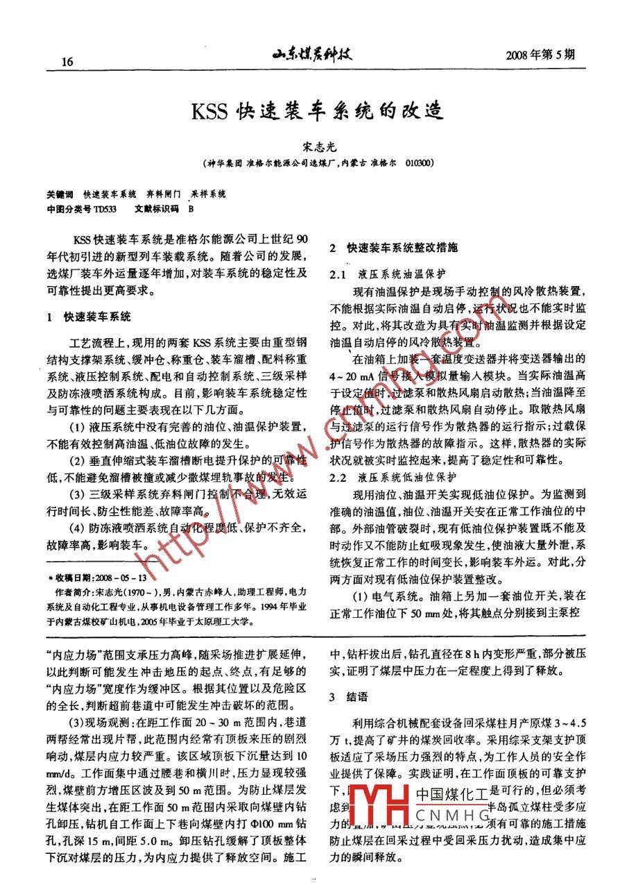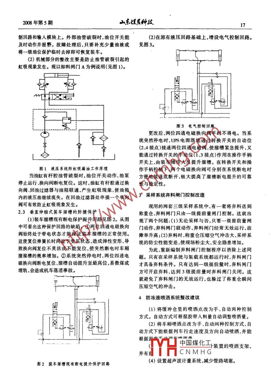 16∽東科墳2008年第5期KSS快速裝車糸統(tǒng)的改造宋志光(神華集團(tuán)準(zhǔn)格爾能源公司選煤廠,內(nèi)蒙古準(zhǔn)格爾010900)關(guān)鍵詞快速裝車系統(tǒng)棄料閘門采樣系統(tǒng)中圖分類號(hào)TD53文獻(xiàn)標(biāo)識(shí)碼BKSs快速裝車系統(tǒng)是準(zhǔn)格爾能源公司上世紀(jì)90年代初引進(jìn)的新型列車裝載系統(tǒng)。隨著公司的發(fā)展.2快速裝車系統(tǒng)整改措施選煤廠裝車外運(yùn)量逐年增加,對(duì)裝車系統(tǒng)的穩(wěn)定性及2.1液壓系統(tǒng)油溫保護(hù)可靠性提出更高要求?,F(xiàn)有油溫保護(hù)是現(xiàn)場(chǎng)手動(dòng)控制的風(fēng)冷散熱裝置,1快速裝車系統(tǒng)不能根據(jù)實(shí)際油溫自動(dòng)啟停,運(yùn)行狀況也不能實(shí)時(shí)監(jiān)控。對(duì)此,將其改造為具有實(shí)時(shí)油溫監(jiān)測(cè)并根據(jù)設(shè)定工藝流程上,現(xiàn)用的兩套KSS系統(tǒng)主要由重型鋼油溫自動(dòng)啟停的風(fēng)冷散熱裝置。結(jié)構(gòu)支撐架系統(tǒng)、緩沖倉(cāng)、稱重倉(cāng)、裝車溜槽、配料稱重在油箱上加裝一套溫度變送器并將變送器輸出的系統(tǒng)、液壓控制系統(tǒng)、配電和自動(dòng)控制系統(tǒng)、三級(jí)采樣4~20mA信號(hào)接入模擬量輸人模塊。當(dāng)實(shí)際油溫高及防凍液噴灑系統(tǒng)構(gòu)成。目前,影響裝車系統(tǒng)穩(wěn)定性于設(shè)定值時(shí),過濾泵和散熱風(fēng)扇啟動(dòng)散熱;當(dāng)油溫降至與可靠性的問題主要表現(xiàn)在以下幾方面。停止值時(shí),過濾泵和散熱風(fēng)扇自動(dòng)停止。取散熱風(fēng)扇(1)液壓系統(tǒng)中沒有完善的油位、油溫保護(hù)裝置,與過濾泵的運(yùn)行信號(hào)作為散熱器的運(yùn)行指示;過載保不能有效控制高油溫、低油位故障的發(fā)生。護(hù)信號(hào)作為散熱器的故障指示。這樣,散熱器的實(shí)際(2)垂直伸縮式裝車溜槽斷電提升保護(hù)的可靠性狀況就被實(shí)時(shí)監(jiān)控起來提高了穩(wěn)定性和可靠性。低,不能避免溜槽被撞或減少撒煤埋軌事故的發(fā)生2.2液壓系統(tǒng)低油位保護(hù)3)三級(jí)采樣系統(tǒng)棄料閘門控制不合理,無效運(yùn)現(xiàn)用油位、油溫開關(guān)實(shí)現(xiàn)低油位保護(hù)。為監(jiān)測(cè)到行時(shí)間長(zhǎng)、防塵性能差、故障率高。準(zhǔn)確的油溫值,油位、油溫開關(guān)安在正常工作油位的中(4)防凍液噴灑系統(tǒng)自動(dòng)化程度低、保護(hù)不齊全,部。外部油管破裂時(shí),現(xiàn)有低油位保護(hù)裝置既不能及故障率高,影響裝車。時(shí)動(dòng)作又不能防止虹吸現(xiàn)象發(fā)生,使油液大量外泄,系統(tǒng)恢復(fù)正常工作的時(shí)間變長(zhǎng),影響裝車外運(yùn)。對(duì)此,分收稿日期:2008-05-13兩方面對(duì)現(xiàn)有低油位保護(hù)裝置整改。作者簡(jiǎn)介:宋志光(1970-),男,內(nèi)蒙古赤峰人,助理工程師電力(1)電氣系統(tǒng)。油箱上另加一套油位開關(guān),裝在統(tǒng)及自動(dòng)化工程專業(yè),從事機(jī)電設(shè)備管理工作多年。194年畢業(yè)正常工作油位下50mm處,將其觸點(diǎn)分別接到主泵控于內(nèi)蒙古煤校礦山機(jī)電,205年畢業(yè)于太原理工大學(xué)“內(nèi)應(yīng)力場(chǎng)”范圍支承壓力高峰隨采場(chǎng)推進(jìn)擴(kuò)展延伸,中,鉆桿拔出后,鉆孔直徑在8h內(nèi)變形嚴(yán)重部分被壓以此判斷可能發(fā)生沖擊地壓的起點(diǎn)、終點(diǎn),有足夠的實(shí),證明了煤層中壓力在一定程度上得到了釋放。內(nèi)應(yīng)力場(chǎng)”寬度作為緩沖區(qū)。根據(jù)其位置以及危險(xiǎn)區(qū)3結(jié)語的全長(zhǎng),判斷超前巷道中可能發(fā)生沖擊破壞的范圍。(3)現(xiàn)場(chǎng)觀測(cè):在距工作面20-30m范圍內(nèi),巷道利用綜合機(jī)械配套設(shè)備回采煤柱月產(chǎn)原煤3~4.5兩幫經(jīng)常出現(xiàn)片幫此范圍內(nèi)經(jīng)常有頂板來壓的劇烈萬t提高了礦井的煤炭回收率。釆用綜采支架支護(hù)頂響動(dòng)煤層內(nèi)應(yīng)力較嚴(yán)重。該區(qū)域頂板下沉量達(dá)到10板適應(yīng)了采場(chǎng)壓力強(qiáng)烈的特點(diǎn),為工作人員的安全作mm/d。工作面集中通過腰巷和橫川時(shí),壓力顯現(xiàn)較強(qiáng)業(yè)提供了保障。實(shí)踐證明,在工作面頂板的可靠支護(hù)烈,煤壁前方增壓區(qū)波及到50m范圍。為防止煤層發(fā)下,中國(guó)煤化工是可行的但必須考生煤體突出,在距工作面50m范圍內(nèi)采取向煤壁內(nèi)鉆慮孔卸壓,鉆機(jī)自工作面上下巷向煤壁內(nèi)打100m鉆力的LCNMHG島孤立煤柱受多應(yīng)有可靠的施工措施孔,孔深15m,間距5.0m。卸壓鉆孔緩解了頂板整體防止煤層在回采過程中受回采壓力擾動(dòng)造成集中應(yīng)下沉對(duì)煤層的壓力,為內(nèi)應(yīng)力提供了釋放空間。施工力的瞬間釋放。2008年第5期∽東埋科墳17制回路和輸入模塊上。外部油管破裂時(shí),油位開關(guān)能2)在原有液壓回路基礎(chǔ)上,增設(shè)電氣控制回路。及時(shí)動(dòng)作并報(bào)警。故障處理后,只要補(bǔ)充少量油液或見圖3。將一級(jí)油位保護(hù)臨時(shí)去掉即可恢復(fù)裝車。2)機(jī)械部分的整改主要是防止油管破裂引起的虹吸現(xiàn)象發(fā)生。現(xiàn)以卸料閘門A為例說明(見圖1)。四圖3電氣控制回路更