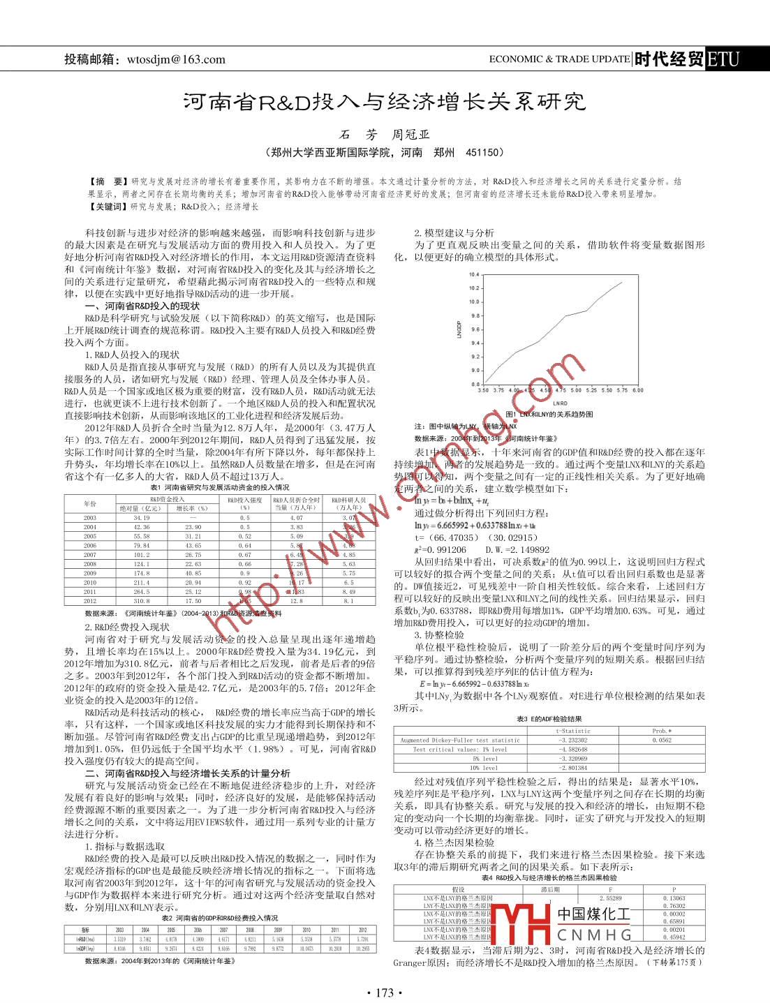 投稿郵箱: wtosdjm@ 163.com .ECONOMIC & TRADE UPDATE|時代經(jīng)貿(mào)ETU河南省R&D投入與經(jīng)濟增長關(guān)系研究石.芳周冠亞(鄭州大學西亞斯國際學院,河南鄭州451150)[摘要]研究與發(fā)展對經(jīng)濟的增長有著重要作用,其影響力在不斷的增強。本文通過計量分析的方法,對R&D投入和經(jīng)濟增長之間的關(guān)系進行定量分析。結(jié)果顯示,兩者之間存在長期均衡的關(guān)系;增加河南省的R&D投入能夠帶動河南省經(jīng)濟更好的發(fā)展;但河南省的經(jīng)濟增長還未能給R&D投入帶來明顯增加。[關(guān)鍵詞]研究與發(fā)展; R&D投入;經(jīng)濟增長.科技創(chuàng)新與進步對經(jīng)濟的影響越來越強,而影響科技創(chuàng)新與進步2.模型建議與分析.的最大因素是在研究與發(fā)展活動方面的費用書入和人員投入。為了更為了更直觀反映出變量之間的關(guān)系,借助軟件將變量數(shù)據(jù)圖形好地分析河南省R&D投入對經(jīng)濟增長的作用,本文運用R&D資源清查資料比, 以便更好的確立模型的具體形式。和《河南統(tǒng)計年鑒》數(shù)據(jù),對河南省R&D投入的變化及其與經(jīng)濟增長之間的關(guān)系進行定量研究,希望藉此揭示河南省R&D投入的--些特點和規(guī)10.律,以便在實踐中更好地指導R&D活動的進一步開展。10一、河南省R&D投入的現(xiàn)狀R&D是科學研究與試驗發(fā)展( 以下簡稱R&D)的英文縮寫,也是國際.上開展R&D統(tǒng)計調(diào)查的規(guī)范稱謂。R&D投入主要有R&D人員投入和R&D經(jīng)費投入兩個方面。g.1. R&D人員投入的現(xiàn)狀R&D人員是指直接從事研究與發(fā)展(R&D) 的所有人員以及為其提供直接服務(wù)的人員,諸如研究與發(fā)展(R&D) 經(jīng)理、管理人員及全體辦事人員。R&D人員是一- 個國家或地區(qū)極為重要的財富,沒有R&D人員,R&D活動就無法3.503.754.04254.504.75.00.255.505.758.00進行,也就更談不上進行技術(shù)創(chuàng)新了。一個地區(qū)R&D人員的投入和配置狀況直接影響技術(shù)創(chuàng)新,從而影響該地區(qū)的工業(yè)化進程和經(jīng)濟發(fā)展后勁。圖1 LNX和L NY的關(guān)系趨勢圖2012年R&D人 員折合全時當量為12.8萬人年,是2000年(3. 47萬人注:圖中縱軸為LNY,橫軸為LNX年)的3. 7倍左右。2000年到2012年期間,R&D人 員得到了迅猛發(fā)展,按數(shù)據(jù)來源: 204年到2013年 《河南統(tǒng)計年鑒》實際工作時間計算的全時當量,除2004年有所下降以外,每年都保持上表1中數(shù)據(jù)顯示,十年來河南省的GDP值和R&D經(jīng)費的投入都在逐年升勢頭,年均增長率在10%以上。雖然R&D人 員數(shù)量在增多,但是在河南持續(xù)增加, 兩者的發(fā)展趨勢是一致的。 通過兩個變量LNX和LNY的關(guān)系趨省這個有一-億多人的大省,R&D人 員不超過13萬人。勢圖可以得知,兩個變量之間有一-定的正線性相關(guān)關(guān)系。為了更好地確表1河南省研究與發(fā)展活動資金的投入情況定兩者之間的關(guān)系,建立數(shù)學模型如下:年R&D資金投入服&D投入強度 RBD人員折合全時 RX)科研人員hy=b+blnx +14,一20絕對量(億元)T增長率(%)通過做分析得出下列回歸方程:2042. 823.903.83二3.26lny:= 665992 + 0338.x.+tu55.5831.21.52093.t= (66. 47035) (30. 02915)200679.84.65.6487x2=0. 991206 D. W. =2. 14989222 63667.285.6從回歸結(jié)果中看出,可決系數(shù)*的值為0.99以上,這說明回歸方程式40.851.9_9.26_ 5.75可以較好的擬合兩個變量之間的關(guān)系:從t值可以看出回歸系數(shù)也是顯著211.4.949210.17的。DW值接近2,可見殘差中-階自相關(guān)性較低。綜合來看,上述回歸方201310.817.502.8程可以較好的反映出變量LNX和LNY之間的線性關(guān)系?;貧w結(jié)果顯示,回歸數(shù)據(jù)來源:《河南統(tǒng)計年鑒》 (2004- 2013)和R&D資源清查資料系數(shù)b,為0.633788,即R&D費用 每增加1%,GDP平均增加0. 63%。可見,通過2. R&D經(jīng)費投入現(xiàn)狀增加R&D費用投入,可以更好的拉動GDP的增加。河南省對于研究與發(fā)展活動資金的投入總量呈現(xiàn)出逐年遞增趨3.協(xié)整檢驗單位根平穩(wěn)性檢驗后,說明了一階差分后的兩個變量時間序列為馬,且增長率均在15%以上。2000年R&D經(jīng)費投入量為34. 19億元,到平穩(wěn)序列。通過協(xié)整檢驗,分析兩個變量序列的短期關(guān)系。根據(jù)回歸結(jié)2012年增加為310.8億元,前者與后者相比之后發(fā)現(xiàn),前者是后者的9倍之多。2003年到2012年,各個部門投入到R&D活動的資金都不斷增加。果, 可以推算得到殘差序列E的估計值方程為:2012年的政府的資金投入量是42.7億元,是2003年的5. 7倍; 2012年 企E= h._-666992-0-633788x其中LNy,為數(shù)據(jù)中各個LNy觀察值。對E進行單位根檢測的結(jié)果如表業(yè)資金的投入是2003年的12倍。R&D活動是科技活動的核心,R&D經(jīng) 費的增長率應(yīng)當高于GDP的增長3所示。表3 E的ADF檢驗結(jié)果率,只有這樣,- -個國家或地區(qū)科技發(fā)展的實力才能得到長期保持和不斷加強。盡管河南省R&D經(jīng)費支出占GDP的比重呈現(xiàn)遞增趨勢,到2012年F Augmentede Dickey-rult-StatistiteProb.*增加到1.05%,但仍遠低于全國平均水平(1.98%) ??梢?,河南省R&DTest eritical value8: 1% Level-4. 582648投入強度仍有較大的提高空間。二、河南省R&D投入與經(jīng)濟增長關(guān)系的計量分析研究與發(fā)展活動資金已經(jīng)在不斷地促進經(jīng)濟穩(wěn)步的上升,對經(jīng)濟經(jīng)過對殘值