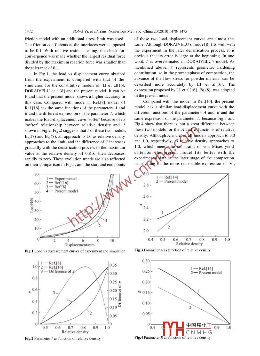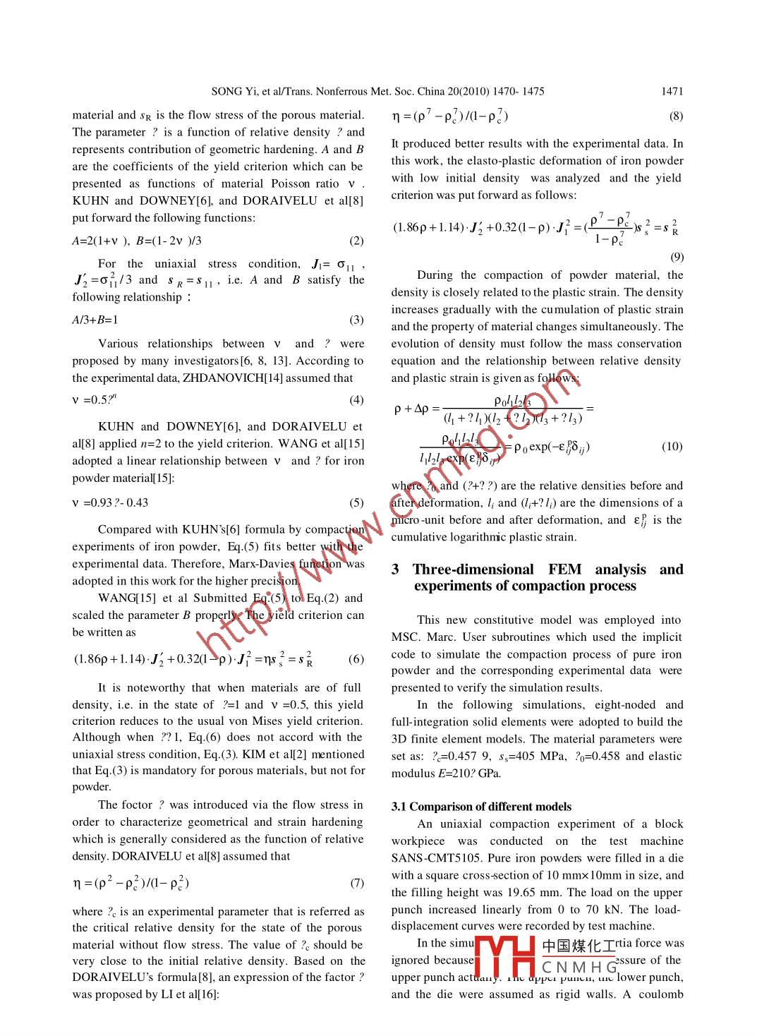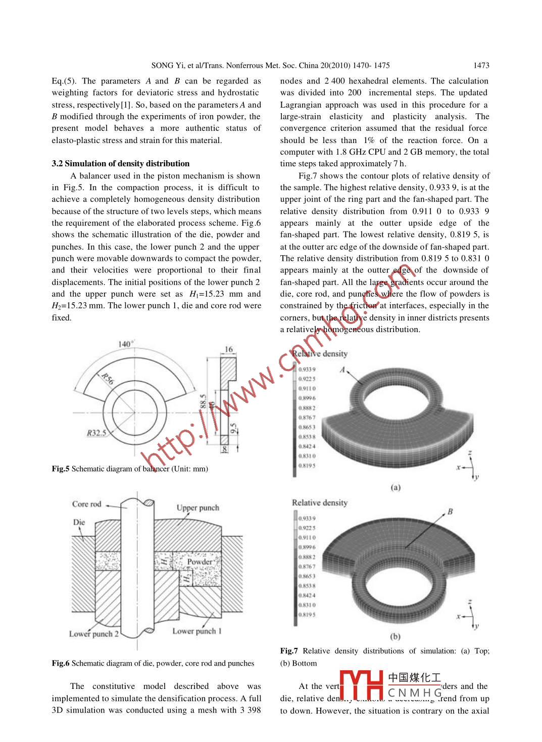 Available online at www.sciencedirect.comTransactions ofPScienceDirectNonferrous MetalsScienceSociety of ChinaELSEVIER PressTrans. Nonferrous Met. Soc. China 20(2010) 1470-1475www.nmsc.cnImproved model and 3D simulation of densification process for iron powderSONG Yi(宋毅), LI Yuan-yuan(李元元), ZHOU Zhao-yao(周照耀),ZHENG Zhen-xing(鄭振興), CHEN Pu-qing(陳普慶)School of Mechanical and Automative Engineering, South China University of Technology, Guangzhou 510640, ChinaReceived 1 September 2009; accepted 2 February 2010Abstract: A new model for describing the compaction process of iron powder was proposed based on the continuum hypothesis andelliptical yield criterion. To simulate the densification behaviour, the constitutive model was implemented in M arc computer program.For the relationship between load and displacement, different models were compared and the influence of the parameters in theconstitutive equations was determined by means of simulation and experiments. The density distribution of a balancer was measuredand simulated. The results show that the parameter ? adopted plays a modification role for the load-displacement curve, andcompared with other models the present model fits better with the experimental data in the later stage of the compaction processmainly due to the different parameters A and B. The friction on the contact surface contributes to the inhomogeneous densitydistribution under large deformation of the workpiece. The comparison between the simulation and experimental data indicates thatthis model can be used to predict the powder compact process precisely and effectively.Key words: powder compaction; simulation; iron; density distribution; constitutive modelare based on the constitutive function of porous material1 Introductionwhich is not in accordance with the properties of thepowder material completely.Powder forming is a highly developed process ofA new constitutive relation under a general form ofmanufacturing ferrous matrix or ceramic matrixthe yield function with an ellipsoidal yield surface for thecomposite material products, which combines the costdensification process of iron powder during the coldand material saving advantages of conventional powdercompaction was reported which was put forward basedmetallurgy with the high production rates and propertyon the speciality of powder. The action mechanisms ofenhancement of forging. So me important factors, such asdifferent parameters in the yield function were analyzedpressure,temperature and strain rate, determine the in detail. And the finite element calculations derivedproduct quality. Therefore, these process factors shouldfrom user-subroutines of Marc were compared withexperimental data.experimental approaches to manufacture high strengthand accuracy parts with homogeneous density2 Constitutive modeldistribution[ 1-5].During the deep exploration of powder formingTaking into account of the influence of porosity andphenomenon, a number of constitutive models werehydrostatic pressure of porous materials, one generalproposed based on the hypothesis that powder wasform of the yield criterion isconsidered as a continuous, elasto-plastic, andcompressible medium With some classical ellipticalAJ2+B.J=ηsζ=s艮(1)yield equations[6- 9], they are commonly integrated withJ2 and J1 are the second invariant of deviatoricfinite element method (FEM) for the investigation ofstress tensor and the first invariant of stress tensor,metal powder. However, most of these models[10-12]respectively. Ss is the yield stress of the dense referenceFoundation item: Project(50325516) supported by the National Natural Science Foundation 0中國(guó)煤化工,rted by ChinaEatceanionana Keoearch undcConaond)i Froflet0onsp suporteaby the Natl IMYHCNMH G& Povince, ChinasCorresponding author: SONG Yi; Tel: +86-20-87112933; E-mail: songyi0591 @ gmail.comPgmail.comDOI: 10.1016/S1003-6326(09)60323-XSONG Yi, et al/Trans. Nonferrous Met. Soc. China 20(2010) 1470- 14751471material and SR is the flow stress of the porous material.η=(ρ°-pρ2)/l-ρ?)(8)The parameter ? is a function of relative density ? andrepresents contribution of geometric hardening. A and BIt produced better results with the experimental data. Inare the coefficients of the yield criterion which can bethis work, the elasto-plastic deformation of iron powderpresented as functions of material Poisson ratio vwith low initial density was analyzed and the yieldKUHN and DOWNEY[6], and DORAIVELU et al[8]criterion was put forward as follows:put forward the following functions:(1.86p+1.14)Ji +0.32(1-p)J}=(P -起3n=s民A=2(1+v ), B=(1-2v )/3(21-ρ(9)For the uniaxial stress condition, J1= σ1 ,J2=σ/3 and sp=s, i.e. A and B satisfy theDuring the compaction of powder material, thfollowing relationship :density is closely related to the plastic strain. The densityincreases gradually with the cumulation of plastic strainA/3+B=1(3and the property of material changes simultaneously. TheVarious relationships between V and ? wereevolution of density must follow the mass conservationproposed by many investigators[6, 8, 13]. According toequation and the relationship between relative densitythe experimental data, ZHDANOVICH[ 14] assumed thatand plastic strain is given as follows:v =0.5?"Po462l3ρ+Sp=(4 +?4)(2+?12)(l3+?13)KUHN and DOWNEY[6], and DORAIVELU eal[8] applied n=2 to the yield criterion. W ANG et al[15]Po4213=ρoexp(- eδ;)(10)adopted a linear relationship between V and ? for iron1123 exp(eBδo)powder material[15]:where ?o and (?+? ?) are the relative densities before andv =0.93?- 0.43(5after deformation, l; and (;+?l) are the dimensions of amicro -unit before and after deformation, and ε} is theCompared with KUHN's[6] formula by compactioncumulative logarithmic plastic strain. .experiments of iron powder, Eq.(5) fits better with theexperimental data. Therefore, Marx- Davies function was3 Three-dimensional FEM analysis andadopted in this work for the higher precisio
