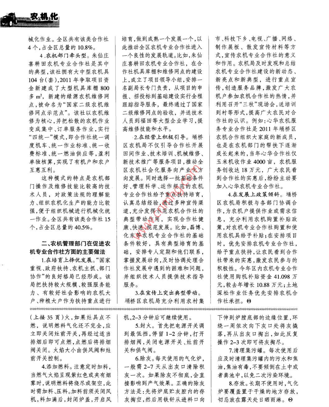 用戶指南家用秸稈氣化爐的選擇和使用安徽省農(nóng)業(yè)機(jī)械試驗鑒定站口祝思文肖沖舟王光明吳榮輝作為農(nóng)業(yè)大國,我國的農(nóng)作選擇家用秸稈氣化爐時,要低,燃燒無力;燃料裝得太松,一物秸稈資源非常豐富。一直以選擇:(1)燃燒效果好、加熱快是不能很好地將燃料轉(zhuǎn)為燃?xì)?來,農(nóng)村做飯、燒水都是直接燃捷,不需要輔助能源,也不用化二是無法將燃?xì)庵械碾s質(zhì)充分燒農(nóng)作物秸稈、木柴等獲取能學(xué)添加劑;(2)燃燒安全,無煙、過濾,會縮短產(chǎn)氣時間,影響燃源,不僅浪費資源,更降低了熱無味、無積碳、無廢氣產(chǎn)生;(3)燒效果。燃料裝填時,要邊裝邊效能;不僅造成環(huán)境污染,更使結(jié)構(gòu)簡單,使用可靠,操作方便;用直徑為2-3cm粗的木棍將爐人們的健康受到危害。近年來,(4)有一定的通用性,能用于炊內(nèi)燃料均勻地?fù)v緊、搗實。密實隨著國家對農(nóng)業(yè)科技的持續(xù)投事、洗浴、保溫、烘干等多種用的燃料搗松些,泡松的燃料搗緊入,農(nóng)業(yè)秸稈利用技術(shù)日益成途。些。只有掌握好燃料裝填的松緊熟,科研部門研發(fā)出戶用秸稈氣度,爐子燃燒的產(chǎn)氣效果才能達(dá).化爐投放農(nóng)村市場,它將農(nóng)作物二、家用秸稈氣化爐的使用到最佳。秸稈、農(nóng)林廢棄物等有效地轉(zhuǎn)化(一)燃料的選擇(二)使用方法與注意事項為燃?xì)?使用方便、干凈衛(wèi)生,改1.燃料越干越好。燃料越干,1.氣化爐灶具安放。氣化爐善了農(nóng)村做飯、燒水等生活衛(wèi)生產(chǎn)氣效果越好。雖然稍稍吸潮的灶具應(yīng)靠窗戶安放,并在灶具上環(huán)境。目前,國內(nèi)家用秸稈氣化燃料也能用,但不能太濕,否則方的窗戶上加一排風(fēng)扇,以便排爐市場上,生產(chǎn)企業(yè)眾多、爐型產(chǎn)出的氣體水分含量高,影響燃除室內(nèi)有害氣體。繁雜,農(nóng)戶選擇和使用都有一些燒效果。一般來說,燃料含水量2.安全檢查。使用前,應(yīng)先檢困難,下面對戶用秸稈氣化爐的以不超過20%為佳。查電源是否正常,緊固件是否擰選擇與使用方法做簡單介紹。2.燃料搭配要合理。利用農(nóng)緊,閥門及調(diào)節(jié)開關(guān)等操作件是村現(xiàn)有的稻殼、谷糠、鋸木,曬干否靈活。氣化爐應(yīng)平穩(wěn)的放置在一、家用秸稈氣化爐的類型的豬、牛、羊等糞便,以及食用菌地面上,周圍不得放置易燃物和和選擇栽培廢料等作燃料時,如在其中雜物,確保使用安全。家用秸稈氣化爐主要有上加入一些大塊的玉米芯、木柴塊3.點火。關(guān)閉供氣閥、供風(fēng)吸式和下吸式兩種形式,其中家等則燃燒效果更佳。玉米稈、高閥、放水閥和出灰口,打開排煙用上吸式秸稈氣化爐從爐體底粱稈、豆稈、樹枝等須剁成3-閥,從填料口向爐內(nèi)填入少量的部送風(fēng),經(jīng)氣化反應(yīng)后,產(chǎn)生的5em長的段或粉碎后與稻殼等細(xì)干柴或茅草等易燃物并點燃。為燃?xì)馔ㄟ^爐體上部的出氣管道碎燃料混合使用、合理搭配可提使底火充分燃燒,可打開風(fēng)機(jī)助送出,其優(yōu)點是:氣化率較高、灰高燃燒效果。燃。底火點燃后關(guān)閉風(fēng)機(jī),這時分少;家用下吸式秸稈氣化爐從3.燃料裝填松緊要適度。氣可將先準(zhǔn)備好的燃料填入氣化爐體下、中部送風(fēng),經(jīng)氣化反應(yīng)化爐在產(chǎn)氣過程中,要求燃料具爐內(nèi)。燃料填好后,打開風(fēng)機(jī),這后,產(chǎn)生的燃?xì)鈴臓t體下部的出有一定的透氣性,不能太緊,也時會看到排煙口有大量的煙氣氣管道送出,它的優(yōu)點在于焦油不能太松。如燃料裝得太緊,會排出,過2-3分鐘后,打開供氣含量較少、工作穩(wěn)定性好。阻礙燃?xì)饽嫘校瑢?dǎo)致灶頭火焰閥和灶前開關(guān)點(下轉(zhuǎn)22頁)農(nóng),機(jī)化械化作業(yè)。全區(qū)共有該類合作社培育,做到成熟一個發(fā)展一個,以市、科技下鄉(xiāng)、電視、廣播、網(wǎng)絡(luò)、4個,占全區(qū)總量的10.8%。此推動全區(qū)農(nóng)機(jī)專業(yè)合作社進(jìn)入.制作展板、散發(fā)宣傳材料等方4.農(nóng)機(jī)部門牽頭型。朱仙莊一個良性的發(fā)展軌道。比如,朱仙式,宣傳農(nóng)機(jī)專業(yè)合作社的意義喜耕田農(nóng)機(jī)專業(yè)合作社是其中莊喜耕田農(nóng)機(jī)專業(yè)合作社,在合和作用。農(nóng)機(jī)局及時發(fā)現(xiàn)和總結(jié)的典型,該社擁有大中型農(nóng)機(jī)具作社機(jī)具庫棚和維修網(wǎng)點的建設(shè)農(nóng)機(jī)專業(yè)合作社建設(shè)的新動態(tài)、104臺(套),2011年爭取項目資上,成立了項目領(lǐng)導(dǎo)小組,安排一新亮點和新典型,進(jìn)行重點宣金新建成了大型機(jī)具庫棚800 .名副局長專門負(fù)責(zé),從項目的申傳,創(chuàng)造服務(wù)品牌,激發(fā)廣大農(nóng)多m2,新建的綠源農(nóng)機(jī)維修網(wǎng)報、招投標(biāo)到基礎(chǔ)建設(shè)實行全程機(jī)戶參加農(nóng)機(jī)合作社的熱情,并點,被命名為“國家二級農(nóng)機(jī)維跟蹤指導(dǎo)服務(wù),最終通過了國家利用召開“三秋”現(xiàn)場會,送培訓(xùn)修網(wǎng)點示范點”。該社以農(nóng)機(jī)維二級維修網(wǎng)點的驗收,并送技術(shù)到村等形式,提高廣大農(nóng)民對合修為核心,并把松散的農(nóng)機(jī)作業(yè)人員到福田等大型企業(yè)