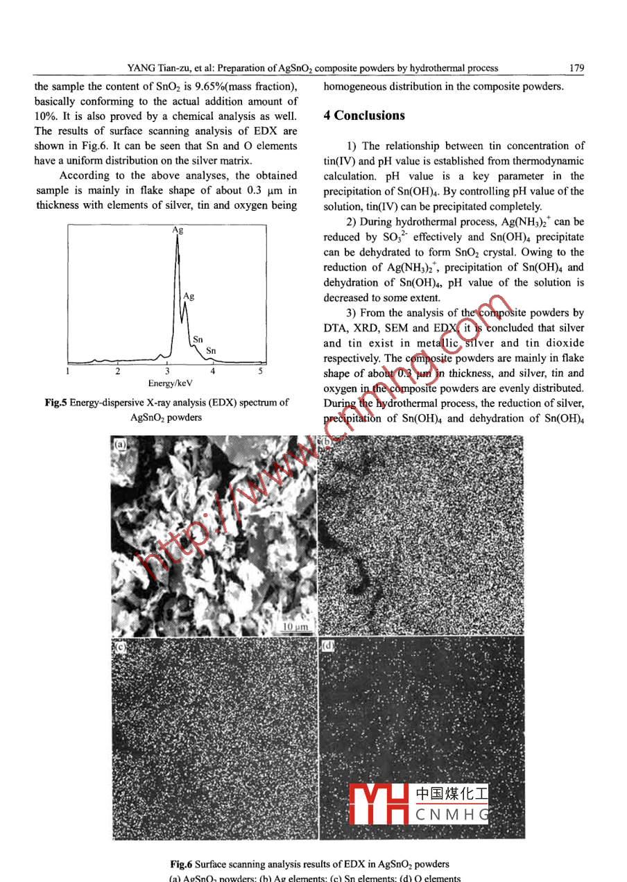 J. Cent. South Univ. Technol. (2007)02- -0176- 05包SpringerDOI: 10.1007/s11771-007-0035-yPreparation of AgSnO2 composite powders by hydrothermal processYANG Tian-zu(楊天足),DU Zuo-juan(杜作娟)', GU Ying-ying(古映瑩)},QIU Xiao-yong(邱曉勇), JIANG ming-xi(江名喜) .(1. School of Metallurgical Science and Engineering, Central South University, Changsha 410083, China;2. School of Chemistry and Chemical Engineering, Central South University, Changsha 410083, China)Abstract: Silver-tin oxide powders were synthesized by the hydrothermal method with Ag(NH3)2* solution and Na2SnO3 solution asraw materials and Na2SO3 as reductant. The precipitation conditions of Na2SnO3 solution and the reduction conditions of Ag(NH3)2*were also investigated. The powders prepared were characterized by differential thermal analysis (DTA), X-ray diffraction analysis(XRD), scanning electron microscope (SEM) and energy spectrum analysis. The results show that pH value of the solution is a keyparameter in the formation of Sn(OH), precipitate and the reduction reaction of Ag(NH3)ht can rclease H+ ions, which results insynchronous precipitation of Sn(OH)。2~ as Sn(OH)4. The reduction of Ag(NH3)2 and precipitation of Na2SnO3 occur simultaneouslyand the coprecipitation of silver and tin oxide is reached by the bhydrothermal method. The silver-tin oxide composite powders havemainly flake shape of about 0.3 um in thickness and there exists homogeneous distribution of tin oxide and silver in the powdersynthesized.Key words: silver-tin oxide powder; hydrothermal method; flake structure; coprecipitationwas applied to prepare silver-tin oxide composite1 Introductionpowders with Ag(NH)2* solution and Na2SnO3 solutionas raw materials and Na2SO3 as the reductant. TheThe material made of silver and tin oxide(AgSnO2),obtained mixed solution was used as precursor. Thehaving some advantages, for example, excellent arcreduction of Ag and the crystallization precipitation ofaggressiveness resistance, wear-resistance and resistanceSnO2 were investigated simultaneously.to fusion, has become the contact material that has themaximum possibility to replace AgCdo". AgSnO2 has2 Experimentalbeen the focus of researches in contact materials inrecent years'- 4. It has got a rapid development and has2.1 Experimental proceduregradually been applied to alternating current (AC) andAqueous ammonia was added to AgNO3 solution atdirect current (DC) contactors, power relays and somecertain concentration, with silver-ammonia complex ionlow-voltage circuit breakers.being formed. Na2SnO3 in proportion was added to theAt present the preparation techniques for AgSnO2above solution, with addition of Na2SO3 as reductant atcontact material mainly are powder metallurgical processthe same time. The resulted mixed solution was taken asand alloy internal oxidation process. Besides the aboveprecursor, which was put into a high pressure reactor stillprocesses, there are reaction spray-on processsto react for 4 h at 150 C, then AgSnO2 compositechemical plating process6-8), reaction synthesis process'powders were obtained. The powders were washed andand reaction ball milling techniqueo that are used forfitered, and dried for4hat 100 C.preparation of the contact material. Each of theseprocesses has its own advantages, but at the same time,2.2 Characteristicssome limitations exist as well2l. The hydrothermalX-ray diffractometer (D/MAX- YA type) was usedmethod is one of the best wet chemical methods for thefor determining the phases of the sample, Cu target, Ku,preparation of high quality oxide powder and the powder2=0.154 056 nm; SEM (Japan JSM- -5600LV) foprepared by hydrothermal process has advantages suchobserving the appearance and grain size of the sample;as well-defined grain, no aggregation and goodene中國煤化工:ctor (EDX) (apandispersiviy!13!. In this study, the hydrothermal processJSNical composition of theYHCNMHGFoundation item: Project(2001BA901A09)supported by the Key Program of Science and Technology Action of West China DevelopmentReceived date: 2006 - 06- 24; Accepted date: 2006 -09 -02Corresponding anthor: DU Zuo-juan, PhD candidate; +86-731-8836791; E-mail:cuckoo8211@163.comYANG Tian-zu, et al: Preparation of AgSnO2 composite powders by hydrothermal process177sample; KSCN titrimetric analysis for measuring th3.2 Reduction of silvercontent of silver in the sampl4; and iodimetry forThe acid corresponding to sodium sulfte is H2SO3analyzing the content of Sn in the samplelS.which is a weak acid. In alkaline solution, SO3- is thepredominant species. The standard electrode potentials of3 Results and discussionSO32 and Ag(NH3)2 * complex ion are as follows:SO2- +2H*+2e=SO3-+H2O,3.1 Precipitation of Sn(OH)4Na2SnOz is a kind of compound with unstableφ°(S0 /so )=-0.93 V(4)chemical properties. It exists mostly in the form ofAgQNH3)2 +e=Ag+2NH3Sn(OH)2- in solutions. When it reacts with acid,especially weak acid, it is easy to form Sn(OH)4φ°(Ag(NHy)/Ag)=0.37 V(5)precipitate. The precipitate is very stable, with aObviously, SO3- can reduce Ag(NH3)2* to metallicsolubility product constant of 1X 10 56. However, it cansilver. Theoretically, fom Eqns.(4) and (5), when molebe decomposed into Sn* and H2O in a strong acidratio of SO32- to Ag(NH3)2* is over 0.5, Ag(NH3)2* cansolution. The relative reaction can be described asbe reduced thoroughly by SO3-. In this work, it isfollows:proved from the experiment that a complete reduction ofAg(NH3)2t can be realized only when the mole ratio ofSn(OH)。+ 2H* = Sn(OH)4↓+ 2H2O(1)SO3- to Ag(NH3)2* is over 1.Sn(OH)4+ 4H+ = Snt+ + 4H2OAccording to Eqns.(1) and (2), the total concentration3.3 Preparation of AgSnOz composite powdersSilver ammine complex solution is made of AgNO3([Sn]r) of tin in the solution, the pH value for Sn(OH)4precipitation can be figured out by the followingsolution and aqueous ammonia. Then Ag(NH)h2*equation:solution is mixed with Na2SnO3 solution and NazSO3solution, with a colorless and c