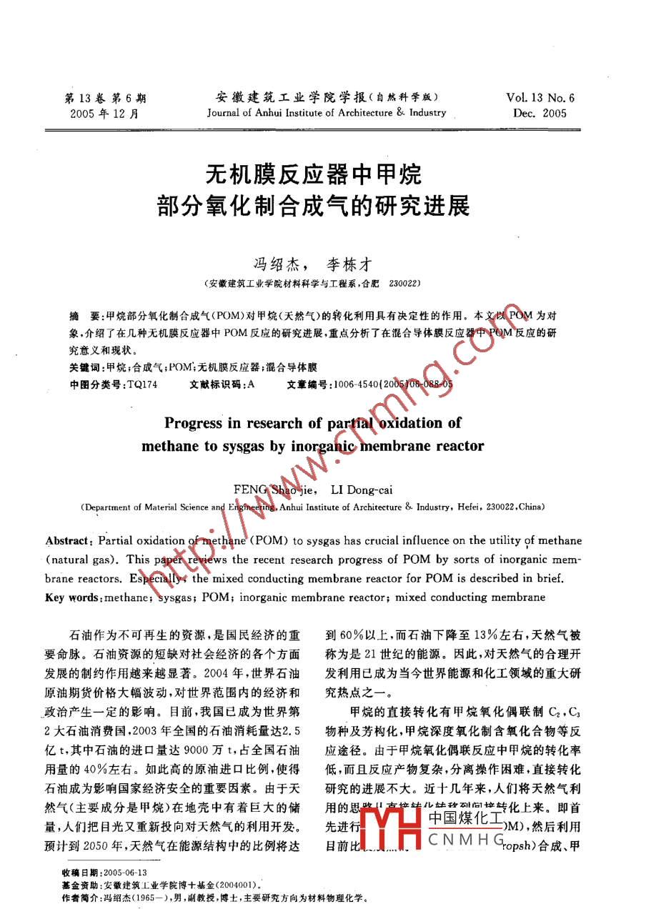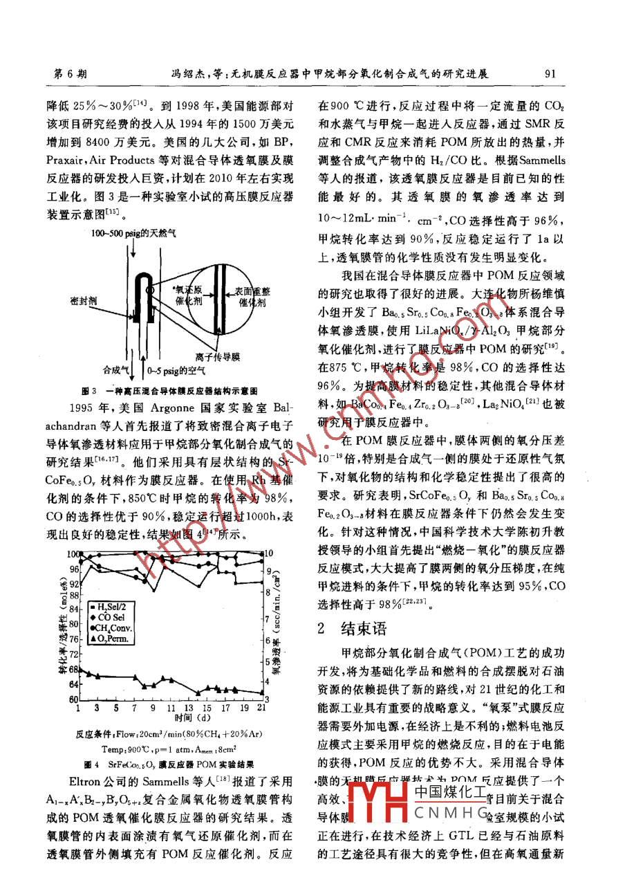 第13卷第6期安徽建筑工業(yè)學(xué)院學(xué)報(bào)(自然科學(xué)版)Vol. 13 No 62005年12月Journal of Anhui Institute of Architecture & IndustryDec.2005無機(jī)膜反應(yīng)器中甲烷部分氧化制合成氣的研究進(jìn)展馮紹杰,李棟才(安徽建筑工業(yè)學(xué)院材料科學(xué)與工程系,合肥230022)摘要:甲烷部分氧化制合成氣(POM)對(duì)甲烷(天然氣)的轉(zhuǎn)化利用具有決定性的作用。本文以POM為對(duì)象,介紹了在幾種無機(jī)膜反應(yīng)器中POM反應(yīng)的研究進(jìn)展,重點(diǎn)分析了在混合導(dǎo)體膜反應(yīng)器中POM反應(yīng)的研究意義和現(xiàn)狀。關(guān)鍵詞:甲烷;合成氣;POM;無機(jī)膜反應(yīng)器;混合導(dǎo)體膜中圖分類號(hào):TQ174文獻(xiàn)標(biāo)識(shí)碼:A文章編號(hào):1006-4540(2005)06-088-05Progress in research of partial oxidation ofmethane to sysgas by inorganic membrane reactorDepartment of Material Science and Engineering, Anhui Institute of Architecture Industry, Hefei, 230022, China)Abstract: Partial oxidation of methane(POM) to sysgas has crucial influence on the utility of methane(natural gas). This paper reviews the recent research progress of PoM by sorts of inorganic membrane reactors. Especially, the mixed conducting membrane reactor for POM is described in brief.Key words: methane; sysgas; POM; inorganic membrane reactor; mixed conducting membrane石油作為不可再生的資源,是國民經(jīng)濟(jì)的重到60%以上,而石油下降至13%左右,天然氣被要命脈。石油資源的短缺對(duì)社會(huì)經(jīng)濟(jì)的各個(gè)方面稱為是21世紀(jì)的能源。因此,對(duì)天然氣的合理開發(fā)展的制約作用越來越顯著。2004年,世界石油發(fā)利用已成為當(dāng)今世界能源和化工領(lǐng)域的重大研原油期貨價(jià)格大幅波動(dòng),對(duì)世界范圍內(nèi)的經(jīng)濟(jì)和究熱點(diǎn)之一政治產(chǎn)生一定的影響。目前,我國已成為世界第甲烷的直接轉(zhuǎn)化有甲烷氧化偶聯(lián)制C2,C32大石油消費(fèi)國,2003年全國的石油消耗量達(dá)2.5物種及芳構(gòu)化,甲烷深度氧化制含氧化合物等反億t,其中石油的進(jìn)口量達(dá)9000萬t,占全國石油應(yīng)途徑。由于甲烷氧化偶聯(lián)反應(yīng)中甲烷的轉(zhuǎn)化率用量的40%左右。如此高的原油進(jìn)口比例使得低,而且反應(yīng)產(chǎn)物復(fù)雜,分離操作困難,直接轉(zhuǎn)化石油成為影響國家經(jīng)濟(jì)安全的重要因素。由于天研究的進(jìn)展不大。近十幾年來,人們將天然氣利然氣(主要成分是甲烷)在地殼中有著巨大的儲(chǔ)用的化敵動(dòng)回鼓化上來。即首量,人們把目光又重新投向?qū)μ烊粴獾睦瞄_發(fā)。先進(jìn)行中國煤化M),然后利用預(yù)計(jì)到2050年,天然氣在能源結(jié)構(gòu)中的比例將達(dá)目前比CNMH(opsh)合成、甲收稿日期:2005-06-13基金資助:安徽建筑工業(yè)學(xué)院博十基金(2004001)作者簡介:馮紹杰(1965一),男,副教授,博士,主要研究方向?yàn)椴牧衔锢砘瘜W(xué)。第6期馮紹杰,等:無機(jī)膜反應(yīng)器中甲烷部分氧化制合成氣的研究進(jìn)展醇合成的工藝,將由甲烷制得的合成氣合成燃料所以在多孔膜管中的反應(yīng)以及反應(yīng)物和產(chǎn)物的濃及化學(xué)品,即GTL.( gas-to- liquid)。其中甲烷制度分布難以確定。合成氣工段在技術(shù)經(jīng)濟(jì)上是限制甲烷間接轉(zhuǎn)化的近年來,具有高氫選擇性的多孔陶瓷膜技術(shù)瓶頸,也是各國競相研究的重點(diǎn)進(jìn)展很快。如采用CVD/CVI法制備的SiO2/1968年,將膜分離過程與反應(yīng)過程耦合的膜Al2O3微孔膜,500℃時(shí)H2/C3H8的滲透選擇性反應(yīng)器概念被提出1-2。早期的膜反應(yīng)器技術(shù)目約為70~90。但這類反應(yīng)器多用于丙烷脫氫制的是在反應(yīng)過程中轉(zhuǎn)移反應(yīng)產(chǎn)物,使反應(yīng)平衡向丙稀等反應(yīng),用于甲烷脫氫和部分氧化反應(yīng)的實(shí)產(chǎn)物方向移動(dòng),提高反應(yīng)的收率。經(jīng)過30多年的驗(yàn)研究報(bào)道少見。研究,膜反應(yīng)器技術(shù)飛速發(fā)展。不僅膜的類型在1.2致密透氫膜反應(yīng)器不斷豐富,而且膜的作用也從過去單一的分離作早期的膜反應(yīng)器研究是從致密金屬透氫膜反用到現(xiàn)在的功能化方向發(fā)展,如催化作用、協(xié)同作應(yīng)器中環(huán)己烷脫氫開始的。所采用的金屬膜主要用、濃度分布等等?;诩淄檗D(zhuǎn)化利用目的的無是金屬Pd膜以及Pd合金膜,Pd同時(shí)還承擔(dān)催機(jī)膜反應(yīng)器研究也在廣泛進(jìn)行中,本文介紹了該化氧化的作用”。采用致密透氫膜反應(yīng)器進(jìn)行甲領(lǐng)域的研究進(jìn)展。烷的部分氧化反應(yīng),不僅可以提高甲烷部分氧化1無機(jī)膜反應(yīng)器中POM的研究進(jìn)展反應(yīng)的轉(zhuǎn)化率,還能將氫氣從合成氣中分離出來得到高純氫。作為高效、潔凈的二次能源,氫的制1.1無機(jī)多孔膜反應(yīng)器取始終是人們關(guān)注的重要研究領(lǐng)域。無機(jī)多孔膜反應(yīng)器指具有一定孔徑分布,對(duì)J. Galuszka等人81研究了Pd/aAl2O3膜反反應(yīng)體系中某一種物質(zhì)具有滲透選擇性的無機(jī)膜應(yīng)器中POM反應(yīng)的行為。膜反應(yīng)器采用固定床構(gòu)成的反應(yīng)器。在反應(yīng)過程中,利用多孔膜的滲的形式,填充5wt.%Pd/yAl2O3催化劑。與傳透選擇性,將滲透速率大的產(chǎn)物從反應(yīng)區(qū)移