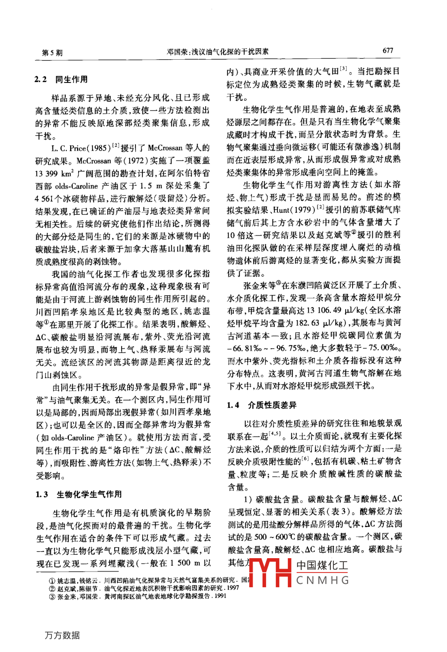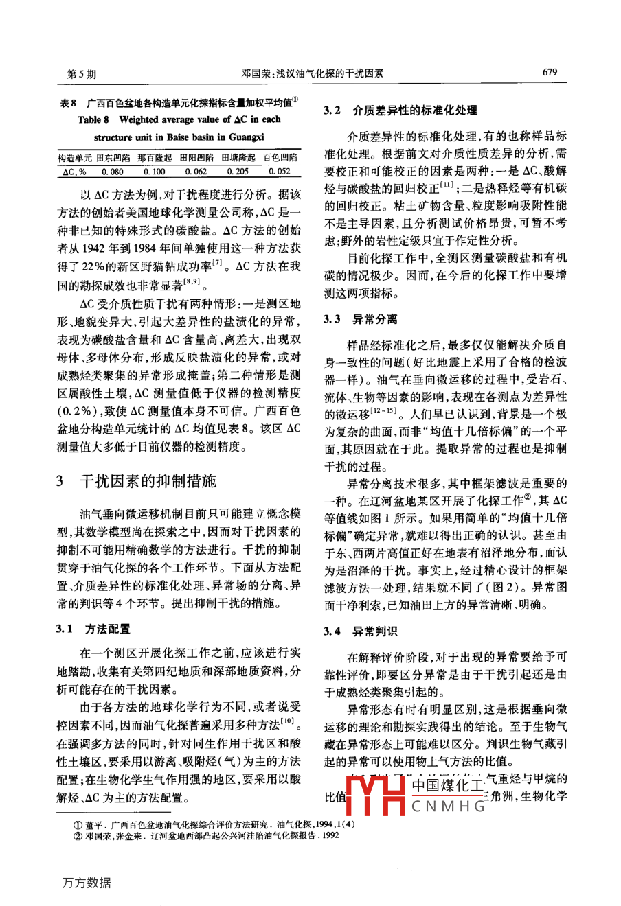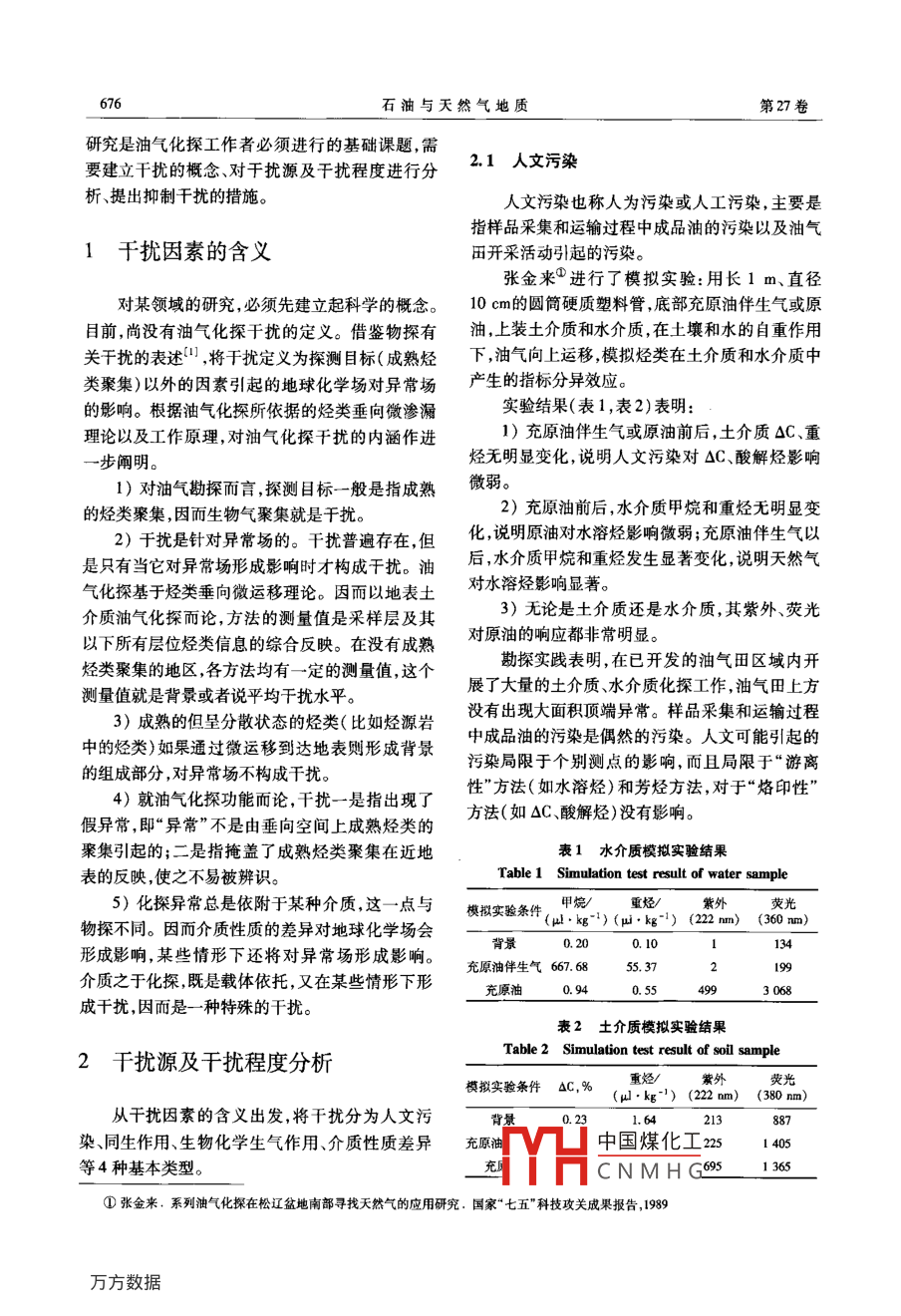 與天然氣比久第27卷第5期oIL GAS GEOLOGY006年10月文章編號:0253-9985(2006)05-0675-07淺議油氣化探的干擾因素鄧國榮(中國石油化工股份有限公司石油勘探開發(fā)研究院合肥石油化探研究所,安徽合肥230022)摘要:借鑒物探有關(guān)干擾的表述,建立了油氣化探干擾的概念。根據(jù)油氣化探所依據(jù)的烴類垂向傚運移理論和工作原理詳細闡明了油氣化探干擾的內(nèi)酒。將干擾源分為同生作用、生物化學(xué)生氣作用、介質(zhì)性質(zhì)差異、人文污染等4種基本類型。前三者是主要的干擾因素,人文可能的污染局隈于個別樣點。通過探例和模擬實驗,對干擾程度進行了分析。針對油氣化探不同工作環(huán)節(jié),提出了抑制干擾的相應(yīng)措施,包括選擇適當(dāng)?shù)姆椒ńM合、對介質(zhì)差異性進行標(biāo)準(zhǔn)化處理、采取精細的異常分離技術(shù)、異常判識。根據(jù)異常和背景的關(guān)系,指出干擾的普遍性是針對背景而言,出現(xiàn)在任何測區(qū);而實際構(gòu)成于擾是針對異常而言,其存在是有限的測區(qū),并且可以通過適當(dāng)辦法使于擾得到相當(dāng)程度的抑制。關(guān)鍵詞:于擾因素;千擾源;干擾抑制;油氣化探分類號:TEl223文獻標(biāo)識碼:AInterfering factors in oil and gas geochemical explorationLoronHefei institute of Petroleum Geochemical Exploration, Petroleu ExplorationProduction Research Institute, SINOPEC, Heifei, Anhui 230022)Abstract: Using the understanding of interference in geophysical exploration for reference, the concept of inter-ference in oil gas geochemical exploration is proposed and also expounded with the theory of vertical micro-of hydrocarbon and the working principle of geochemical exploration. There are four basic types of in-terference sources in oil and gas geochemical exploration: syngenetic process, biochemical gas effect, samplequality difference, and pollution from human activities. The first three types are the main interfering factorswhile the last one maybe limited to some individual sampling spots. An analysis is carried out to evaluate the de-gree of interference based on the study of field exploration cases and results of simulation test. Correspondingmeasures are proposed to suppress interference in different stages of geochemical exploration, including selectionof proper method combination, standardization of the media difference, and accurate anomaly separation andidentification. The relationship between anomaly and background shows that the interference is universal interms of background can occur in any survey areas, while the real interference in terms of anomaly just exists inlimited survey areas, and can be suppressed to some extent with proper methodsKey words: interfering factor; interference source; interference suppress; oil and gas geochemical exploration油氣化探的干擾現(xiàn)象很早就認(rèn)識到,并且越其有效性的關(guān)鍵根據(jù)。以往有關(guān)干擾的研究主要來越受到化探工作者和勘探?jīng)Q策家的關(guān)注。干擾是對介質(zhì)性質(zhì)的差異作定性分析,并通過統(tǒng)計學(xué)的存在是人們有時對油氣化探信心不足甚或懷疑中的回歸分析探索定量校正的方法。有關(guān)干擾的收稿日期:2006-03-10中國煤化工作者筒介:鄧國榮(1964-),男,高級工程師油氣化探與石油地質(zhì)基金項目:中國石油化工股份有限公司科技項目(Poo2)CNMHG676石油與天然氣地質(zhì)第27卷研究是油氣化探工作者必須進行的基礎(chǔ)課題,需要建立干擾的概念對干擾源及干擾程度進行分21人文污染析、提出抑制干擾的措施人文污染也稱人為污染或人工污染,主要是指樣品采集和運輸過程中成品油的污染以及油氣1于擾因素的含義田開采活動引起的污染。張金來φ進行了模擬實驗:用長1m、直徑對某領(lǐng)域的研究,必須先建立起科學(xué)的概念。10cm的圓筒硬質(zhì)塑料管,底部充原油伴生氣或原目前尚沒有油氣化探于擾的定義。借鑒物探有油,上裝土介質(zhì)和水介質(zhì),在土壤和水的自重作用關(guān)干擾的表述1,將于擾定義為探測目標(biāo)(成熟烴下,油氣向上運移,模擬烴類在土介質(zhì)和水介質(zhì)中類聚集)以外的因素引起的地球化學(xué)場對異常場產(chǎn)生的指標(biāo)分異效應(yīng)。的影響。根據(jù)油氣化探所依據(jù)的烴類垂向微滲漏實驗結(jié)果(表1,表2)表明理論以及工作原理,對油氣化探干擾的內(nèi)涵作進1)充原油伴生氣或原油前后,土介質(zhì)△C、重步聞明。烴無明顯變化,說明人文污染對△C、酸解烴影響1)對油氣勘探而言探測目標(biāo)一般是指成熟微弱。的烴類聚集,因而生物氣聚集就是干擾。2)充原油前后,水介質(zhì)甲烷和重?zé)N無明顯變2)干擾是針對異常場的。干擾普遍存在,但化,說明原油對水溶烴影響微弱充原油伴生氣以是只有當(dāng)它對異常場形成影響時才構(gòu)成干擾。油后,水介質(zhì)甲烷和重?zé)N發(fā)生顯著變化,說明天然氣氣化探基于烴類垂向微運移理論。因而以地表土對水溶烴影響顯著。介質(zhì)油氣化探而論,方法的測量值是采樣層及其3)無論是土介質(zhì)還是水介質(zhì),其紫外、熒光以下所有層位烴類信息的綜合反映。在沒有成熟對原油的響應(yīng)都非常明顯。烴類聚集的地區(qū),各方法均有一定的測量值,這個勘探實踐表明,在已開發(fā)的油氣田區(qū)域內(nèi)開測量值就是背景或者說平均干擾水平。展了大量的土介質(zhì)、水介質(zhì)化探工作,油氣田上方3)成熟的但呈分散狀態(tài)的