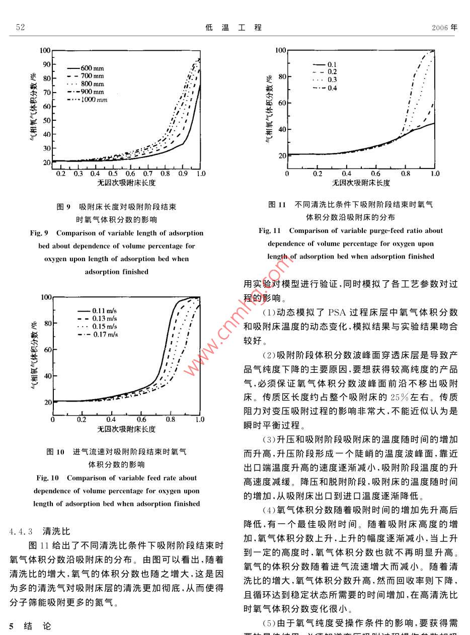 2006年第4期低溫工程N(yùn)o.42006總第152期CRYOGENICSSum No 152變壓吸附空分制氧過程非等溫模擬戴先知劉應(yīng)書(北京科技大學(xué)機(jī)械工程學(xué)院氣體分離工程研究所北京100083)摘要:建立了變壓吸附空分制氧過程非線性、非等溫模型,并進(jìn)行了數(shù)值模擬,計算結(jié)果與實(shí)測值吻合較好。在此基礎(chǔ)上探討了變壓吸附過程中床層內(nèi)溫度和體積分?jǐn)?shù)的動態(tài)行為,考察了吸附時間、吸附床高度、進(jìn)氣流速、清洗比等工藝參數(shù)對過程性能的影響。結(jié)果顯示,對于本研究中的小型變壓吸附裝置,吸附熱對產(chǎn)品氣的影響不太大關(guān)鍵詞:變壓吸附制氧非等溫模型數(shù)值模擬中圖分類號:TB62文獻(xiàn)標(biāo)識碼:A文章編號:1000-6516(2006)04-0047-07Non-isothermal simulation of pressure swingadsorption for separating oxygen from airDai Xianzhi Liu YingshuiInstitute of Gas Separation Engineering. School of Mechanical Engineering. University ofScience and Technology Beijing, Beijing 100083. ChinaAbstract: A more realistic mathematical model which accounts on the non-isothermal effects inthe adsorb bed, was developed for the pressure swing adsorption of separating oxygen from air. It isshown that the calculation results are well agreed with the experimental results. The dynamic behavior of temperature and concentration in the bed and effects of operating parameters on performance ofprocess were discussed, including adsorption time, height of adsorption bed, feed flow rate andpurge-feed ratio. The conclusion shows that the adsorption heat has little effect on the gas-produc-tion concentration in the mini-size PSA equipmentKey words pressure swing adsorption; oxygen product; non-isothermal simulation; numericalsimulation引言條件的不同而變化。因此,采用實(shí)驗(yàn)手段全面系統(tǒng)地研究變壓吸附過程困難多、局限大。數(shù)學(xué)模型作為變壓吸附(PSA)分離空氣制氧過程是一個動態(tài)種研究系統(tǒng)的本質(zhì)特征及其內(nèi)在聯(lián)系的方法,與實(shí)驗(yàn)過程,體系的壓力、純度和溫度等參數(shù)復(fù)雜多變,變壓相比,具有簡易、節(jié)約的優(yōu)點(diǎn),較適合于變壓吸附過程吸附工藝流程及裝置因產(chǎn)品的數(shù)目及要求不同、環(huán)境的分析研究.成為變壓吸附研究領(lǐng)域的一個重要分低溫工程2006年支。然而以往的數(shù)學(xué)模型大多采用了等溫假設(shè),使其反吹吸附降壓模擬精度和應(yīng)用范圍都受到了一定的局限;而且隨著些新型富氧吸附劑的出現(xiàn)-2,吸附熱效應(yīng)越來越大,而且對于大型的變壓吸附裝置,吸附熱效應(yīng)也更加明顯。因此,考慮吸附熱的影響,對PSA制氧過程吸附床1進(jìn)行非等溫模擬,揭示了吸附時間、吸附床高度、吸附壓力、清洗比、進(jìn)氣流速等參數(shù)對過程性能的影響,對于深入了解變壓吸附制氧的機(jī)理,優(yōu)化工藝流程具有產(chǎn)品氣重要的理論和實(shí)際意義。2數(shù)學(xué)模型建立與求解吸附床22.1PSA制氧過程的物理模型如圖1所示,PSA制氧過程的吸附器一般為管型結(jié)構(gòu)。吸附器內(nèi)部裝填球狀的5A沸石分子篩,分子篩床層上下兩端采用分流板固定。在氣體吸附和脫吸附降壓反吹升壓附過程中,分子篩顆粒位置固定不動,而氣流在分子圖SA分離空氣制氧循環(huán)篩顆粒間隙中流動傳質(zhì)在氣相和分子篩吸附相之間Fig 2 PSA cycle for separating oxygen from air進(jìn)行,屬于固定床吸附模式。隨著氣相組分與分子篩顆粒之間的傳質(zhì),即吸附或脫附過程的進(jìn)行,氣流的向的分布忽略不計;速度沿吸附床軸向不斷變化。利用5A沸石分子篩(2)忽略吸附床軸向的壓降,升壓和降壓階段床分離空氣制氧是基于平衡吸附分離作用的過程。實(shí)內(nèi)總壓隨時間為拋物線關(guān)系,吸附和脫附步驟中床內(nèi)際過程常采用兩床 Skarstrom循環(huán),循環(huán)過程見圖總壓保持不變;2。循環(huán)過程包括4個步驟:升壓階段、吸附階段、降(3)空氣是由氧、氮2種氣體構(gòu)成(氧/氮=21/壓階段、清洗階段。79)的雙組分理想氣體(4)氣體組分的吸附等溫線采用擴(kuò)展的吸附器出口muir方程描述;氣流分布器(5氣相流動采用軸向擴(kuò)散流動模型描述;(6)考慮由于吸附作用而導(dǎo)致的流速變化;8888(⑦)吸附速率采用線性驅(qū)動力(LDF)模型;●●吸附劑顆粒(8)考慮吸附熱并假設(shè)氣固相瞬時達(dá)到熱平8衡。2.2數(shù)學(xué)模型的控制方程由上述假設(shè)可將問題簡化為一維非等溫模型,描氣流分布器述PSA分離空氣制氧過程的控制方程如下:●●e●●●(1)物料平衡方程氣相組分質(zhì)量守恒方程吸附器入口ci a(ui) 1-e aq0(1)圖1吸附器結(jié)構(gòu)示意圖I Adsorption bed structure氣相總質(zhì)量守恒方程:o+1=-1=cR7(99+9a)(2)為了建立數(shù)學(xué)模型,必須對實(shí)際的變壓吸附過程p at進(jìn)行必要的簡化。采取以下假設(shè)(2)吸附速率方程第4期變壓吸附空分制氧過程非等溫模擬49(3)吸附等溫線方程函數(shù),必須數(shù)值求解。首先要將偏微分方程在空間和時間上進(jìn)行離散化,本文采用控制容積積分法對方程進(jìn)行離散化,選擇內(nèi)結(jié)點(diǎn)法,這樣就得到一組線性方其中,吸附平衡系數(shù)b與溫度的關(guān)聯(lián)采用下式程,且質(zhì)量守恒方程和能量守恒方程的系數(shù)矩陣都是b= b(5)三對角矩陣。計算此代數(shù)方程組采用TDMA算法(4)能量